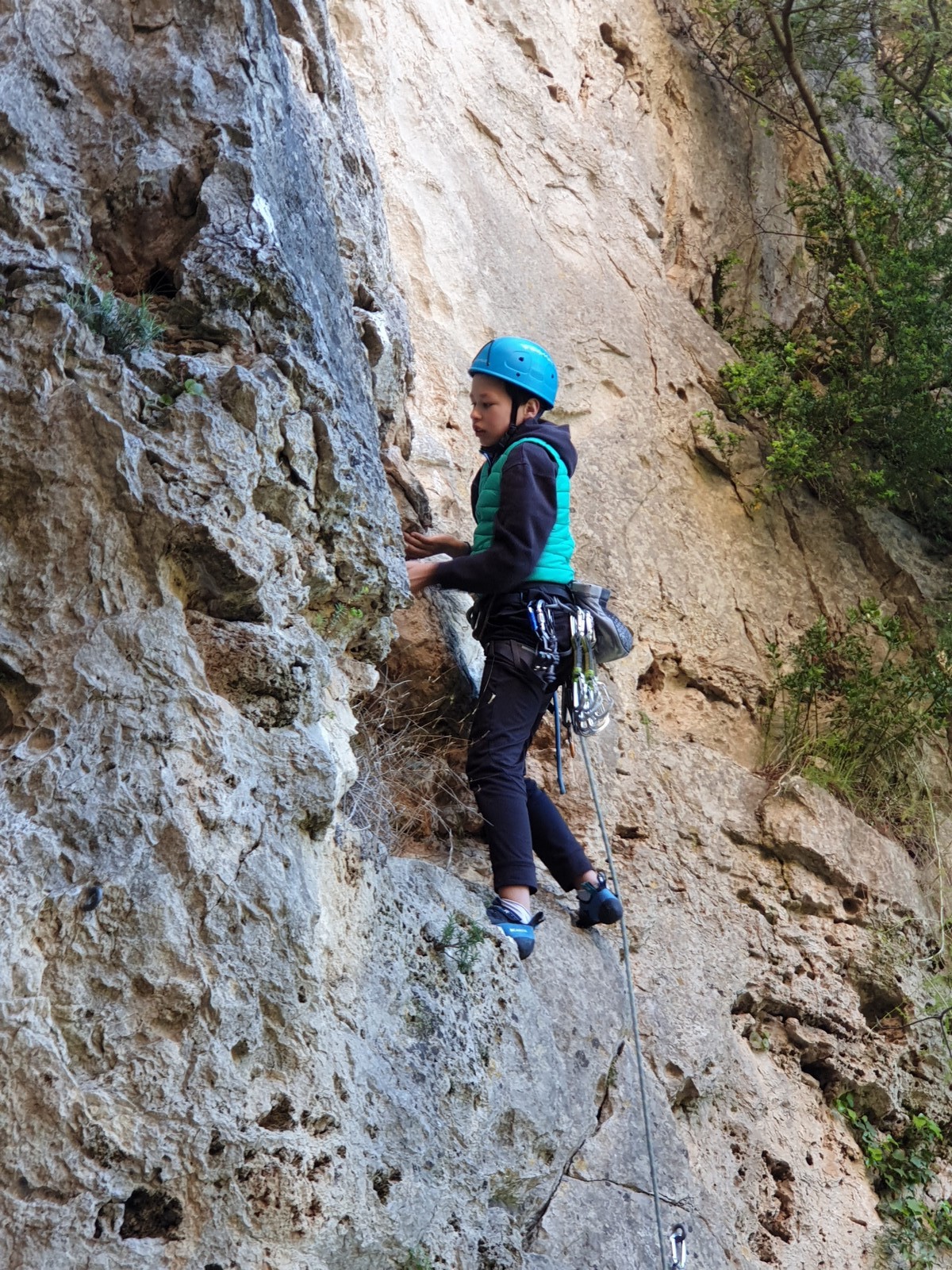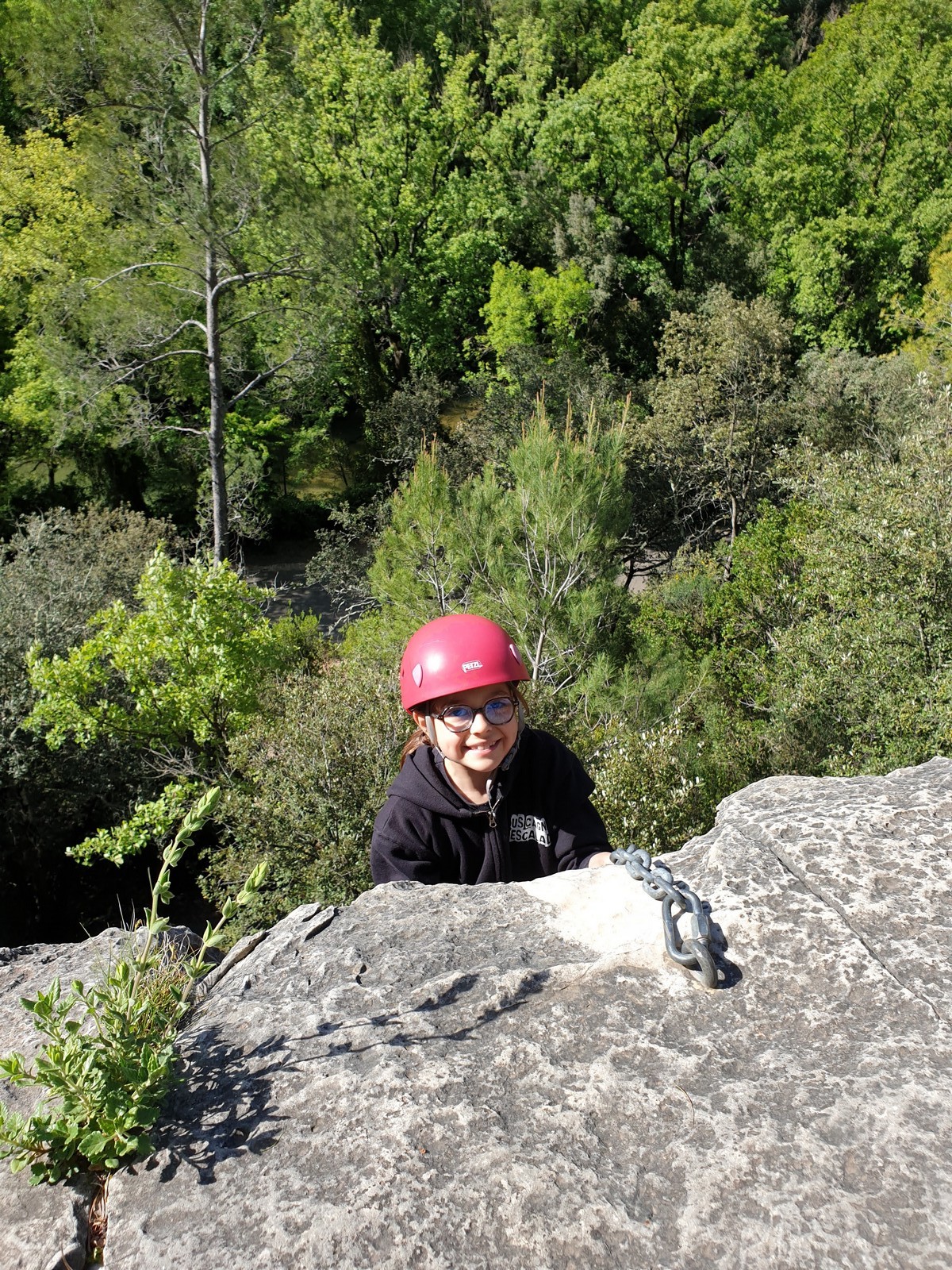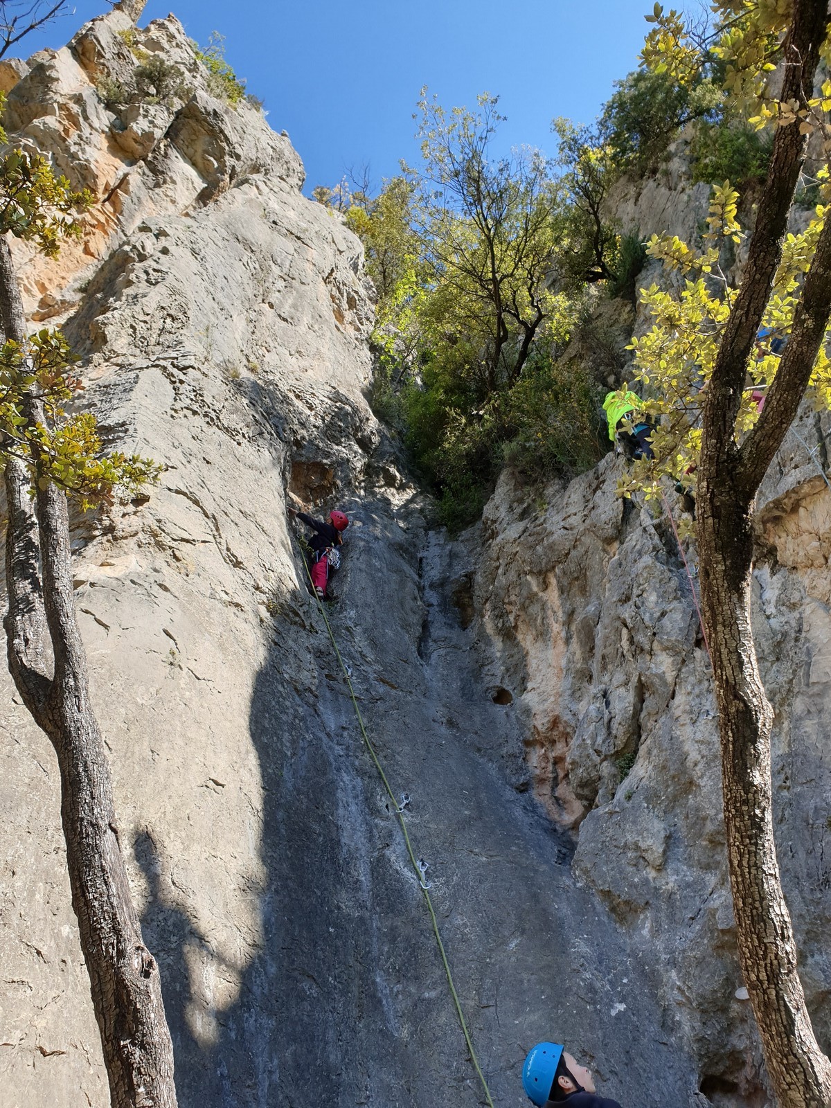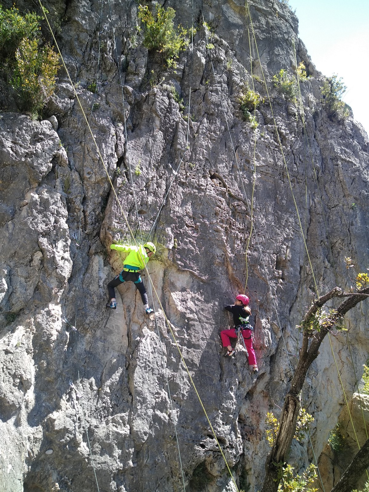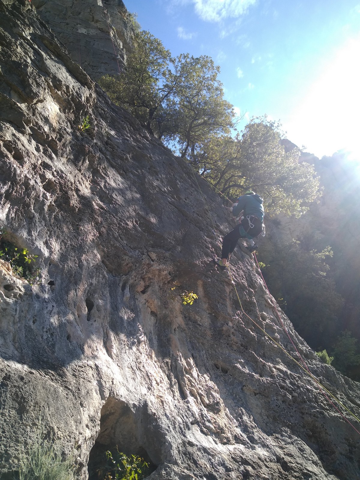 Aujourd’hui nous jetons notre dévolu sur les secteurs » Tintin », tout petit secteur idéal pour réviser l’escalade en tête dans des voies courtes et faciles et le secteur situé sur la vire juste au dessus proposant des voies d’un peu plus d’ampleur jusqu’à 7a. Le côté pratique étant qu’ici lorsque nous sommes à l’étage, sur la terrasse, nous avons quasiment les pieds au niveau des relais du secteur inférieur et c’est ainsi que les jeunes novices peuvent sereinement réviser ou même apprendre à faire la « manip » nécessaire lorsque l’on grimpe en tête. Aujourd’hui le soleil est présent mais le petit vent s’engouffrant dans le « vallon sourn » nous raffermit les chairs et nous interdit toute escalade en t-shirt. Les grimpeurs s’activent avec plus ou moins d’intensité et à 20 grimpeurs, la quasitotalité des voies sont prises. Mathis et Esteban vont grimper sur un bout de caillou juste à côté pour installer une moulinette dans un très long 6a, tandis que Léane s’essaie dans le superbe 7a du secteur « Caldoquie » à la difficulté concentrée dans les permiers mètres. Elle chute dans le passage difficile, et avec elle son humeur. Sylvain installe le superbe 6b+ juste à côté pour offrir aux plus motivés une voie de 35m abordable qui sera écumée toute la journée ! An fin de matinée, nous sommes rejoints par les parents de Rose et Lilas, Didier et Amandine, ainsi que Prune la soeur, qui dorment dans un camping car non loin du vallon. Avec eux débarquent Rebecca et Marion avec sa fille Maya, qu’on retrouvera tout au long du séjour.