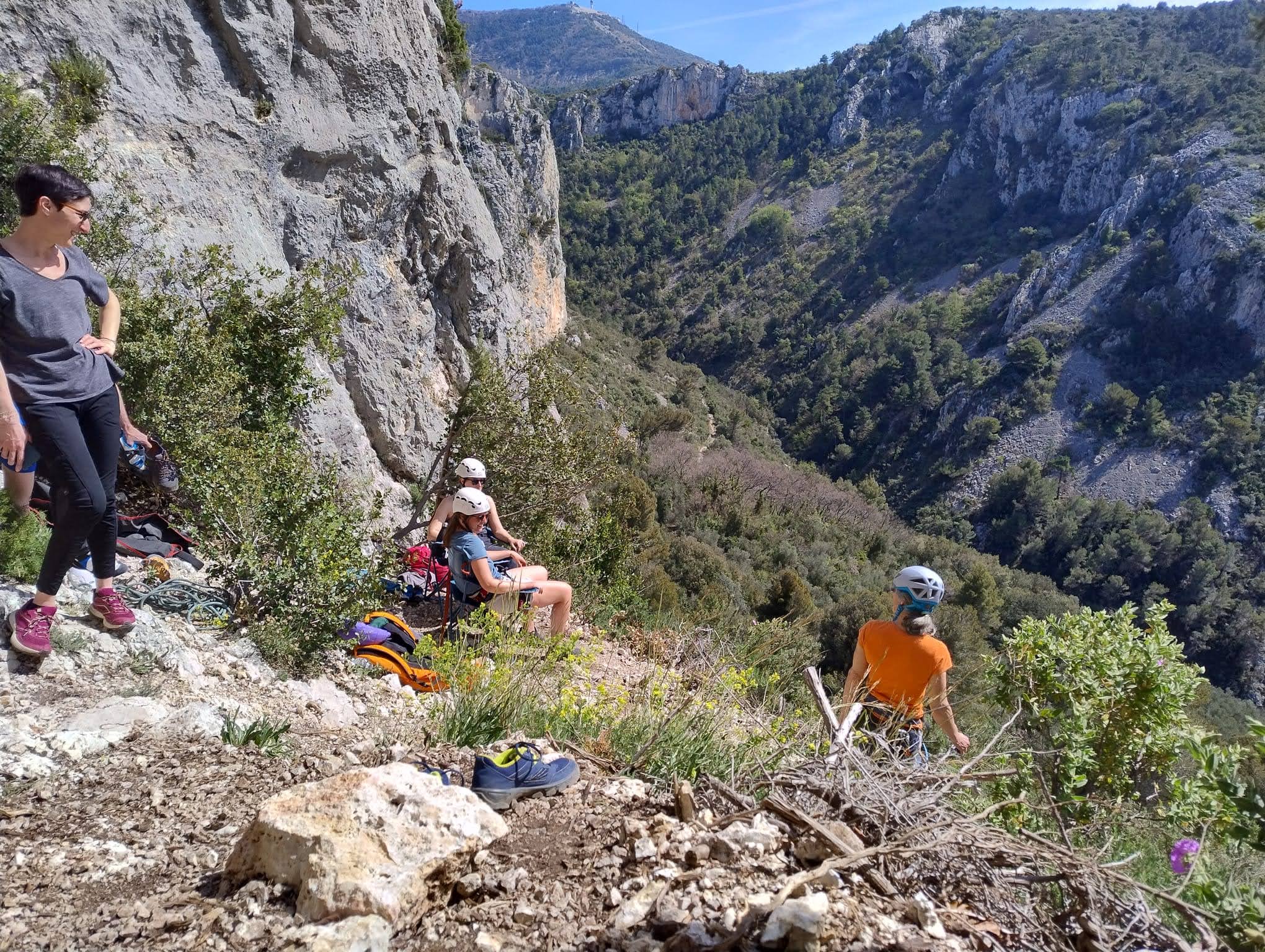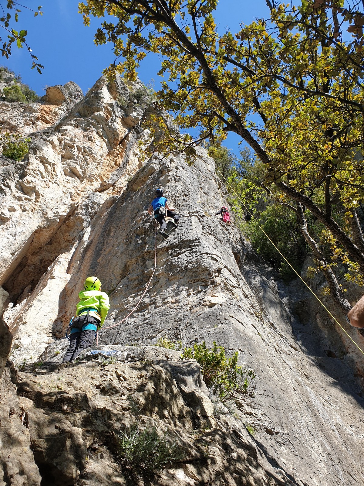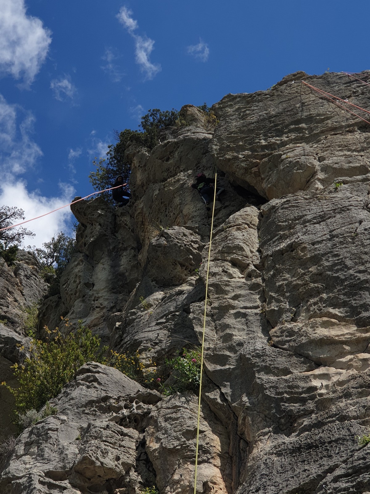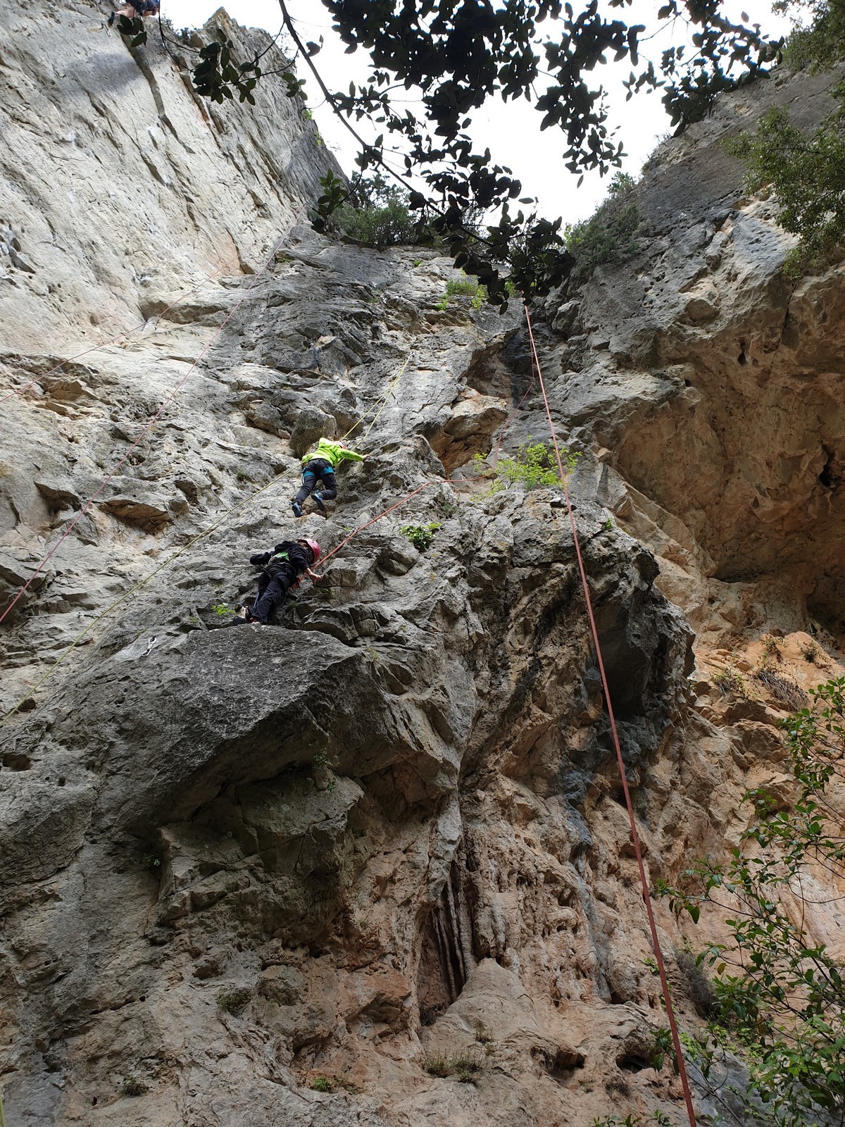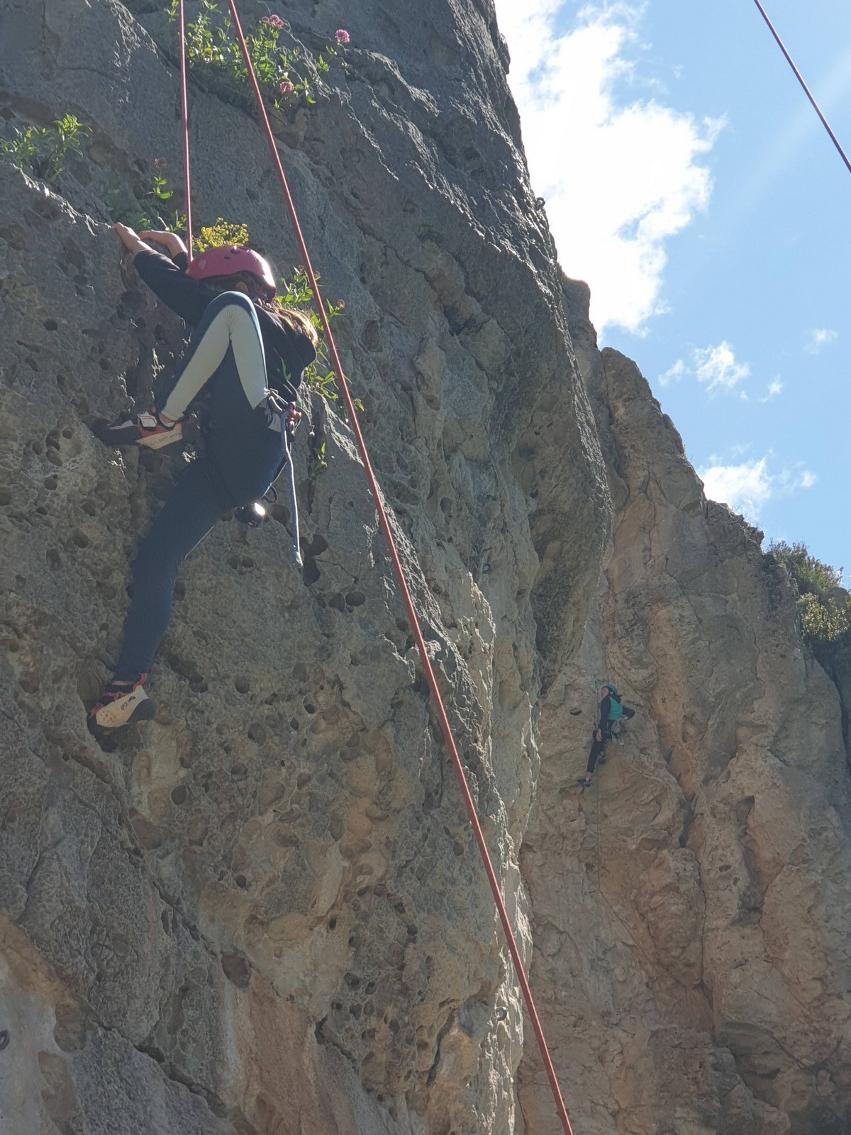 Aujourd’hui nous jetons notre dévolu sur les secteurs » Tintin », tout petit secteur idéal pour réviser l’escalade en tête dans des voies courtes et faciles et le secteur situé sur la vire juste au dessus proposant des voies d’un peu plus d’ampleur jusqu’à 7a. Le côté pratique étant qu’ici lorsque nous sommes à l’étage, sur la terrasse, nous avons quasiment les pieds au niveau des relais du secteur inférieur et c’est ainsi que les jeunes novices peuvent sereinement réviser ou même apprendre à faire la « manip » nécessaire lorsque l’on grimpe en tête. Aujourd’hui le soleil est présent mais le petit vent s’engouffrant dans le « vallon sourn » nous raffermit les chairs et nous interdit toute escalade en t-shirt. Les grimpeurs s’activent avec plus ou moins d’intensité et à 20 grimpeurs, la quasitotalité des voies sont prises. Mathis et Esteban vont grimper sur un bout de caillou juste à côté pour installer une moulinette dans un très long 6a, tandis que Léane s’essaie dans le superbe 7a du secteur « Caldoquie » à la difficulté concentrée dans les permiers mètres. Elle chute dans le passage difficile, et avec elle son humeur. Sylvain installe le superbe 6b+ juste à côté pour offrir aux plus motivés une voie de 35m abordable qui sera écumée toute la journée ! An fin de matinée, nous sommes rejoints par les parents de Rose et Lilas, Didier et Amandine, ainsi que Prune la soeur, qui dorment dans un camping car non loin du vallon. Avec eux débarquent Rebecca et Marion avec sa fille Maya, qu’on retrouvera tout au long du séjour.