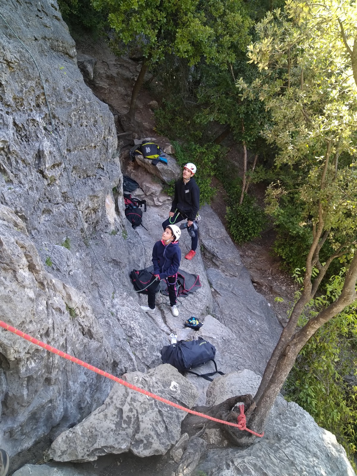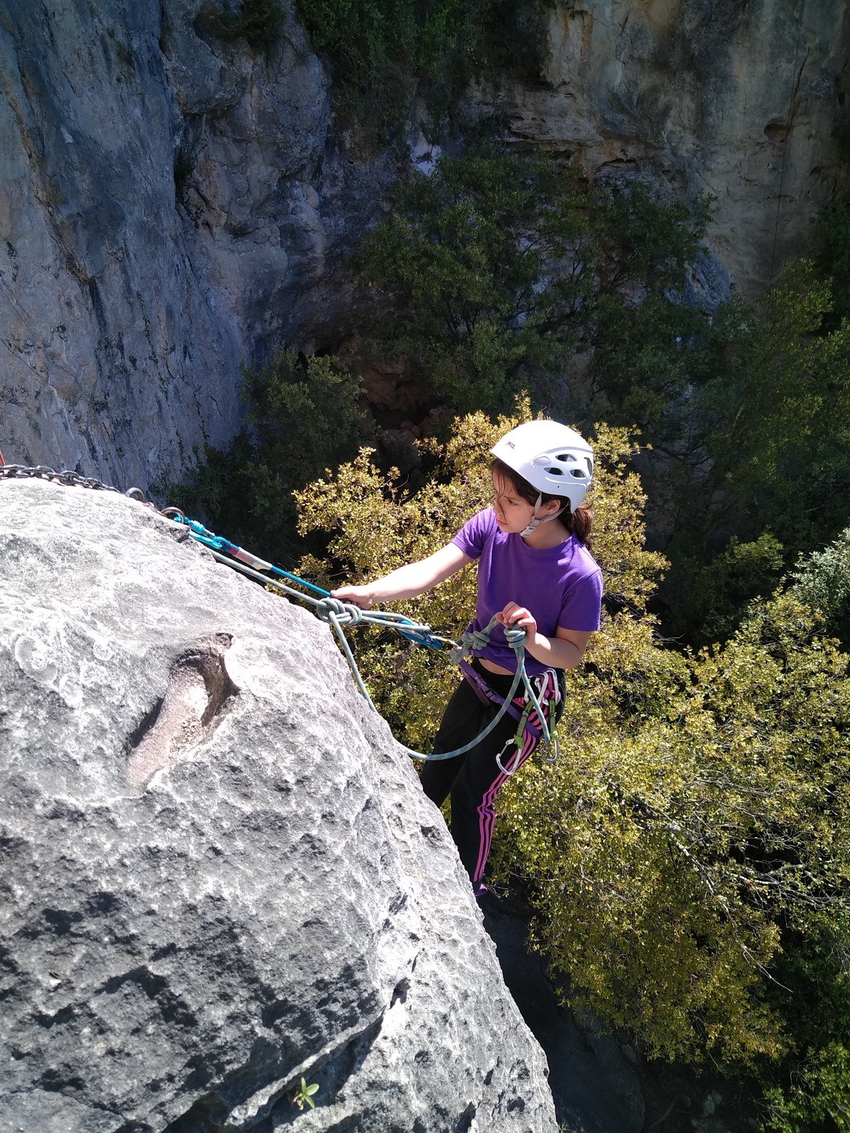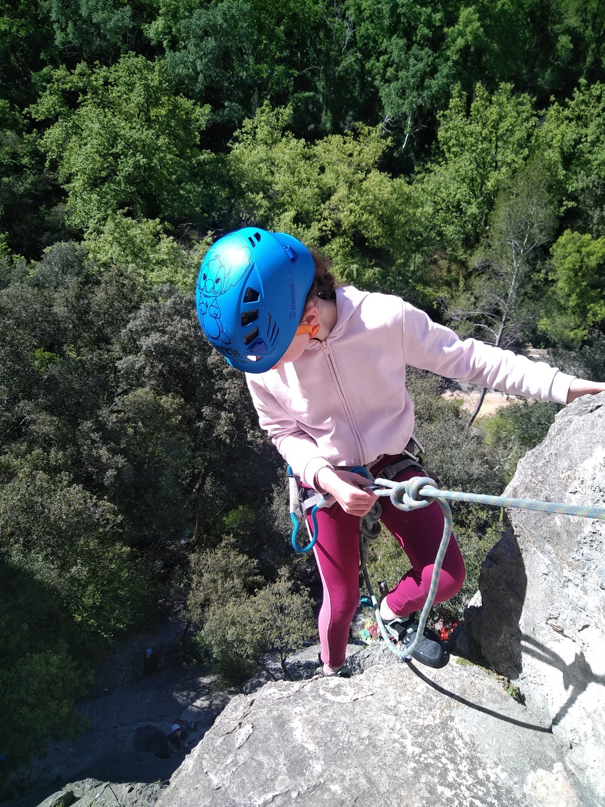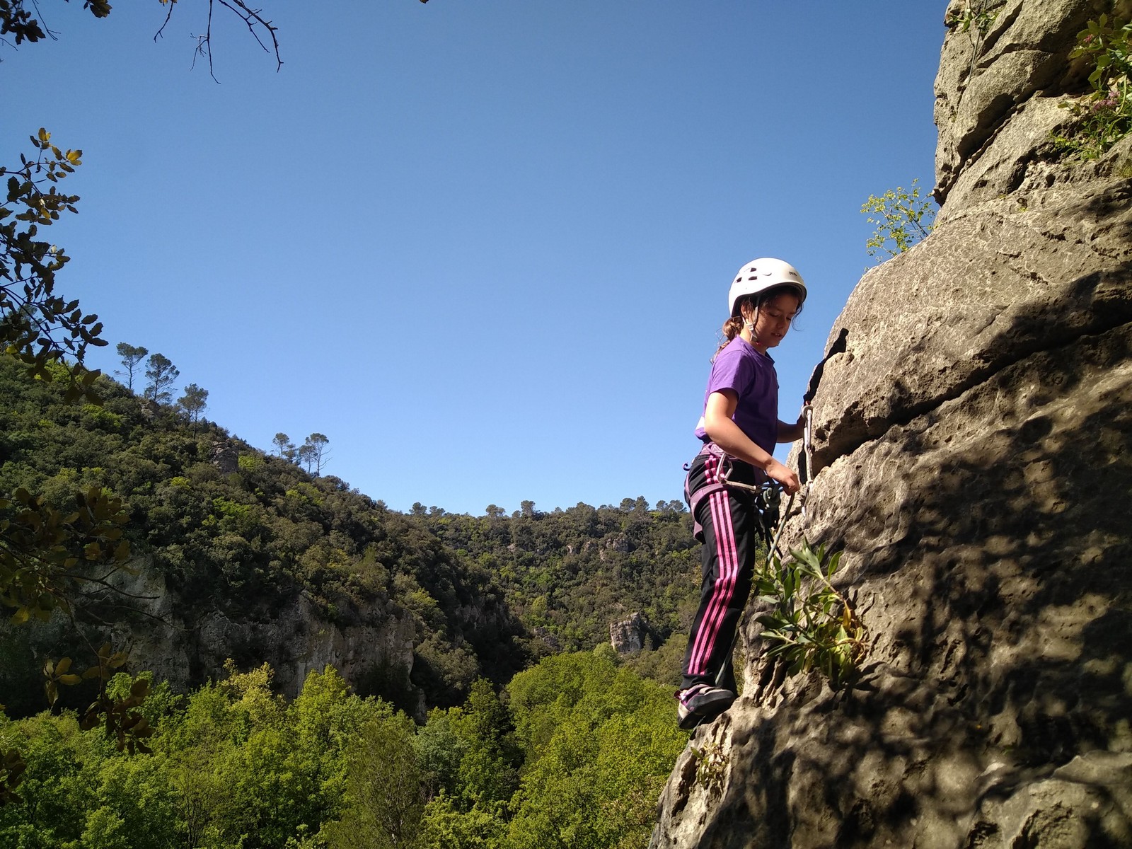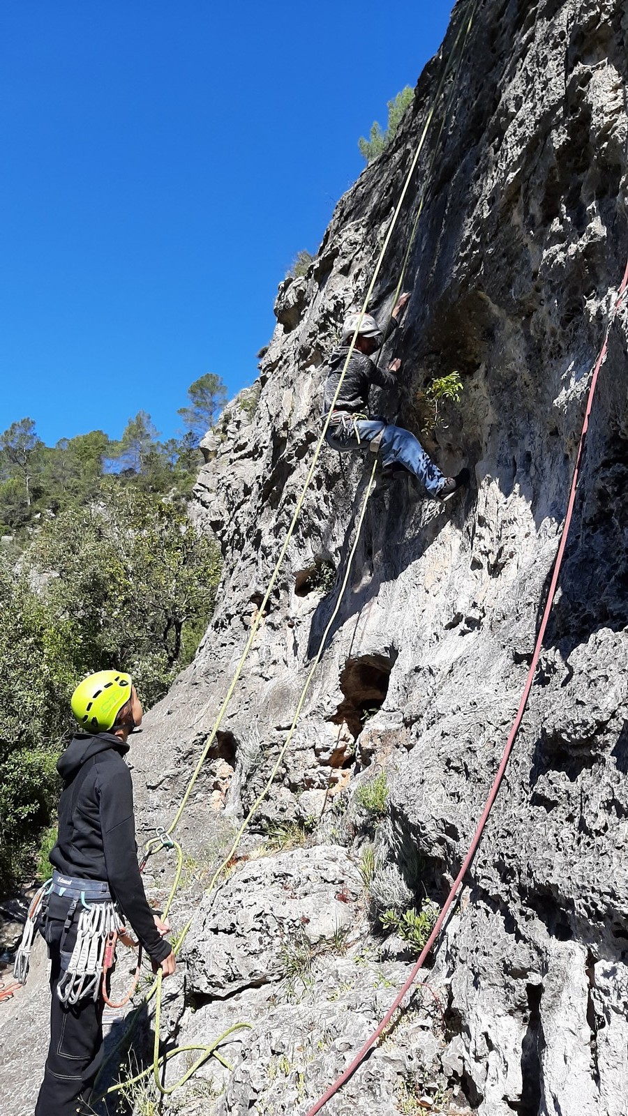 Aujourd’hui nous jetons notre dévolu sur les secteurs » Tintin », tout petit secteur idéal pour réviser l’escalade en tête dans des voies courtes et faciles et le secteur situé sur la vire juste au dessus proposant des voies d’un peu plus d’ampleur jusqu’à 7a. Le côté pratique étant qu’ici lorsque nous sommes à l’étage, sur la terrasse, nous avons quasiment les pieds au niveau des relais du secteur inférieur et c’est ainsi que les jeunes novices peuvent sereinement réviser ou même apprendre à faire la « manip » nécessaire lorsque l’on grimpe en tête. Aujourd’hui le soleil est présent mais le petit vent s’engouffrant dans le « vallon sourn » nous raffermit les chairs et nous interdit toute escalade en t-shirt. Les grimpeurs s’activent avec plus ou moins d’intensité et à 20 grimpeurs, la quasitotalité des voies sont prises. Mathis et Esteban vont grimper sur un bout de caillou juste à côté pour installer une moulinette dans un très long 6a, tandis que Léane s’essaie dans le superbe 7a du secteur « Caldoquie » à la difficulté concentrée dans les permiers mètres. Elle chute dans le passage difficile, et avec elle son humeur. Sylvain installe le superbe 6b+ juste à côté pour offrir aux plus motivés une voie de 35m abordable qui sera écumée toute la journée ! An fin de matinée, nous sommes rejoints par les parents de Rose et Lilas, Didier et Amandine, ainsi que Prune la soeur, qui dorment dans un camping car non loin du vallon. Avec eux débarquent Rebecca et Marion avec sa fille Maya, qu’on retrouvera tout au long du séjour.