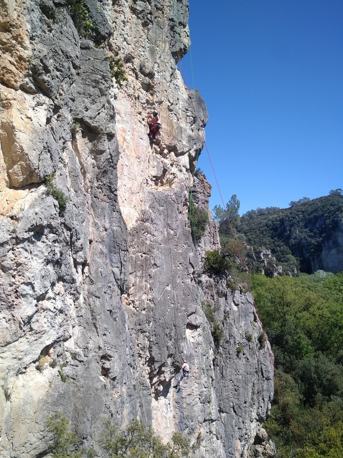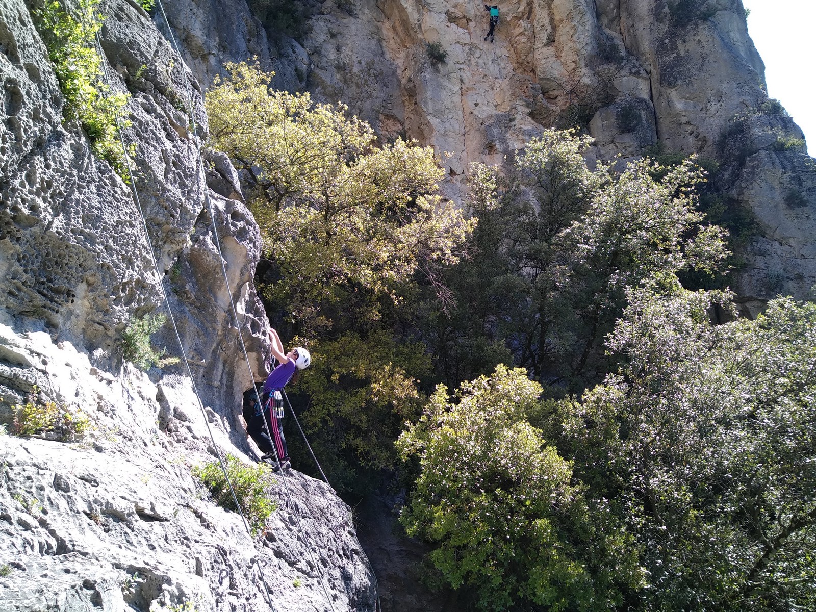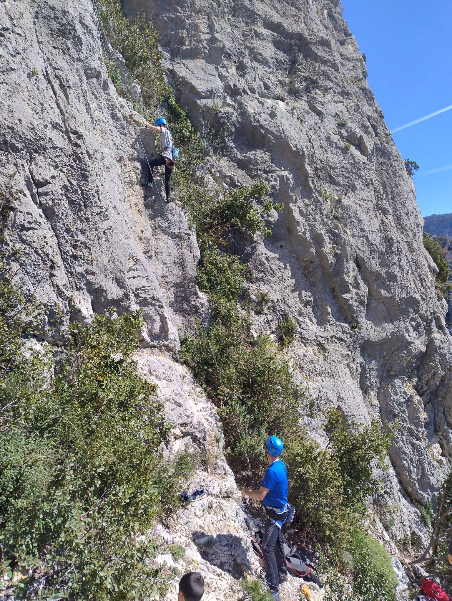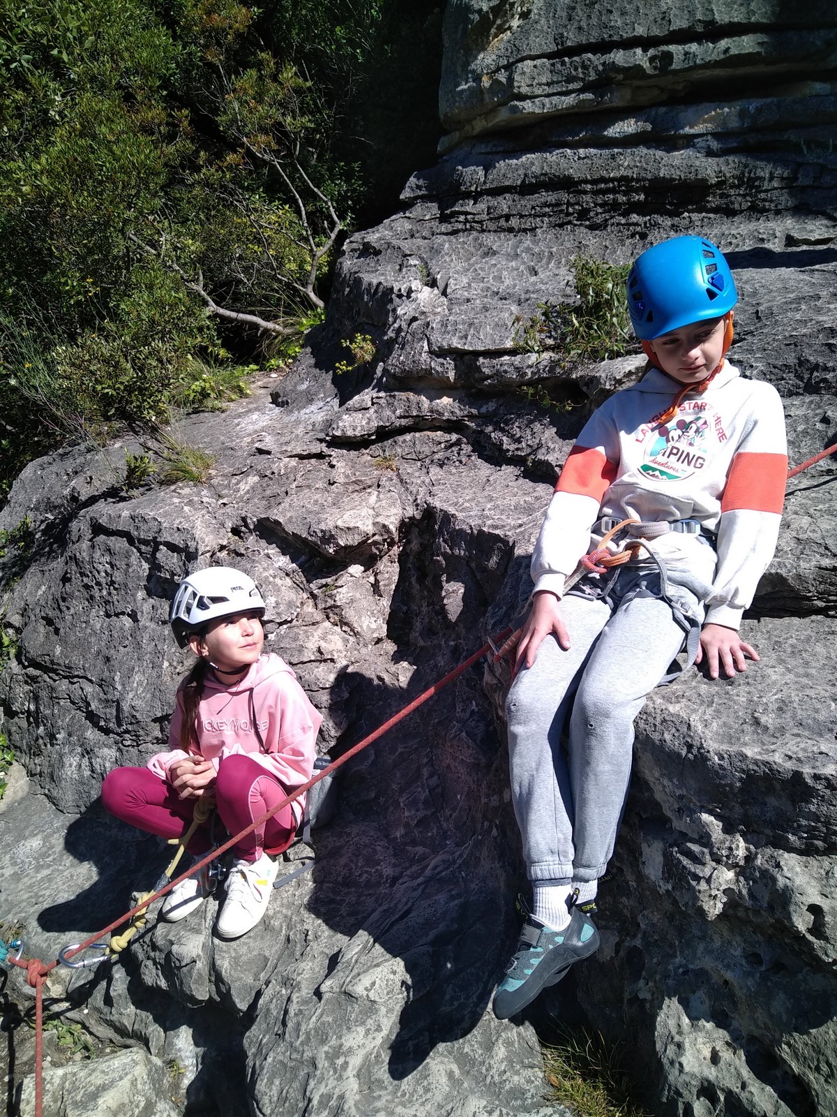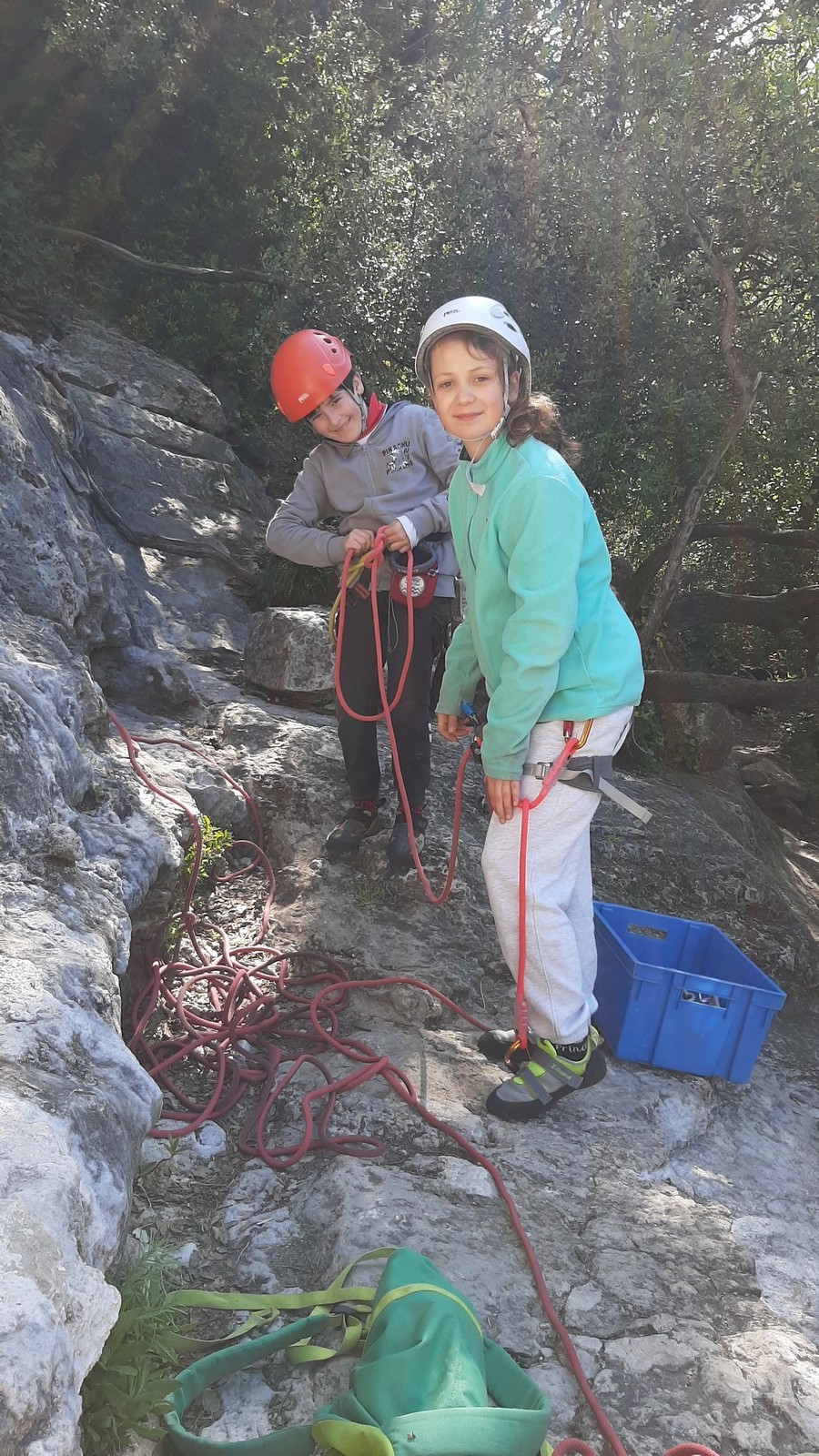 Aujourd’hui nous jetons notre dévolu sur les secteurs » Tintin », tout petit secteur idéal pour réviser l’escalade en tête dans des voies courtes et faciles et le secteur situé sur la vire juste au dessus proposant des voies d’un peu plus d’ampleur jusqu’à 7a. Le côté pratique étant qu’ici lorsque nous sommes à l’étage, sur la terrasse, nous avons quasiment les pieds au niveau des relais du secteur inférieur et c’est ainsi que les jeunes novices peuvent sereinement réviser ou même apprendre à faire la « manip » nécessaire lorsque l’on grimpe en tête. Aujourd’hui le soleil est présent mais le petit vent s’engouffrant dans le « vallon sourn » nous raffermit les chairs et nous interdit toute escalade en t-shirt. Les grimpeurs s’activent avec plus ou moins d’intensité et à 20 grimpeurs, la quasitotalité des voies sont prises. Mathis et Esteban vont grimper sur un bout de caillou juste à côté pour installer une moulinette dans un très long 6a, tandis que Léane s’essaie dans le superbe 7a du secteur « Caldoquie » à la difficulté concentrée dans les permiers mètres. Elle chute dans le passage difficile, et avec elle son humeur. Sylvain installe le superbe 6b+ juste à côté pour offrir aux plus motivés une voie de 35m abordable qui sera écumée toute la journée ! An fin de matinée, nous sommes rejoints par les parents de Rose et Lilas, Didier et Amandine, ainsi que Prune la soeur, qui dorment dans un camping car non loin du vallon. Avec eux débarquent Rebecca et Marion avec sa fille Maya, qu’on retrouvera tout au long du séjour.