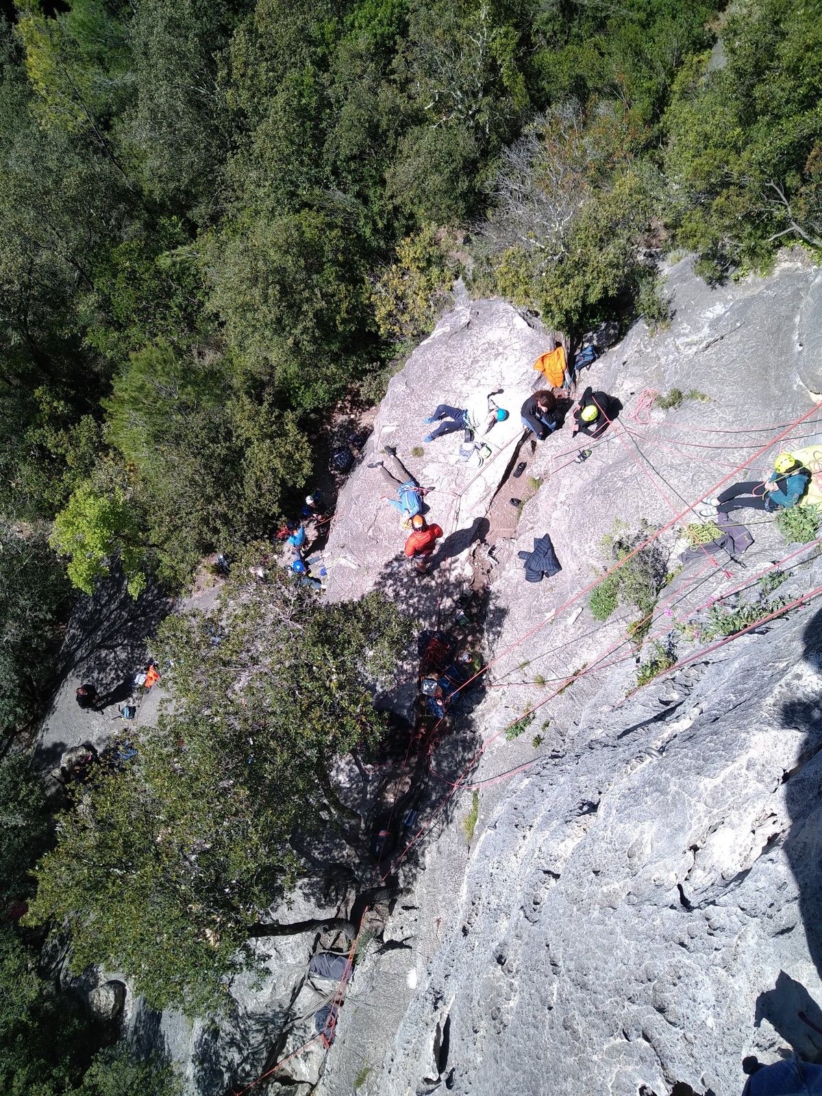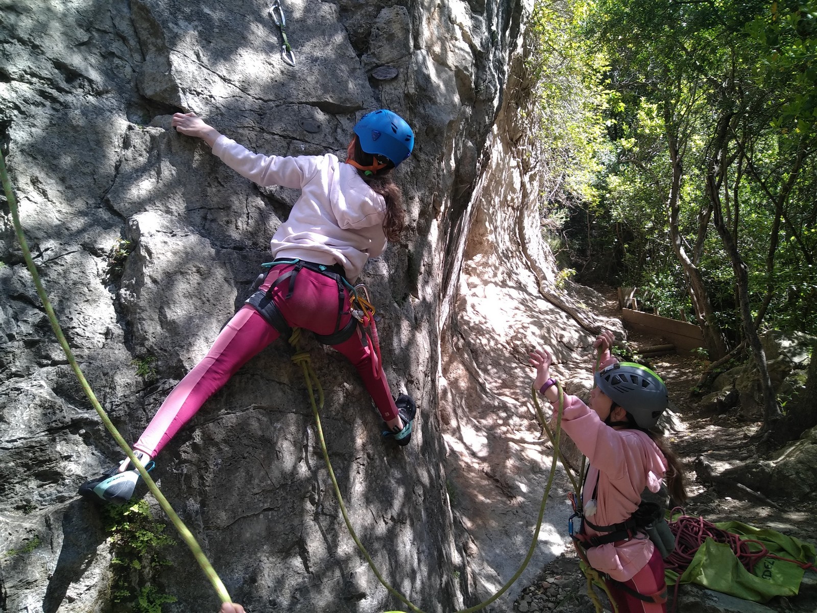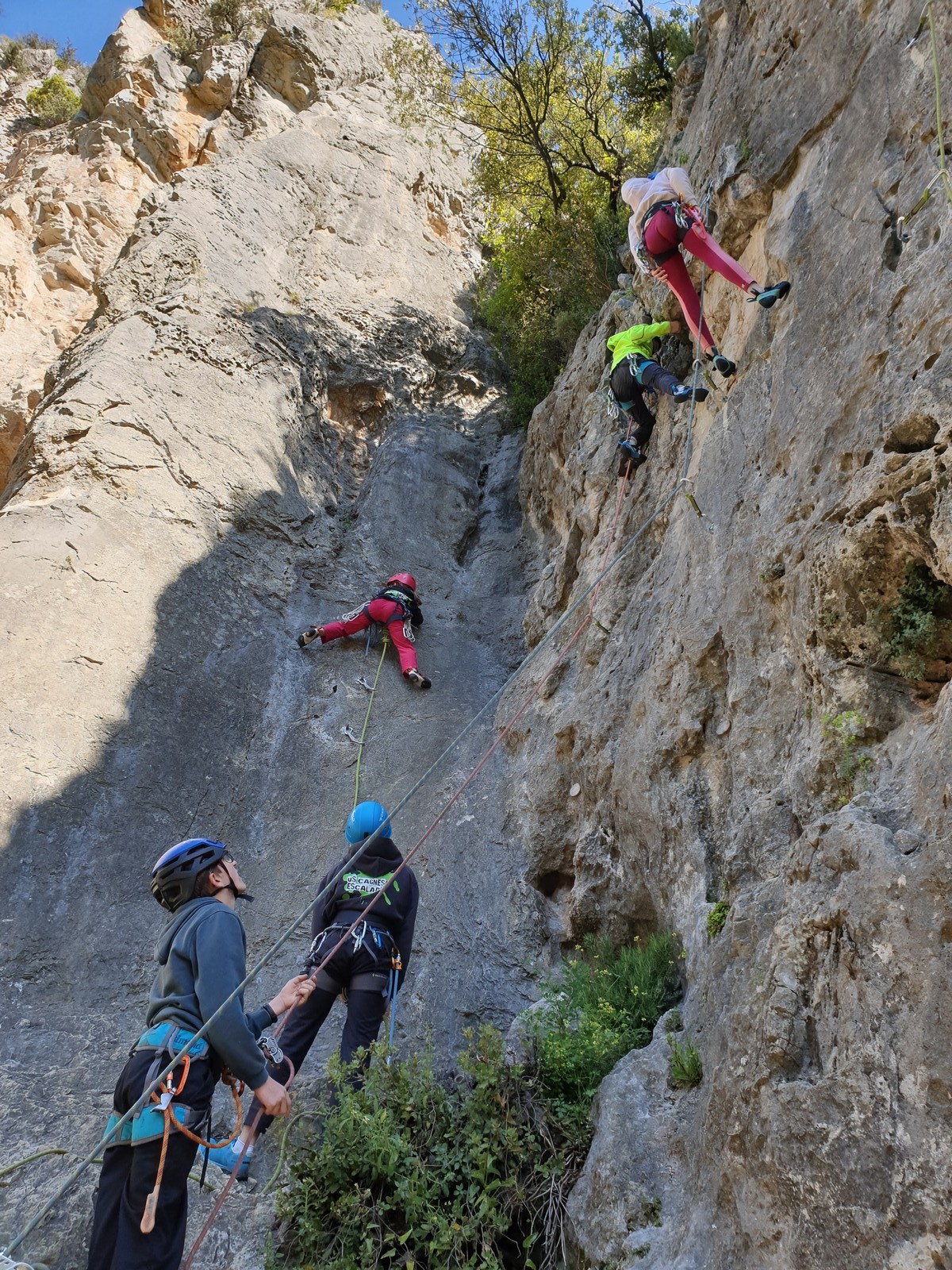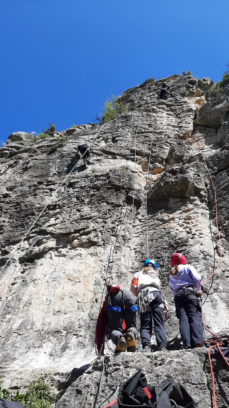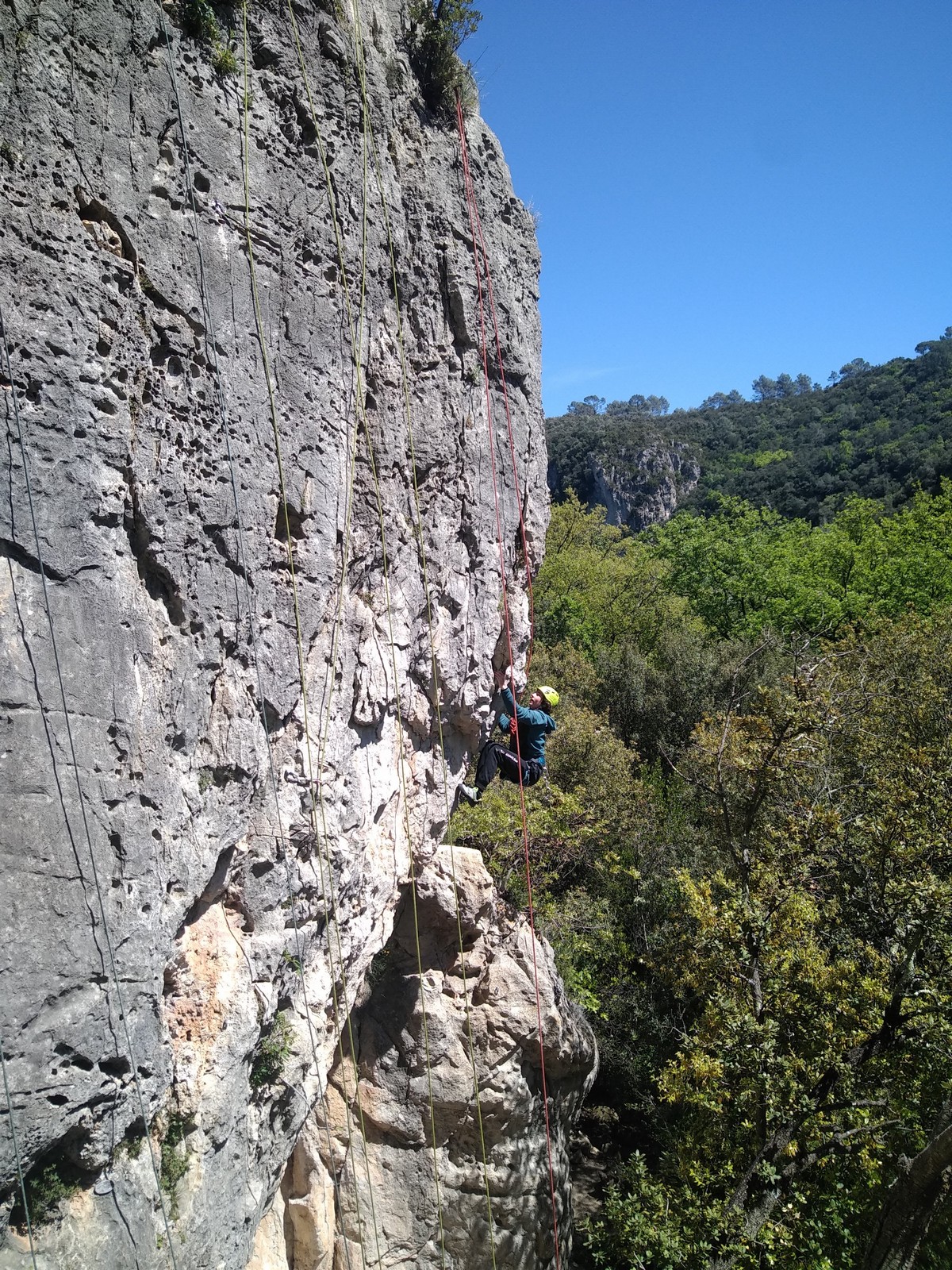 Aujourd’hui nous jetons notre dévolu sur les secteurs » Tintin », tout petit secteur idéal pour réviser l’escalade en tête dans des voies courtes et faciles et le secteur situé sur la vire juste au dessus proposant des voies d’un peu plus d’ampleur jusqu’à 7a. Le côté pratique étant qu’ici lorsque nous sommes à l’étage, sur la terrasse, nous avons quasiment les pieds au niveau des relais du secteur inférieur et c’est ainsi que les jeunes novices peuvent sereinement réviser ou même apprendre à faire la « manip » nécessaire lorsque l’on grimpe en tête. Aujourd’hui le soleil est présent mais le petit vent s’engouffrant dans le « vallon sourn » nous raffermit les chairs et nous interdit toute escalade en t-shirt. Les grimpeurs s’activent avec plus ou moins d’intensité et à 20 grimpeurs, la quasitotalité des voies sont prises. Mathis et Esteban vont grimper sur un bout de caillou juste à côté pour installer une moulinette dans un très long 6a, tandis que Léane s’essaie dans le superbe 7a du secteur « Caldoquie » à la difficulté concentrée dans les permiers mètres. Elle chute dans le passage difficile, et avec elle son humeur. Sylvain installe le superbe 6b+ juste à côté pour offrir aux plus motivés une voie de 35m abordable qui sera écumée toute la journée ! An fin de matinée, nous sommes rejoints par les parents de Rose et Lilas, Didier et Amandine, ainsi que Prune la soeur, qui dorment dans un camping car non loin du vallon. Avec eux débarquent Rebecca et Marion avec sa fille Maya, qu’on retrouvera tout au long du séjour.