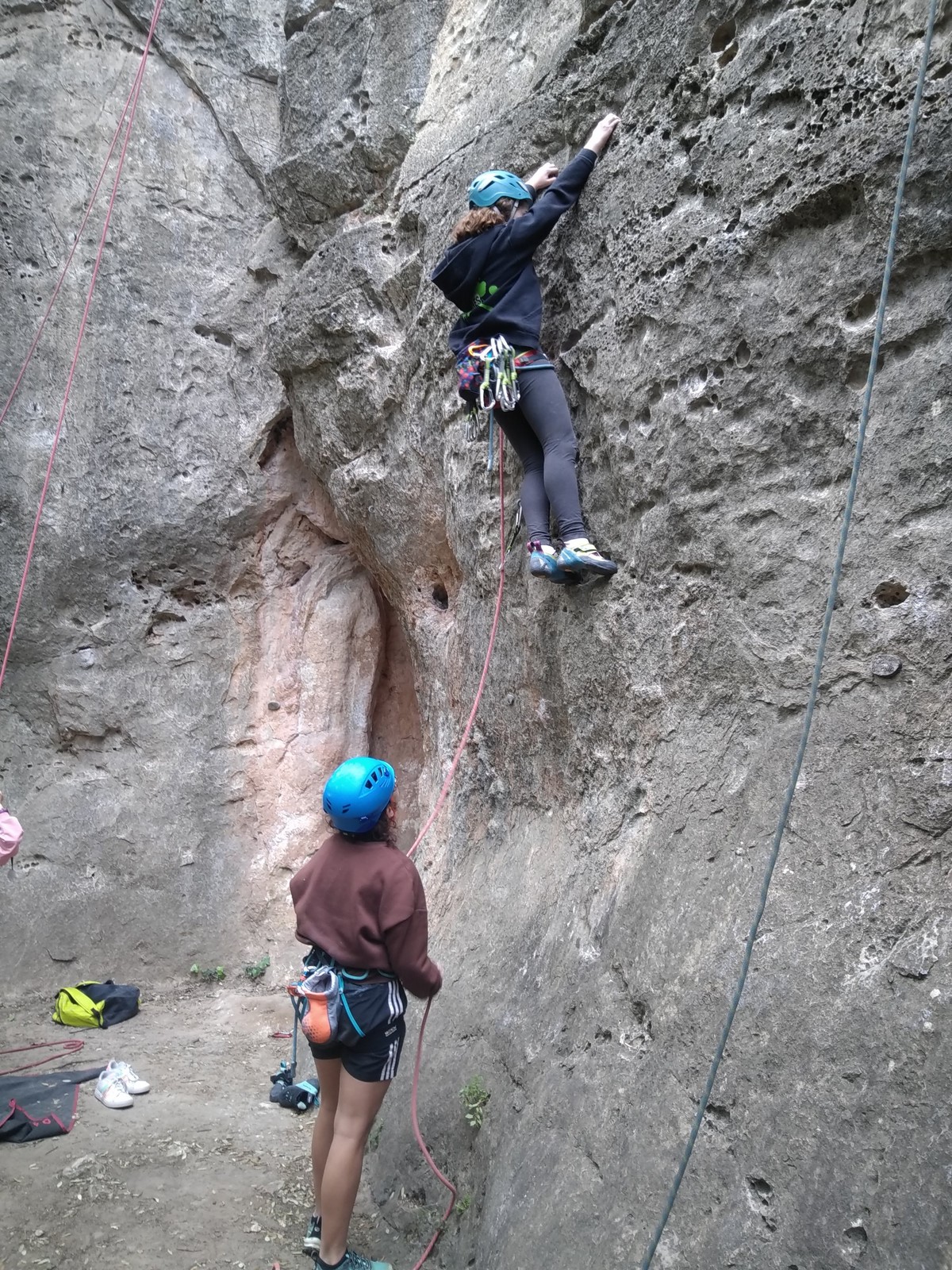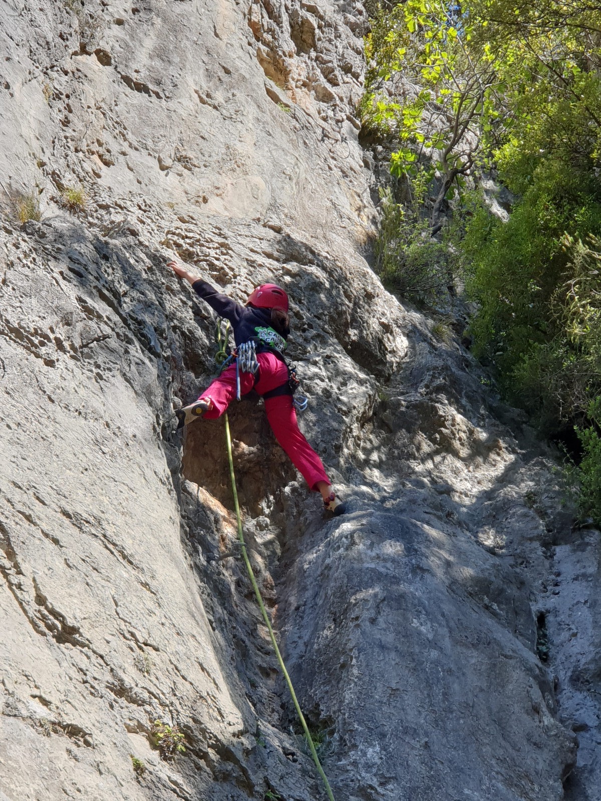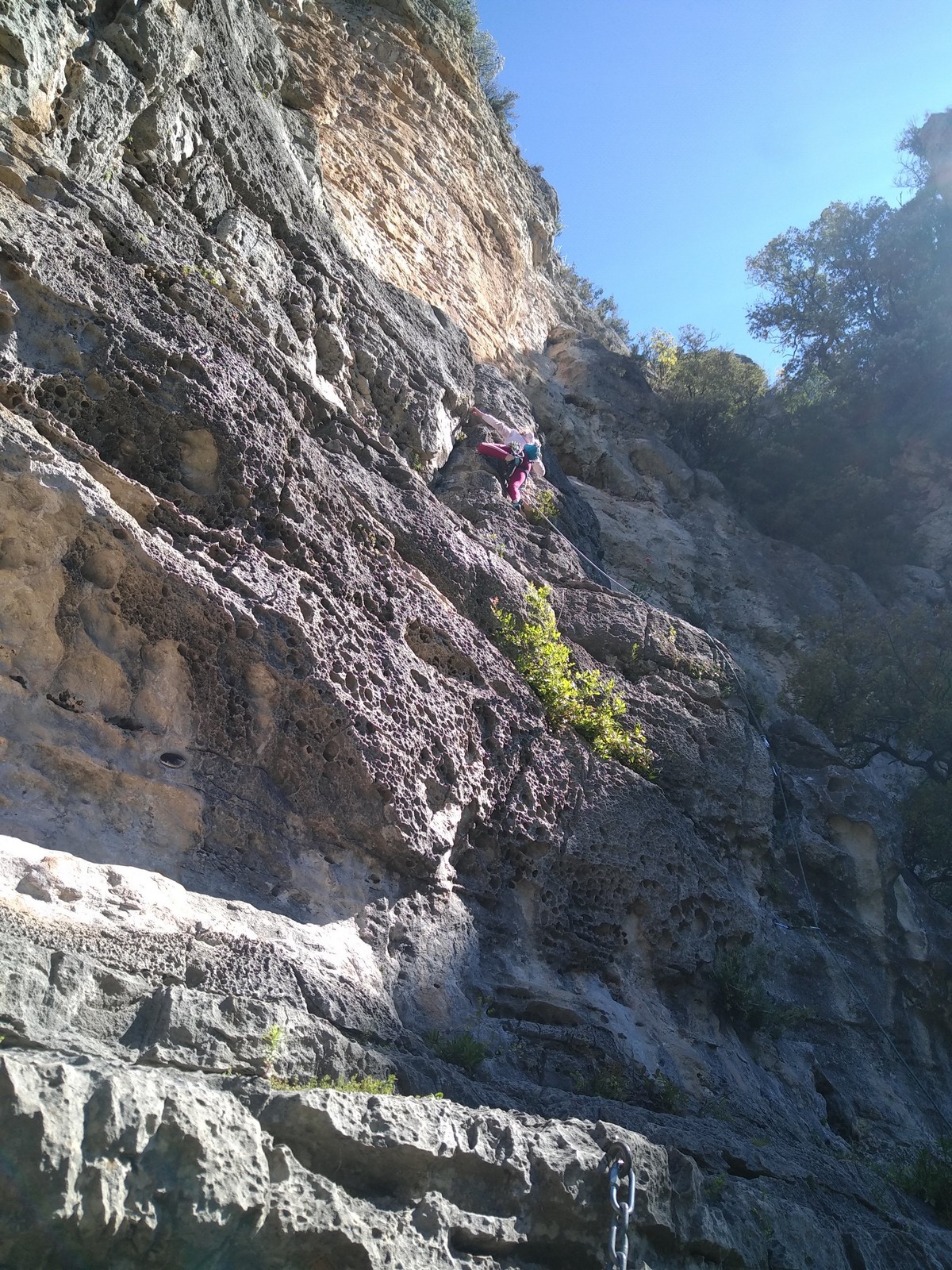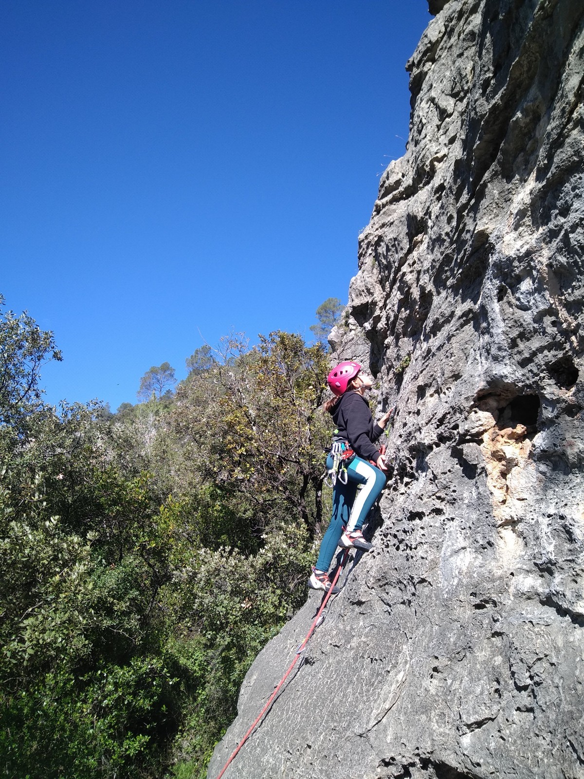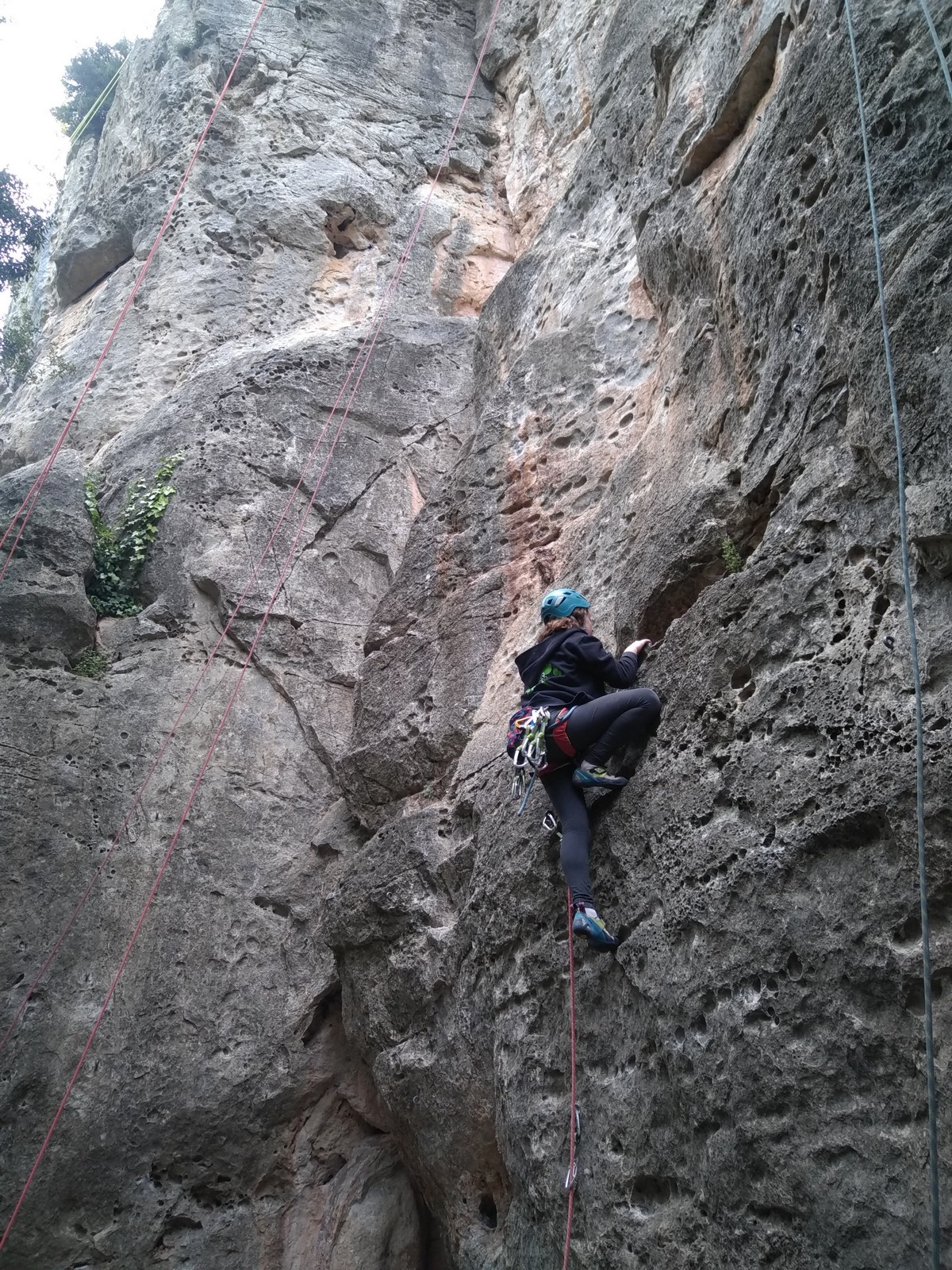 Aujourd’hui nous jetons notre dévolu sur les secteurs » Tintin », tout petit secteur idéal pour réviser l’escalade en tête dans des voies courtes et faciles et le secteur situé sur la vire juste au dessus proposant des voies d’un peu plus d’ampleur jusqu’à 7a. Le côté pratique étant qu’ici lorsque nous sommes à l’étage, sur la terrasse, nous avons quasiment les pieds au niveau des relais du secteur inférieur et c’est ainsi que les jeunes novices peuvent sereinement réviser ou même apprendre à faire la « manip » nécessaire lorsque l’on grimpe en tête. Aujourd’hui le soleil est présent mais le petit vent s’engouffrant dans le « vallon sourn » nous raffermit les chairs et nous interdit toute escalade en t-shirt. Les grimpeurs s’activent avec plus ou moins d’intensité et à 20 grimpeurs, la quasitotalité des voies sont prises. Mathis et Esteban vont grimper sur un bout de caillou juste à côté pour installer une moulinette dans un très long 6a, tandis que Léane s’essaie dans le superbe 7a du secteur « Caldoquie » à la difficulté concentrée dans les permiers mètres. Elle chute dans le passage difficile, et avec elle son humeur. Sylvain installe le superbe 6b+ juste à côté pour offrir aux plus motivés une voie de 35m abordable qui sera écumée toute la journée ! An fin de matinée, nous sommes rejoints par les parents de Rose et Lilas, Didier et Amandine, ainsi que Prune la soeur, qui dorment dans un camping car non loin du vallon. Avec eux débarquent Rebecca et Marion avec sa fille Maya, qu’on retrouvera tout au long du séjour.