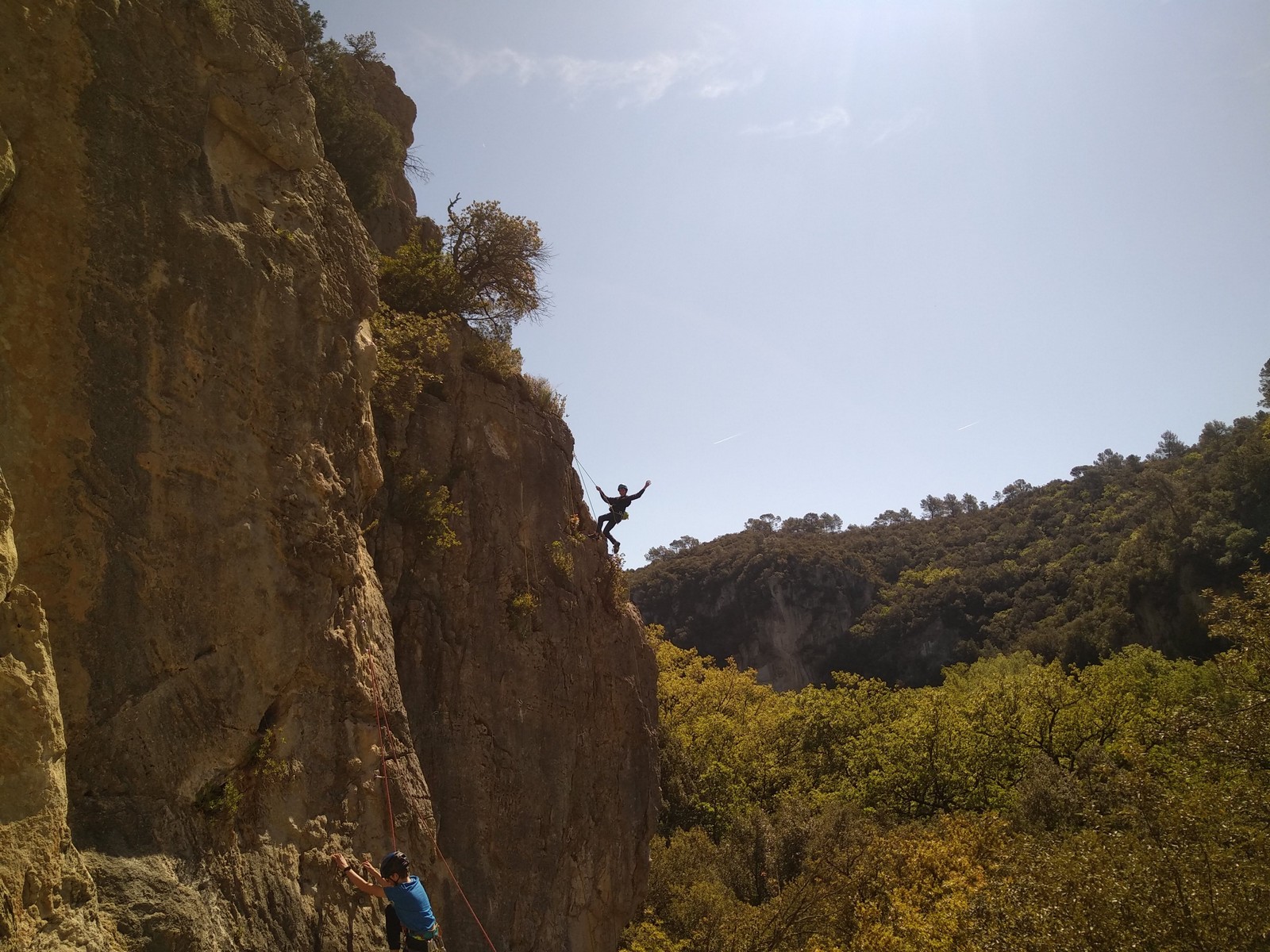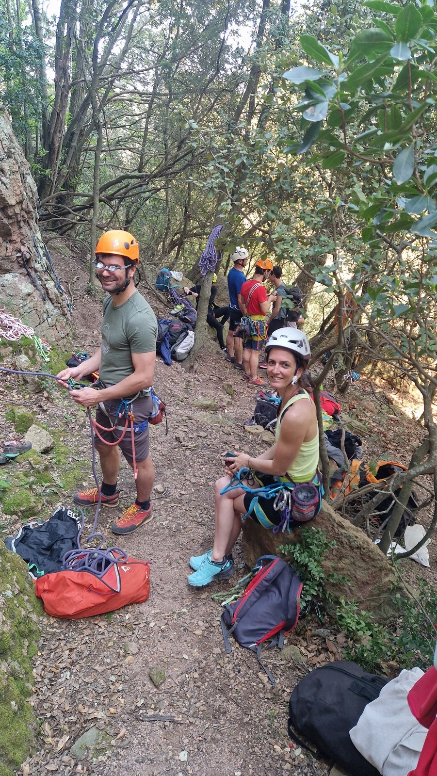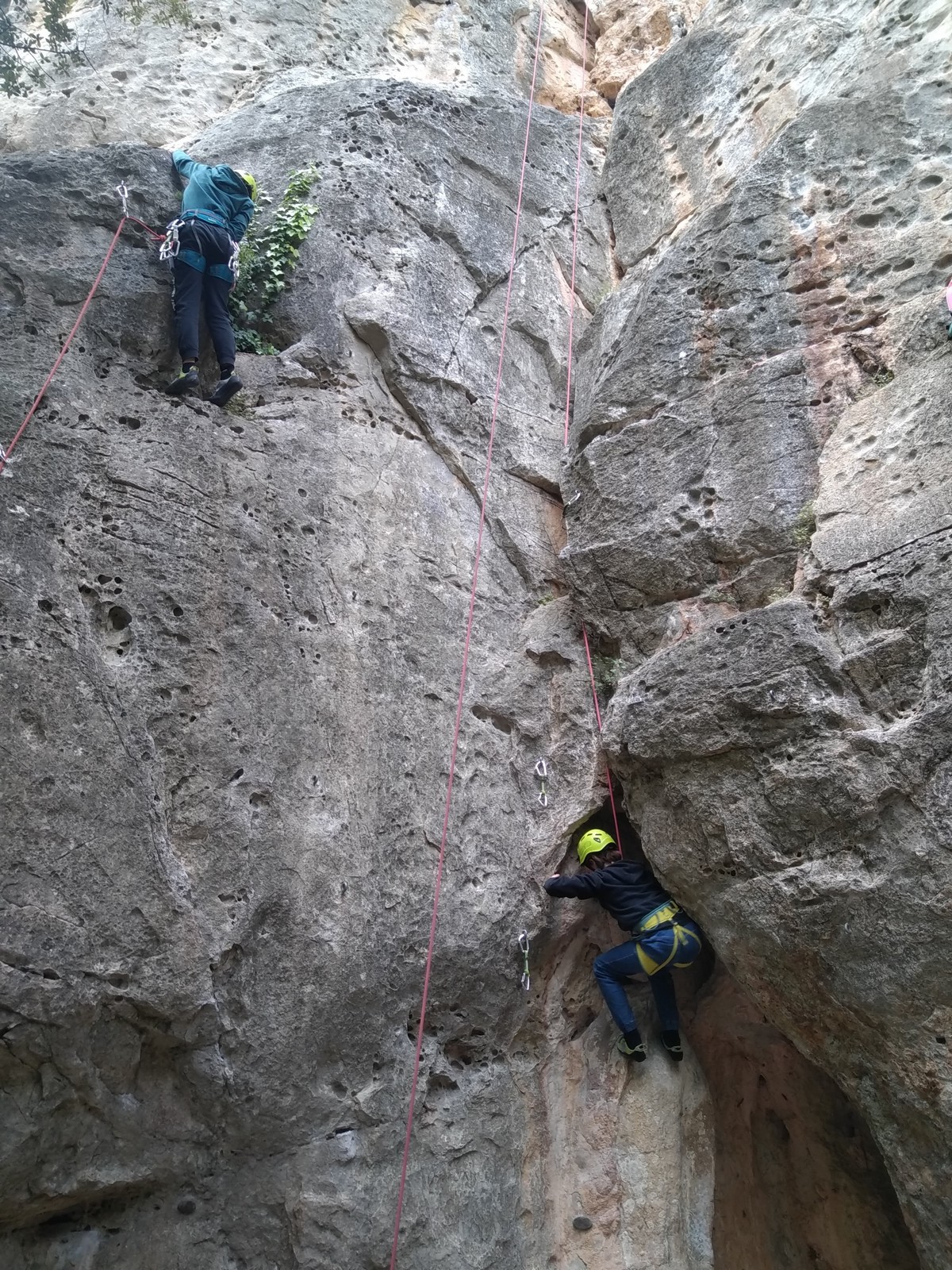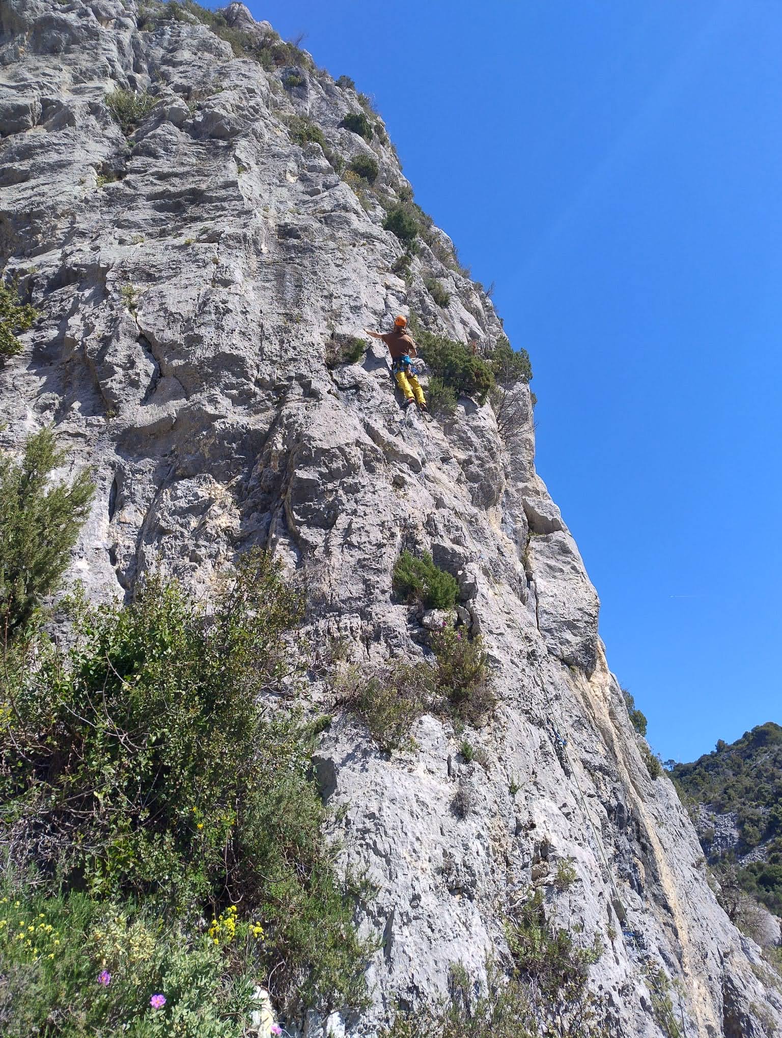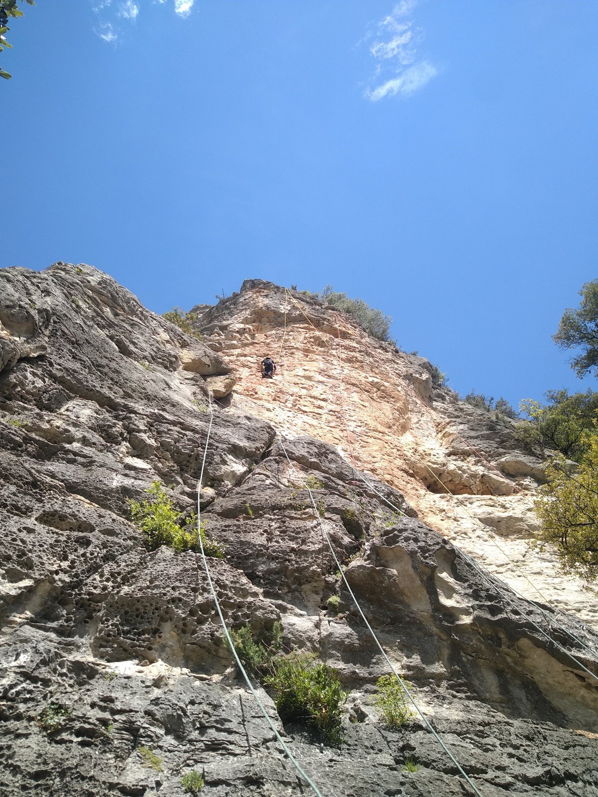 Aujourd’hui nous jetons notre dévolu sur les secteurs » Tintin », tout petit secteur idéal pour réviser l’escalade en tête dans des voies courtes et faciles et le secteur situé sur la vire juste au dessus proposant des voies d’un peu plus d’ampleur jusqu’à 7a. Le côté pratique étant qu’ici lorsque nous sommes à l’étage, sur la terrasse, nous avons quasiment les pieds au niveau des relais du secteur inférieur et c’est ainsi que les jeunes novices peuvent sereinement réviser ou même apprendre à faire la « manip » nécessaire lorsque l’on grimpe en tête. Aujourd’hui le soleil est présent mais le petit vent s’engouffrant dans le « vallon sourn » nous raffermit les chairs et nous interdit toute escalade en t-shirt. Les grimpeurs s’activent avec plus ou moins d’intensité et à 20 grimpeurs, la quasitotalité des voies sont prises. Mathis et Esteban vont grimper sur un bout de caillou juste à côté pour installer une moulinette dans un très long 6a, tandis que Léane s’essaie dans le superbe 7a du secteur « Caldoquie » à la difficulté concentrée dans les permiers mètres. Elle chute dans le passage difficile, et avec elle son humeur. Sylvain installe le superbe 6b+ juste à côté pour offrir aux plus motivés une voie de 35m abordable qui sera écumée toute la journée ! An fin de matinée, nous sommes rejoints par les parents de Rose et Lilas, Didier et Amandine, ainsi que Prune la soeur, qui dorment dans un camping car non loin du vallon. Avec eux débarquent Rebecca et Marion avec sa fille Maya, qu’on retrouvera tout au long du séjour.
