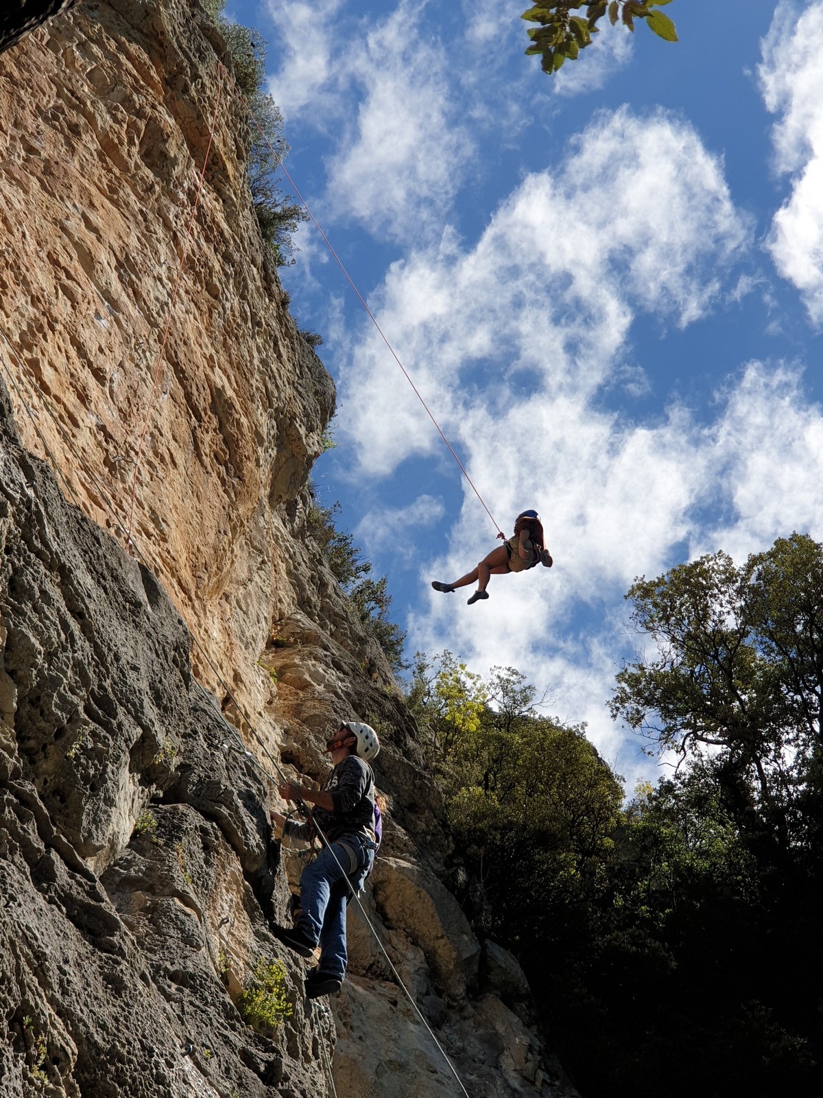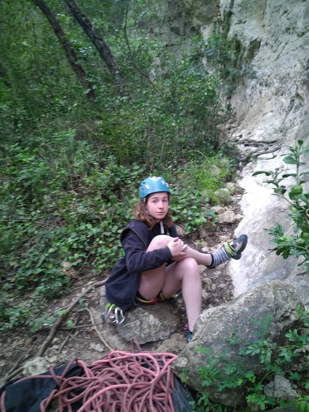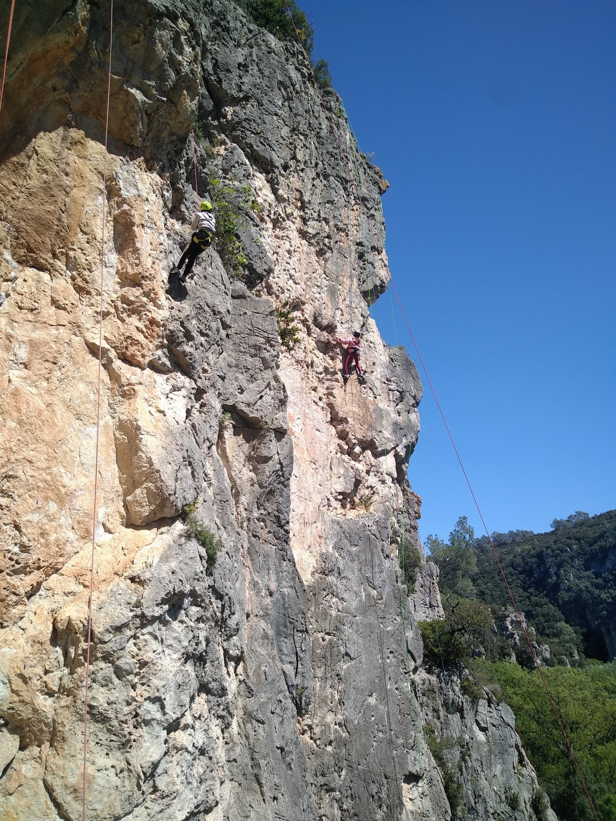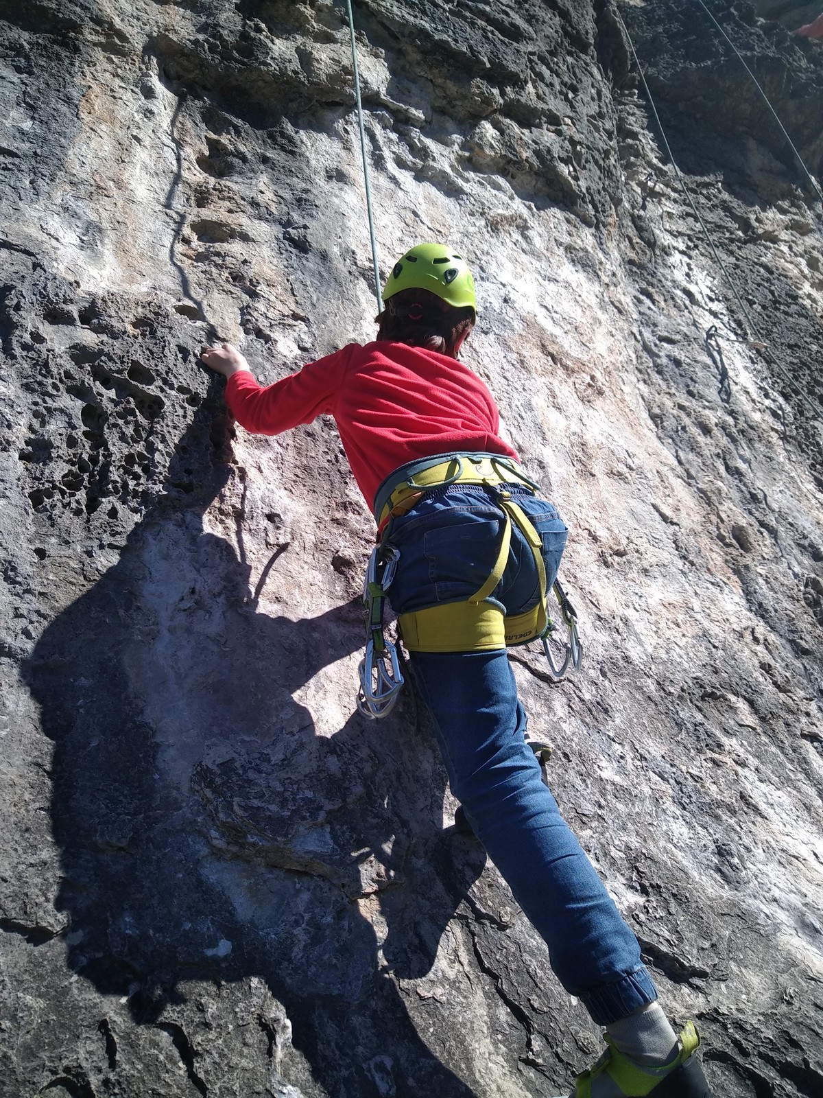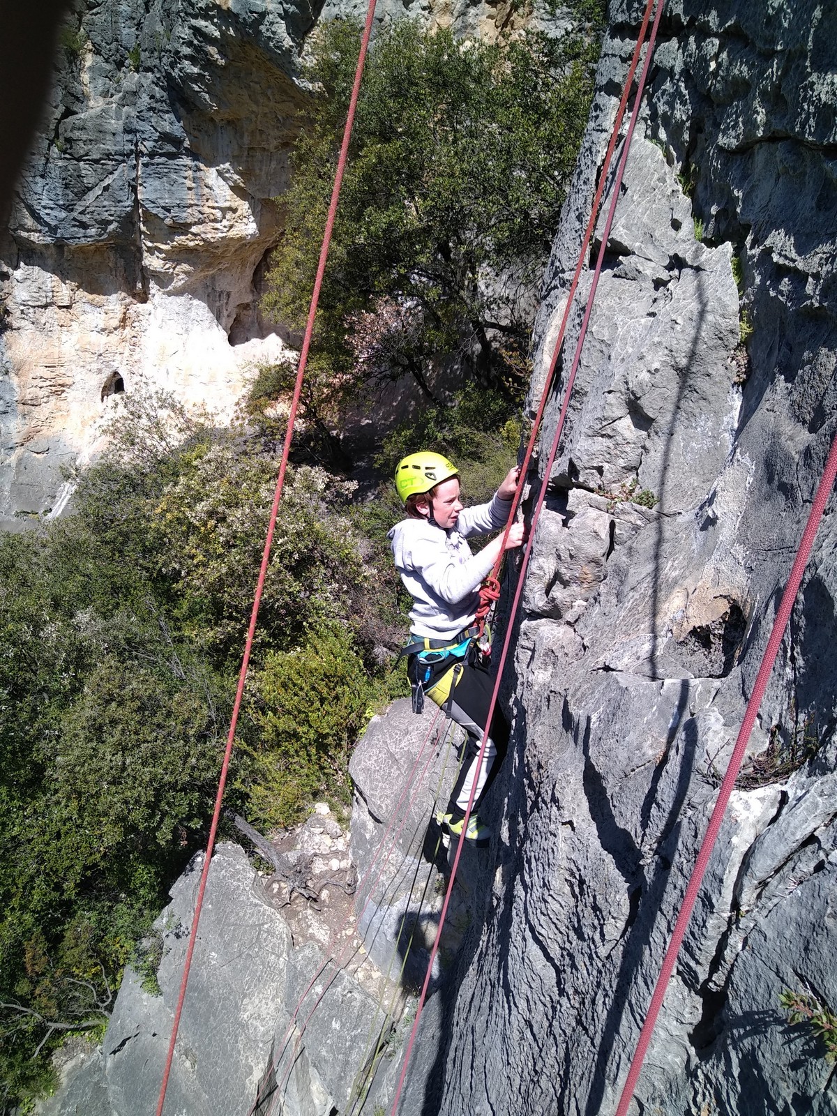 Aujourd’hui nous jetons notre dévolu sur les secteurs » Tintin », tout petit secteur idéal pour réviser l’escalade en tête dans des voies courtes et faciles et le secteur situé sur la vire juste au dessus proposant des voies d’un peu plus d’ampleur jusqu’à 7a. Le côté pratique étant qu’ici lorsque nous sommes à l’étage, sur la terrasse, nous avons quasiment les pieds au niveau des relais du secteur inférieur et c’est ainsi que les jeunes novices peuvent sereinement réviser ou même apprendre à faire la « manip » nécessaire lorsque l’on grimpe en tête. Aujourd’hui le soleil est présent mais le petit vent s’engouffrant dans le « vallon sourn » nous raffermit les chairs et nous interdit toute escalade en t-shirt. Les grimpeurs s’activent avec plus ou moins d’intensité et à 20 grimpeurs, la quasitotalité des voies sont prises. Mathis et Esteban vont grimper sur un bout de caillou juste à côté pour installer une moulinette dans un très long 6a, tandis que Léane s’essaie dans le superbe 7a du secteur « Caldoquie » à la difficulté concentrée dans les permiers mètres. Elle chute dans le passage difficile, et avec elle son humeur. Sylvain installe le superbe 6b+ juste à côté pour offrir aux plus motivés une voie de 35m abordable qui sera écumée toute la journée ! An fin de matinée, nous sommes rejoints par les parents de Rose et Lilas, Didier et Amandine, ainsi que Prune la soeur, qui dorment dans un camping car non loin du vallon. Avec eux débarquent Rebecca et Marion avec sa fille Maya, qu’on retrouvera tout au long du séjour.