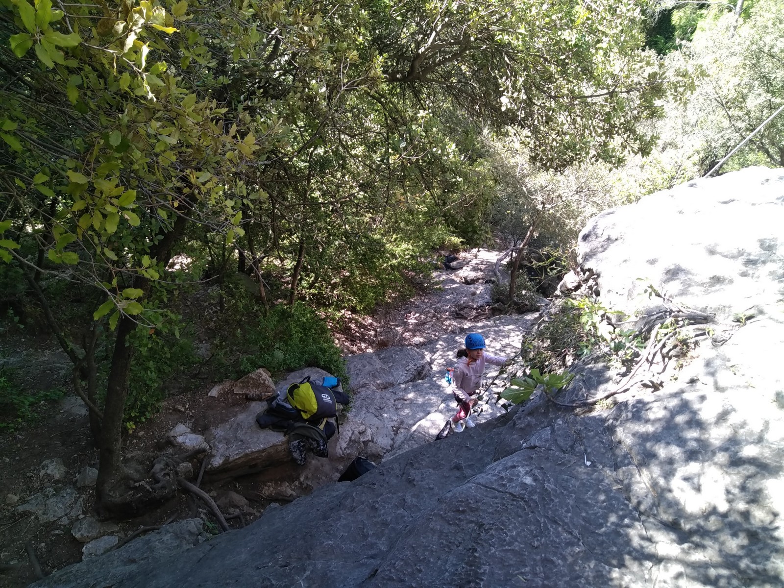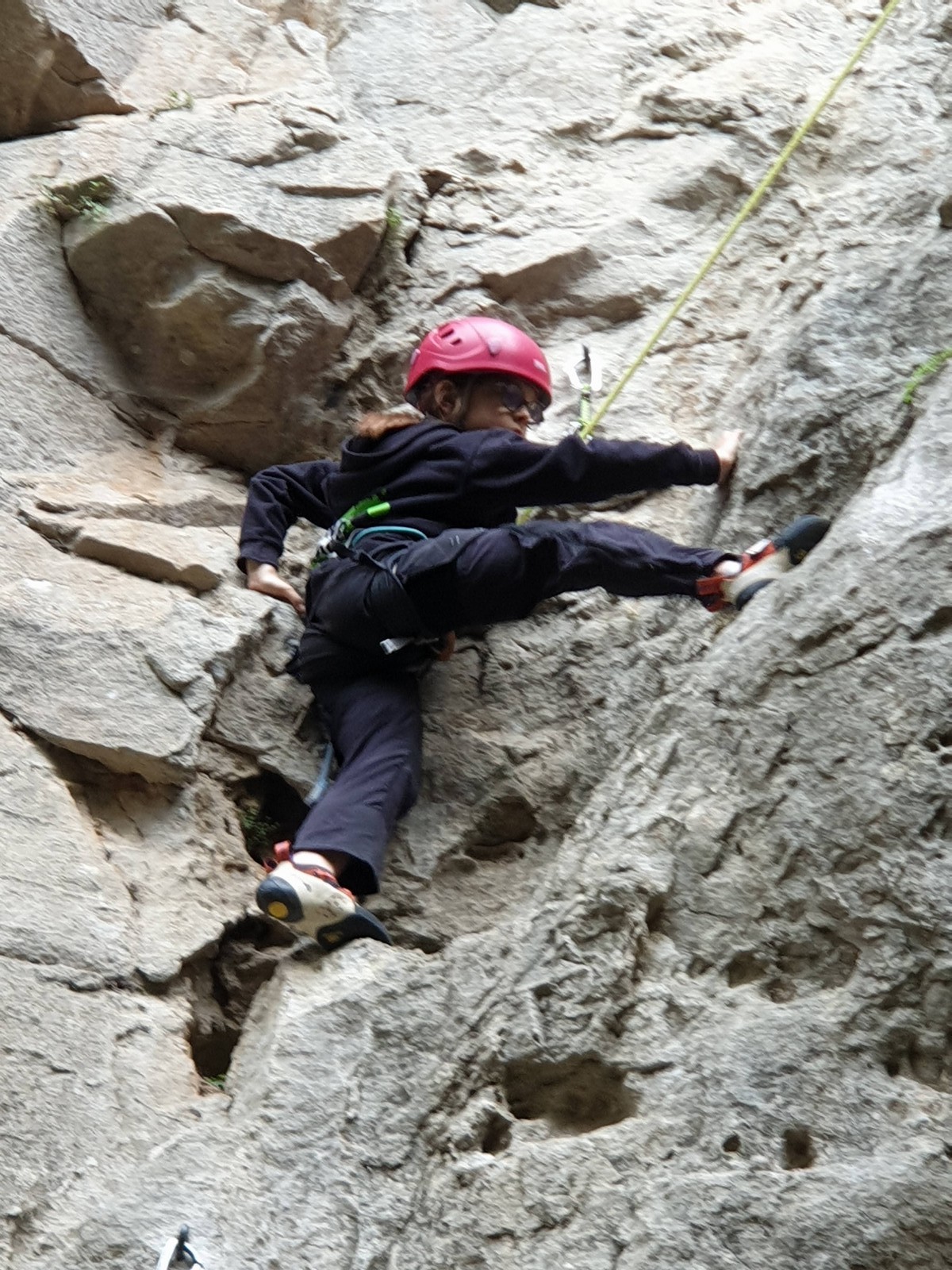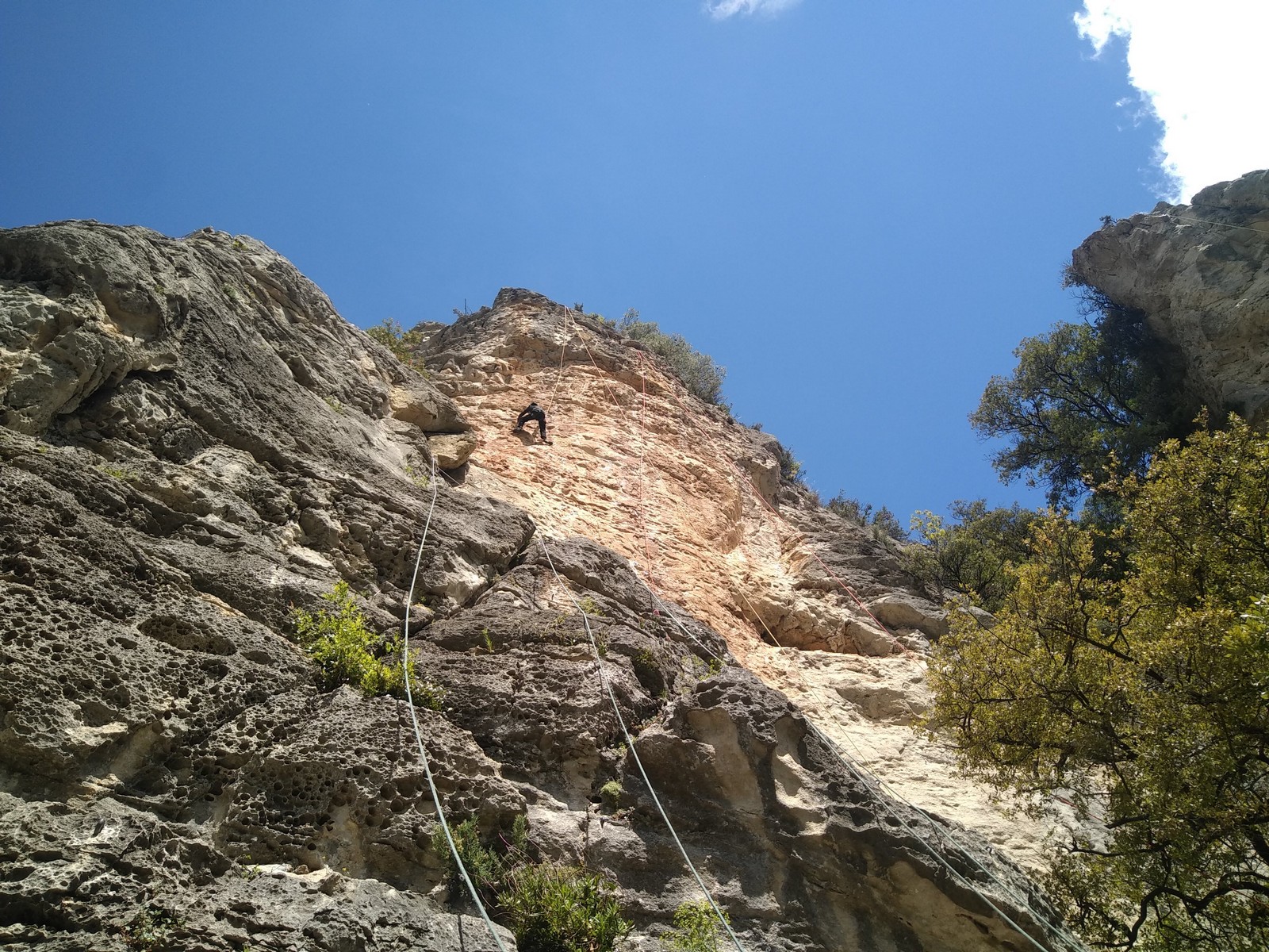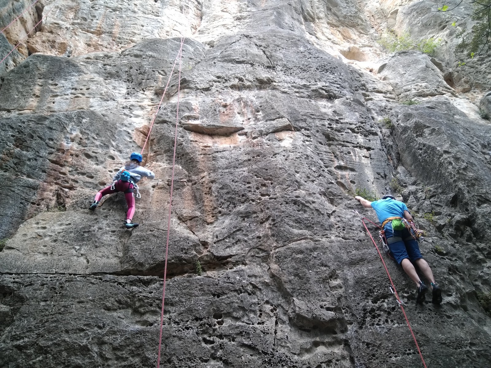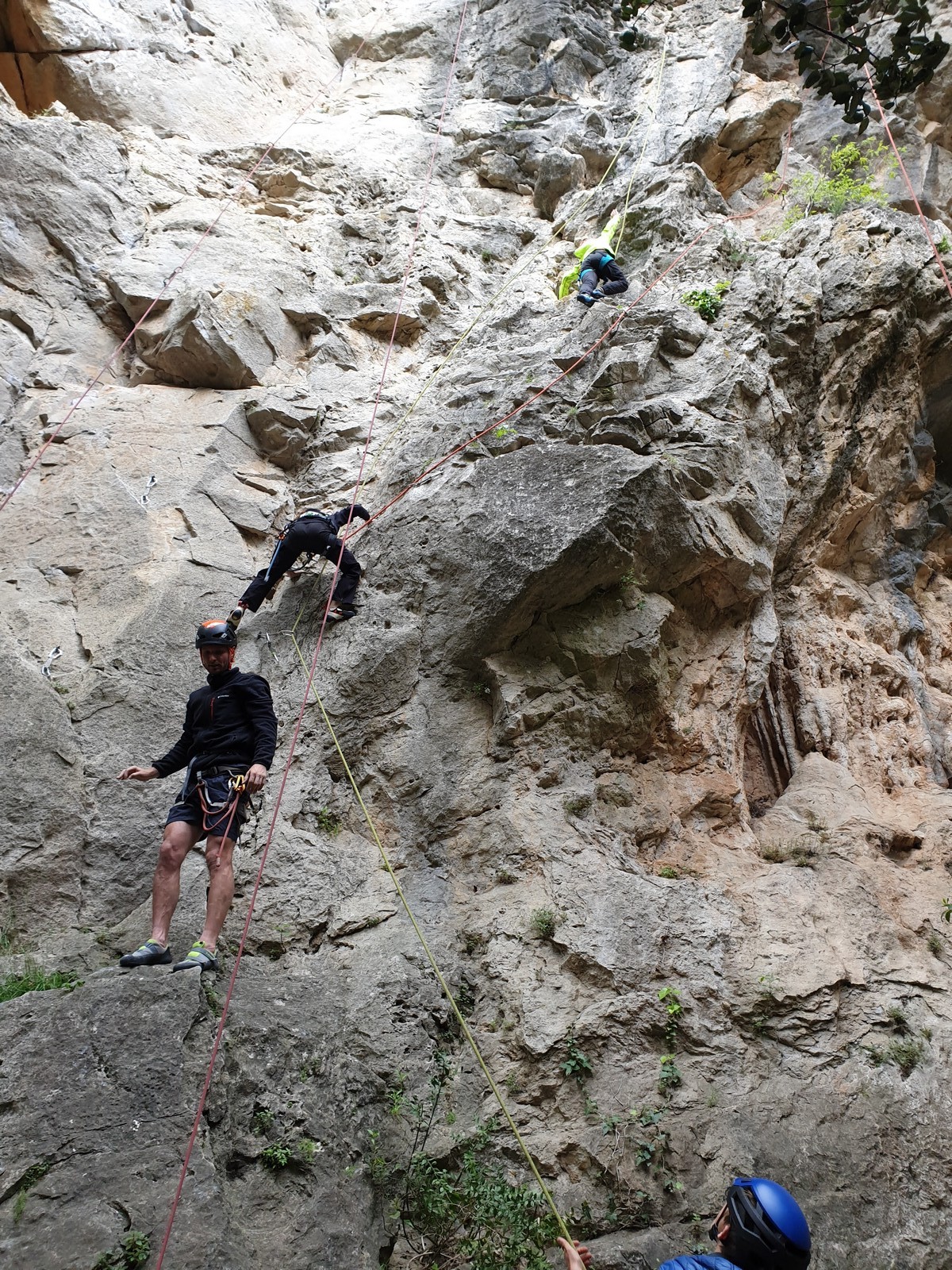 Aujourd’hui nous jetons notre dévolu sur les secteurs » Tintin », tout petit secteur idéal pour réviser l’escalade en tête dans des voies courtes et faciles et le secteur situé sur la vire juste au dessus proposant des voies d’un peu plus d’ampleur jusqu’à 7a. Le côté pratique étant qu’ici lorsque nous sommes à l’étage, sur la terrasse, nous avons quasiment les pieds au niveau des relais du secteur inférieur et c’est ainsi que les jeunes novices peuvent sereinement réviser ou même apprendre à faire la « manip » nécessaire lorsque l’on grimpe en tête. Aujourd’hui le soleil est présent mais le petit vent s’engouffrant dans le « vallon sourn » nous raffermit les chairs et nous interdit toute escalade en t-shirt. Les grimpeurs s’activent avec plus ou moins d’intensité et à 20 grimpeurs, la quasitotalité des voies sont prises. Mathis et Esteban vont grimper sur un bout de caillou juste à côté pour installer une moulinette dans un très long 6a, tandis que Léane s’essaie dans le superbe 7a du secteur « Caldoquie » à la difficulté concentrée dans les permiers mètres. Elle chute dans le passage difficile, et avec elle son humeur. Sylvain installe le superbe 6b+ juste à côté pour offrir aux plus motivés une voie de 35m abordable qui sera écumée toute la journée ! An fin de matinée, nous sommes rejoints par les parents de Rose et Lilas, Didier et Amandine, ainsi que Prune la soeur, qui dorment dans un camping car non loin du vallon. Avec eux débarquent Rebecca et Marion avec sa fille Maya, qu’on retrouvera tout au long du séjour.