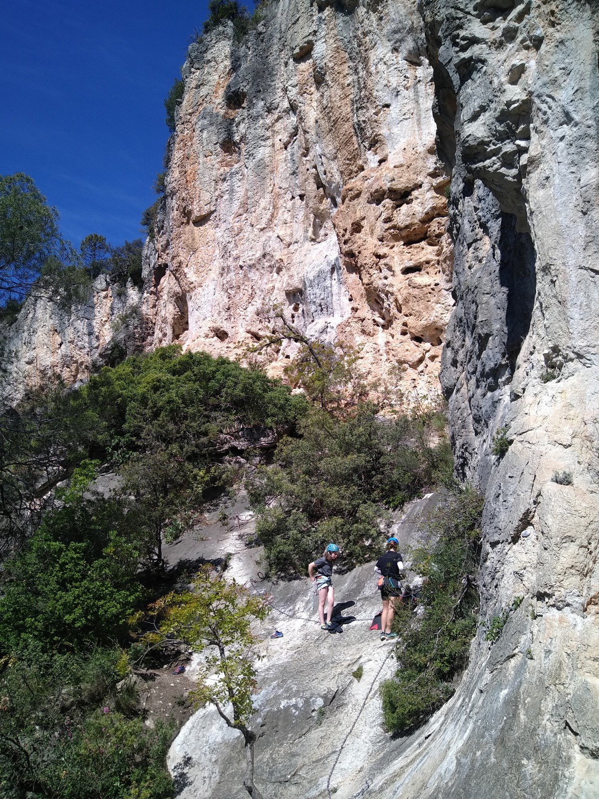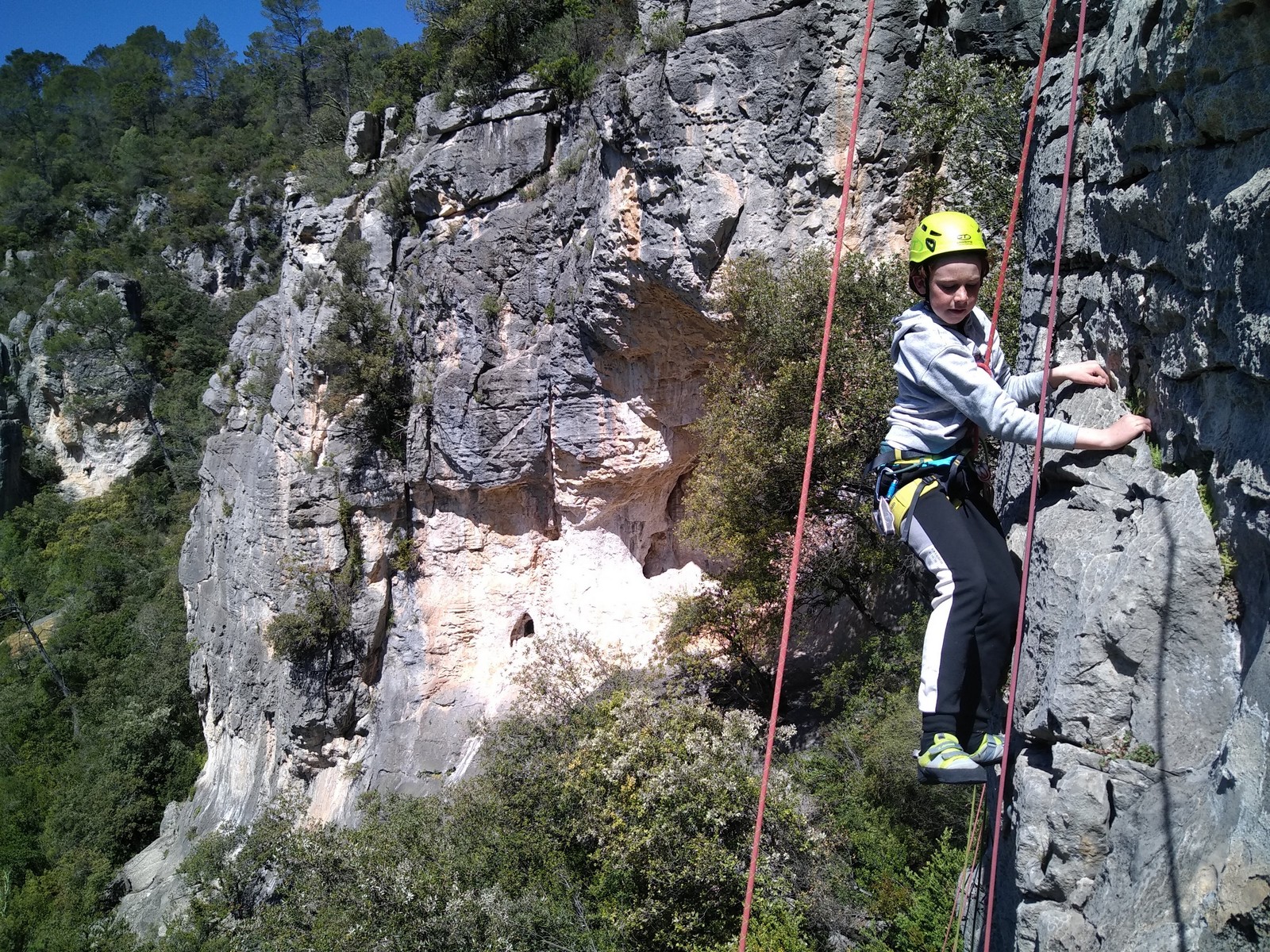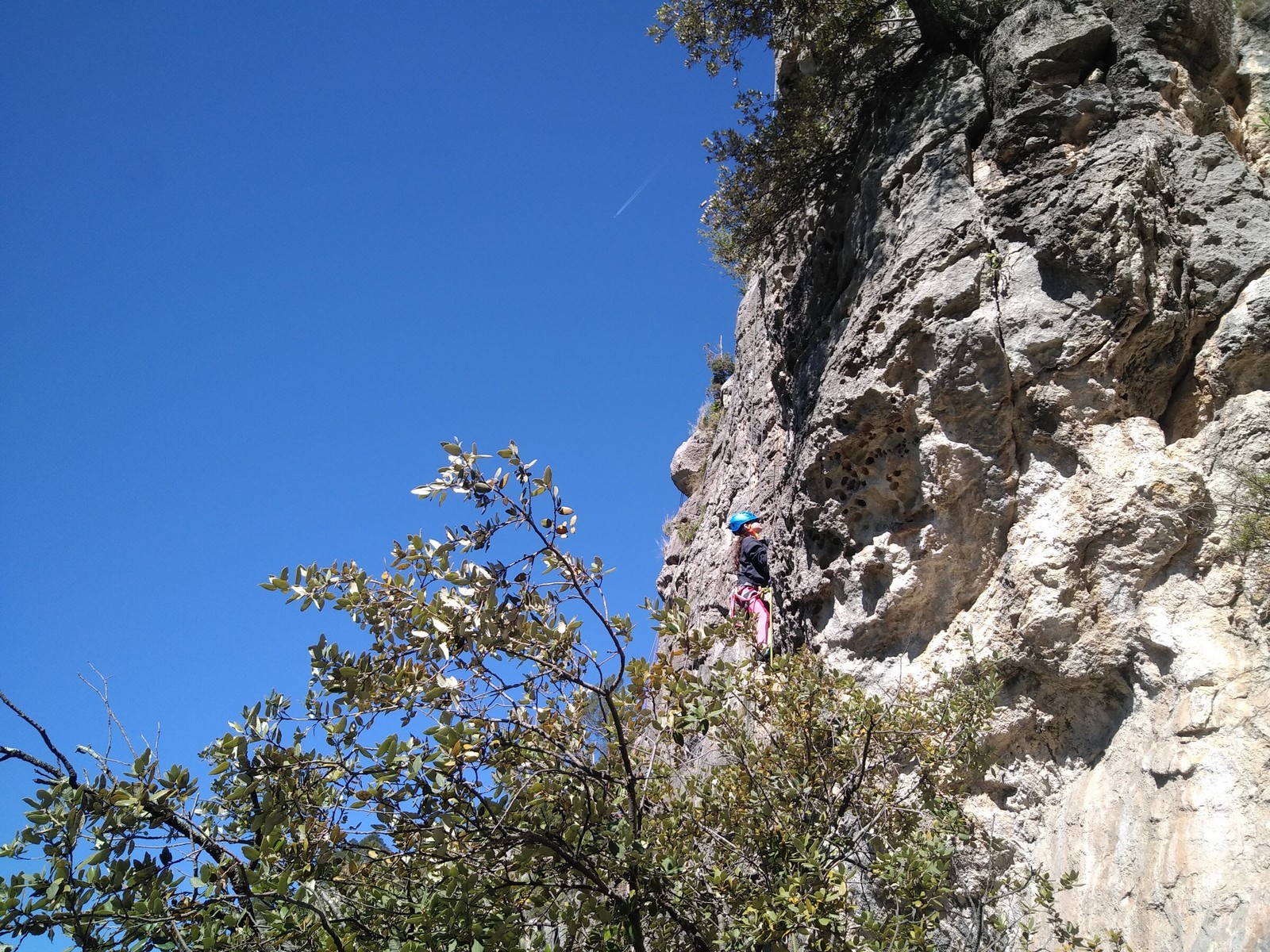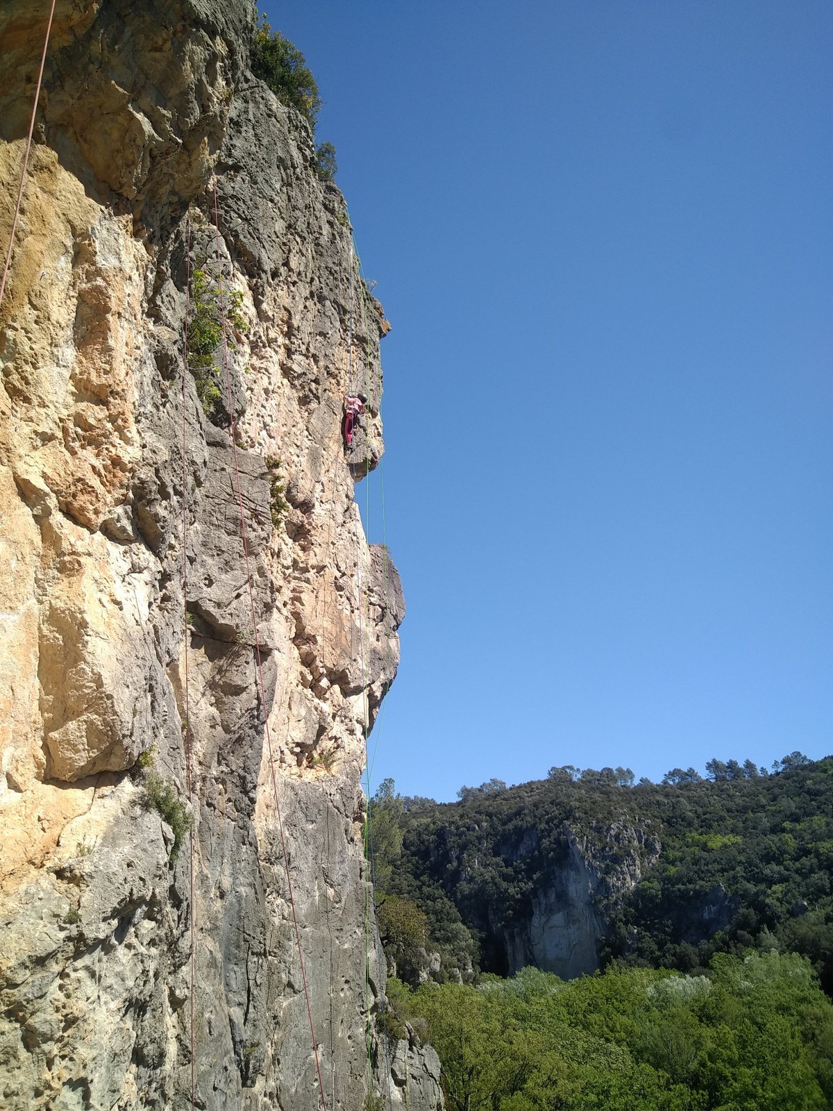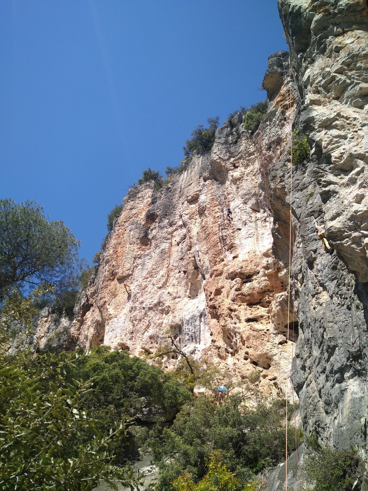 Aujourd’hui nous jetons notre dévolu sur les secteurs » Tintin », tout petit secteur idéal pour réviser l’escalade en tête dans des voies courtes et faciles et le secteur situé sur la vire juste au dessus proposant des voies d’un peu plus d’ampleur jusqu’à 7a. Le côté pratique étant qu’ici lorsque nous sommes à l’étage, sur la terrasse, nous avons quasiment les pieds au niveau des relais du secteur inférieur et c’est ainsi que les jeunes novices peuvent sereinement réviser ou même apprendre à faire la « manip » nécessaire lorsque l’on grimpe en tête. Aujourd’hui le soleil est présent mais le petit vent s’engouffrant dans le « vallon sourn » nous raffermit les chairs et nous interdit toute escalade en t-shirt. Les grimpeurs s’activent avec plus ou moins d’intensité et à 20 grimpeurs, la quasitotalité des voies sont prises. Mathis et Esteban vont grimper sur un bout de caillou juste à côté pour installer une moulinette dans un très long 6a, tandis que Léane s’essaie dans le superbe 7a du secteur « Caldoquie » à la difficulté concentrée dans les permiers mètres. Elle chute dans le passage difficile, et avec elle son humeur. Sylvain installe le superbe 6b+ juste à côté pour offrir aux plus motivés une voie de 35m abordable qui sera écumée toute la journée ! An fin de matinée, nous sommes rejoints par les parents de Rose et Lilas, Didier et Amandine, ainsi que Prune la soeur, qui dorment dans un camping car non loin du vallon. Avec eux débarquent Rebecca et Marion avec sa fille Maya, qu’on retrouvera tout au long du séjour.