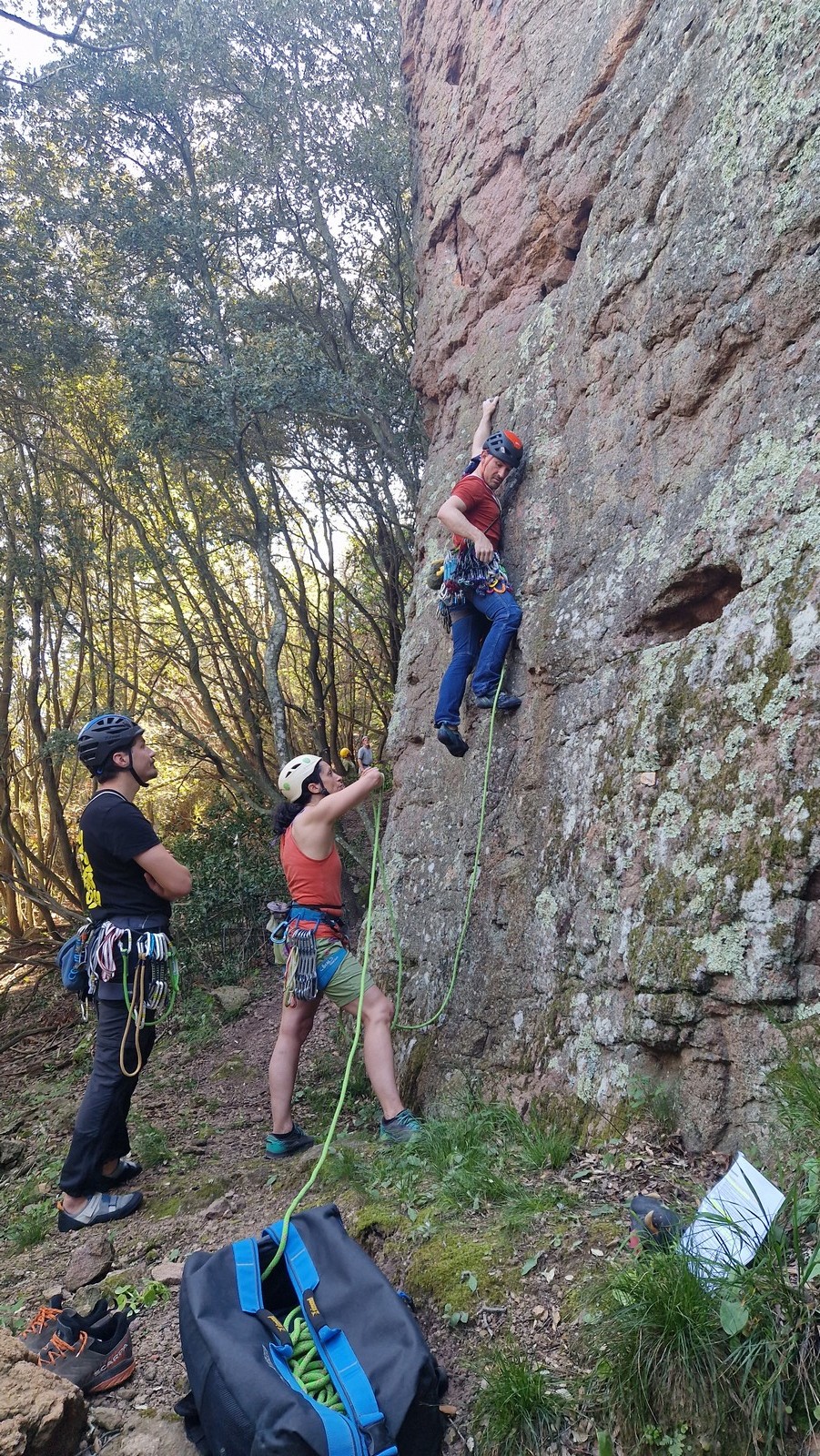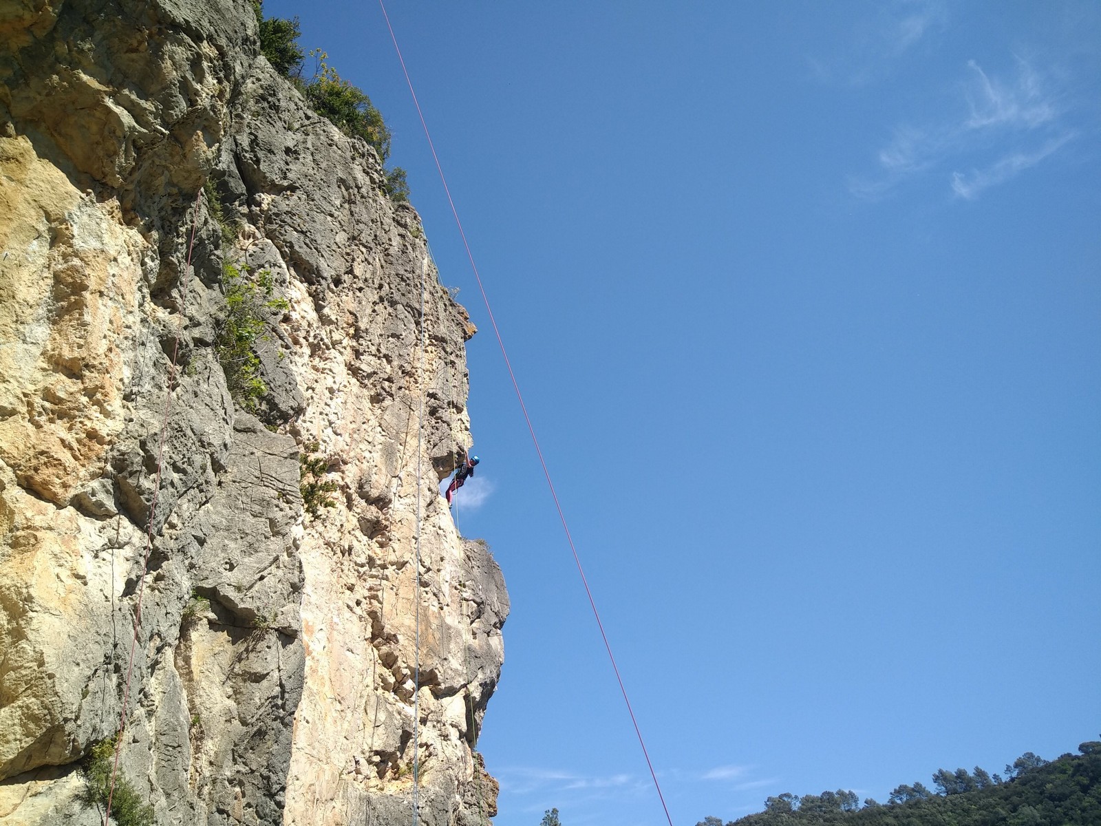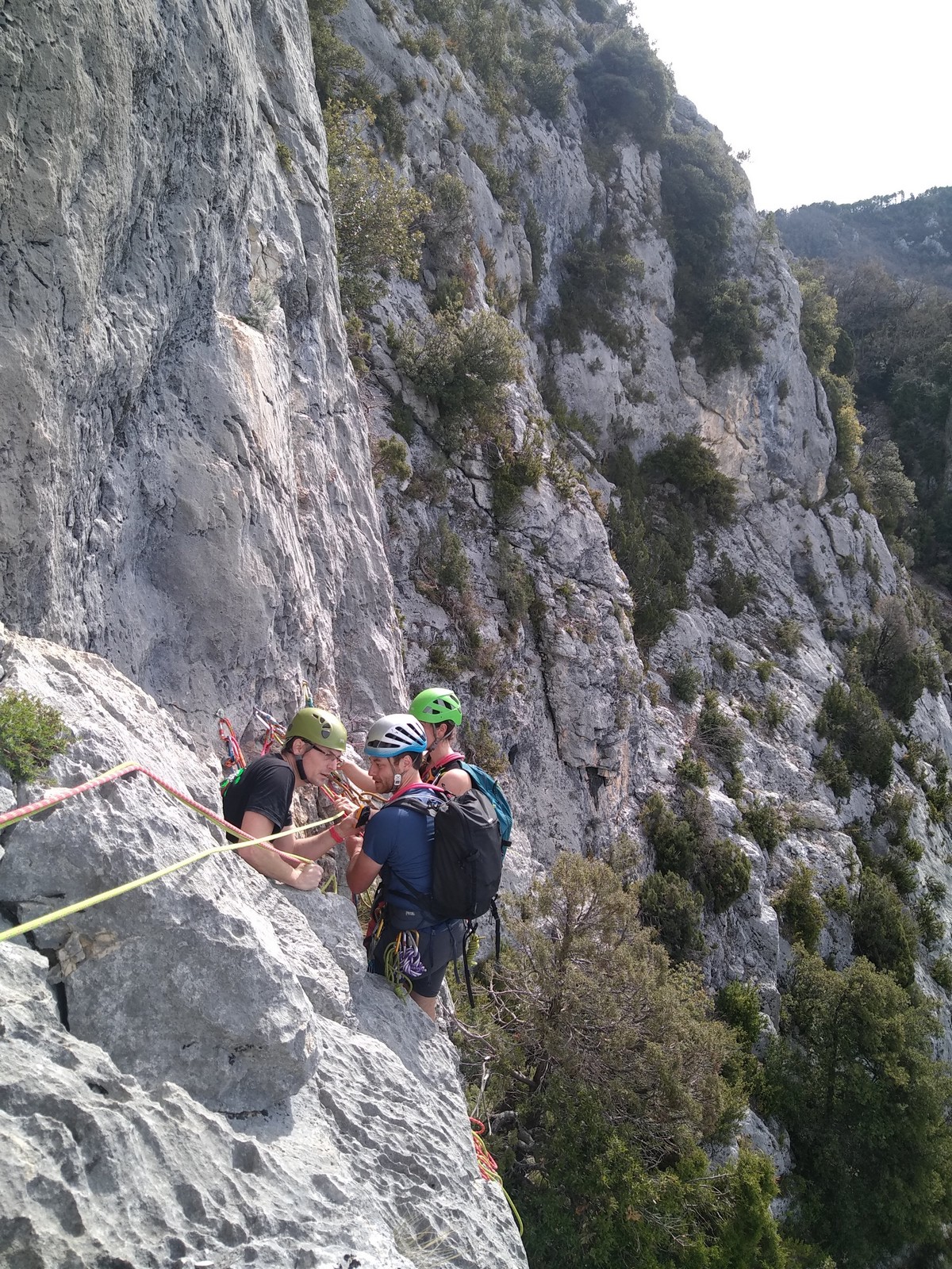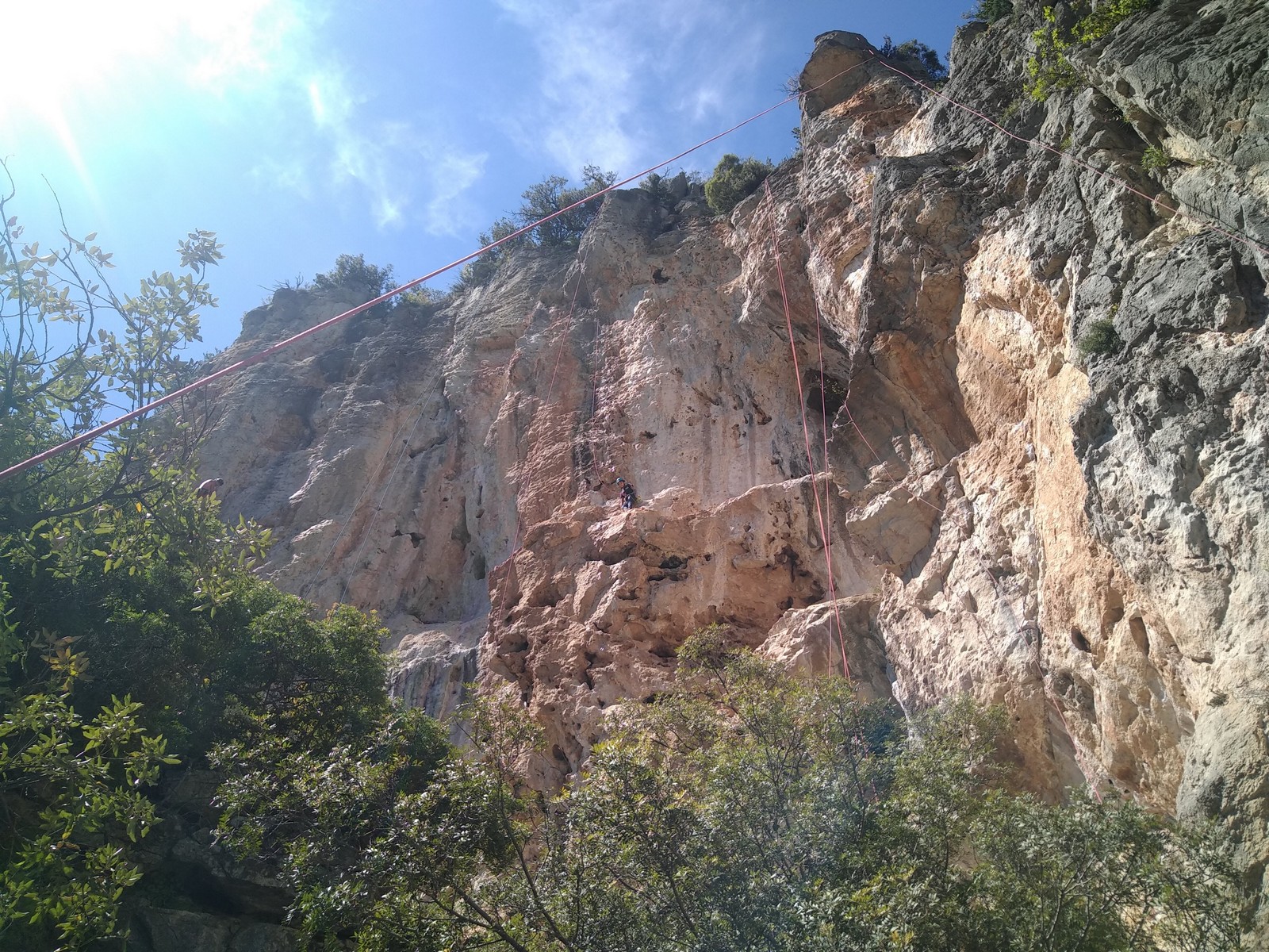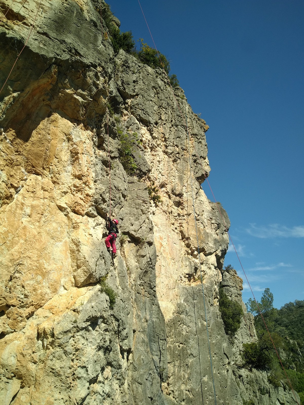 Aujourd’hui nous jetons notre dévolu sur les secteurs » Tintin », tout petit secteur idéal pour réviser l’escalade en tête dans des voies courtes et faciles et le secteur situé sur la vire juste au dessus proposant des voies d’un peu plus d’ampleur jusqu’à 7a. Le côté pratique étant qu’ici lorsque nous sommes à l’étage, sur la terrasse, nous avons quasiment les pieds au niveau des relais du secteur inférieur et c’est ainsi que les jeunes novices peuvent sereinement réviser ou même apprendre à faire la « manip » nécessaire lorsque l’on grimpe en tête. Aujourd’hui le soleil est présent mais le petit vent s’engouffrant dans le « vallon sourn » nous raffermit les chairs et nous interdit toute escalade en t-shirt. Les grimpeurs s’activent avec plus ou moins d’intensité et à 20 grimpeurs, la quasitotalité des voies sont prises. Mathis et Esteban vont grimper sur un bout de caillou juste à côté pour installer une moulinette dans un très long 6a, tandis que Léane s’essaie dans le superbe 7a du secteur « Caldoquie » à la difficulté concentrée dans les permiers mètres. Elle chute dans le passage difficile, et avec elle son humeur. Sylvain installe le superbe 6b+ juste à côté pour offrir aux plus motivés une voie de 35m abordable qui sera écumée toute la journée ! An fin de matinée, nous sommes rejoints par les parents de Rose et Lilas, Didier et Amandine, ainsi que Prune la soeur, qui dorment dans un camping car non loin du vallon. Avec eux débarquent Rebecca et Marion avec sa fille Maya, qu’on retrouvera tout au long du séjour.
