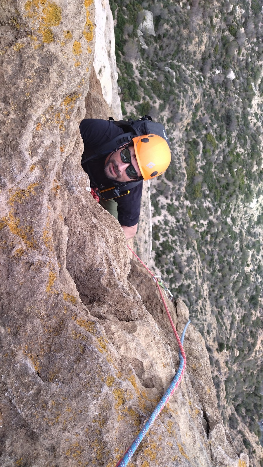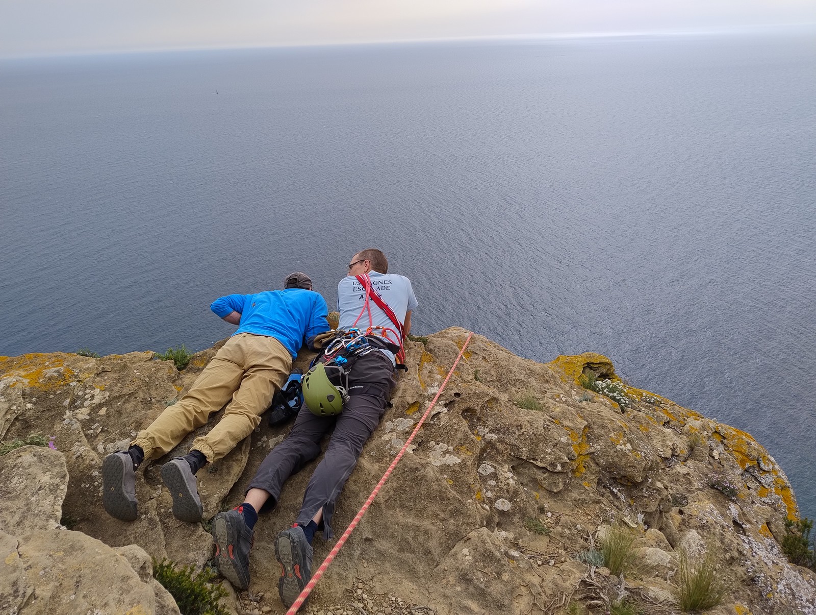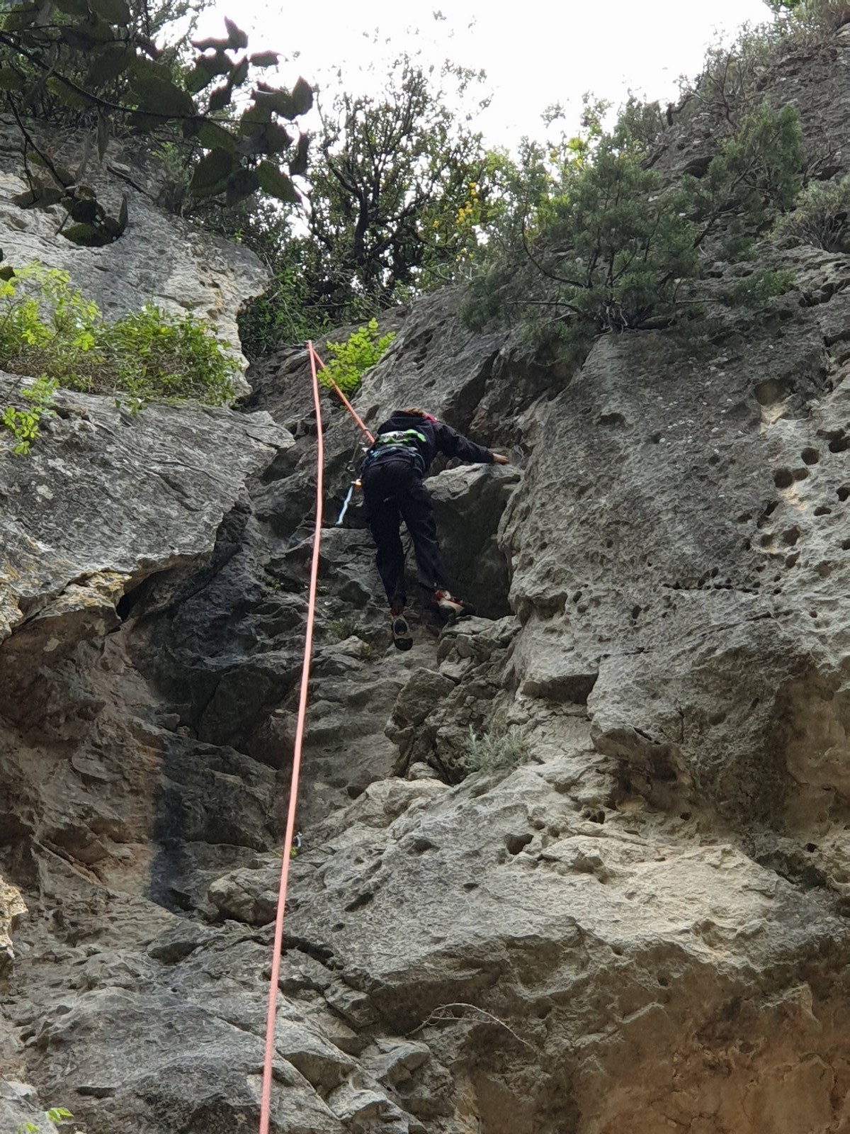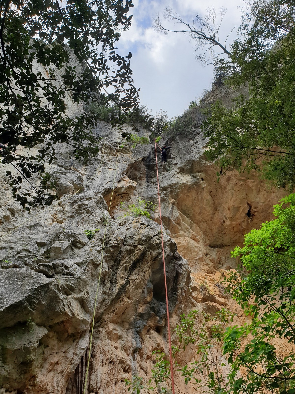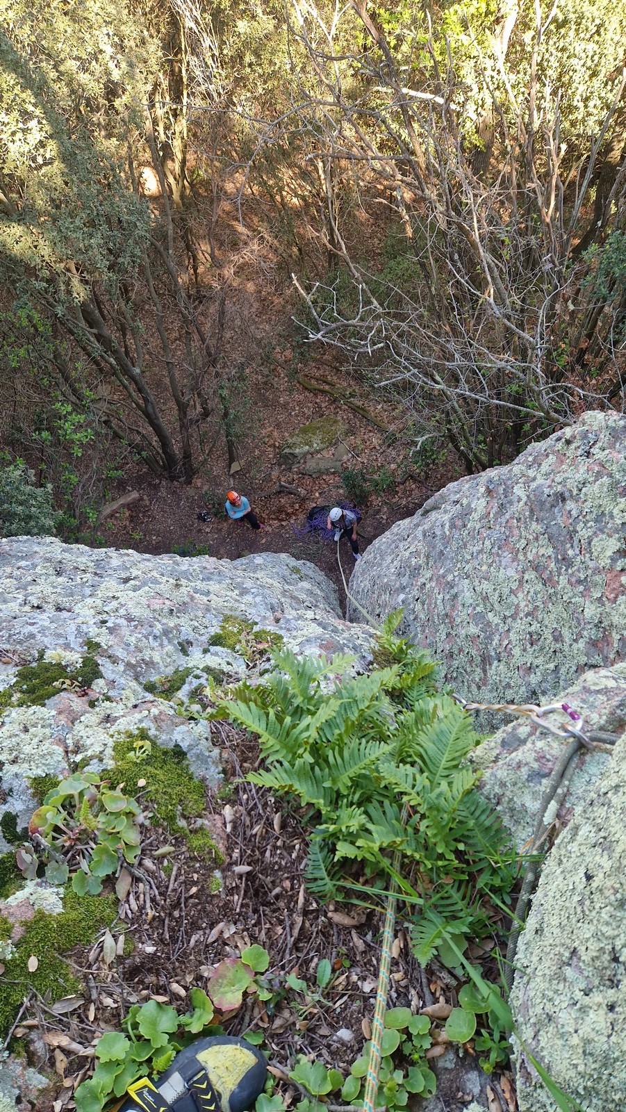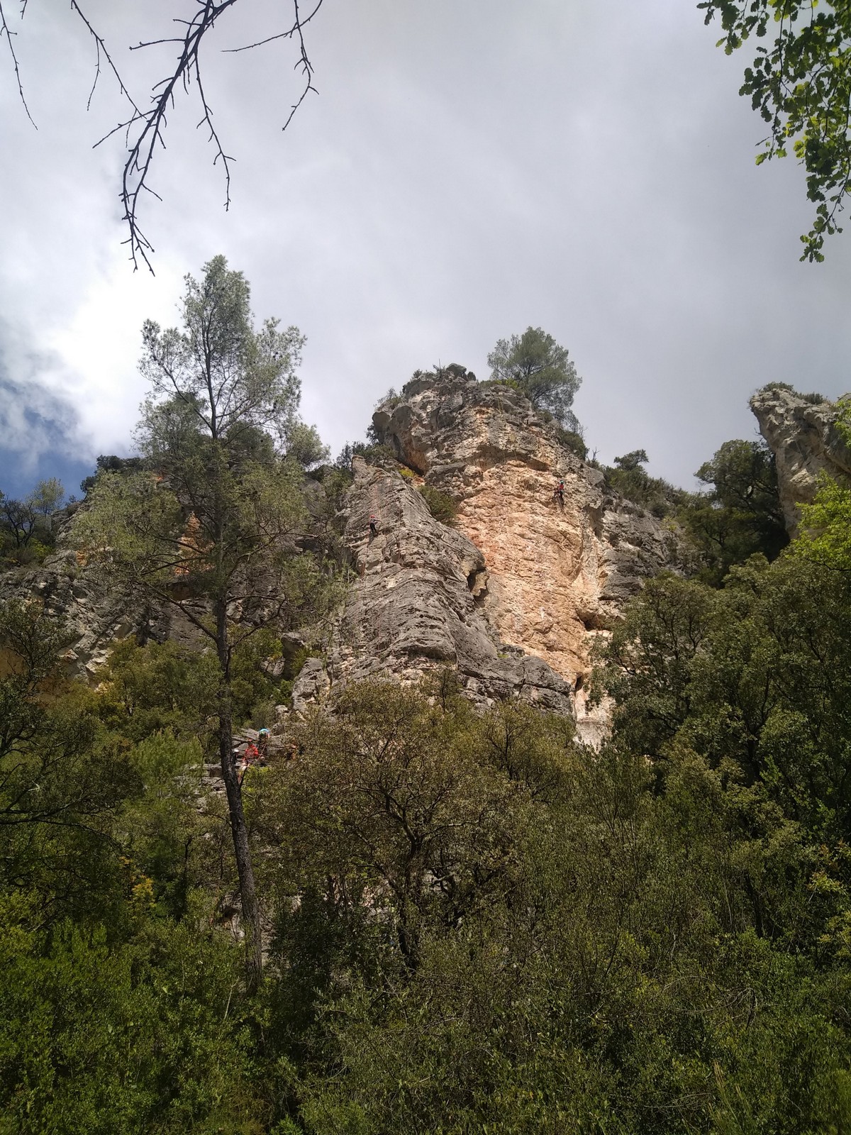Aujourd’hui nous jetons notre dévolu sur les secteurs » Tintin », tout petit secteur idéal pour réviser l’escalade en tête dans des voies courtes et faciles et le secteur situé sur la vire juste au dessus proposant des voies d’un peu plus d’ampleur jusqu’à 7a. Le côté pratique étant qu’ici lorsque nous sommes à l’étage, sur la terrasse, nous avons quasiment les pieds au niveau des relais du secteur inférieur et c’est ainsi que les jeunes novices peuvent sereinement réviser ou même apprendre à faire la « manip » nécessaire lorsque l’on grimpe en tête. Aujourd’hui le soleil est présent mais le petit vent s’engouffrant dans le « vallon sourn » nous raffermit les chairs et nous interdit toute escalade en t-shirt. Les grimpeurs s’activent avec plus ou moins d’intensité et à 20 grimpeurs, la quasitotalité des voies sont prises. Mathis et Esteban vont grimper sur un bout de caillou juste à côté pour installer une moulinette dans un très long 6a, tandis que Léane s’essaie dans le superbe 7a du secteur « Caldoquie » à la difficulté concentrée dans les permiers mètres. Elle chute dans le passage difficile, et avec elle son humeur. Sylvain installe le superbe 6b+ juste à côté pour offrir aux plus motivés une voie de 35m abordable qui sera écumée toute la journée ! An fin de matinée, nous sommes rejoints par les parents de Rose et Lilas, Didier et Amandine, ainsi que Prune la soeur, qui dorment dans un camping car non loin du vallon. Avec eux débarquent Rebecca et Marion avec sa fille Maya, qu’on retrouvera tout au long du séjour.