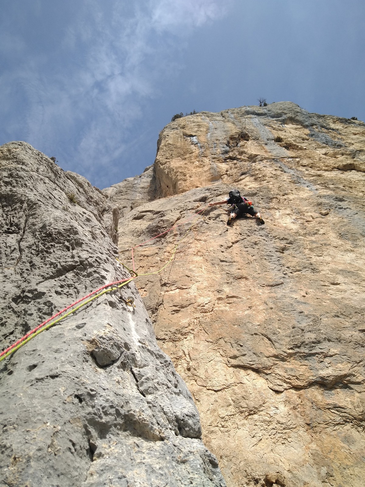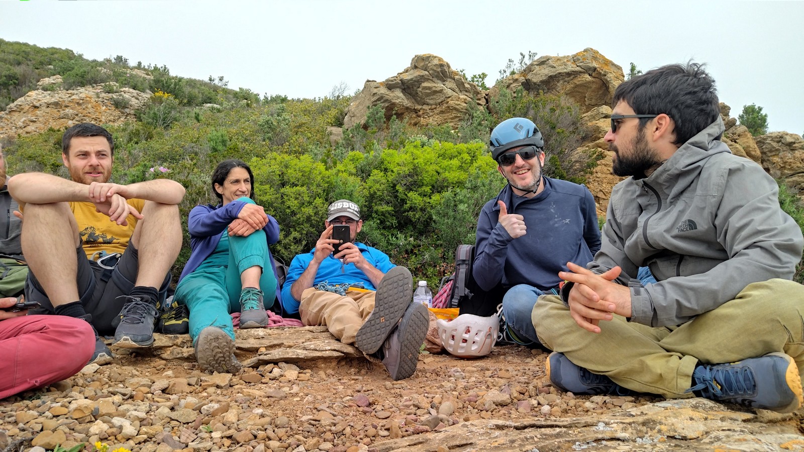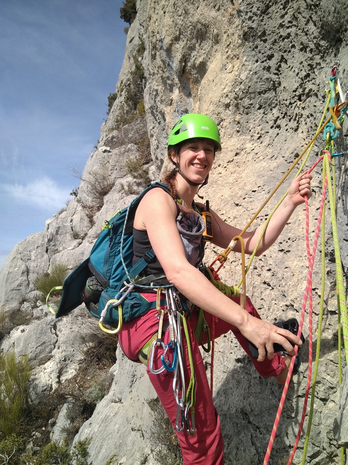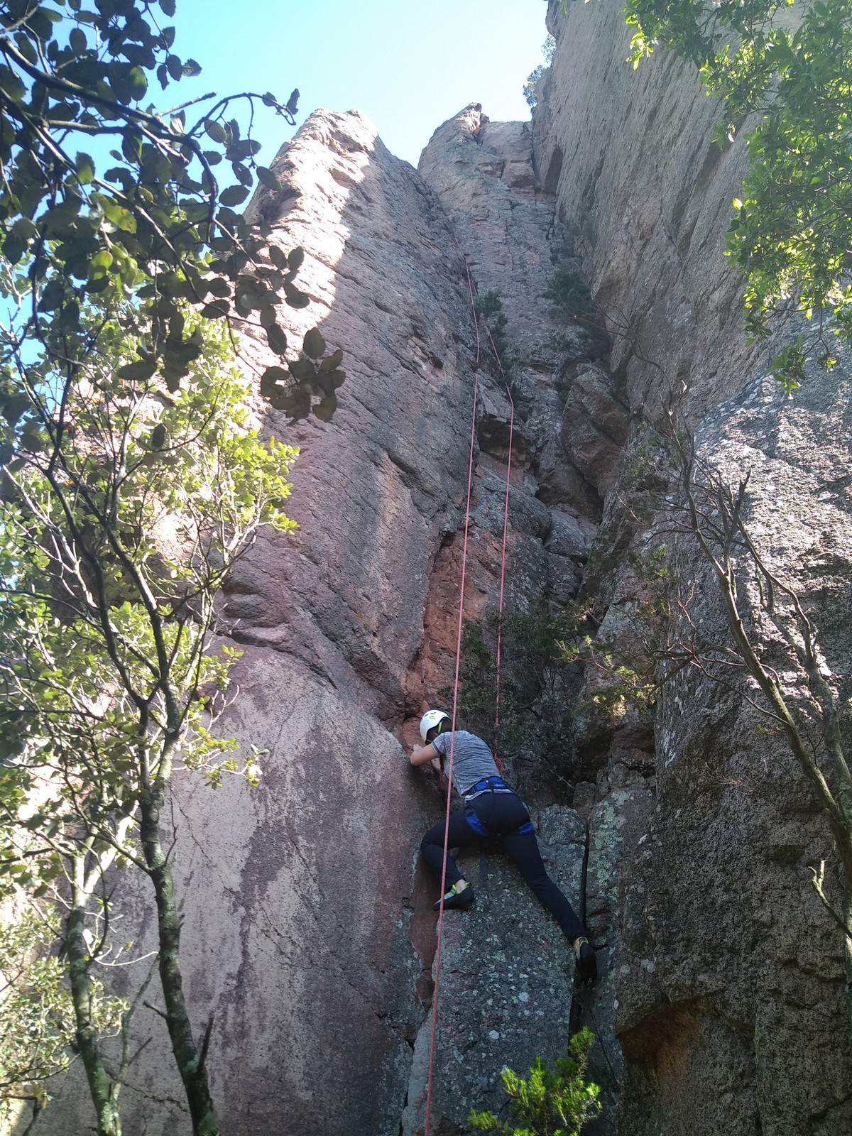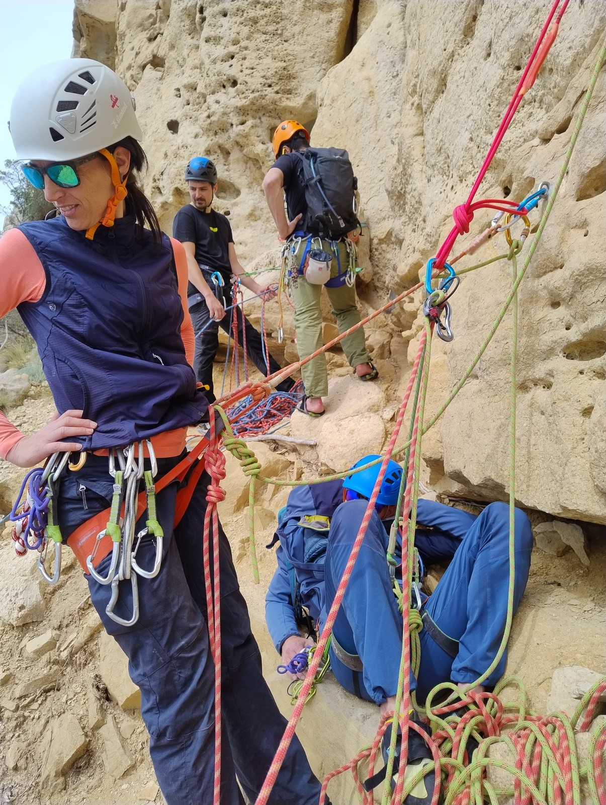 Aujourd’hui nous jetons notre dévolu sur les secteurs » Tintin », tout petit secteur idéal pour réviser l’escalade en tête dans des voies courtes et faciles et le secteur situé sur la vire juste au dessus proposant des voies d’un peu plus d’ampleur jusqu’à 7a. Le côté pratique étant qu’ici lorsque nous sommes à l’étage, sur la terrasse, nous avons quasiment les pieds au niveau des relais du secteur inférieur et c’est ainsi que les jeunes novices peuvent sereinement réviser ou même apprendre à faire la « manip » nécessaire lorsque l’on grimpe en tête. Aujourd’hui le soleil est présent mais le petit vent s’engouffrant dans le « vallon sourn » nous raffermit les chairs et nous interdit toute escalade en t-shirt. Les grimpeurs s’activent avec plus ou moins d’intensité et à 20 grimpeurs, la quasitotalité des voies sont prises. Mathis et Esteban vont grimper sur un bout de caillou juste à côté pour installer une moulinette dans un très long 6a, tandis que Léane s’essaie dans le superbe 7a du secteur « Caldoquie » à la difficulté concentrée dans les permiers mètres. Elle chute dans le passage difficile, et avec elle son humeur. Sylvain installe le superbe 6b+ juste à côté pour offrir aux plus motivés une voie de 35m abordable qui sera écumée toute la journée ! An fin de matinée, nous sommes rejoints par les parents de Rose et Lilas, Didier et Amandine, ainsi que Prune la soeur, qui dorment dans un camping car non loin du vallon. Avec eux débarquent Rebecca et Marion avec sa fille Maya, qu’on retrouvera tout au long du séjour.