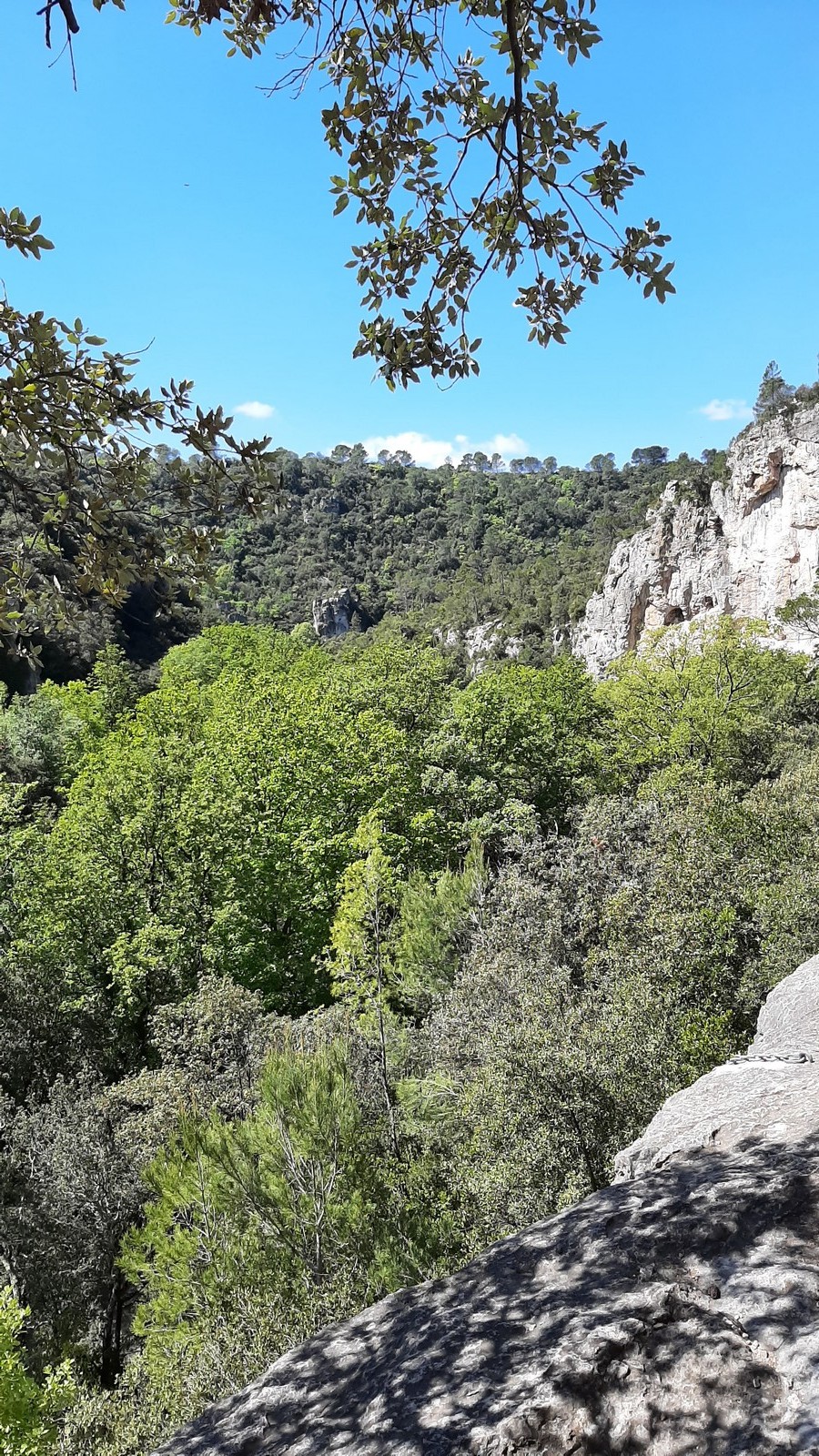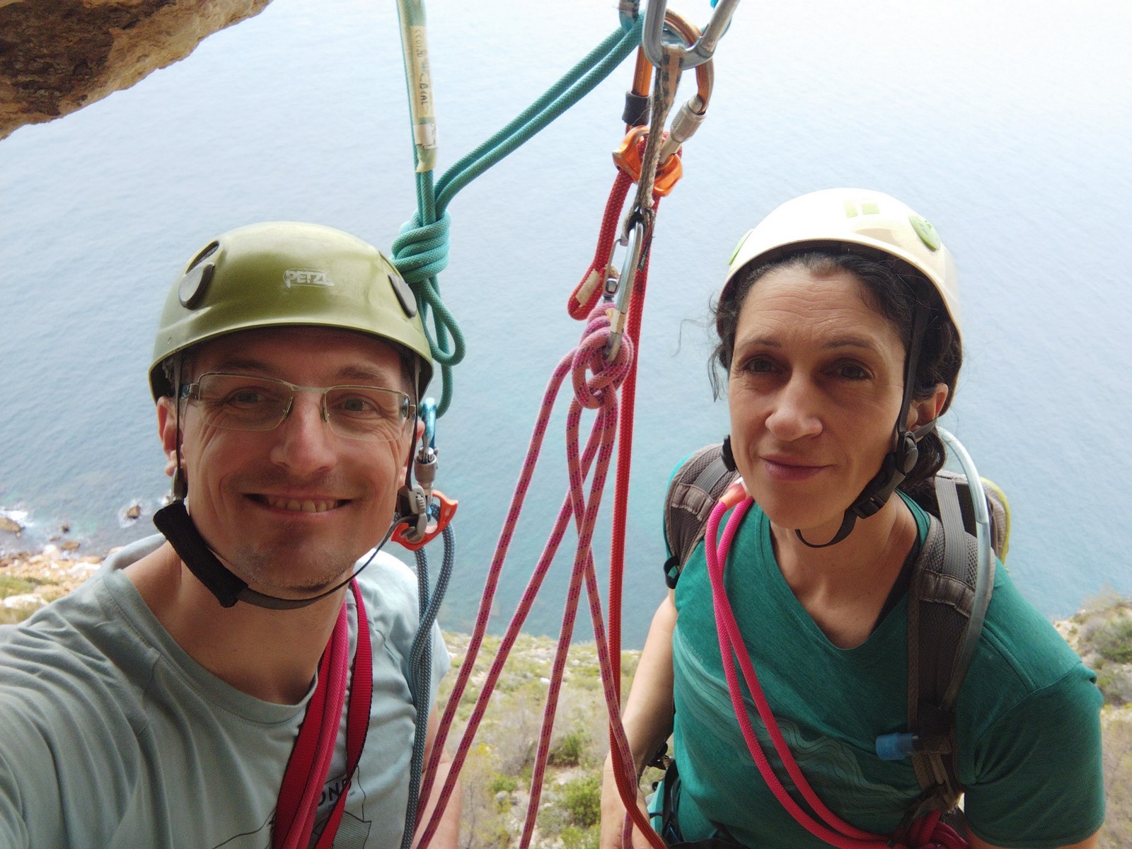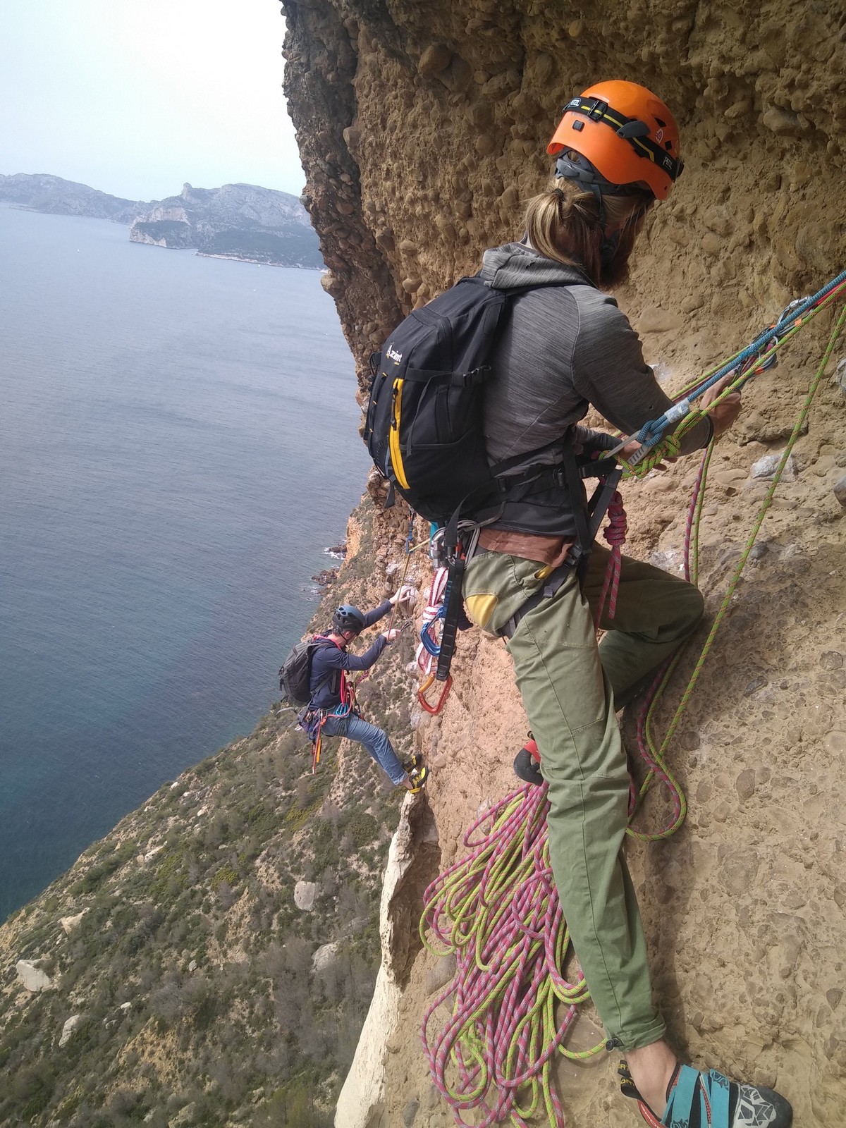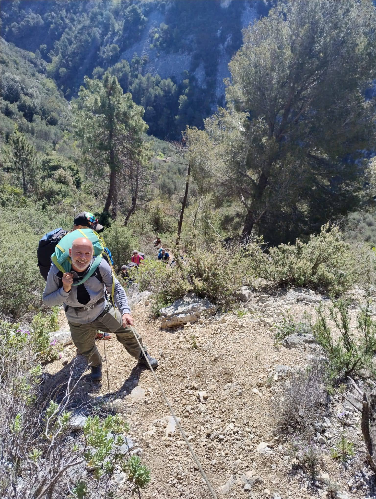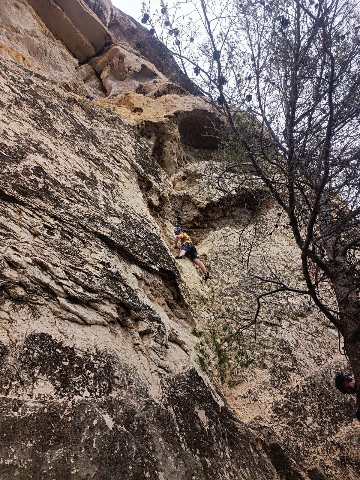 Aujourd’hui nous jetons notre dévolu sur les secteurs » Tintin », tout petit secteur idéal pour réviser l’escalade en tête dans des voies courtes et faciles et le secteur situé sur la vire juste au dessus proposant des voies d’un peu plus d’ampleur jusqu’à 7a. Le côté pratique étant qu’ici lorsque nous sommes à l’étage, sur la terrasse, nous avons quasiment les pieds au niveau des relais du secteur inférieur et c’est ainsi que les jeunes novices peuvent sereinement réviser ou même apprendre à faire la « manip » nécessaire lorsque l’on grimpe en tête. Aujourd’hui le soleil est présent mais le petit vent s’engouffrant dans le « vallon sourn » nous raffermit les chairs et nous interdit toute escalade en t-shirt. Les grimpeurs s’activent avec plus ou moins d’intensité et à 20 grimpeurs, la quasitotalité des voies sont prises. Mathis et Esteban vont grimper sur un bout de caillou juste à côté pour installer une moulinette dans un très long 6a, tandis que Léane s’essaie dans le superbe 7a du secteur « Caldoquie » à la difficulté concentrée dans les permiers mètres. Elle chute dans le passage difficile, et avec elle son humeur. Sylvain installe le superbe 6b+ juste à côté pour offrir aux plus motivés une voie de 35m abordable qui sera écumée toute la journée ! An fin de matinée, nous sommes rejoints par les parents de Rose et Lilas, Didier et Amandine, ainsi que Prune la soeur, qui dorment dans un camping car non loin du vallon. Avec eux débarquent Rebecca et Marion avec sa fille Maya, qu’on retrouvera tout au long du séjour.