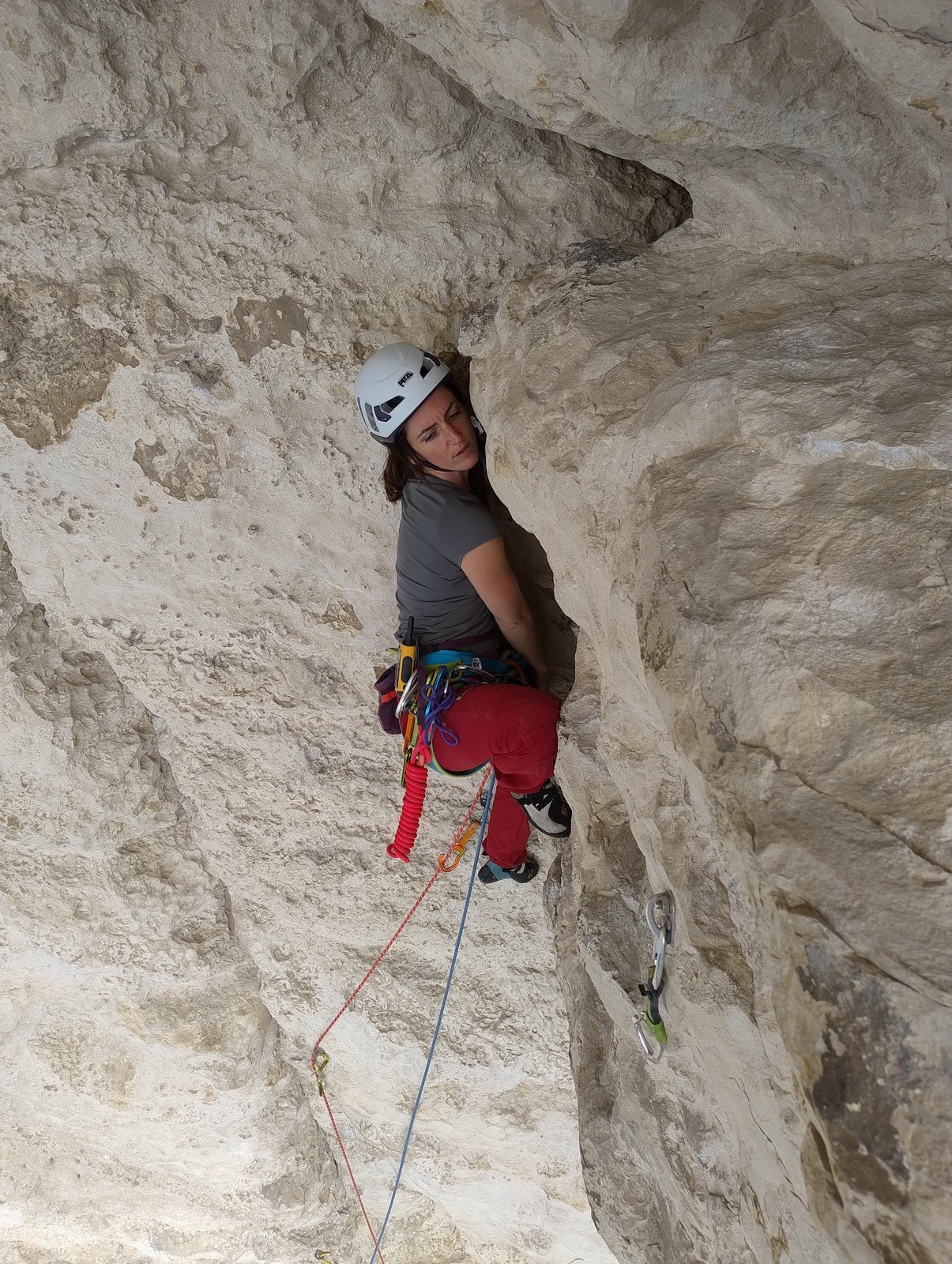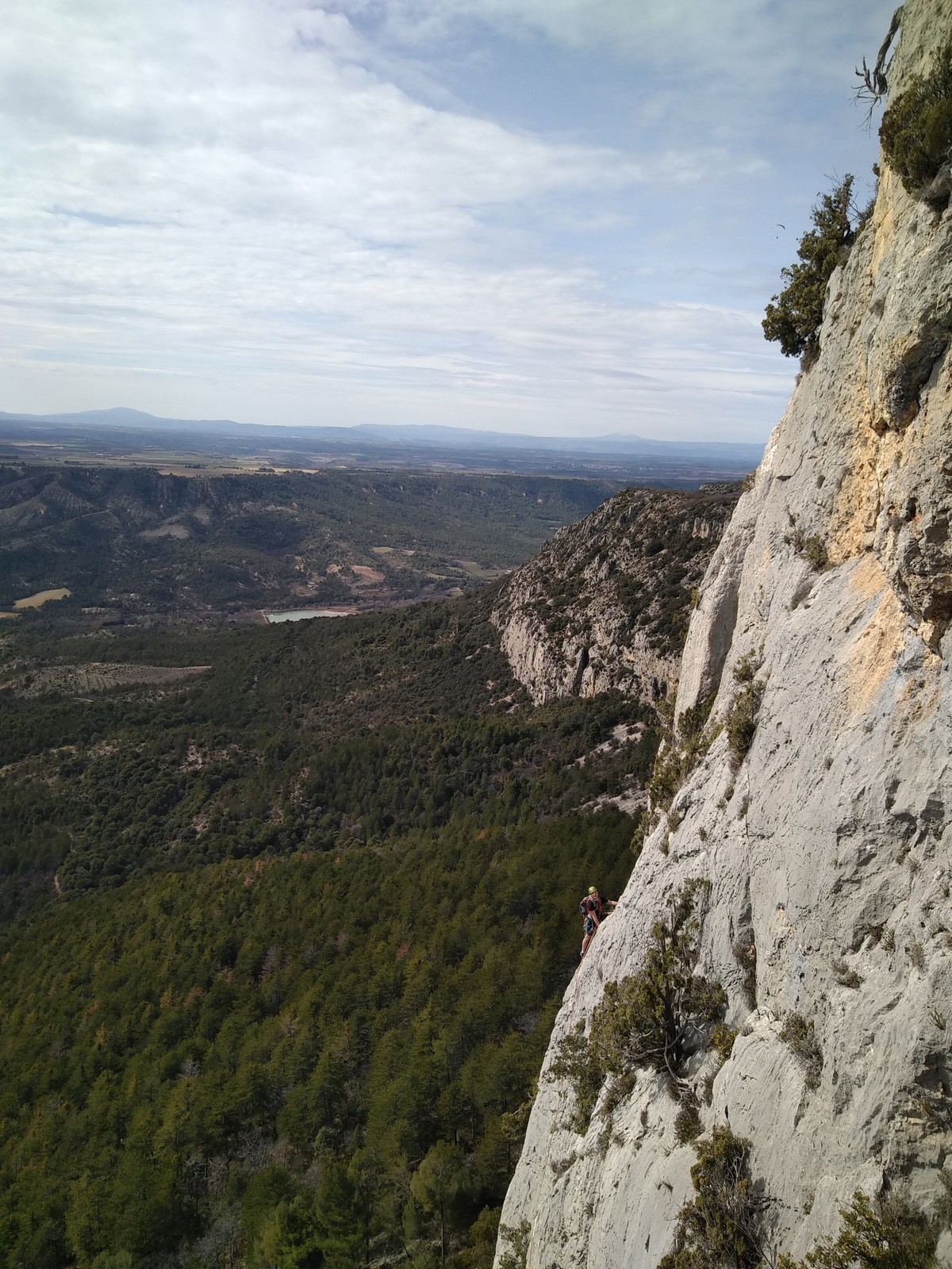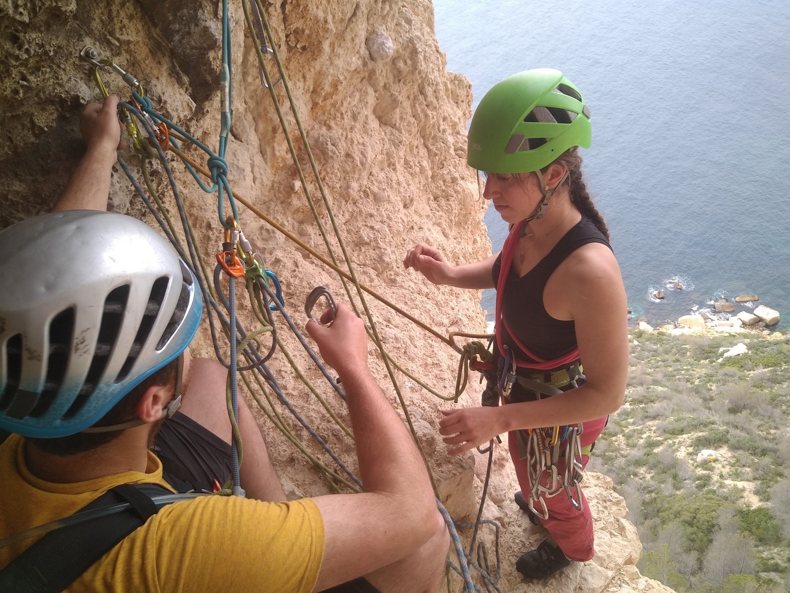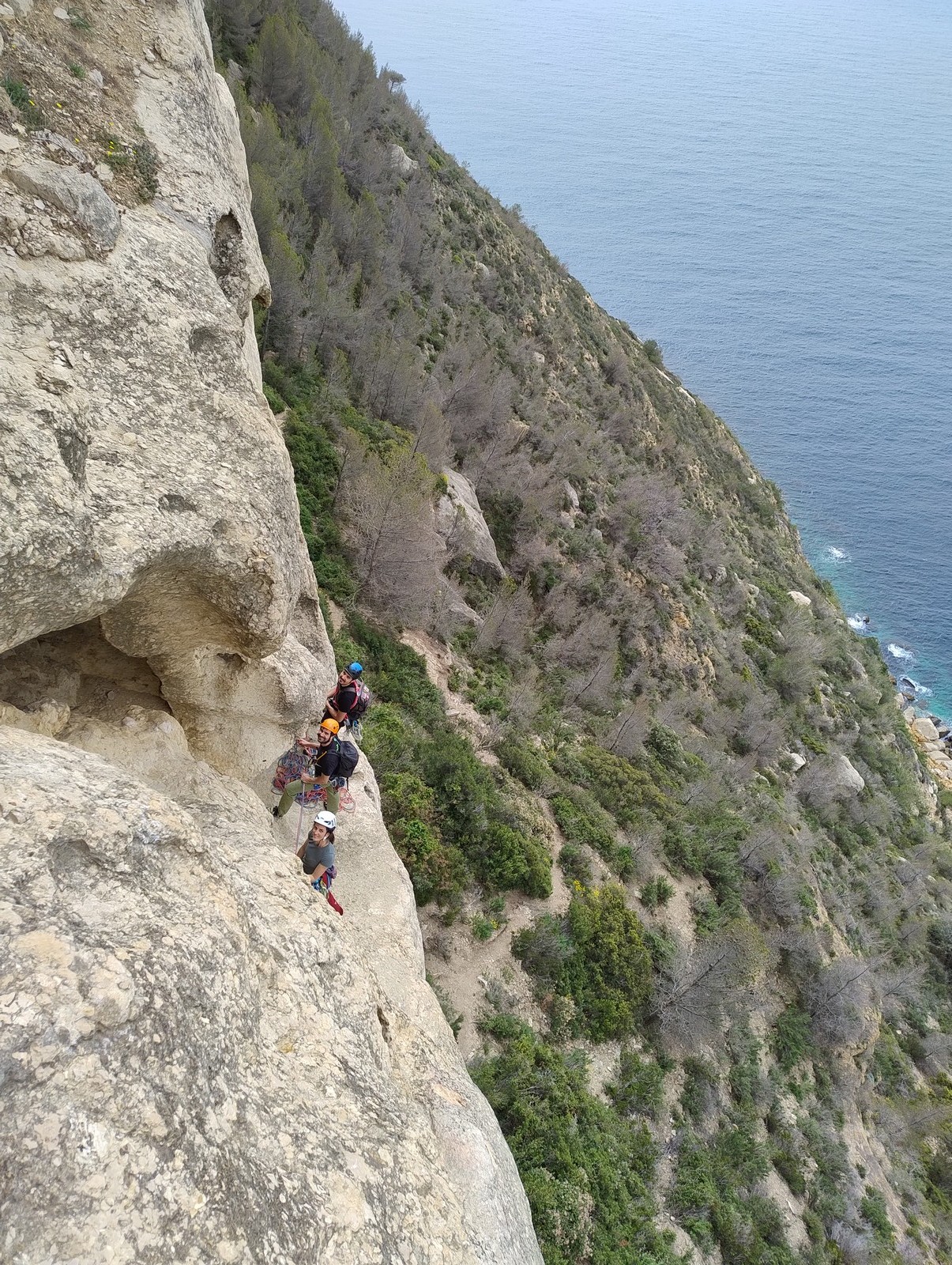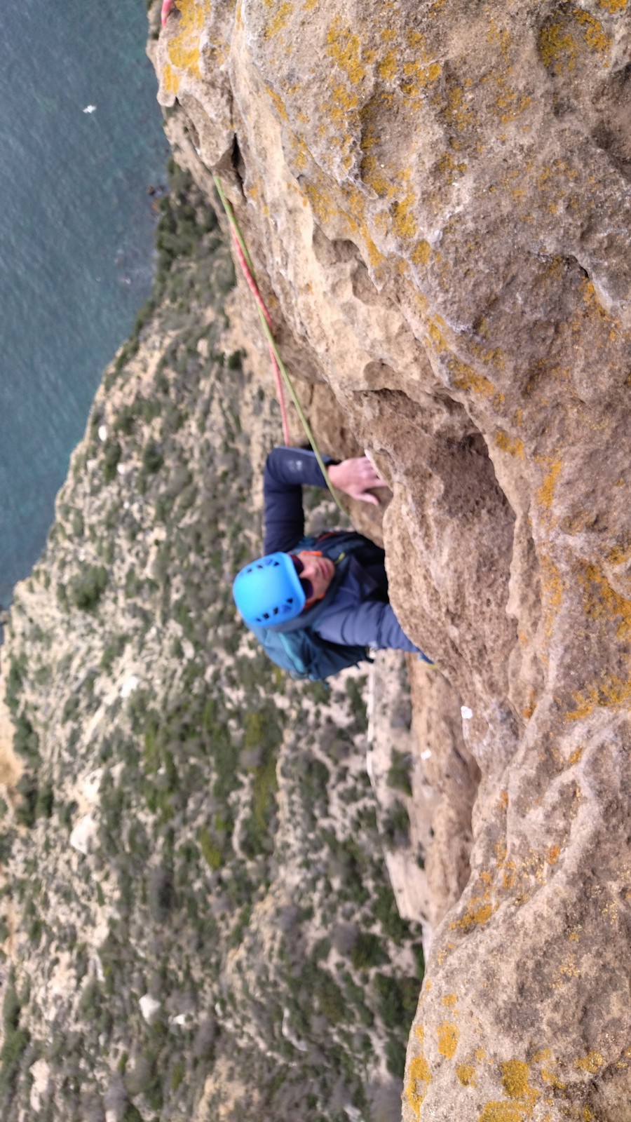 Aujourd’hui nous jetons notre dévolu sur les secteurs » Tintin », tout petit secteur idéal pour réviser l’escalade en tête dans des voies courtes et faciles et le secteur situé sur la vire juste au dessus proposant des voies d’un peu plus d’ampleur jusqu’à 7a. Le côté pratique étant qu’ici lorsque nous sommes à l’étage, sur la terrasse, nous avons quasiment les pieds au niveau des relais du secteur inférieur et c’est ainsi que les jeunes novices peuvent sereinement réviser ou même apprendre à faire la « manip » nécessaire lorsque l’on grimpe en tête. Aujourd’hui le soleil est présent mais le petit vent s’engouffrant dans le « vallon sourn » nous raffermit les chairs et nous interdit toute escalade en t-shirt. Les grimpeurs s’activent avec plus ou moins d’intensité et à 20 grimpeurs, la quasitotalité des voies sont prises. Mathis et Esteban vont grimper sur un bout de caillou juste à côté pour installer une moulinette dans un très long 6a, tandis que Léane s’essaie dans le superbe 7a du secteur « Caldoquie » à la difficulté concentrée dans les permiers mètres. Elle chute dans le passage difficile, et avec elle son humeur. Sylvain installe le superbe 6b+ juste à côté pour offrir aux plus motivés une voie de 35m abordable qui sera écumée toute la journée ! An fin de matinée, nous sommes rejoints par les parents de Rose et Lilas, Didier et Amandine, ainsi que Prune la soeur, qui dorment dans un camping car non loin du vallon. Avec eux débarquent Rebecca et Marion avec sa fille Maya, qu’on retrouvera tout au long du séjour.
