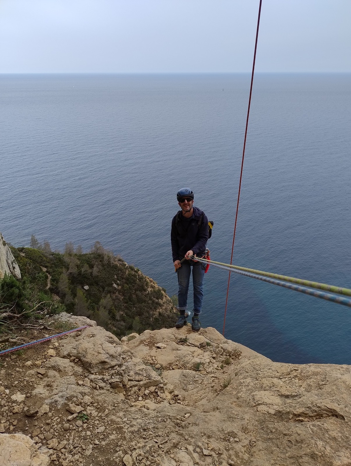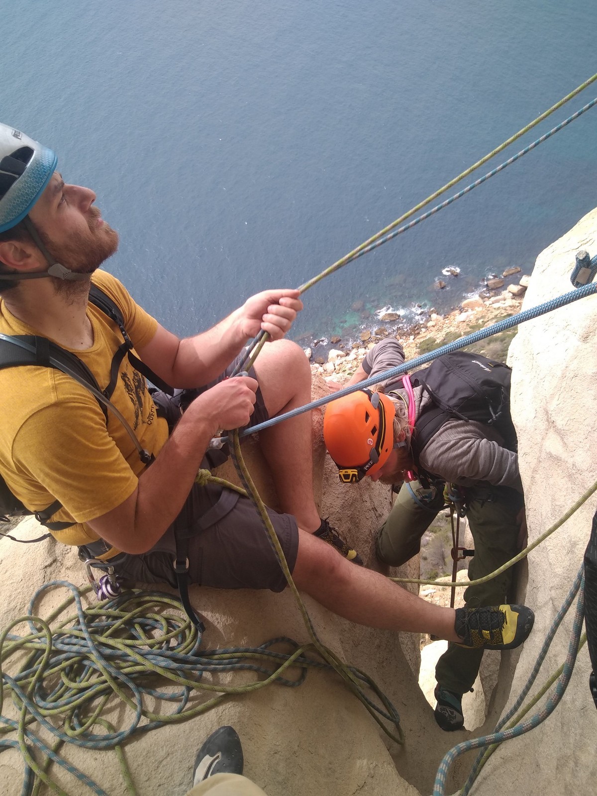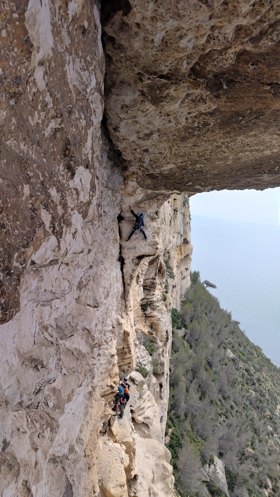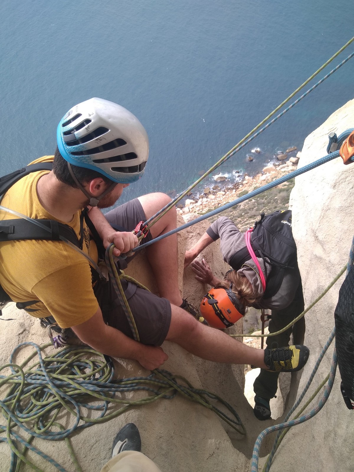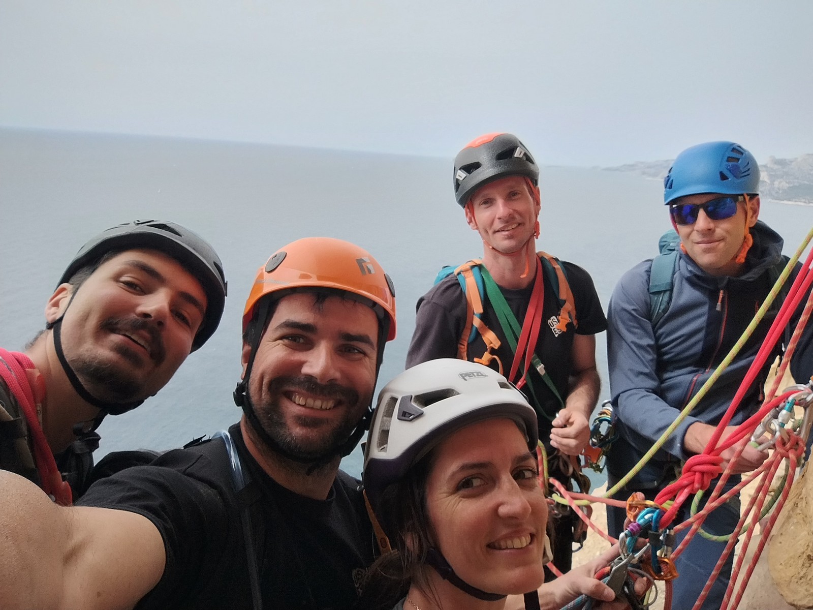 Aujourd’hui nous jetons notre dévolu sur les secteurs » Tintin », tout petit secteur idéal pour réviser l’escalade en tête dans des voies courtes et faciles et le secteur situé sur la vire juste au dessus proposant des voies d’un peu plus d’ampleur jusqu’à 7a. Le côté pratique étant qu’ici lorsque nous sommes à l’étage, sur la terrasse, nous avons quasiment les pieds au niveau des relais du secteur inférieur et c’est ainsi que les jeunes novices peuvent sereinement réviser ou même apprendre à faire la « manip » nécessaire lorsque l’on grimpe en tête. Aujourd’hui le soleil est présent mais le petit vent s’engouffrant dans le « vallon sourn » nous raffermit les chairs et nous interdit toute escalade en t-shirt. Les grimpeurs s’activent avec plus ou moins d’intensité et à 20 grimpeurs, la quasitotalité des voies sont prises. Mathis et Esteban vont grimper sur un bout de caillou juste à côté pour installer une moulinette dans un très long 6a, tandis que Léane s’essaie dans le superbe 7a du secteur « Caldoquie » à la difficulté concentrée dans les permiers mètres. Elle chute dans le passage difficile, et avec elle son humeur. Sylvain installe le superbe 6b+ juste à côté pour offrir aux plus motivés une voie de 35m abordable qui sera écumée toute la journée ! An fin de matinée, nous sommes rejoints par les parents de Rose et Lilas, Didier et Amandine, ainsi que Prune la soeur, qui dorment dans un camping car non loin du vallon. Avec eux débarquent Rebecca et Marion avec sa fille Maya, qu’on retrouvera tout au long du séjour.