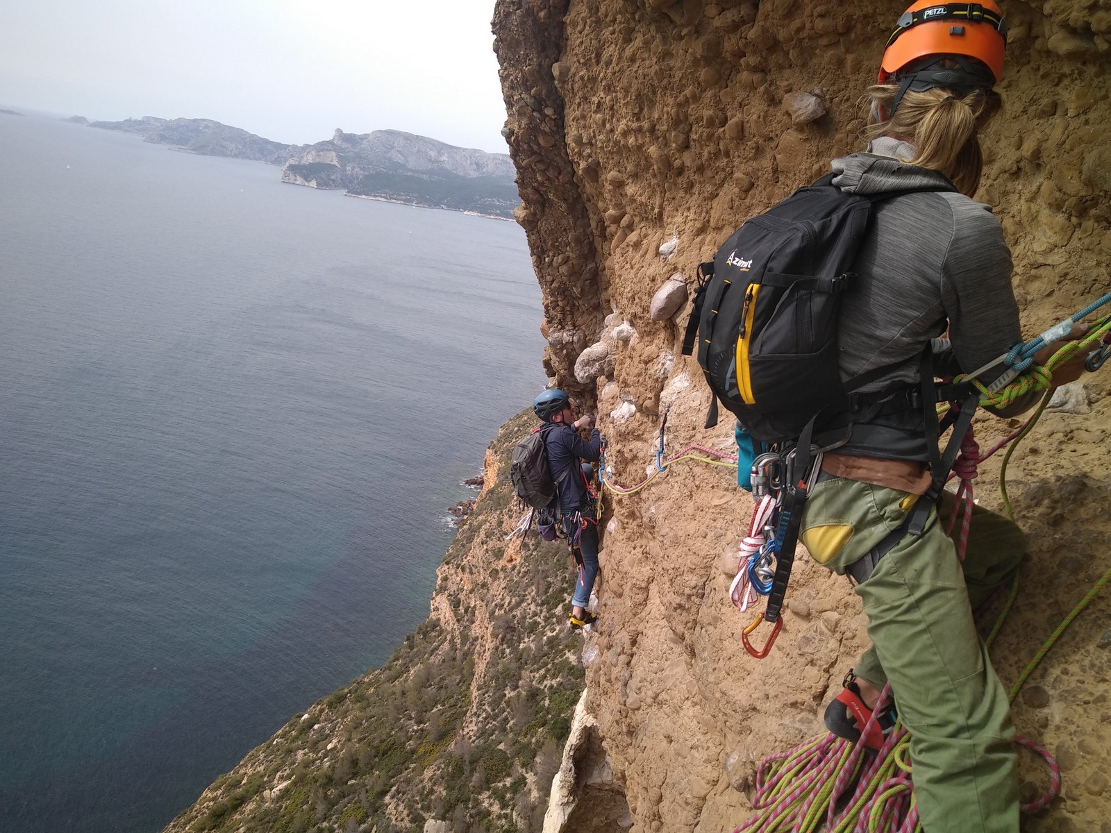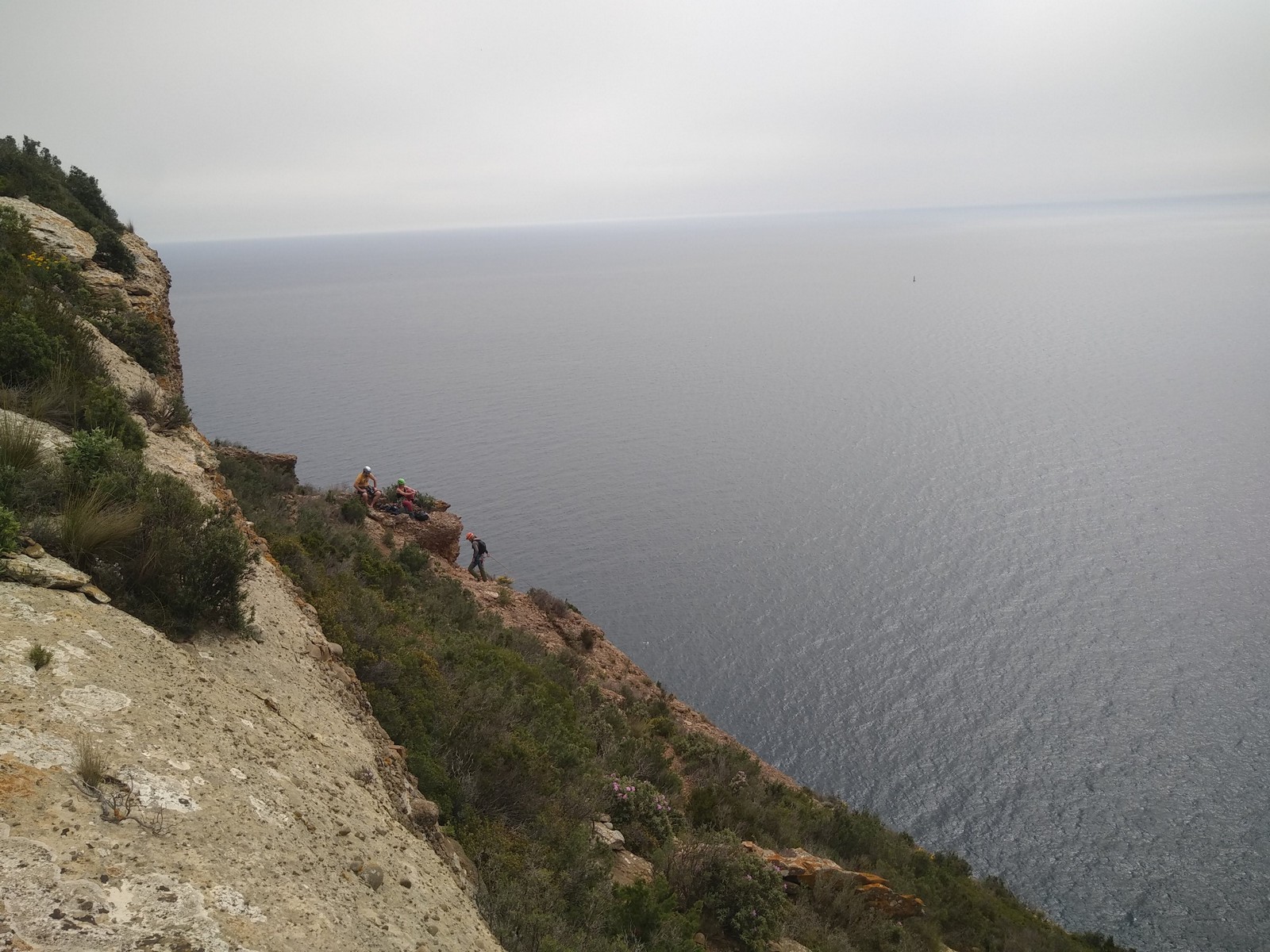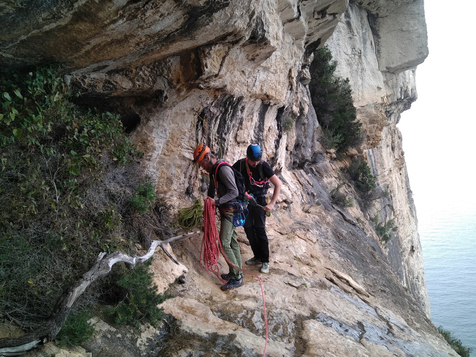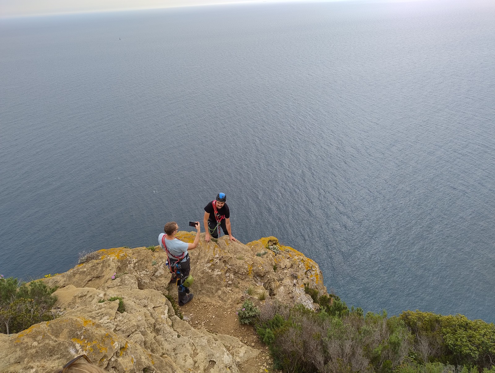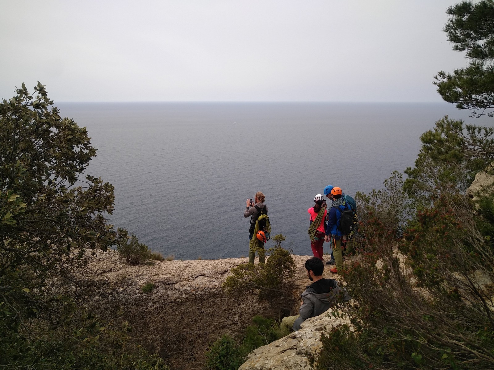 Aujourd’hui nous jetons notre dévolu sur les secteurs » Tintin », tout petit secteur idéal pour réviser l’escalade en tête dans des voies courtes et faciles et le secteur situé sur la vire juste au dessus proposant des voies d’un peu plus d’ampleur jusqu’à 7a. Le côté pratique étant qu’ici lorsque nous sommes à l’étage, sur la terrasse, nous avons quasiment les pieds au niveau des relais du secteur inférieur et c’est ainsi que les jeunes novices peuvent sereinement réviser ou même apprendre à faire la « manip » nécessaire lorsque l’on grimpe en tête. Aujourd’hui le soleil est présent mais le petit vent s’engouffrant dans le « vallon sourn » nous raffermit les chairs et nous interdit toute escalade en t-shirt. Les grimpeurs s’activent avec plus ou moins d’intensité et à 20 grimpeurs, la quasitotalité des voies sont prises. Mathis et Esteban vont grimper sur un bout de caillou juste à côté pour installer une moulinette dans un très long 6a, tandis que Léane s’essaie dans le superbe 7a du secteur « Caldoquie » à la difficulté concentrée dans les permiers mètres. Elle chute dans le passage difficile, et avec elle son humeur. Sylvain installe le superbe 6b+ juste à côté pour offrir aux plus motivés une voie de 35m abordable qui sera écumée toute la journée ! An fin de matinée, nous sommes rejoints par les parents de Rose et Lilas, Didier et Amandine, ainsi que Prune la soeur, qui dorment dans un camping car non loin du vallon. Avec eux débarquent Rebecca et Marion avec sa fille Maya, qu’on retrouvera tout au long du séjour.