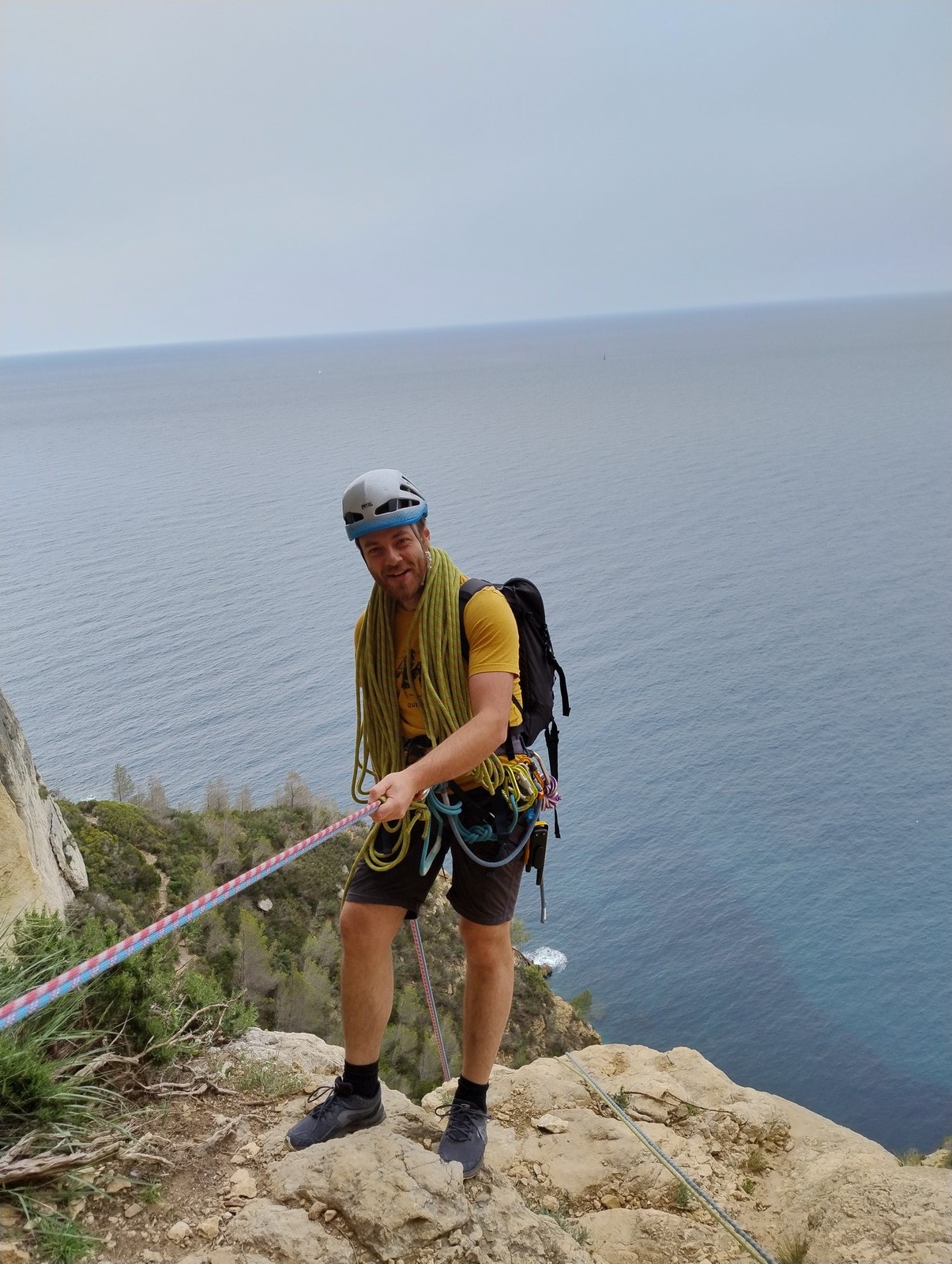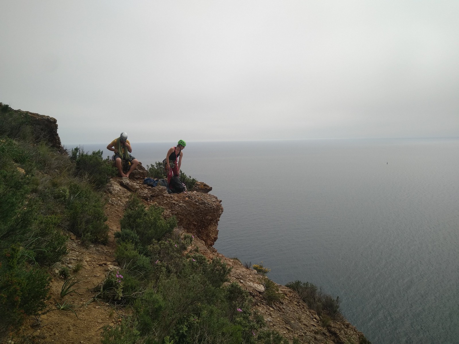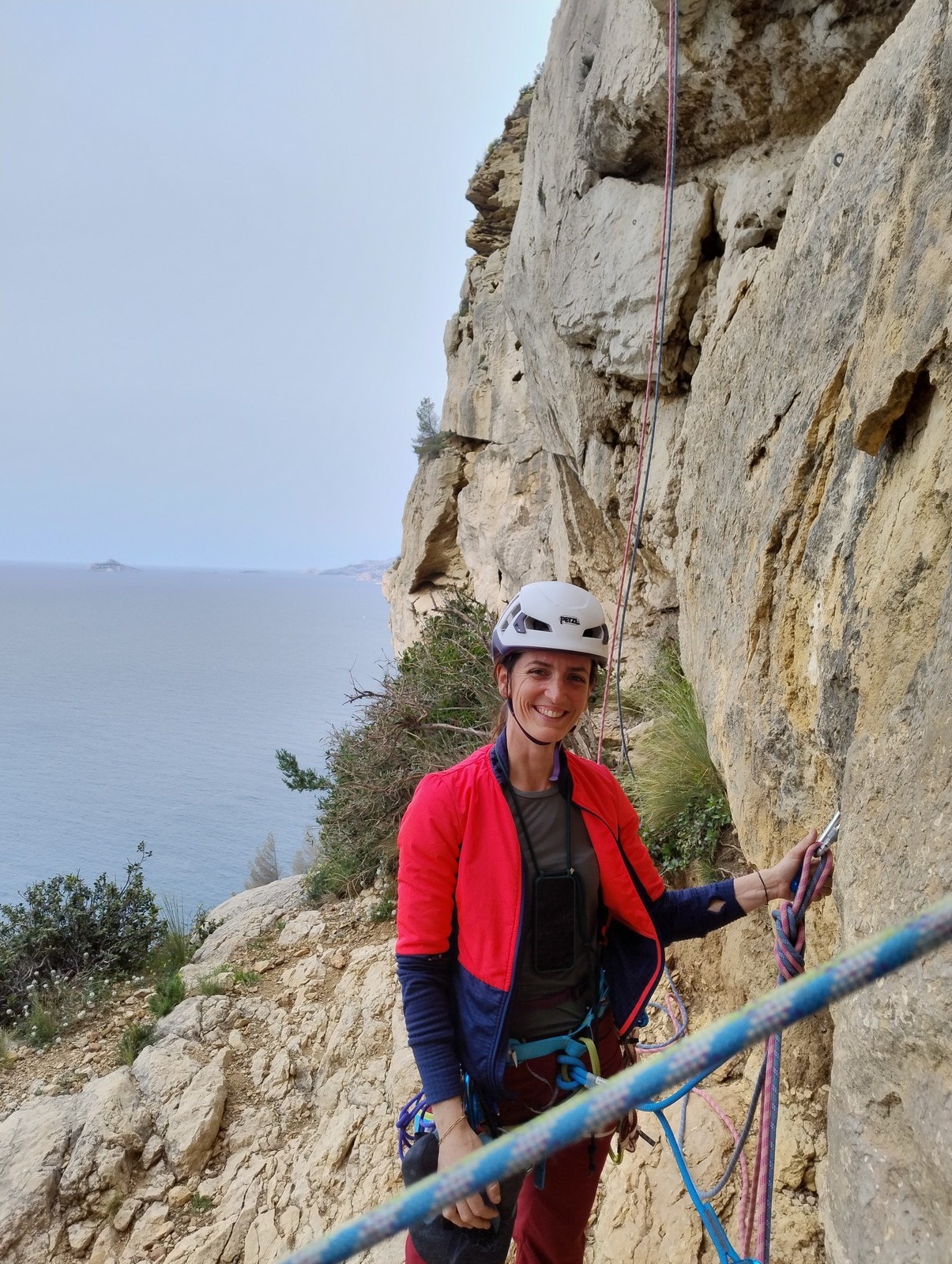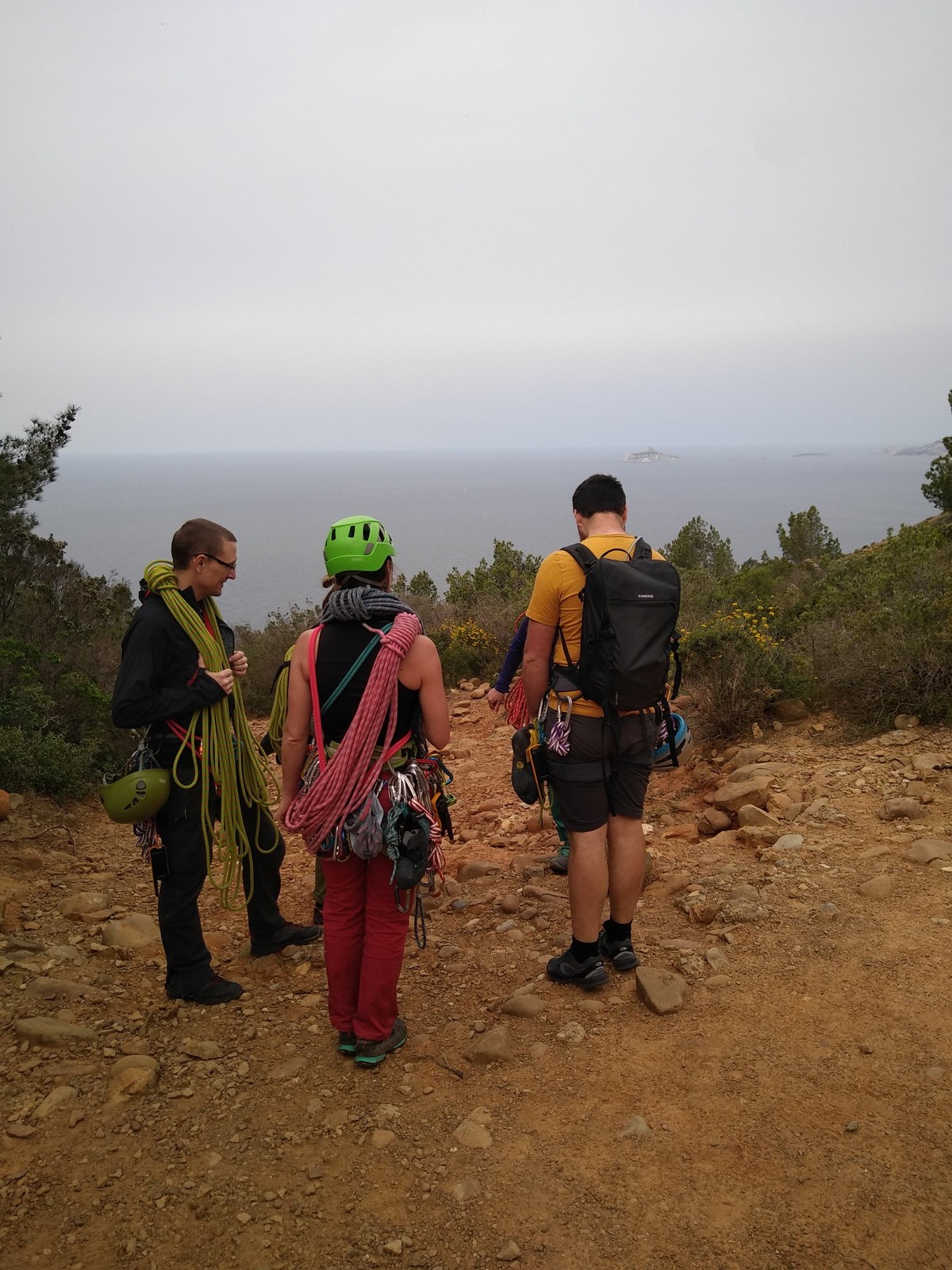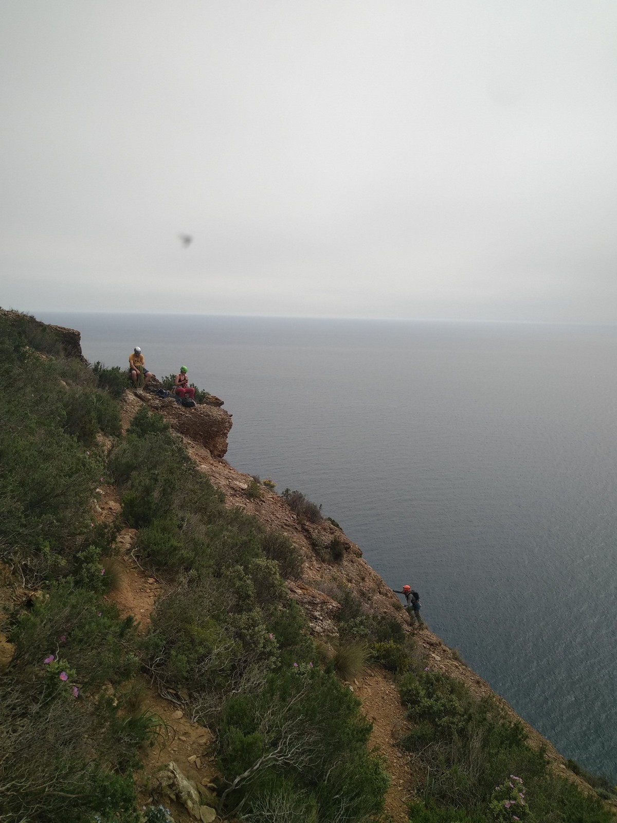 Aujourd’hui nous jetons notre dévolu sur les secteurs » Tintin », tout petit secteur idéal pour réviser l’escalade en tête dans des voies courtes et faciles et le secteur situé sur la vire juste au dessus proposant des voies d’un peu plus d’ampleur jusqu’à 7a. Le côté pratique étant qu’ici lorsque nous sommes à l’étage, sur la terrasse, nous avons quasiment les pieds au niveau des relais du secteur inférieur et c’est ainsi que les jeunes novices peuvent sereinement réviser ou même apprendre à faire la « manip » nécessaire lorsque l’on grimpe en tête. Aujourd’hui le soleil est présent mais le petit vent s’engouffrant dans le « vallon sourn » nous raffermit les chairs et nous interdit toute escalade en t-shirt. Les grimpeurs s’activent avec plus ou moins d’intensité et à 20 grimpeurs, la quasitotalité des voies sont prises. Mathis et Esteban vont grimper sur un bout de caillou juste à côté pour installer une moulinette dans un très long 6a, tandis que Léane s’essaie dans le superbe 7a du secteur « Caldoquie » à la difficulté concentrée dans les permiers mètres. Elle chute dans le passage difficile, et avec elle son humeur. Sylvain installe le superbe 6b+ juste à côté pour offrir aux plus motivés une voie de 35m abordable qui sera écumée toute la journée ! An fin de matinée, nous sommes rejoints par les parents de Rose et Lilas, Didier et Amandine, ainsi que Prune la soeur, qui dorment dans un camping car non loin du vallon. Avec eux débarquent Rebecca et Marion avec sa fille Maya, qu’on retrouvera tout au long du séjour.