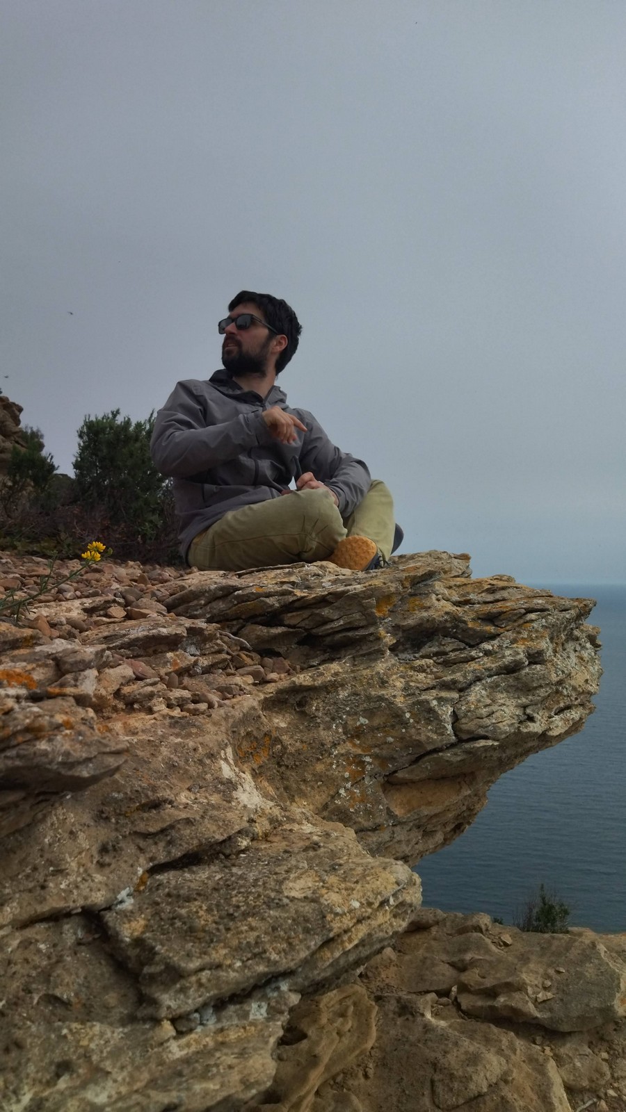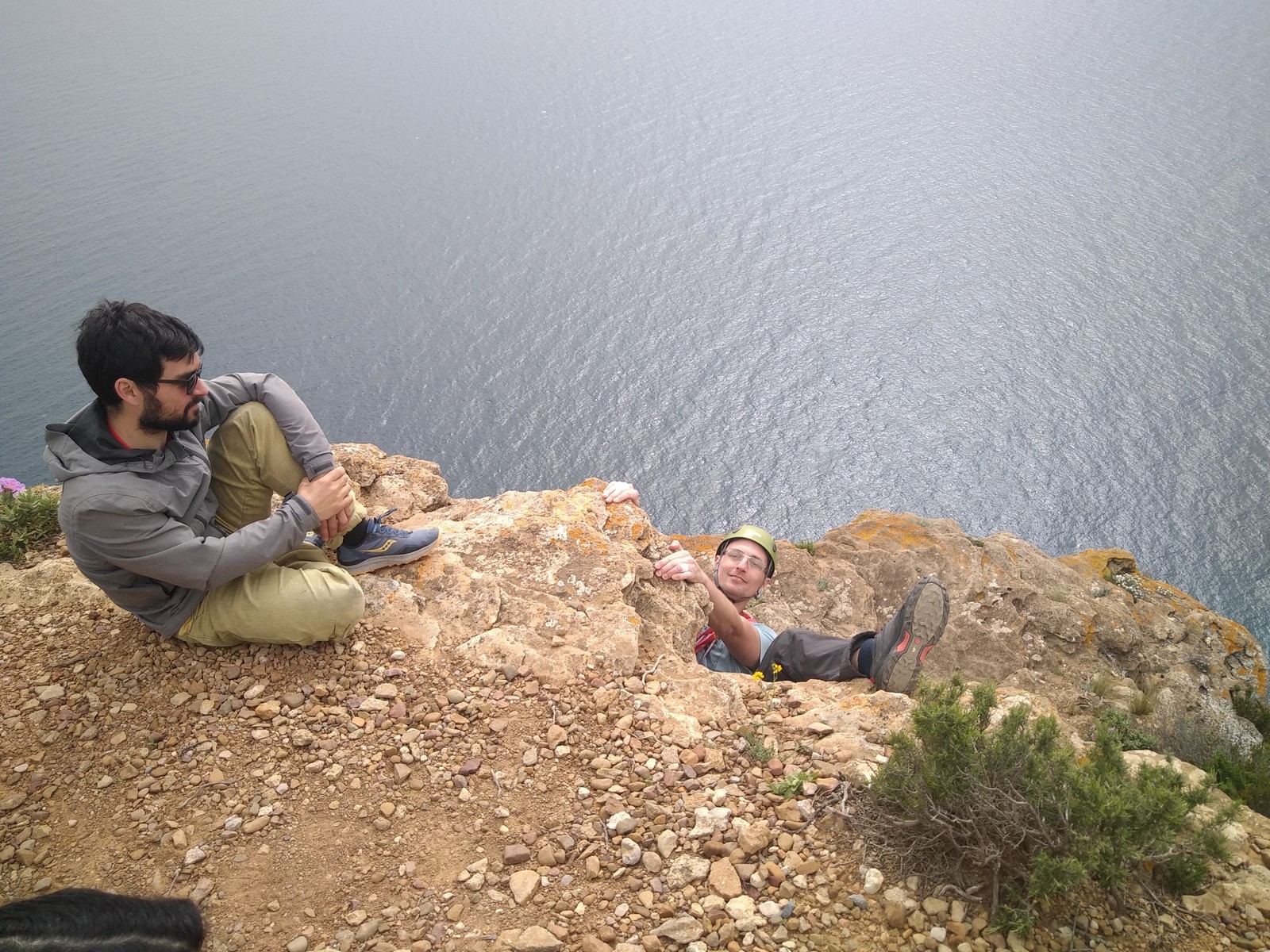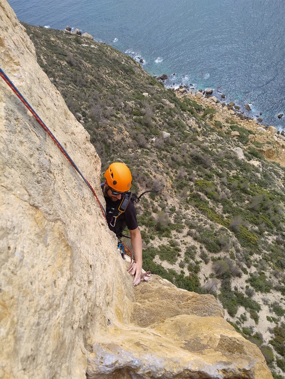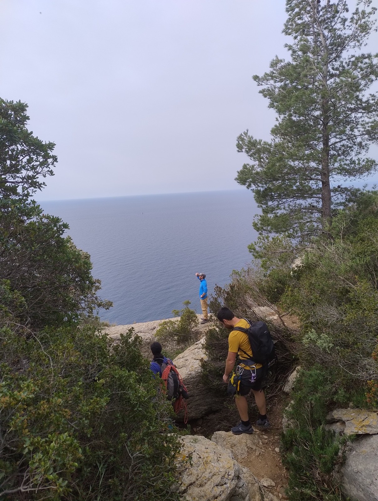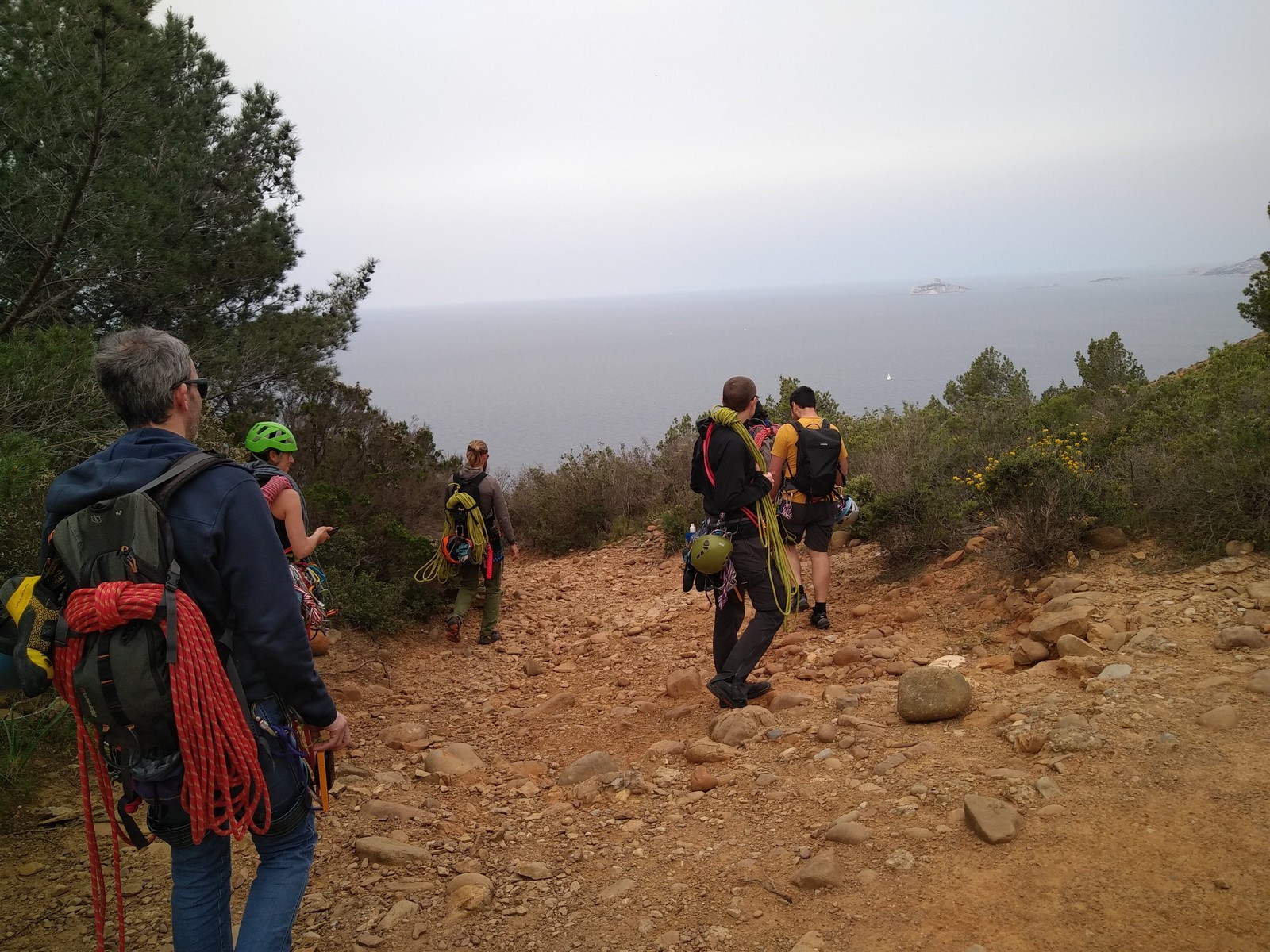 Aujourd’hui nous jetons notre dévolu sur les secteurs » Tintin », tout petit secteur idéal pour réviser l’escalade en tête dans des voies courtes et faciles et le secteur situé sur la vire juste au dessus proposant des voies d’un peu plus d’ampleur jusqu’à 7a. Le côté pratique étant qu’ici lorsque nous sommes à l’étage, sur la terrasse, nous avons quasiment les pieds au niveau des relais du secteur inférieur et c’est ainsi que les jeunes novices peuvent sereinement réviser ou même apprendre à faire la « manip » nécessaire lorsque l’on grimpe en tête. Aujourd’hui le soleil est présent mais le petit vent s’engouffrant dans le « vallon sourn » nous raffermit les chairs et nous interdit toute escalade en t-shirt. Les grimpeurs s’activent avec plus ou moins d’intensité et à 20 grimpeurs, la quasitotalité des voies sont prises. Mathis et Esteban vont grimper sur un bout de caillou juste à côté pour installer une moulinette dans un très long 6a, tandis que Léane s’essaie dans le superbe 7a du secteur « Caldoquie » à la difficulté concentrée dans les permiers mètres. Elle chute dans le passage difficile, et avec elle son humeur. Sylvain installe le superbe 6b+ juste à côté pour offrir aux plus motivés une voie de 35m abordable qui sera écumée toute la journée ! An fin de matinée, nous sommes rejoints par les parents de Rose et Lilas, Didier et Amandine, ainsi que Prune la soeur, qui dorment dans un camping car non loin du vallon. Avec eux débarquent Rebecca et Marion avec sa fille Maya, qu’on retrouvera tout au long du séjour.