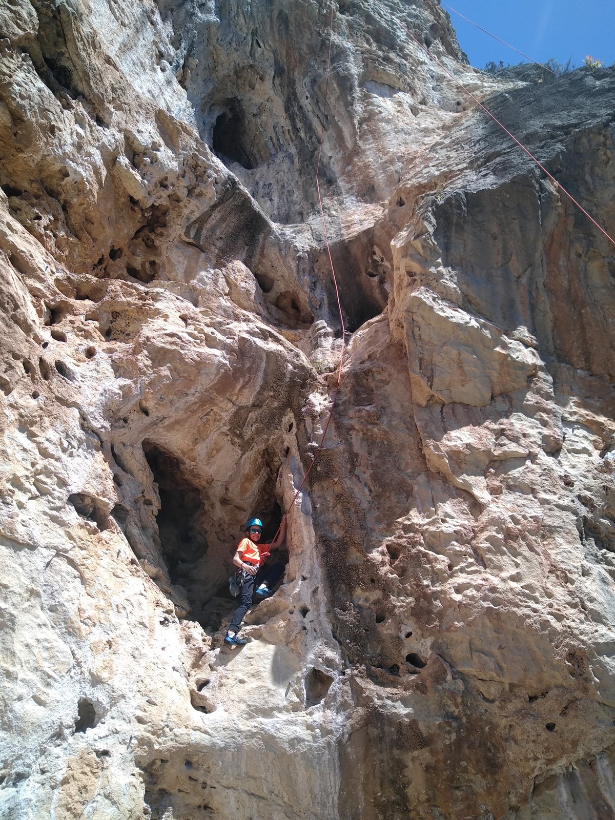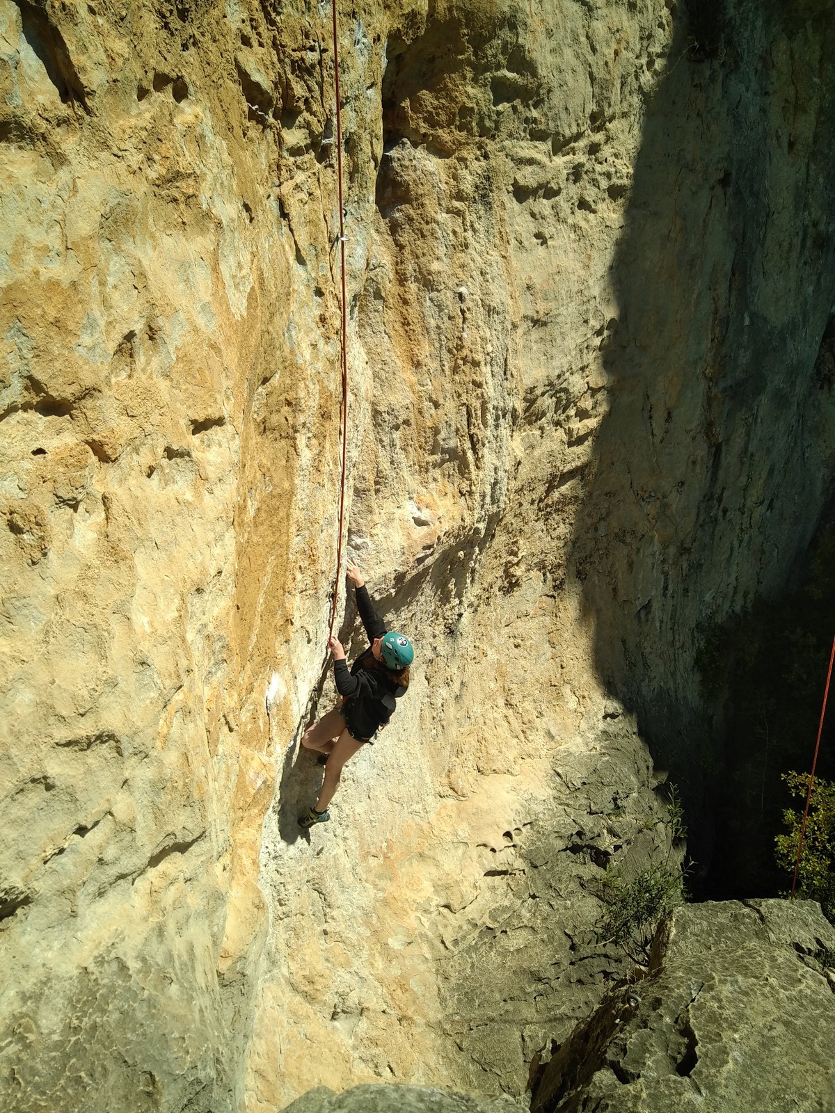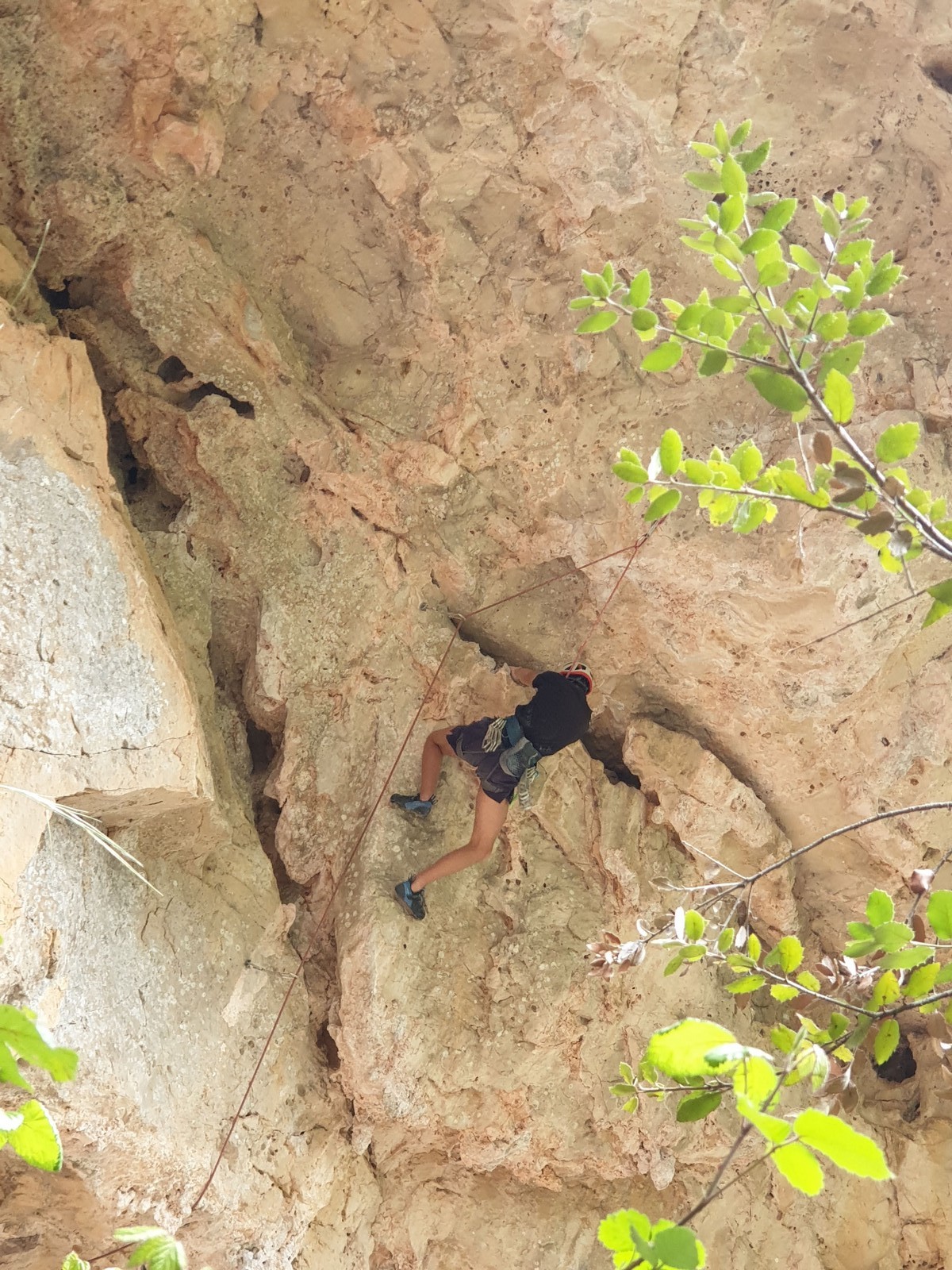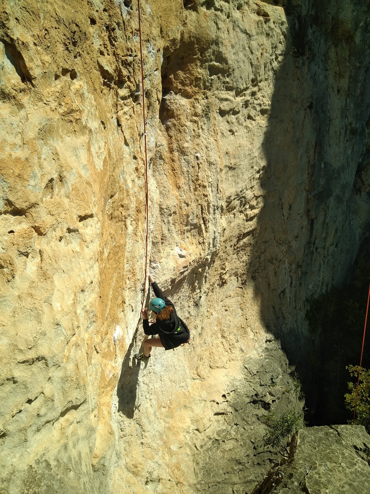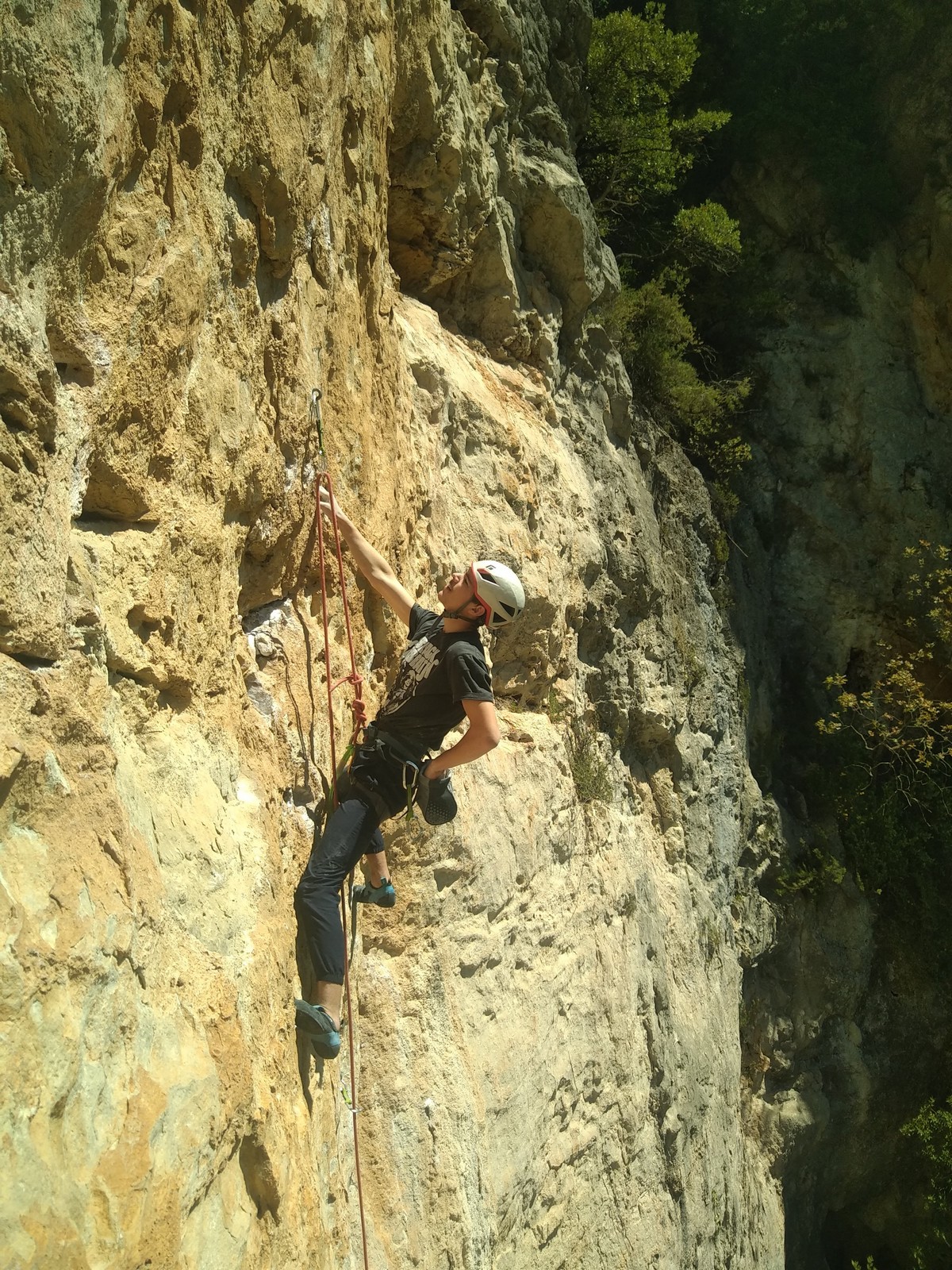 En dehors de François qui dort dans le auvent de la tente des 6 harpies, tout le monde semble avoir dormi d’un sommeil du juste. Un seul petit épisode de panique nocturne a tiré du duvet Dona et Sylvain mais tout est vite rentré dans l’ordre. Après nos deux kilos de Nutella quotidien et la préparation des casses croûtes, nous voilà de nouveau en route vers notre falaise fétiche. Aujourd’hui c’est les secteurs autour de « Colibri » qui ont l’honneur de nous recevoir. Maya est la première à grimper, elle s’aventure en tête dans » Ça glisse au pays des merveilles » un 5a+ au départ déroutant. Elle sera malheureusement stoppée à mi voie par une trop grande appréhension de la chute. Persévère pour enfin dépasser cette peur et ainsi mettre à profit tes qualités de falaisiste. Lino met également de la bonne volonté et réalise en tête un 4a très raide au vu de la cotation. Anaïs, pleine d’envie, tente également sa chance en tête. Une tentative malheureusement avortée par un manque d’expérience mais rien ne lui enlève son sourire et sa bonne humeur communicative. S’ensuit des performances plus au moins notables jusqu’au très attendu pique nique. Mathis, qui s’était chauffé en faisant à vue le 7b « Transmutation » et Sylvain profitent de la pause pour tenter d’enchainer leur projet de la veille en 7c… sans succès ! Malgré deux beaux essais de Mathis, le crux final restera invaincu.