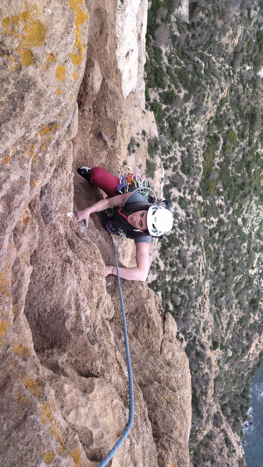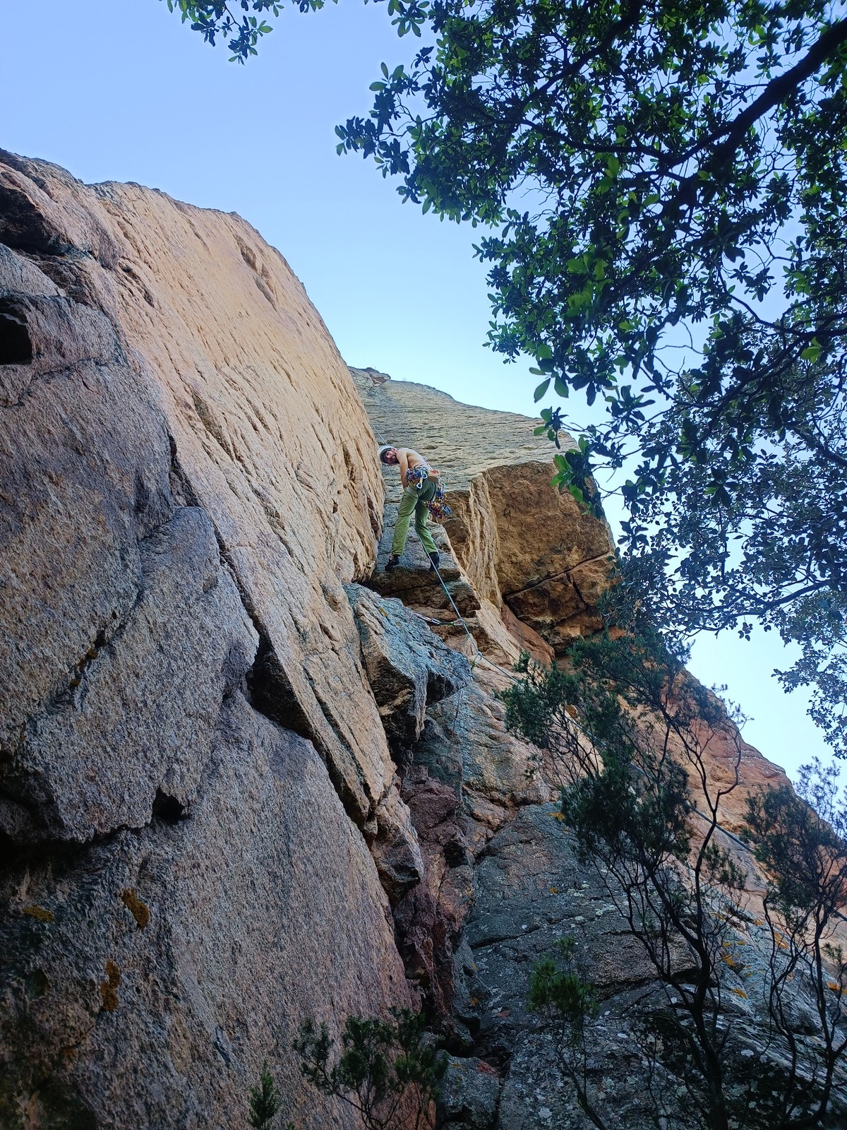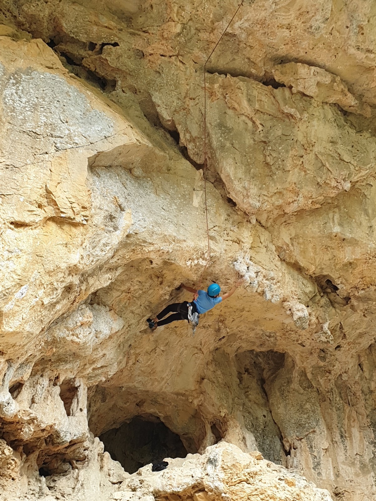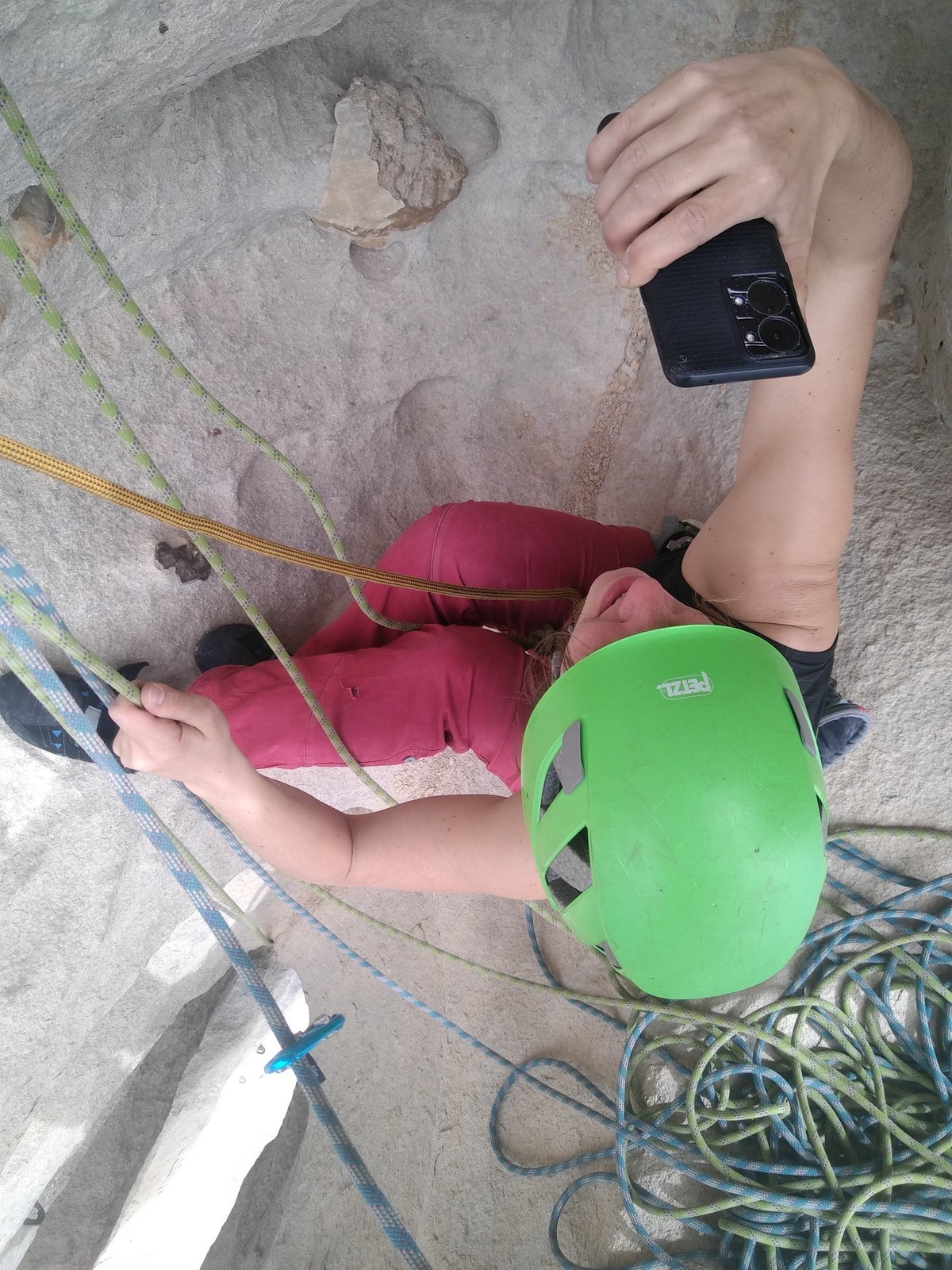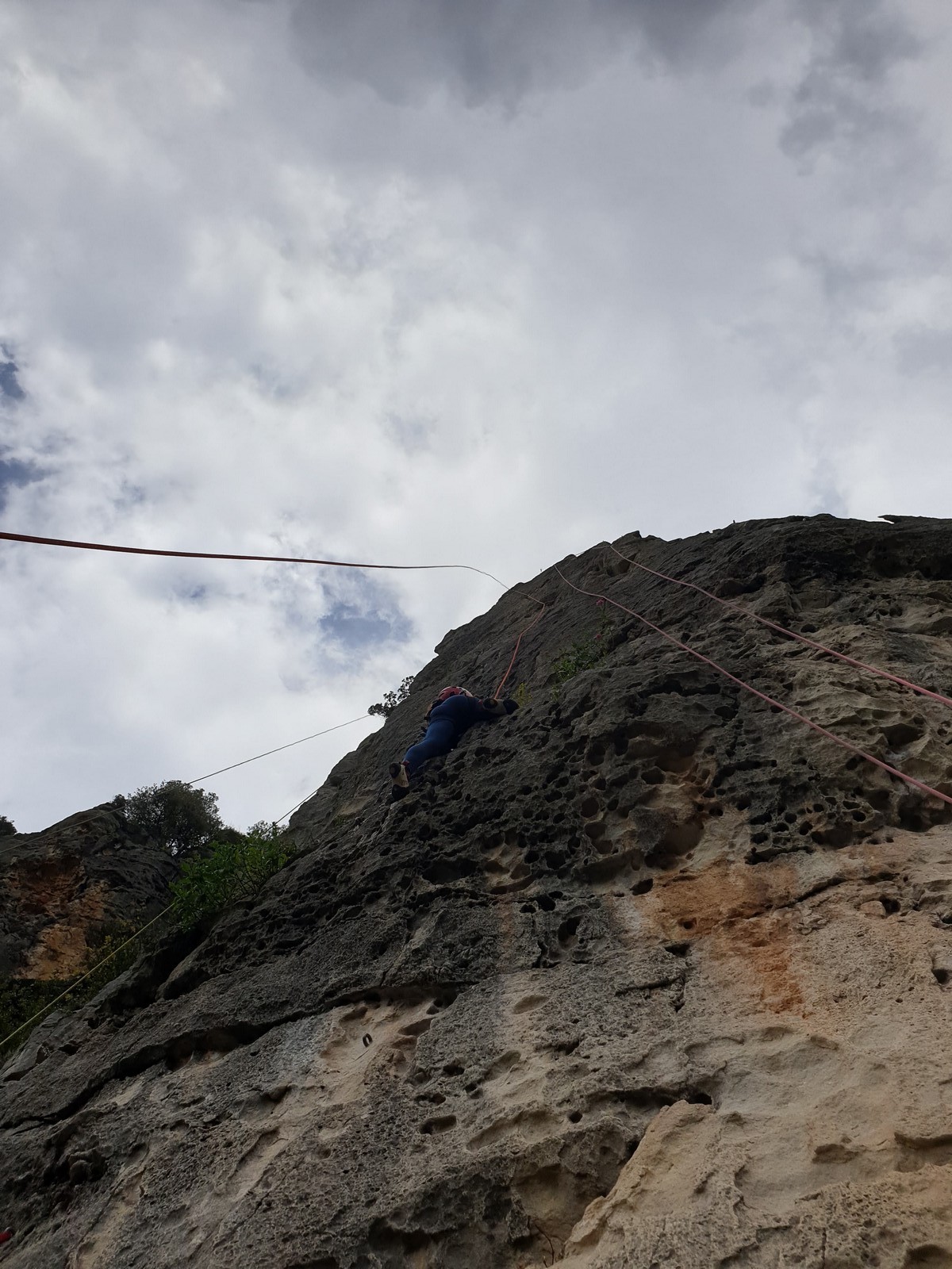 En dehors de François qui dort dans le auvent de la tente des 6 harpies, tout le monde semble avoir dormi d’un sommeil du juste. Un seul petit épisode de panique nocturne a tiré du duvet Dona et Sylvain mais tout est vite rentré dans l’ordre. Après nos deux kilos de Nutella quotidien et la préparation des casses croûtes, nous voilà de nouveau en route vers notre falaise fétiche. Aujourd’hui c’est les secteurs autour de « Colibri » qui ont l’honneur de nous recevoir. Maya est la première à grimper, elle s’aventure en tête dans » Ça glisse au pays des merveilles » un 5a+ au départ déroutant. Elle sera malheureusement stoppée à mi voie par une trop grande appréhension de la chute. Persévère pour enfin dépasser cette peur et ainsi mettre à profit tes qualités de falaisiste. Lino met également de la bonne volonté et réalise en tête un 4a très raide au vu de la cotation. Anaïs, pleine d’envie, tente également sa chance en tête. Une tentative malheureusement avortée par un manque d’expérience mais rien ne lui enlève son sourire et sa bonne humeur communicative. S’ensuit des performances plus au moins notables jusqu’au très attendu pique nique. Mathis, qui s’était chauffé en faisant à vue le 7b « Transmutation » et Sylvain profitent de la pause pour tenter d’enchainer leur projet de la veille en 7c… sans succès ! Malgré deux beaux essais de Mathis, le crux final restera invaincu.