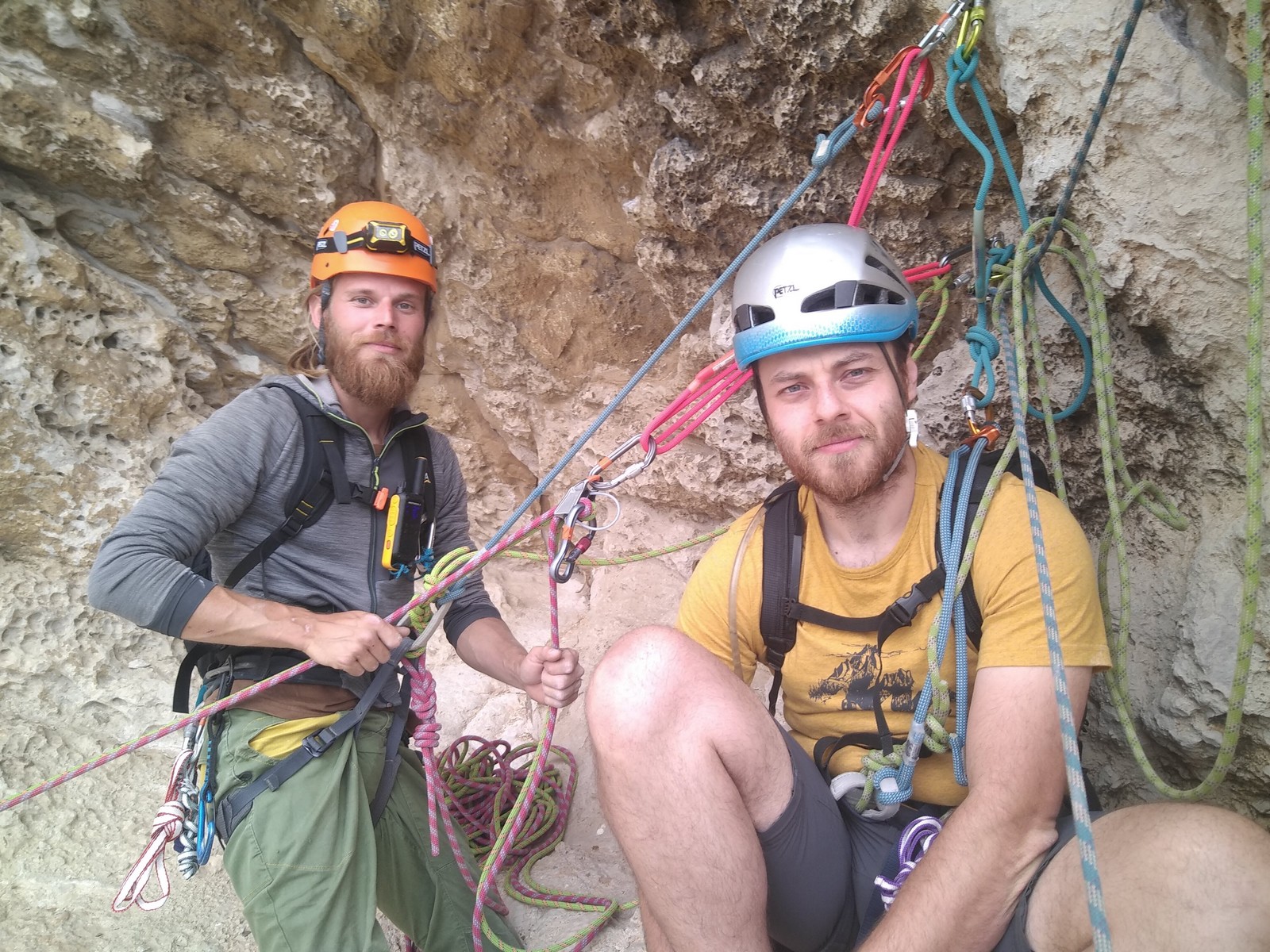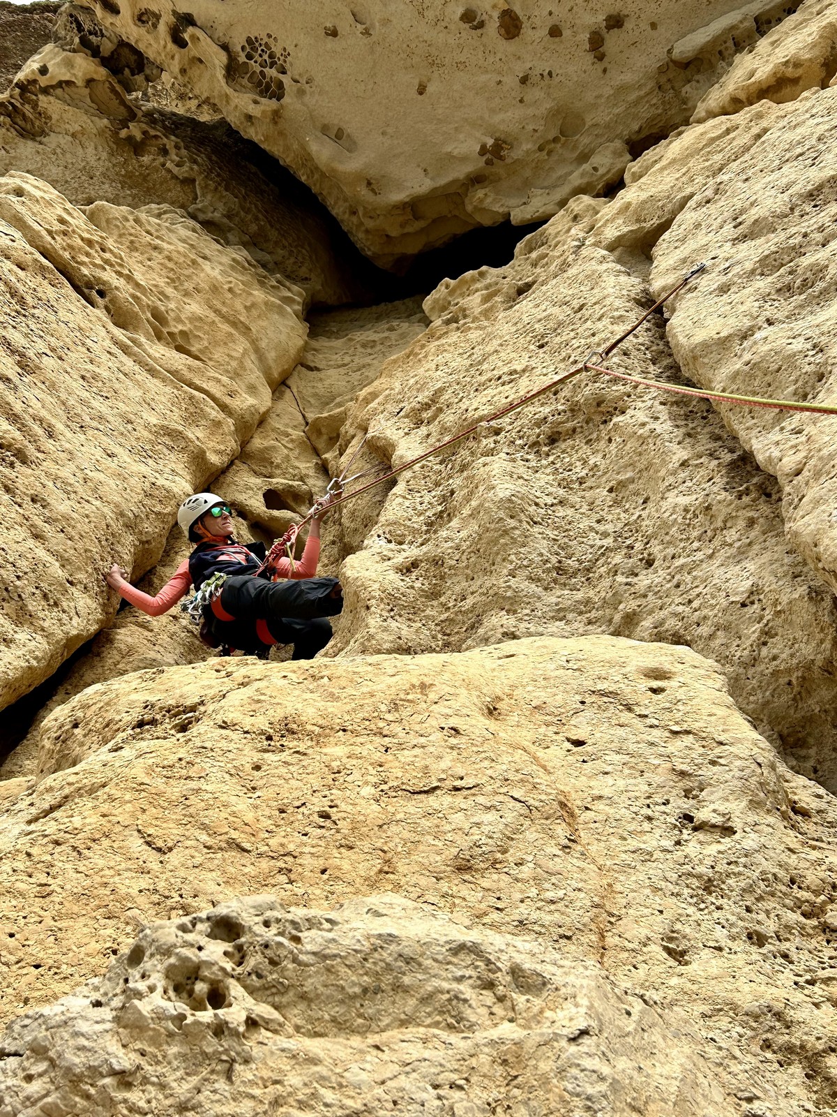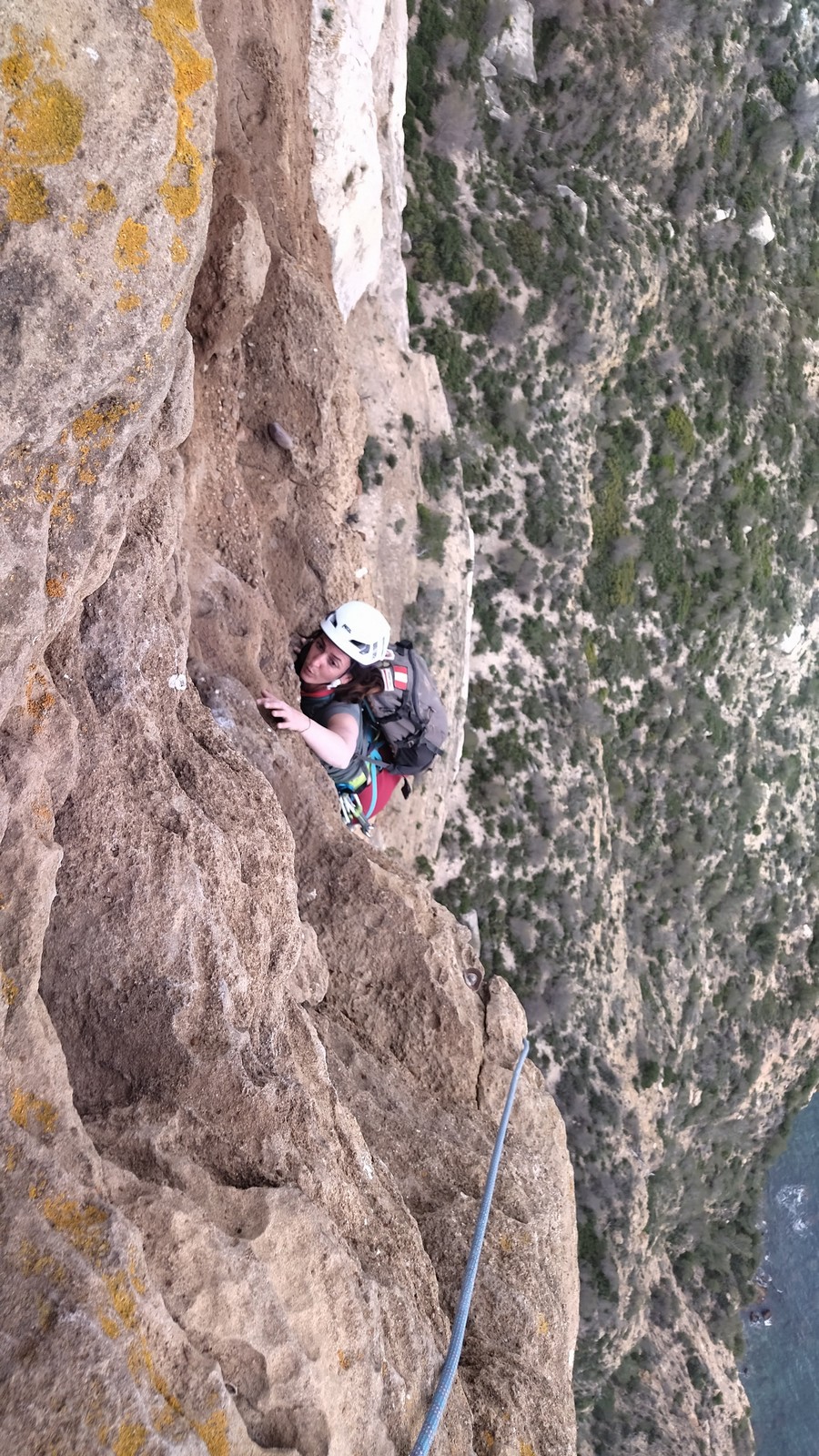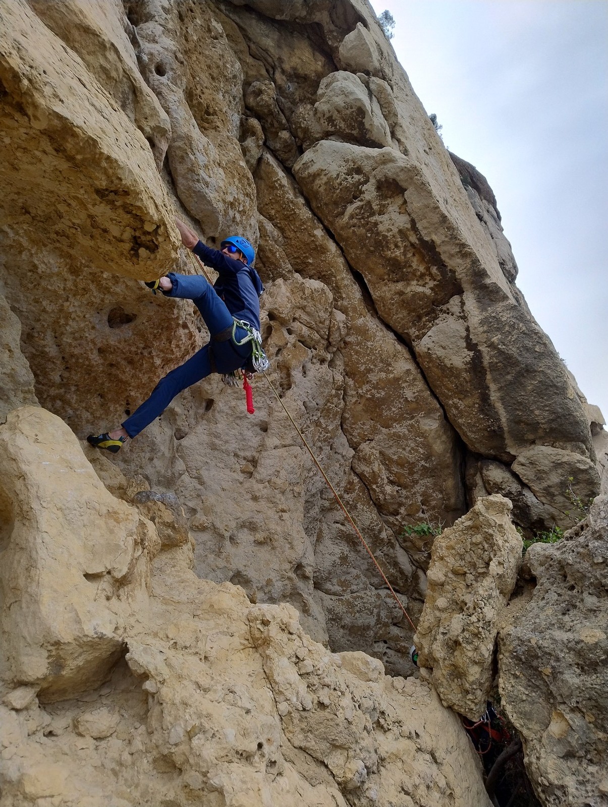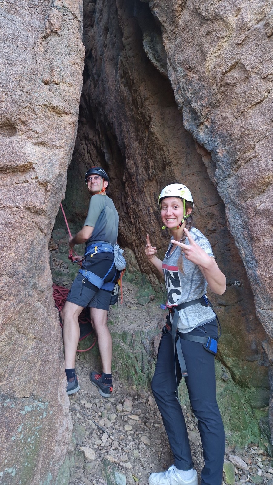 En dehors de François qui dort dans le auvent de la tente des 6 harpies, tout le monde semble avoir dormi d’un sommeil du juste. Un seul petit épisode de panique nocturne a tiré du duvet Dona et Sylvain mais tout est vite rentré dans l’ordre. Après nos deux kilos de Nutella quotidien et la préparation des casses croûtes, nous voilà de nouveau en route vers notre falaise fétiche. Aujourd’hui c’est les secteurs autour de « Colibri » qui ont l’honneur de nous recevoir. Maya est la première à grimper, elle s’aventure en tête dans » Ça glisse au pays des merveilles » un 5a+ au départ déroutant. Elle sera malheureusement stoppée à mi voie par une trop grande appréhension de la chute. Persévère pour enfin dépasser cette peur et ainsi mettre à profit tes qualités de falaisiste. Lino met également de la bonne volonté et réalise en tête un 4a très raide au vu de la cotation. Anaïs, pleine d’envie, tente également sa chance en tête. Une tentative malheureusement avortée par un manque d’expérience mais rien ne lui enlève son sourire et sa bonne humeur communicative. S’ensuit des performances plus au moins notables jusqu’au très attendu pique nique. Mathis, qui s’était chauffé en faisant à vue le 7b « Transmutation » et Sylvain profitent de la pause pour tenter d’enchainer leur projet de la veille en 7c… sans succès ! Malgré deux beaux essais de Mathis, le crux final restera invaincu.