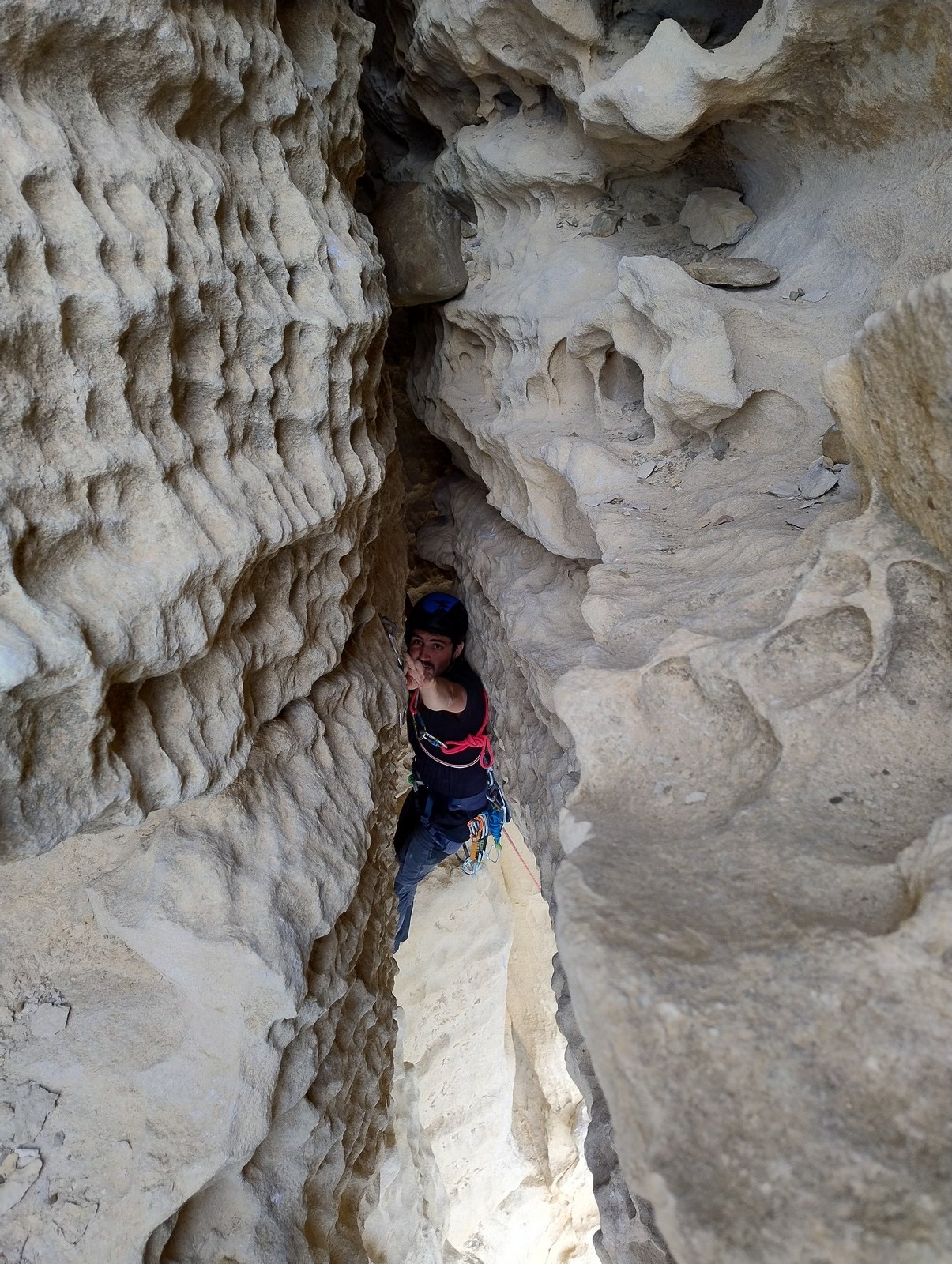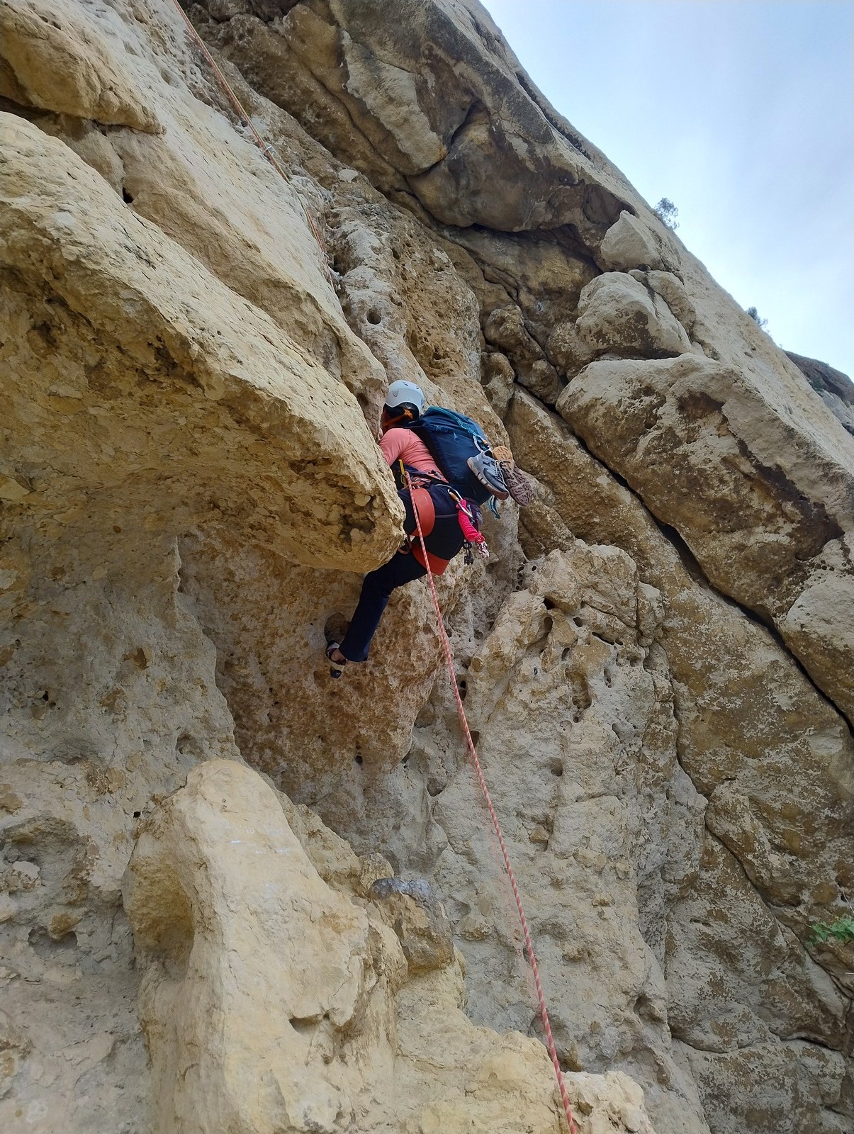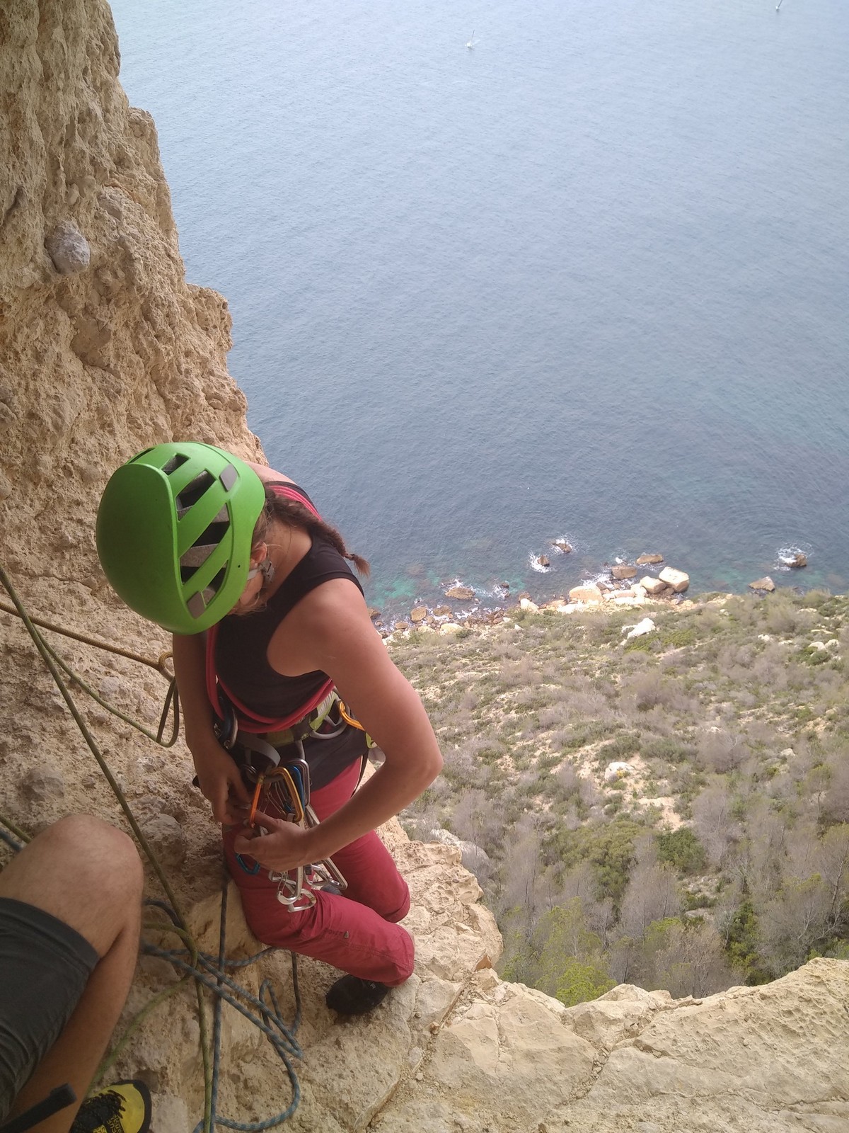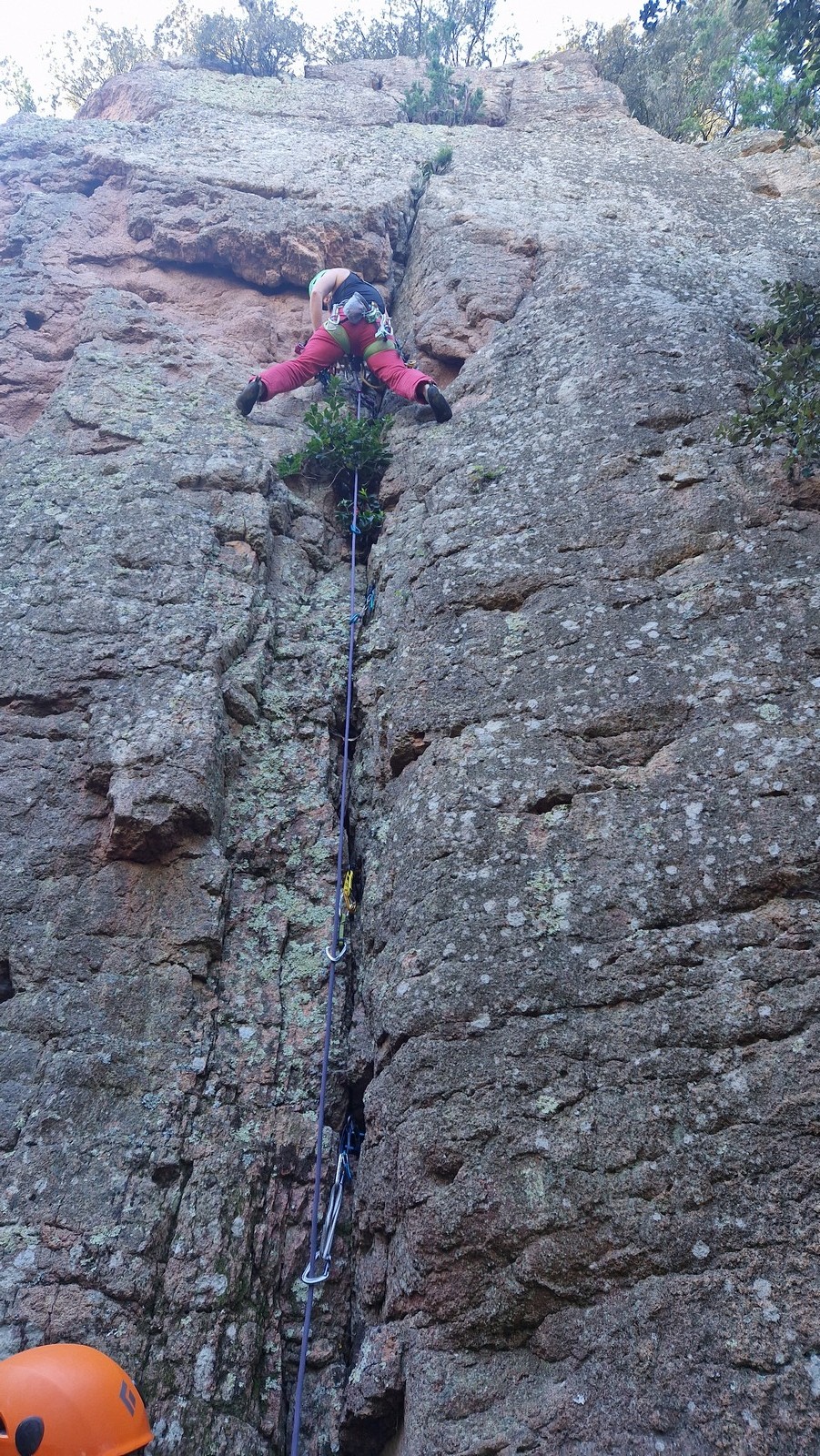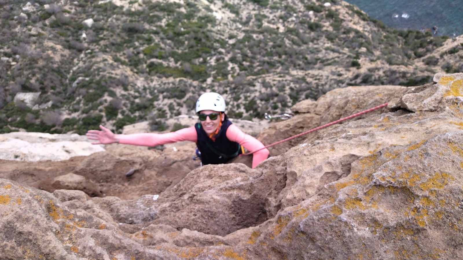 En dehors de François qui dort dans le auvent de la tente des 6 harpies, tout le monde semble avoir dormi d’un sommeil du juste. Un seul petit épisode de panique nocturne a tiré du duvet Dona et Sylvain mais tout est vite rentré dans l’ordre. Après nos deux kilos de Nutella quotidien et la préparation des casses croûtes, nous voilà de nouveau en route vers notre falaise fétiche. Aujourd’hui c’est les secteurs autour de « Colibri » qui ont l’honneur de nous recevoir. Maya est la première à grimper, elle s’aventure en tête dans » Ça glisse au pays des merveilles » un 5a+ au départ déroutant. Elle sera malheureusement stoppée à mi voie par une trop grande appréhension de la chute. Persévère pour enfin dépasser cette peur et ainsi mettre à profit tes qualités de falaisiste. Lino met également de la bonne volonté et réalise en tête un 4a très raide au vu de la cotation. Anaïs, pleine d’envie, tente également sa chance en tête. Une tentative malheureusement avortée par un manque d’expérience mais rien ne lui enlève son sourire et sa bonne humeur communicative. S’ensuit des performances plus au moins notables jusqu’au très attendu pique nique. Mathis, qui s’était chauffé en faisant à vue le 7b « Transmutation » et Sylvain profitent de la pause pour tenter d’enchainer leur projet de la veille en 7c… sans succès ! Malgré deux beaux essais de Mathis, le crux final restera invaincu.