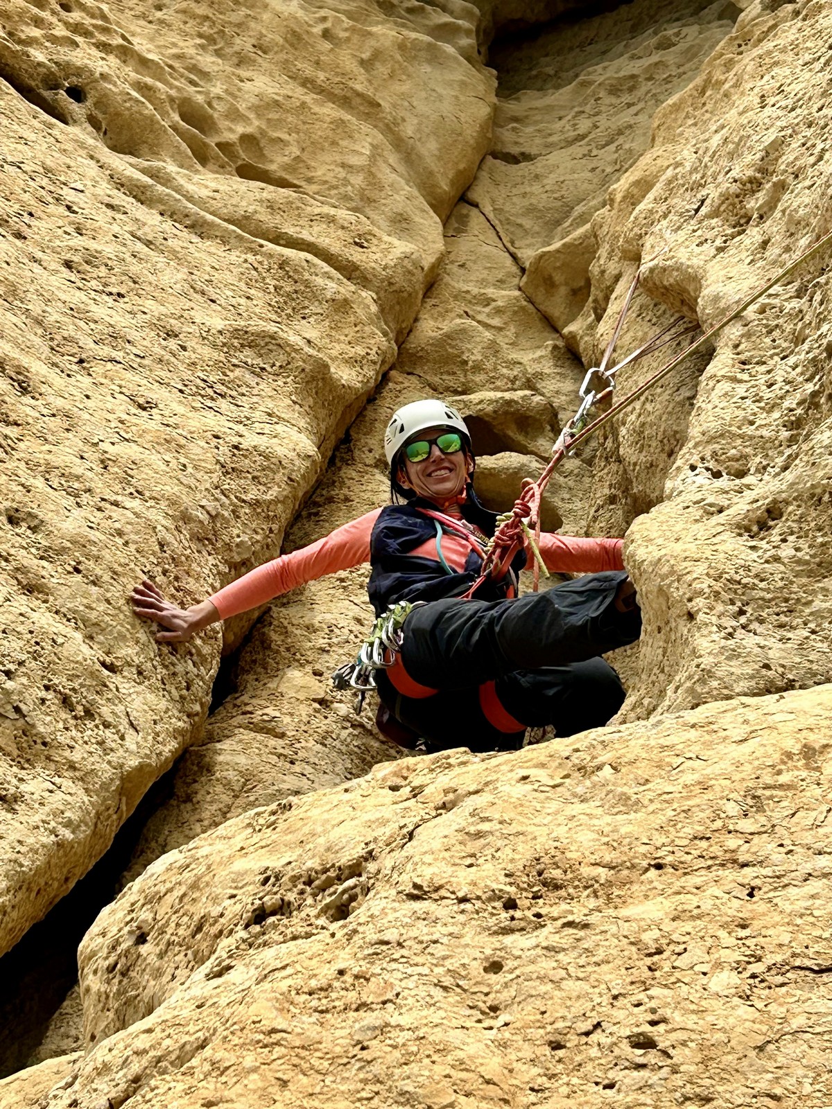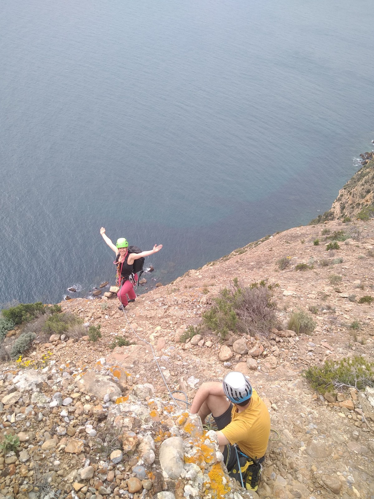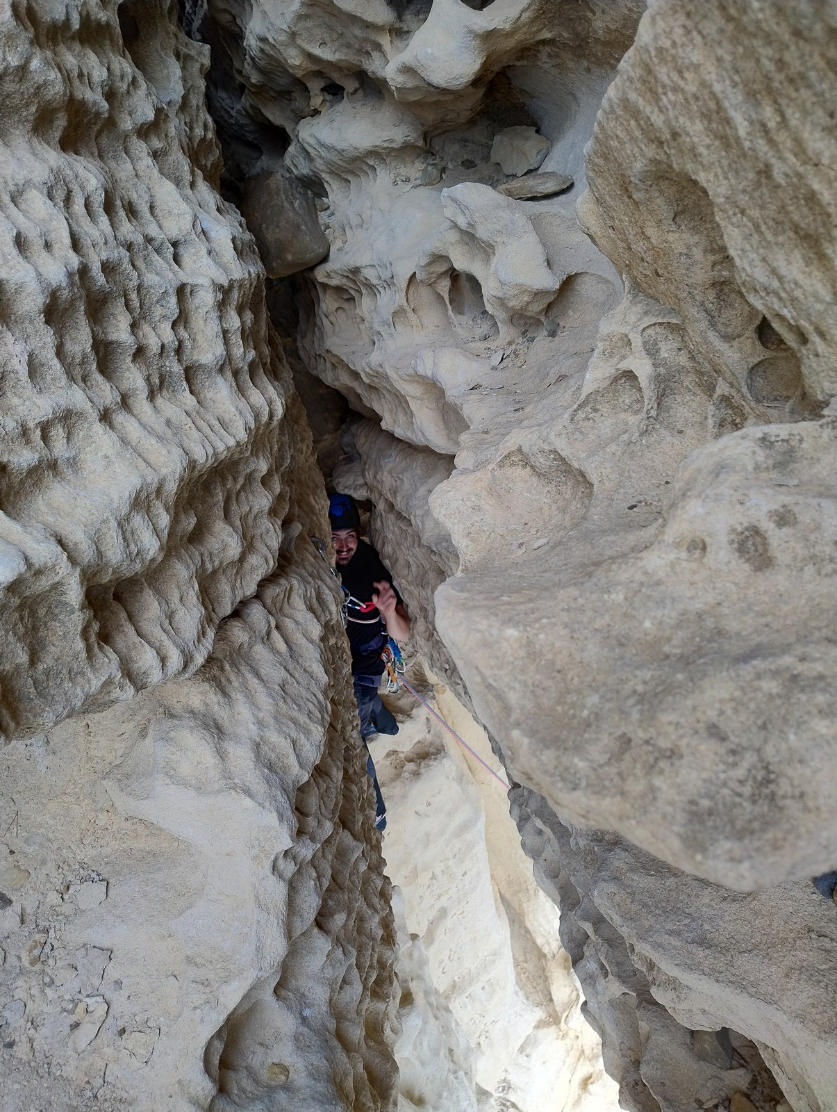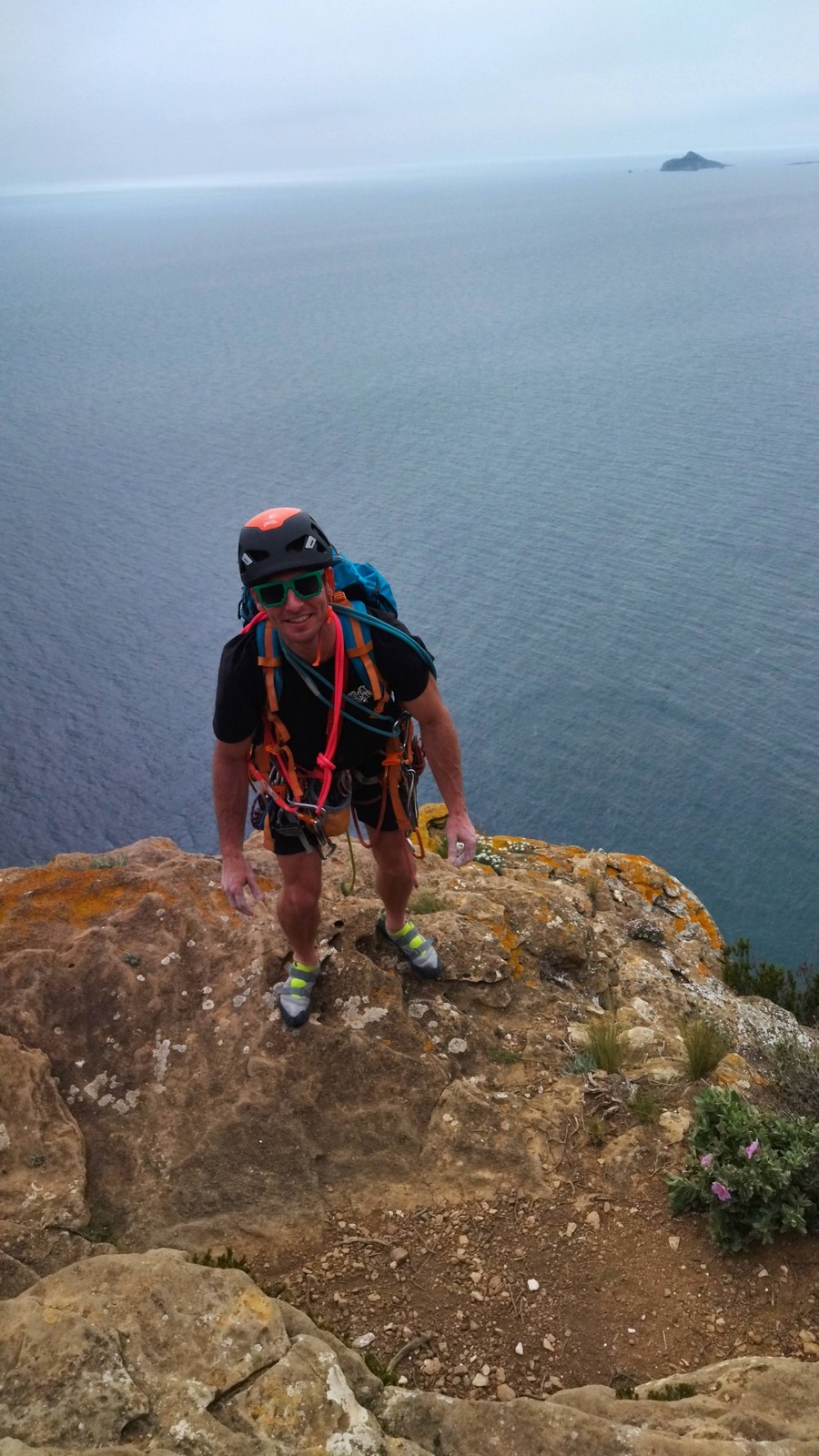 En dehors de François qui dort dans le auvent de la tente des 6 harpies, tout le monde semble avoir dormi d’un sommeil du juste. Un seul petit épisode de panique nocturne a tiré du duvet Dona et Sylvain mais tout est vite rentré dans l’ordre. Après nos deux kilos de Nutella quotidien et la préparation des casses croûtes, nous voilà de nouveau en route vers notre falaise fétiche. Aujourd’hui c’est les secteurs autour de « Colibri » qui ont l’honneur de nous recevoir. Maya est la première à grimper, elle s’aventure en tête dans » Ça glisse au pays des merveilles » un 5a+ au départ déroutant. Elle sera malheureusement stoppée à mi voie par une trop grande appréhension de la chute. Persévère pour enfin dépasser cette peur et ainsi mettre à profit tes qualités de falaisiste. Lino met également de la bonne volonté et réalise en tête un 4a très raide au vu de la cotation. Anaïs, pleine d’envie, tente également sa chance en tête. Une tentative malheureusement avortée par un manque d’expérience mais rien ne lui enlève son sourire et sa bonne humeur communicative. S’ensuit des performances plus au moins notables jusqu’au très attendu pique nique. Mathis, qui s’était chauffé en faisant à vue le 7b « Transmutation » et Sylvain profitent de la pause pour tenter d’enchainer leur projet de la veille en 7c… sans succès ! Malgré deux beaux essais de Mathis, le crux final restera invaincu.