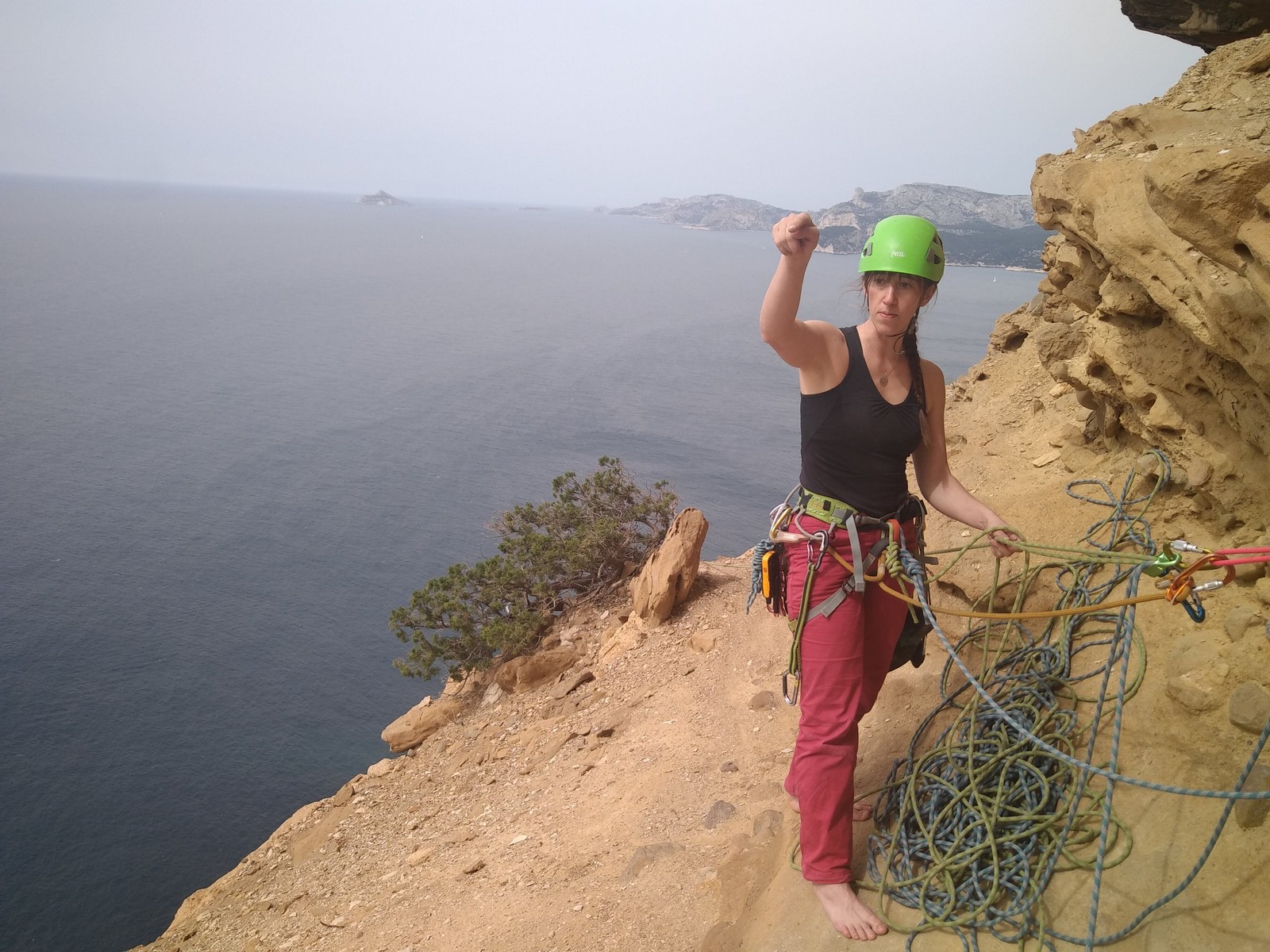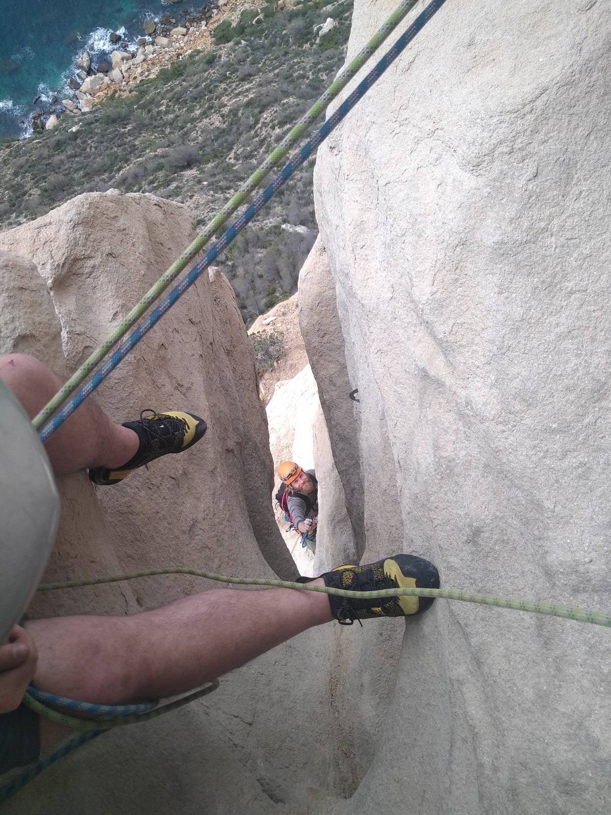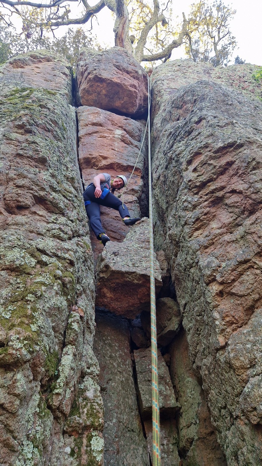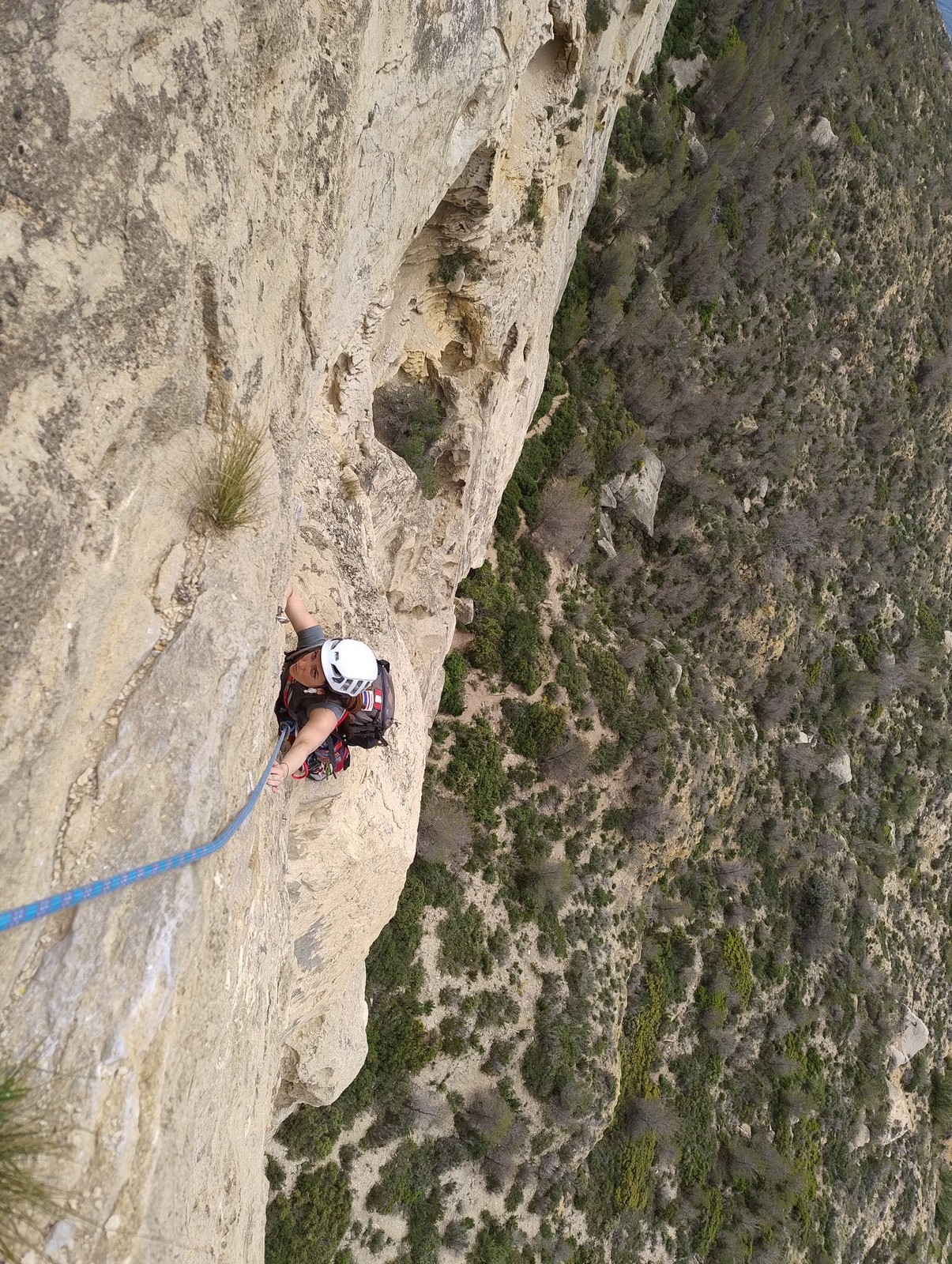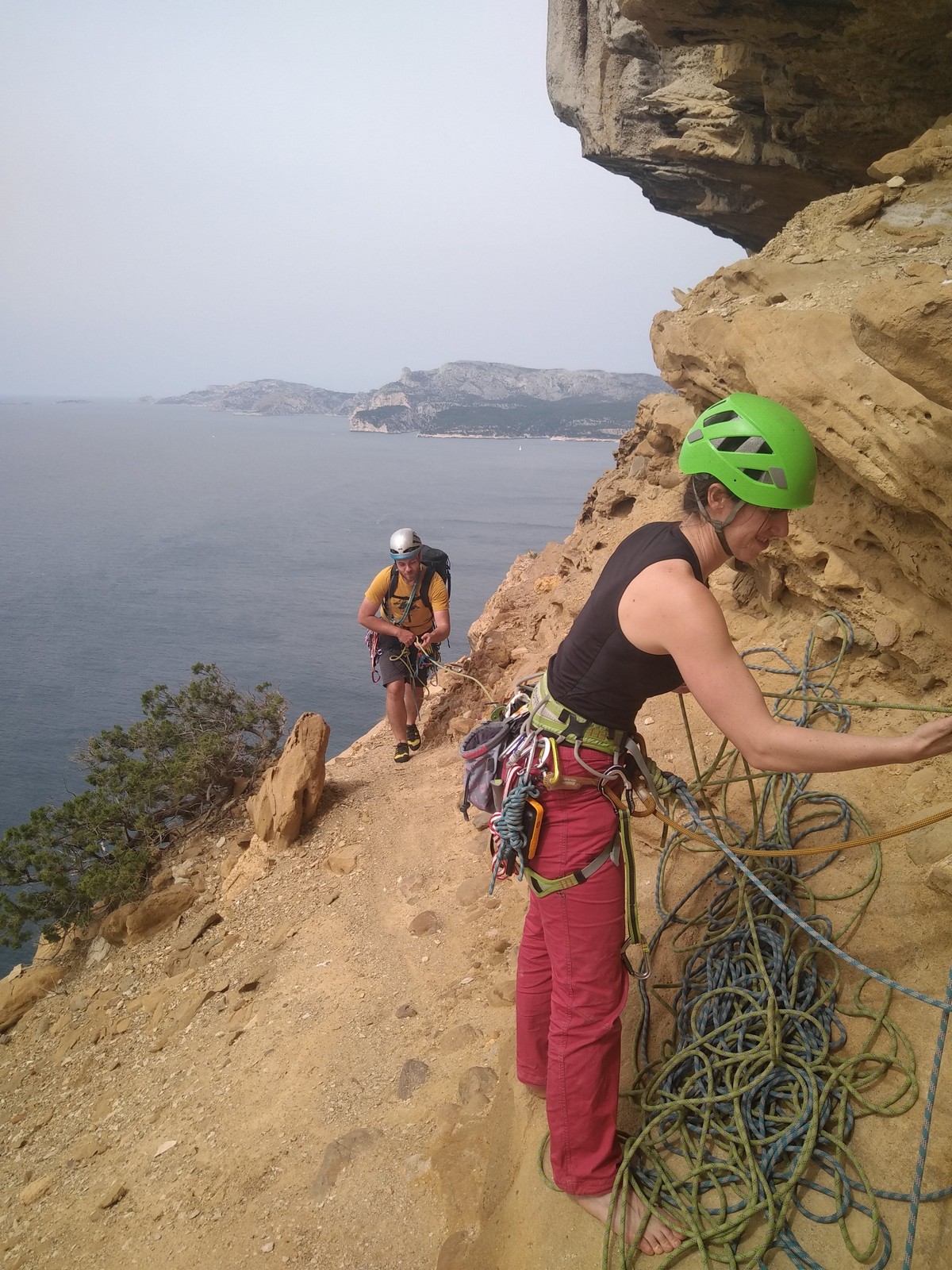 En dehors de François qui dort dans le auvent de la tente des 6 harpies, tout le monde semble avoir dormi d’un sommeil du juste. Un seul petit épisode de panique nocturne a tiré du duvet Dona et Sylvain mais tout est vite rentré dans l’ordre. Après nos deux kilos de Nutella quotidien et la préparation des casses croûtes, nous voilà de nouveau en route vers notre falaise fétiche. Aujourd’hui c’est les secteurs autour de « Colibri » qui ont l’honneur de nous recevoir. Maya est la première à grimper, elle s’aventure en tête dans » Ça glisse au pays des merveilles » un 5a+ au départ déroutant. Elle sera malheureusement stoppée à mi voie par une trop grande appréhension de la chute. Persévère pour enfin dépasser cette peur et ainsi mettre à profit tes qualités de falaisiste. Lino met également de la bonne volonté et réalise en tête un 4a très raide au vu de la cotation. Anaïs, pleine d’envie, tente également sa chance en tête. Une tentative malheureusement avortée par un manque d’expérience mais rien ne lui enlève son sourire et sa bonne humeur communicative. S’ensuit des performances plus au moins notables jusqu’au très attendu pique nique. Mathis, qui s’était chauffé en faisant à vue le 7b « Transmutation » et Sylvain profitent de la pause pour tenter d’enchainer leur projet de la veille en 7c… sans succès ! Malgré deux beaux essais de Mathis, le crux final restera invaincu.