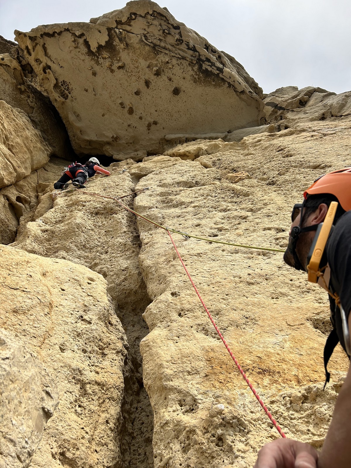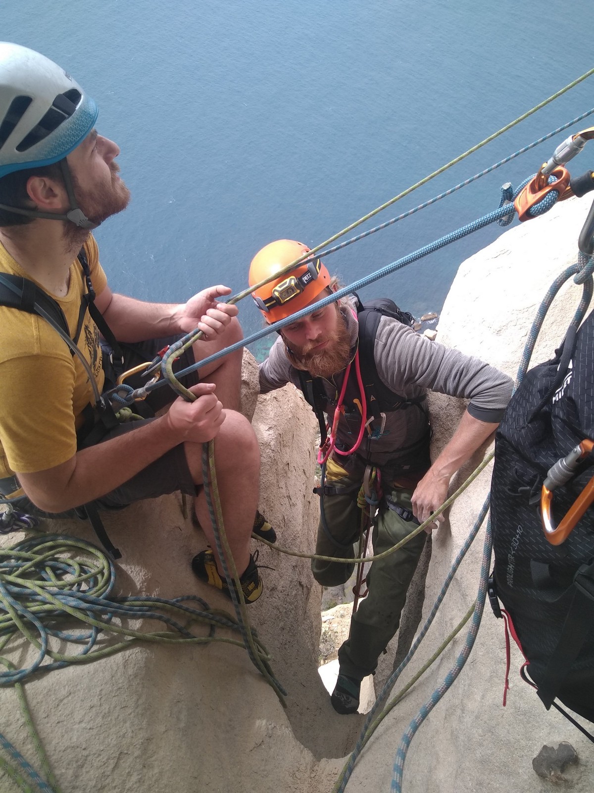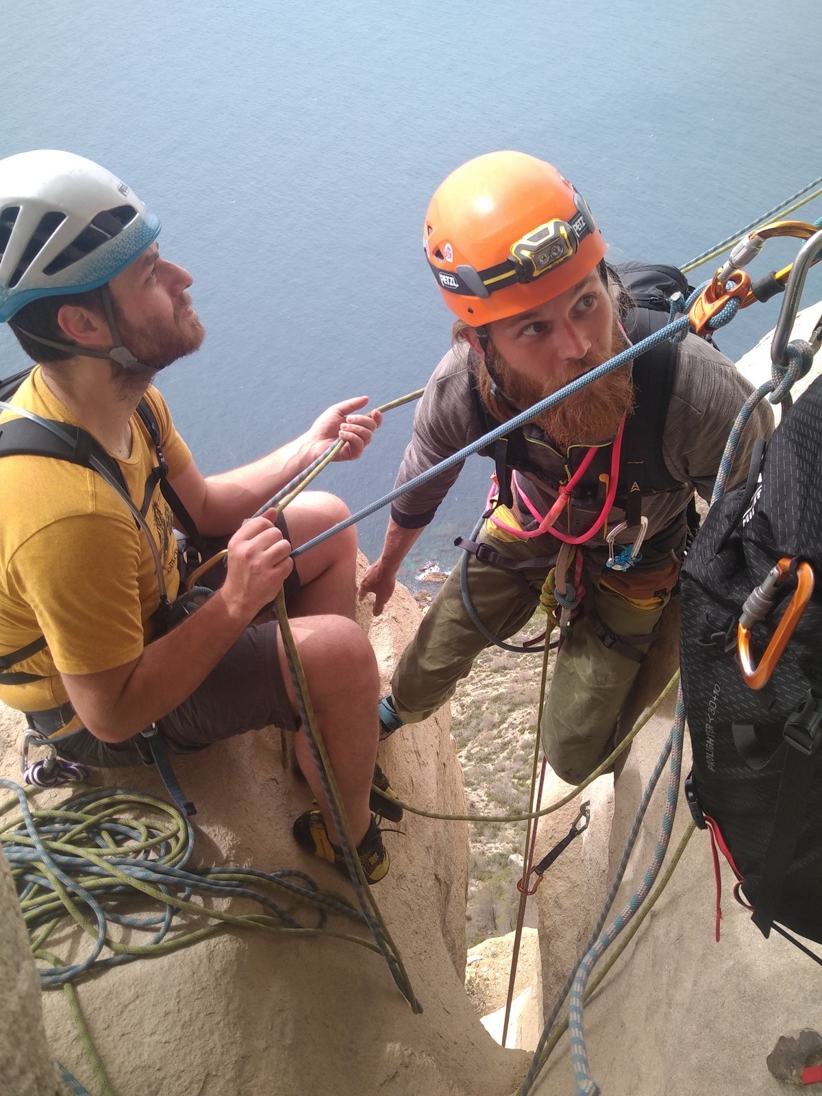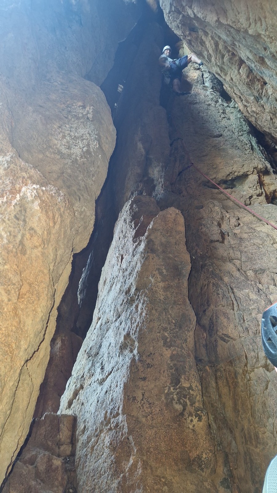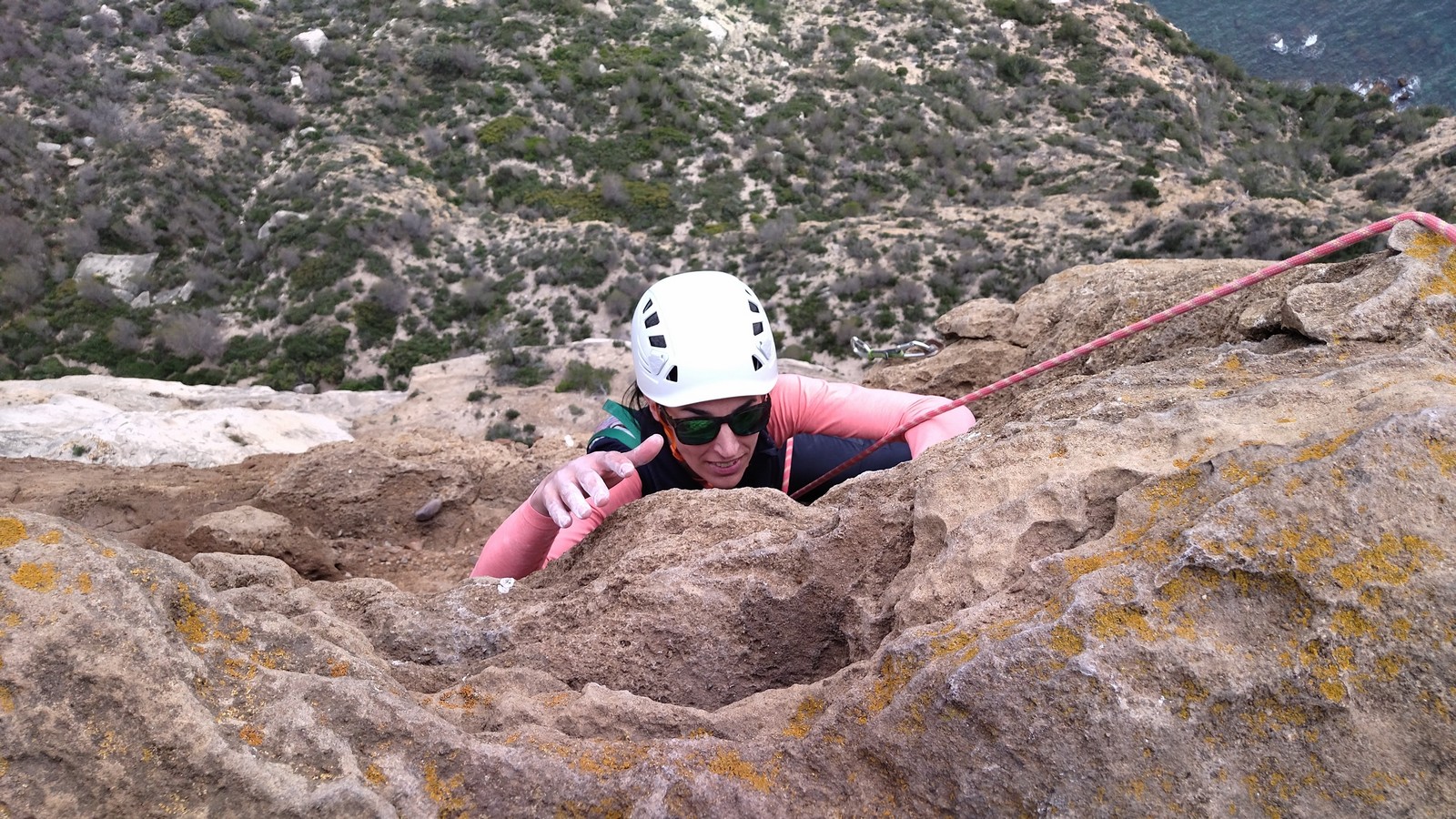 En dehors de François qui dort dans le auvent de la tente des 6 harpies, tout le monde semble avoir dormi d’un sommeil du juste. Un seul petit épisode de panique nocturne a tiré du duvet Dona et Sylvain mais tout est vite rentré dans l’ordre. Après nos deux kilos de Nutella quotidien et la préparation des casses croûtes, nous voilà de nouveau en route vers notre falaise fétiche. Aujourd’hui c’est les secteurs autour de « Colibri » qui ont l’honneur de nous recevoir. Maya est la première à grimper, elle s’aventure en tête dans » Ça glisse au pays des merveilles » un 5a+ au départ déroutant. Elle sera malheureusement stoppée à mi voie par une trop grande appréhension de la chute. Persévère pour enfin dépasser cette peur et ainsi mettre à profit tes qualités de falaisiste. Lino met également de la bonne volonté et réalise en tête un 4a très raide au vu de la cotation. Anaïs, pleine d’envie, tente également sa chance en tête. Une tentative malheureusement avortée par un manque d’expérience mais rien ne lui enlève son sourire et sa bonne humeur communicative. S’ensuit des performances plus au moins notables jusqu’au très attendu pique nique. Mathis, qui s’était chauffé en faisant à vue le 7b « Transmutation » et Sylvain profitent de la pause pour tenter d’enchainer leur projet de la veille en 7c… sans succès ! Malgré deux beaux essais de Mathis, le crux final restera invaincu.