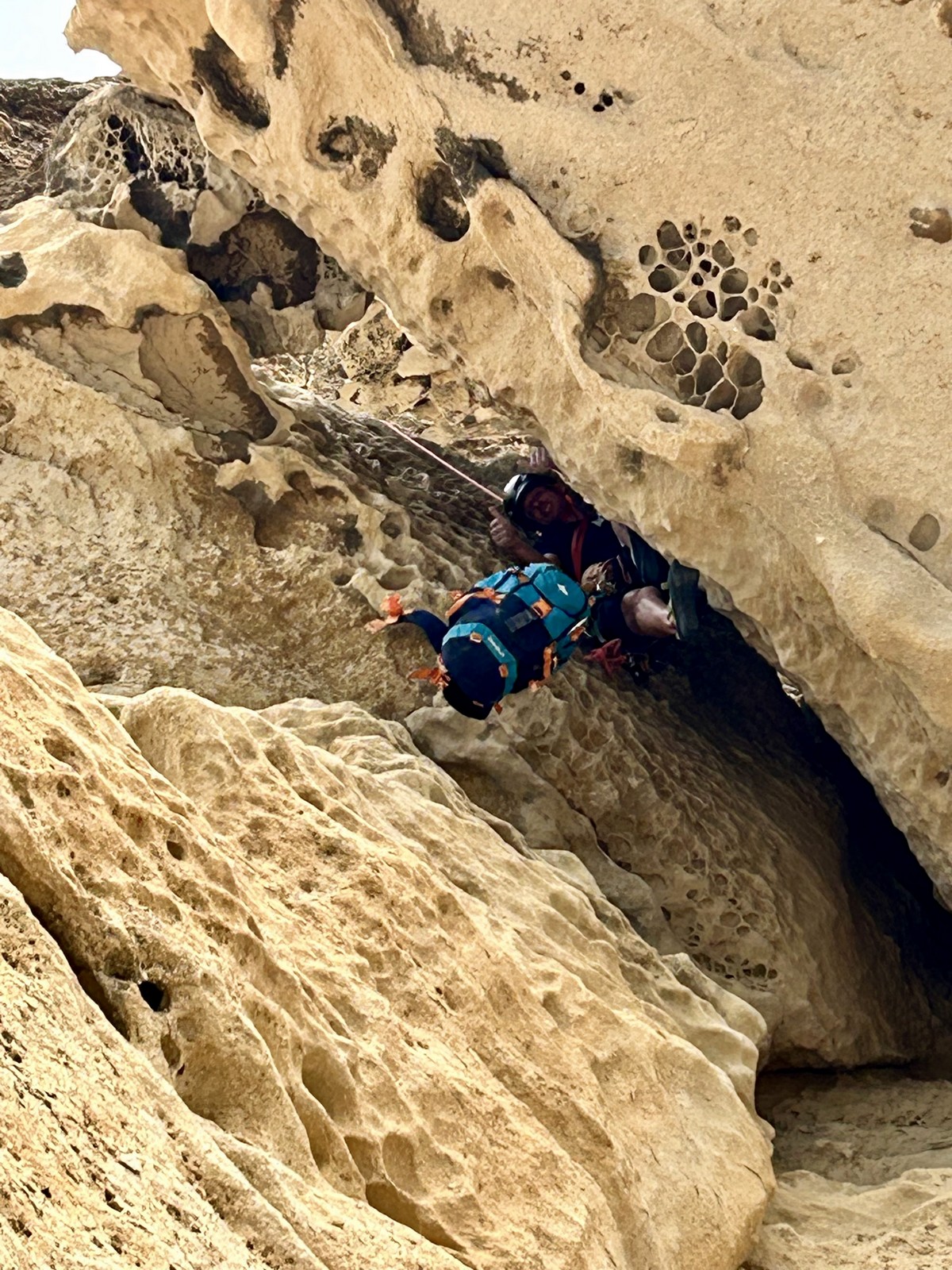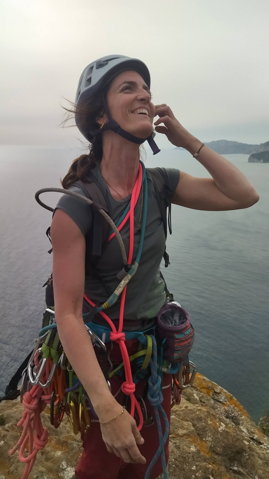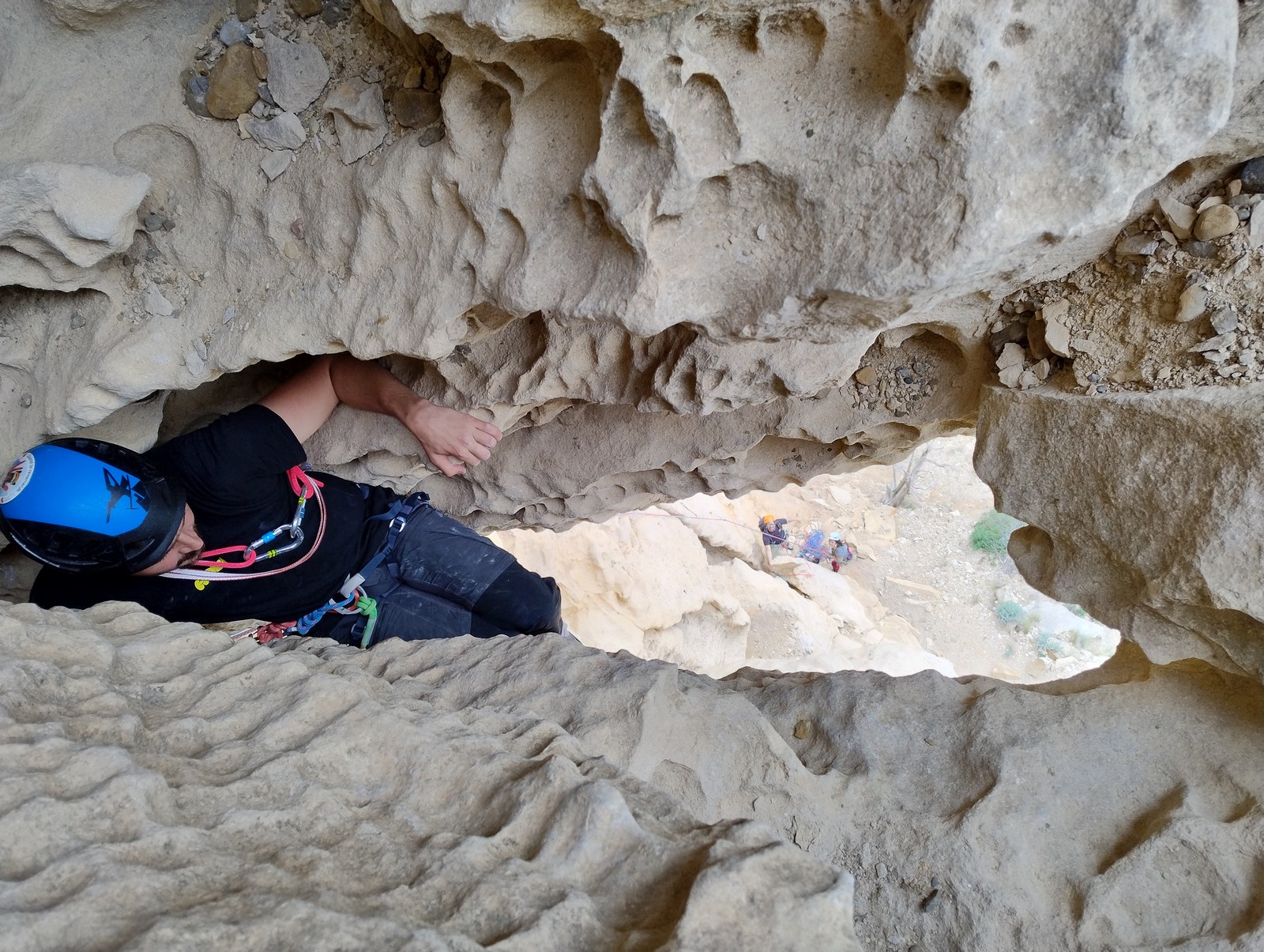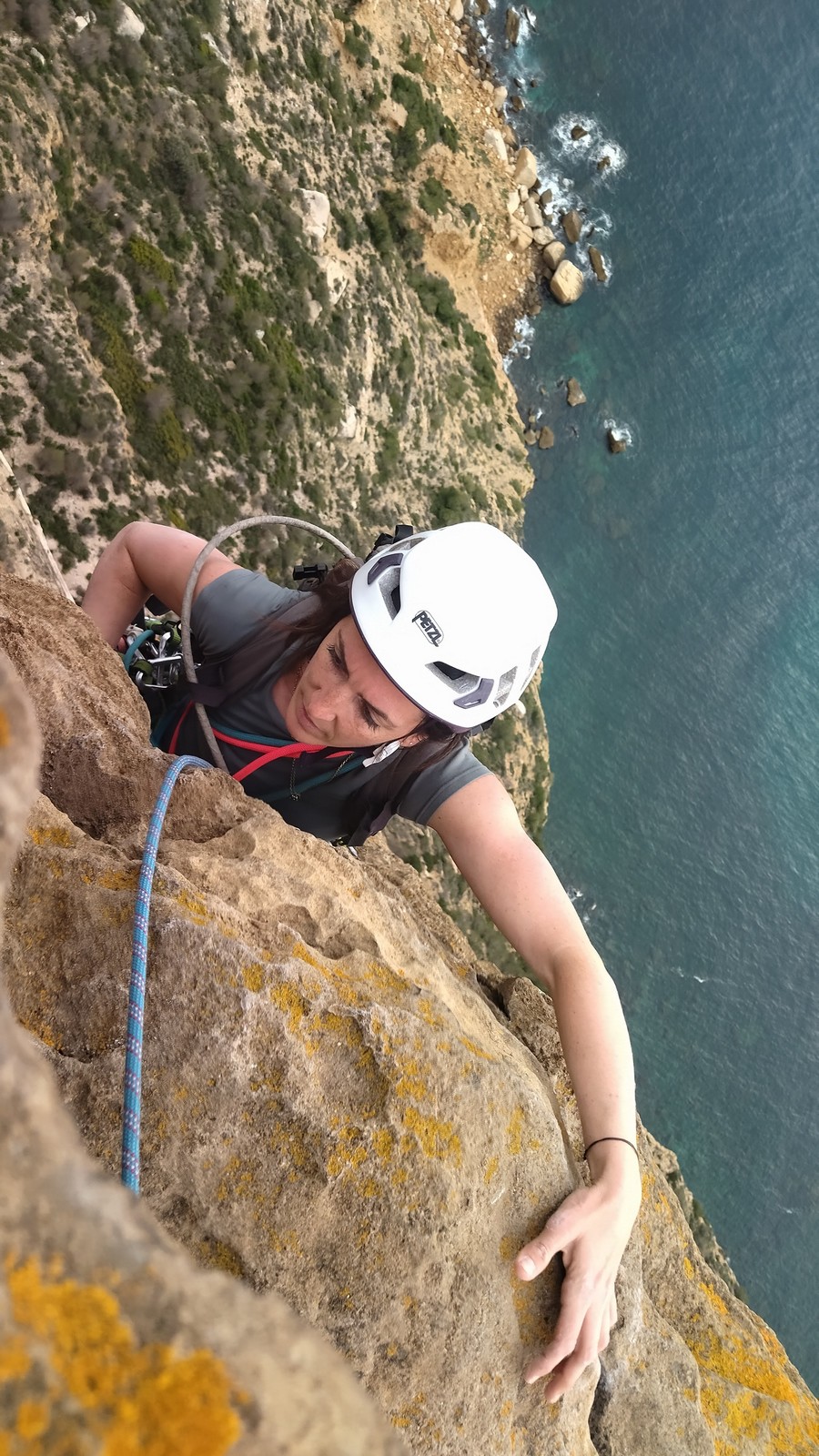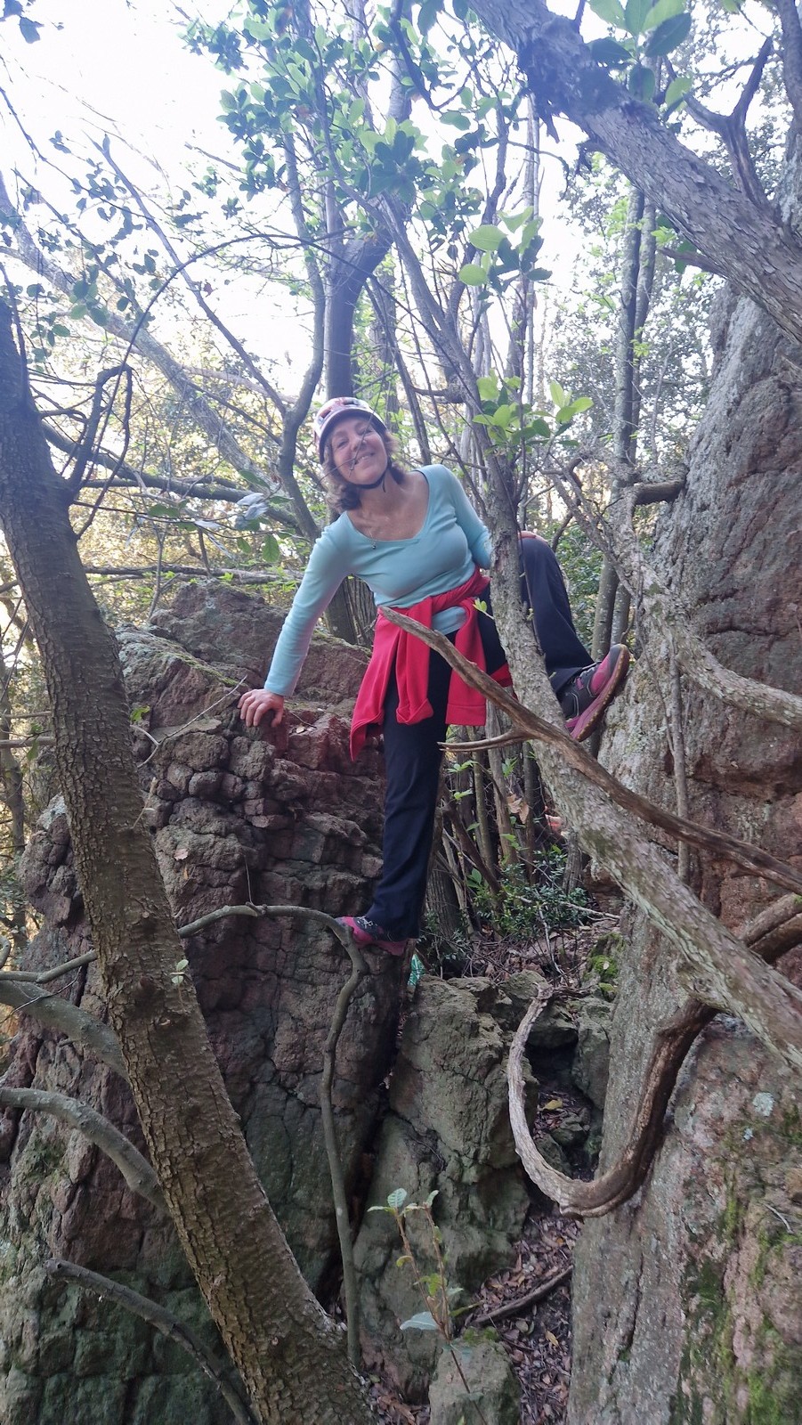 En dehors de François qui dort dans le auvent de la tente des 6 harpies, tout le monde semble avoir dormi d’un sommeil du juste. Un seul petit épisode de panique nocturne a tiré du duvet Dona et Sylvain mais tout est vite rentré dans l’ordre. Après nos deux kilos de Nutella quotidien et la préparation des casses croûtes, nous voilà de nouveau en route vers notre falaise fétiche. Aujourd’hui c’est les secteurs autour de « Colibri » qui ont l’honneur de nous recevoir. Maya est la première à grimper, elle s’aventure en tête dans » Ça glisse au pays des merveilles » un 5a+ au départ déroutant. Elle sera malheureusement stoppée à mi voie par une trop grande appréhension de la chute. Persévère pour enfin dépasser cette peur et ainsi mettre à profit tes qualités de falaisiste. Lino met également de la bonne volonté et réalise en tête un 4a très raide au vu de la cotation. Anaïs, pleine d’envie, tente également sa chance en tête. Une tentative malheureusement avortée par un manque d’expérience mais rien ne lui enlève son sourire et sa bonne humeur communicative. S’ensuit des performances plus au moins notables jusqu’au très attendu pique nique. Mathis, qui s’était chauffé en faisant à vue le 7b « Transmutation » et Sylvain profitent de la pause pour tenter d’enchainer leur projet de la veille en 7c… sans succès ! Malgré deux beaux essais de Mathis, le crux final restera invaincu.