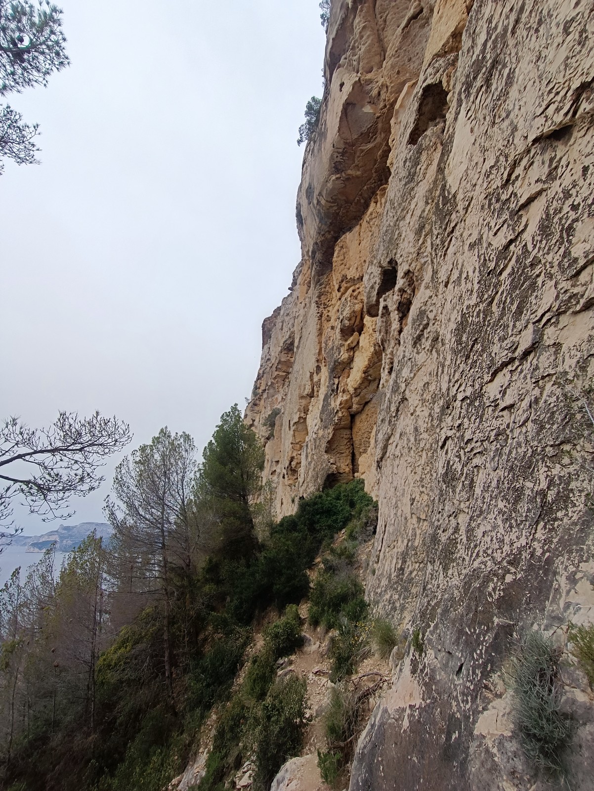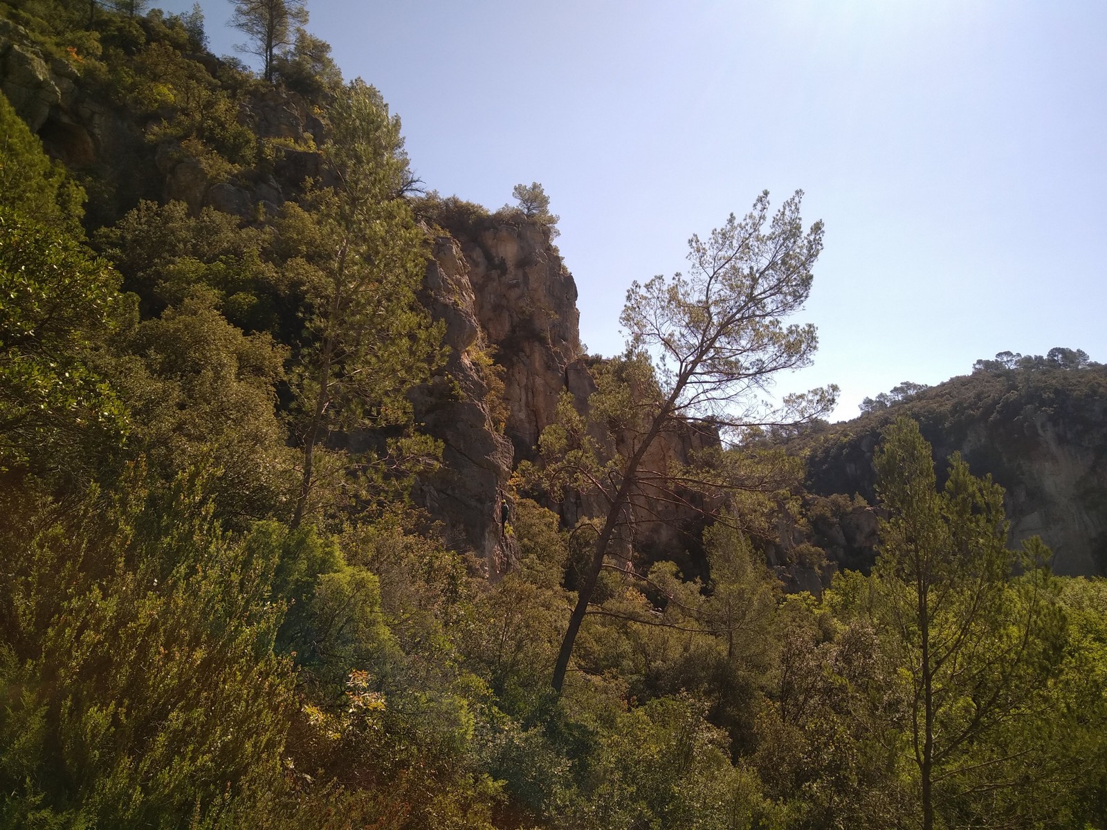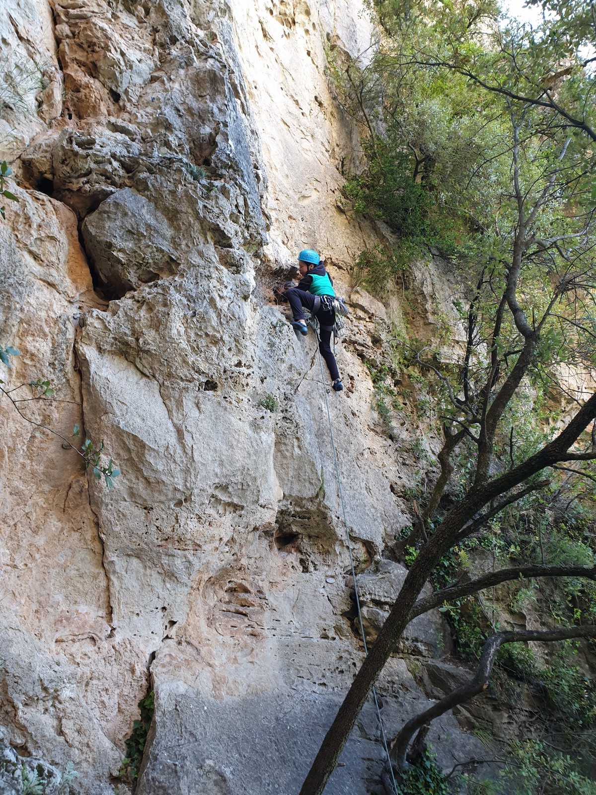 Il est maintenant l’heure de rejoindre notre belle falaise et, pour cette première après midi, ce sont les secteurs voisins « Casque bleu », « Kricket » et « Atlantis » qui nous accueillent. Comme le parking est interdit dans tout le vallon Sourn, les pilotes effectuent une dépose de grimpeurs et du matériel au pied du secteur avant d’aller se garer 1km plus loin et revenir à pied. Pendant ce temps, Yannick et François organisent les cordées. La mise en route est lente, chacun essayant de manière plus ou moins autonome, de trouver une corde, un jeu de dégaine et accessoirement une voie à gravir. Antoine et Timéo se motivent pour grimper en tête. Léane, en guise d’échauffement, s’aventure dans la seule voie sans relief, elle butera à la troisième dégaine… Les moulinettes se multiplient et la grosse majorité des voies en 5 et 6a sont équipées d’une corde. L’ensemble des jeunes peut désormais s’exprimer dans des voies adaptées à leur niveau. Seule Anaïs, touchée par un virus, sera contrainte de rester assise sur un bout de caillou, elle aura le mérite d’attendre sans plainte la fin de la séance et Alaric, qui n’a pas trouvé ses chaussons dans ses affaires, est obligé de grimper en baskets ce qui complique un peu la donne, surtout que le secteur n’est pas facile. Mathis signe la performance du jour en réalisant au premier essai « Atlantis », le 8a majeur du secteur. La cordée Antoine/Esteban P n’est pas en reste et s’élance dans un 6b loin d’être donné. La température est frisquette et nous sommes à l’ombre. Les jeunes ont assez vite froid et il devient difficile de motiver tout le monde à grimper. Il est temps d’aller chercher les véhicules et, après un rangement laborieux des cordes, de rejoindre nos quartiers à Correns.