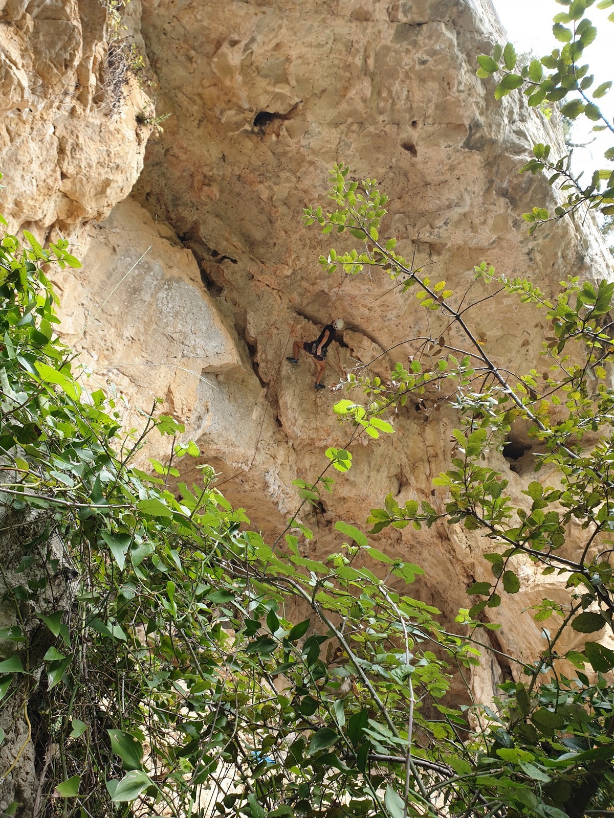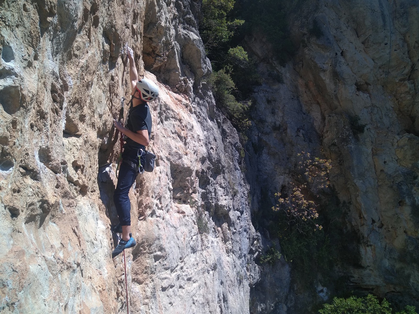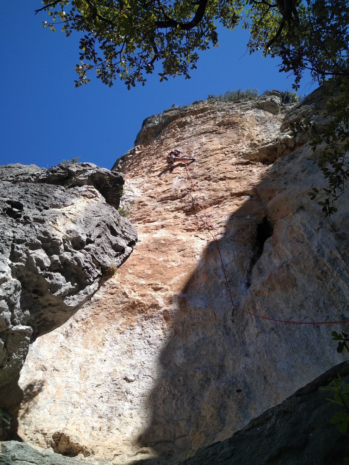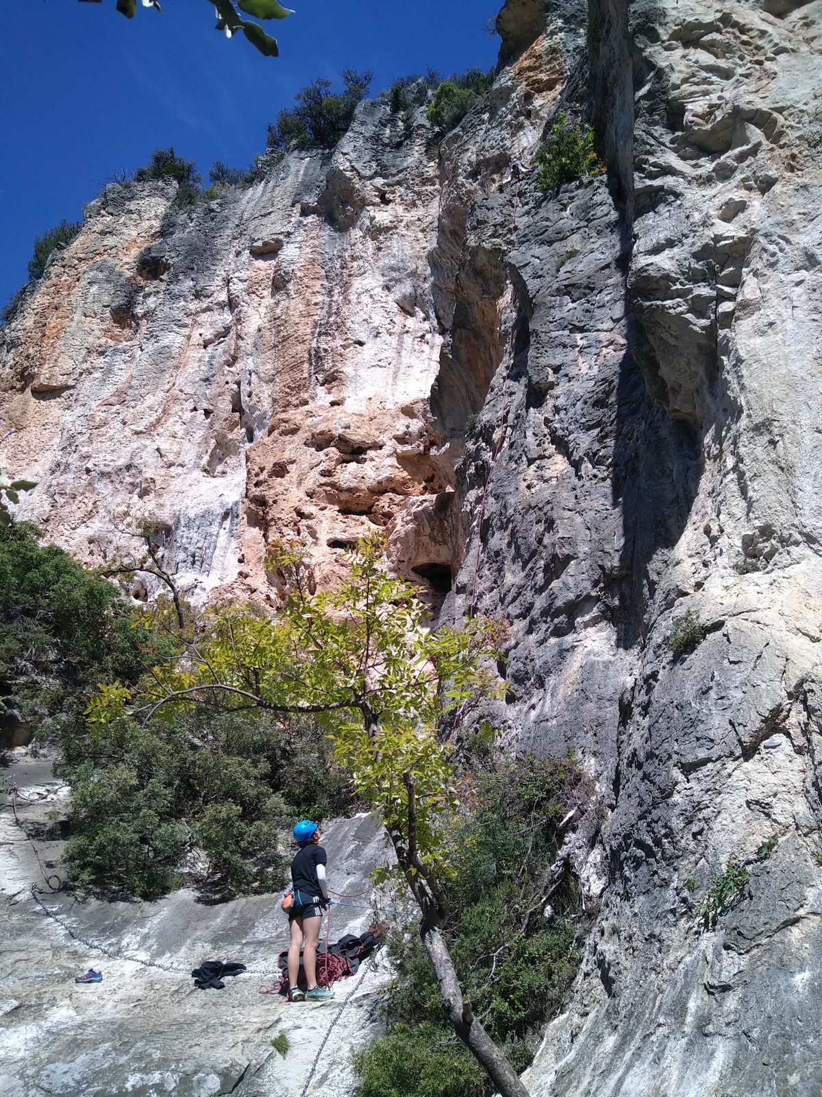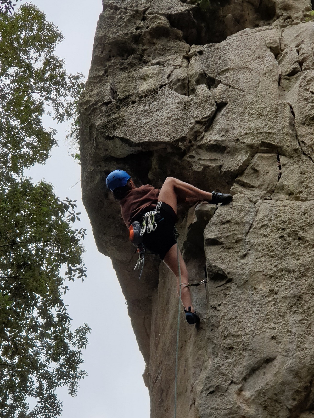 Les matinées se suivent et se ressemblent, je vous laisse donc déduire ce que nous avons ingéré, il faut que j’arrête de faire de la pub pour un produit qui favorise l’obésité et la déforestation sous peine de me faire censurer. À présent nous nous rendons au secteur « Alex » et « Triste tropique », le premier étant un beau mur vertical très sculpté, le deuxième nous offrant des voies plutôt courtes et pêchues. Après une mise en route toujours difficile, l’ensemble des participants trouvent chausson à leur pied. Baptiste avec un regain de motivation parcourt presque autant de mètres d’escalade en une matinée que lors des trois premiers jours. Lilas toujours discrète continue sur sa lancée et confirme sa belle prestation de la semaine avec, en prime, un comportement irréprochable (il ne faut juste pas la taquiner au réveil sous peine d’un regard noir à glacer le sang). Aujourd’hui le mercure s’est élevé et, notamment pour la dégustation de nos sandwichs, nous privilégions les zones ombragées.