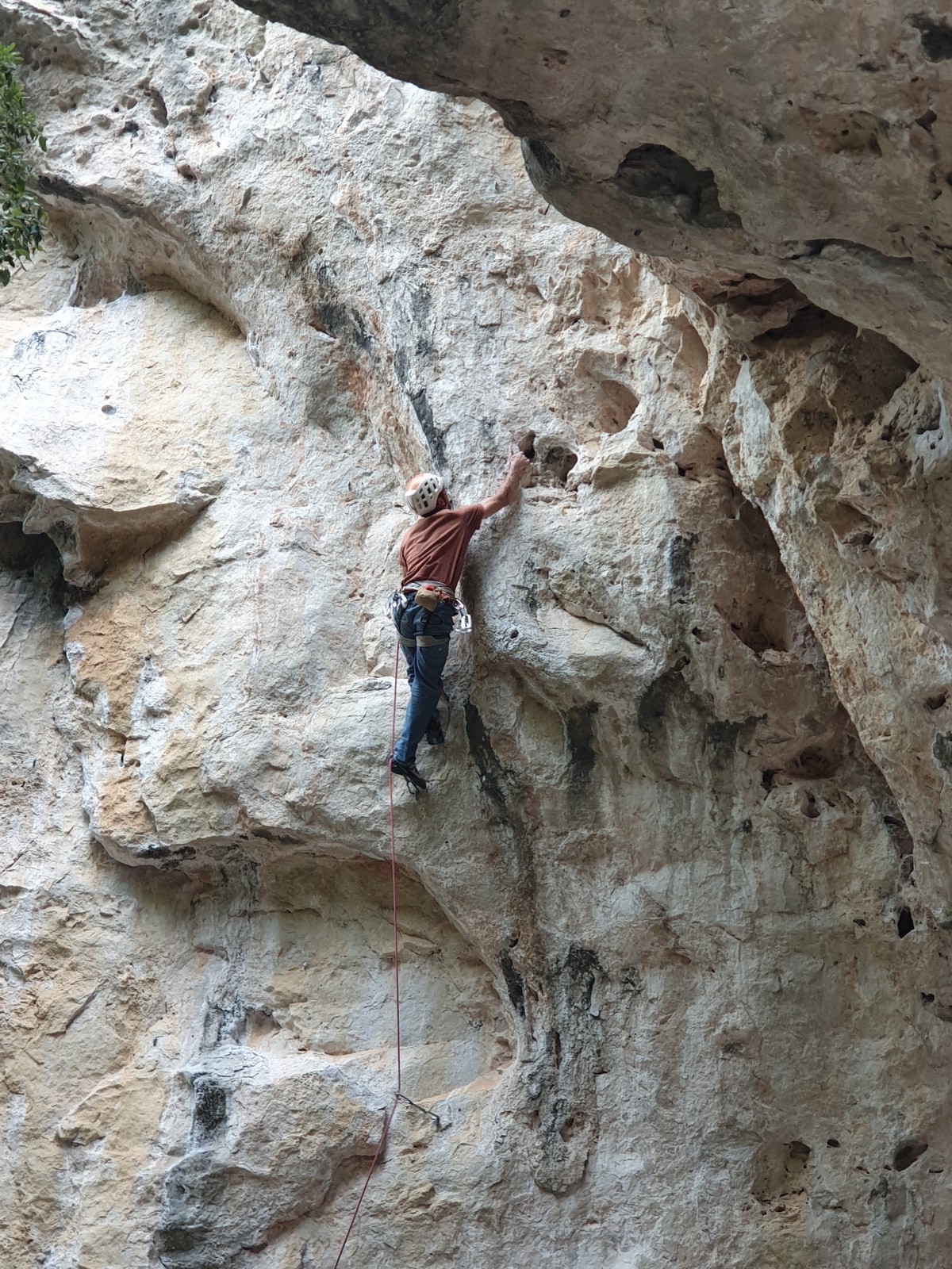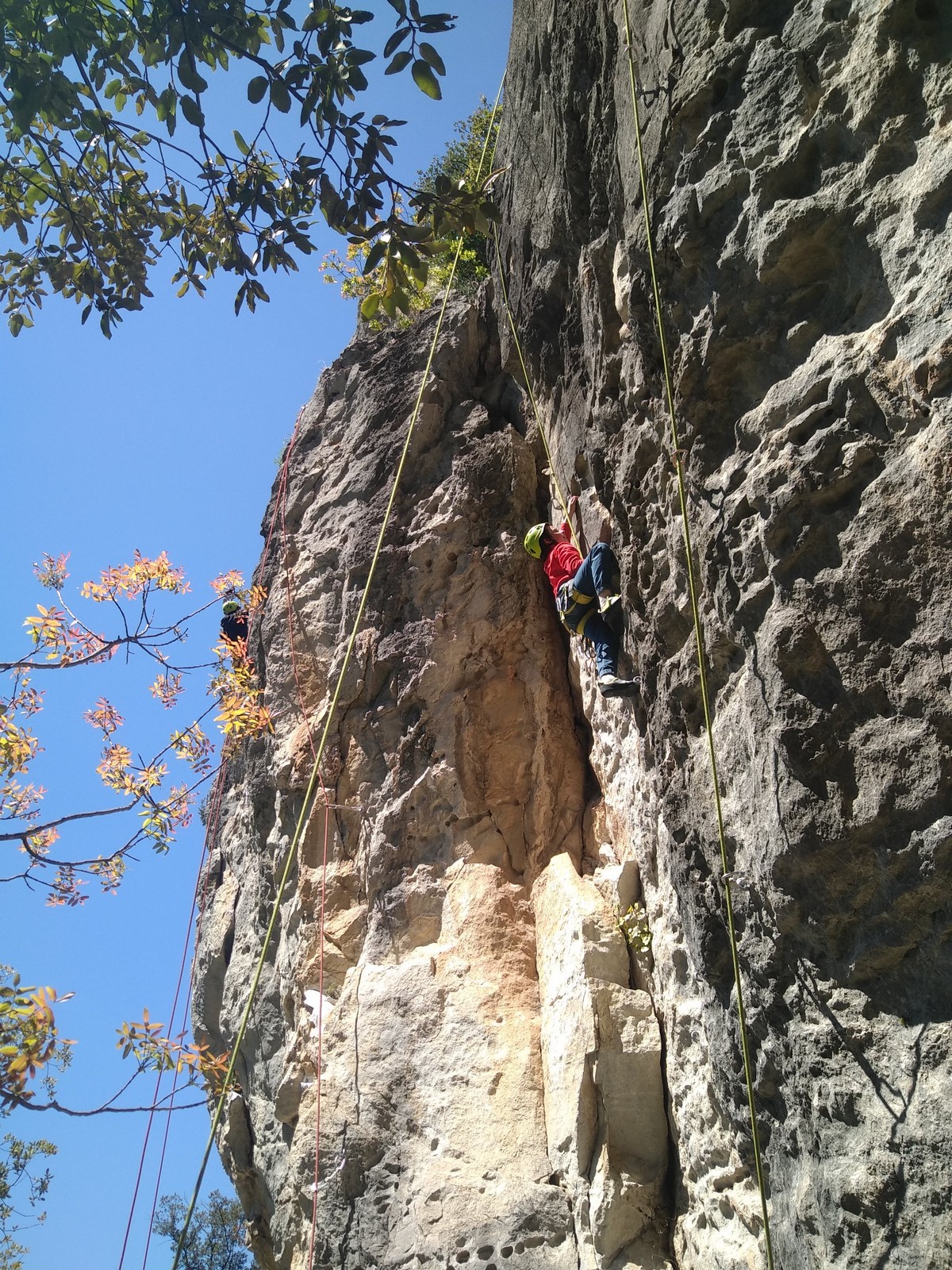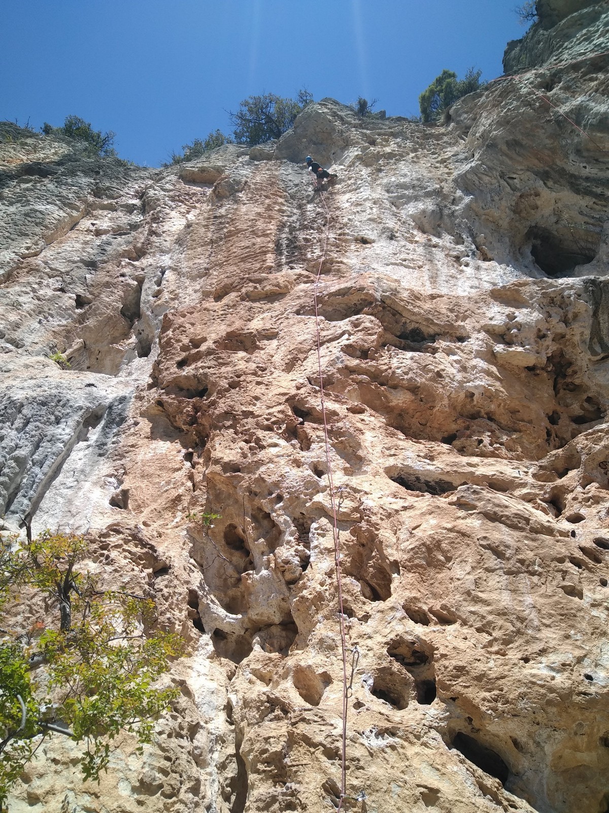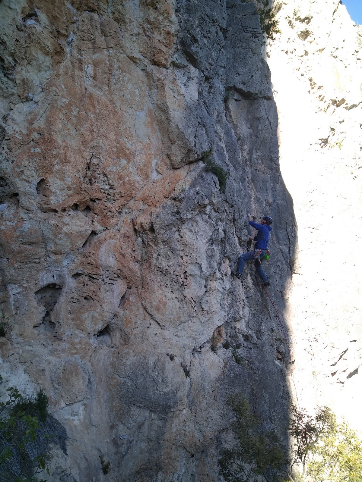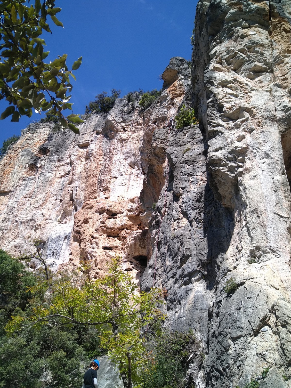 Les matinées se suivent et se ressemblent, je vous laisse donc déduire ce que nous avons ingéré, il faut que j’arrête de faire de la pub pour un produit qui favorise l’obésité et la déforestation sous peine de me faire censurer. À présent nous nous rendons au secteur « Alex » et « Triste tropique », le premier étant un beau mur vertical très sculpté, le deuxième nous offrant des voies plutôt courtes et pêchues. Après une mise en route toujours difficile, l’ensemble des participants trouvent chausson à leur pied. Baptiste avec un regain de motivation parcourt presque autant de mètres d’escalade en une matinée que lors des trois premiers jours. Lilas toujours discrète continue sur sa lancée et confirme sa belle prestation de la semaine avec, en prime, un comportement irréprochable (il ne faut juste pas la taquiner au réveil sous peine d’un regard noir à glacer le sang). Aujourd’hui le mercure s’est élevé et, notamment pour la dégustation de nos sandwichs, nous privilégions les zones ombragées.