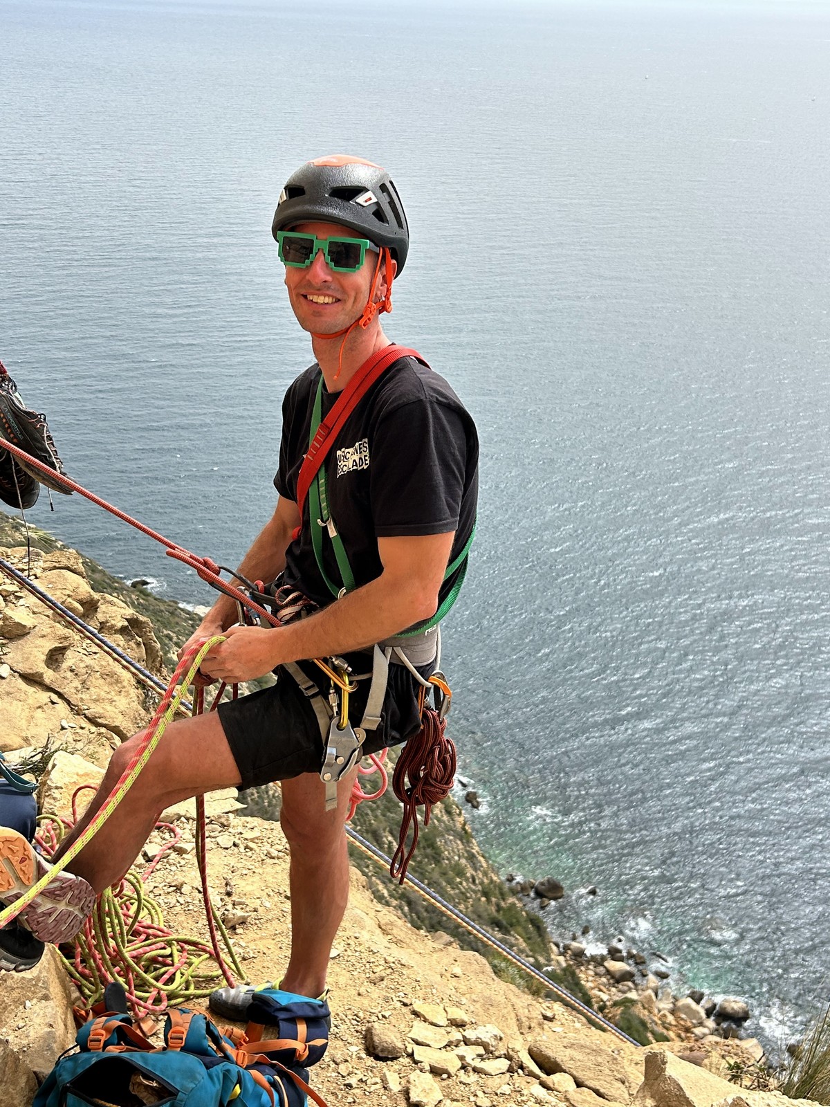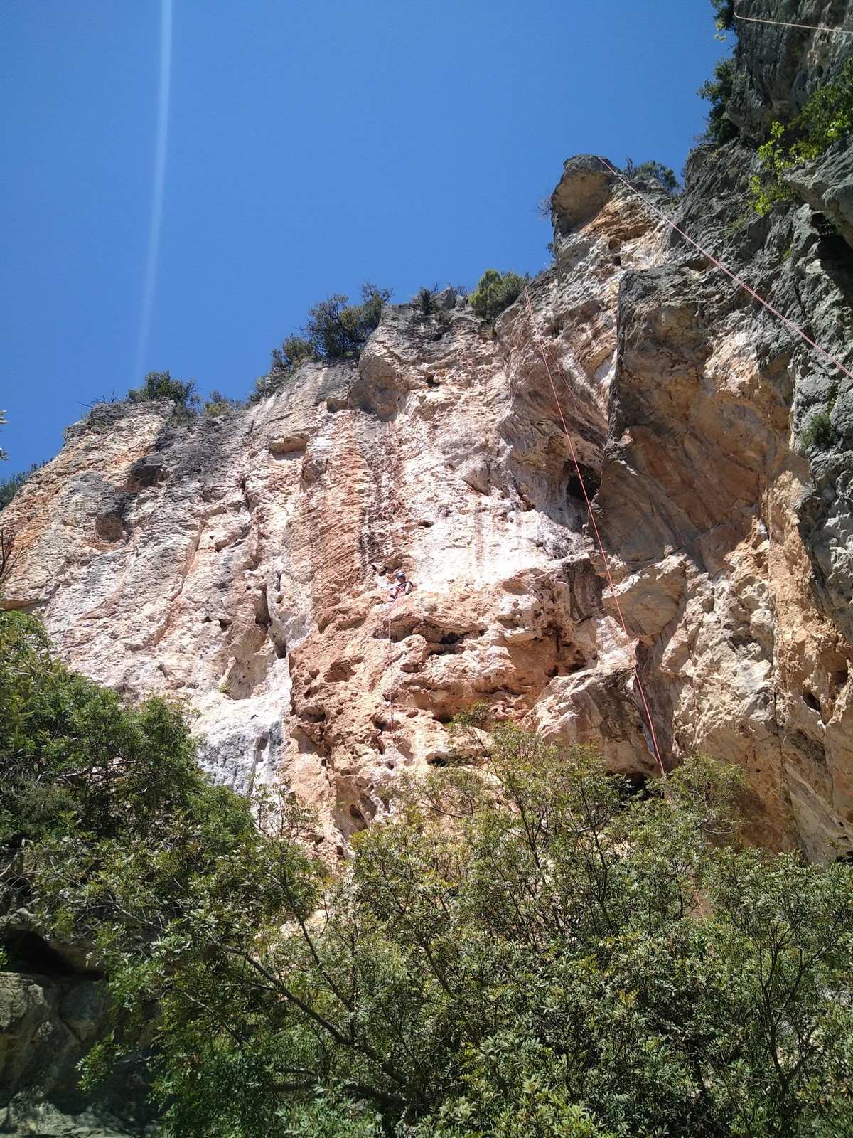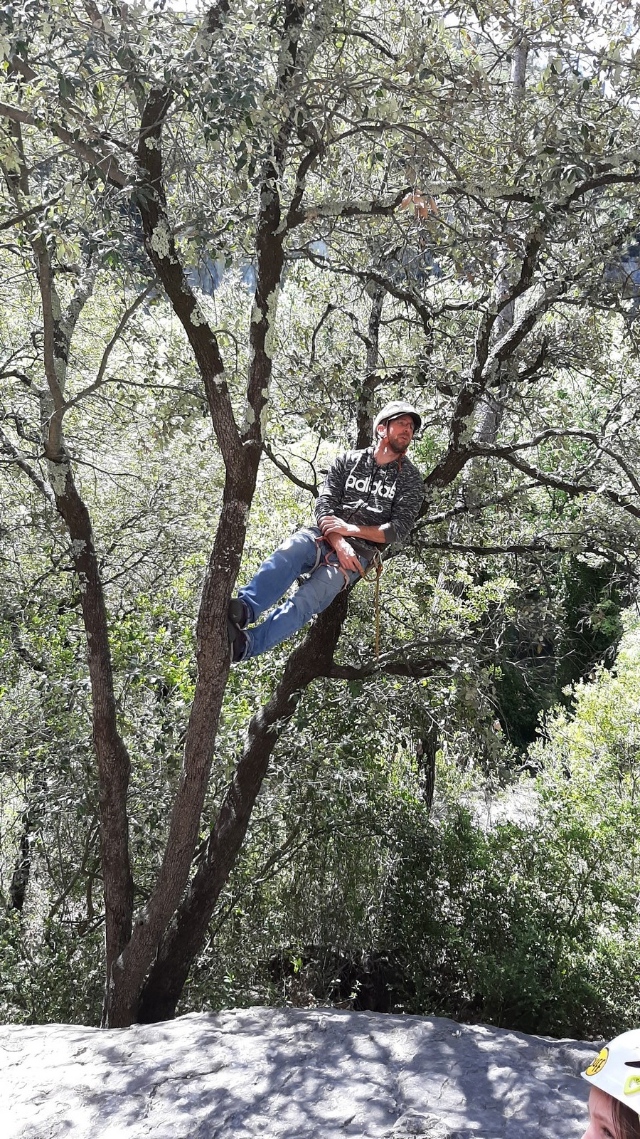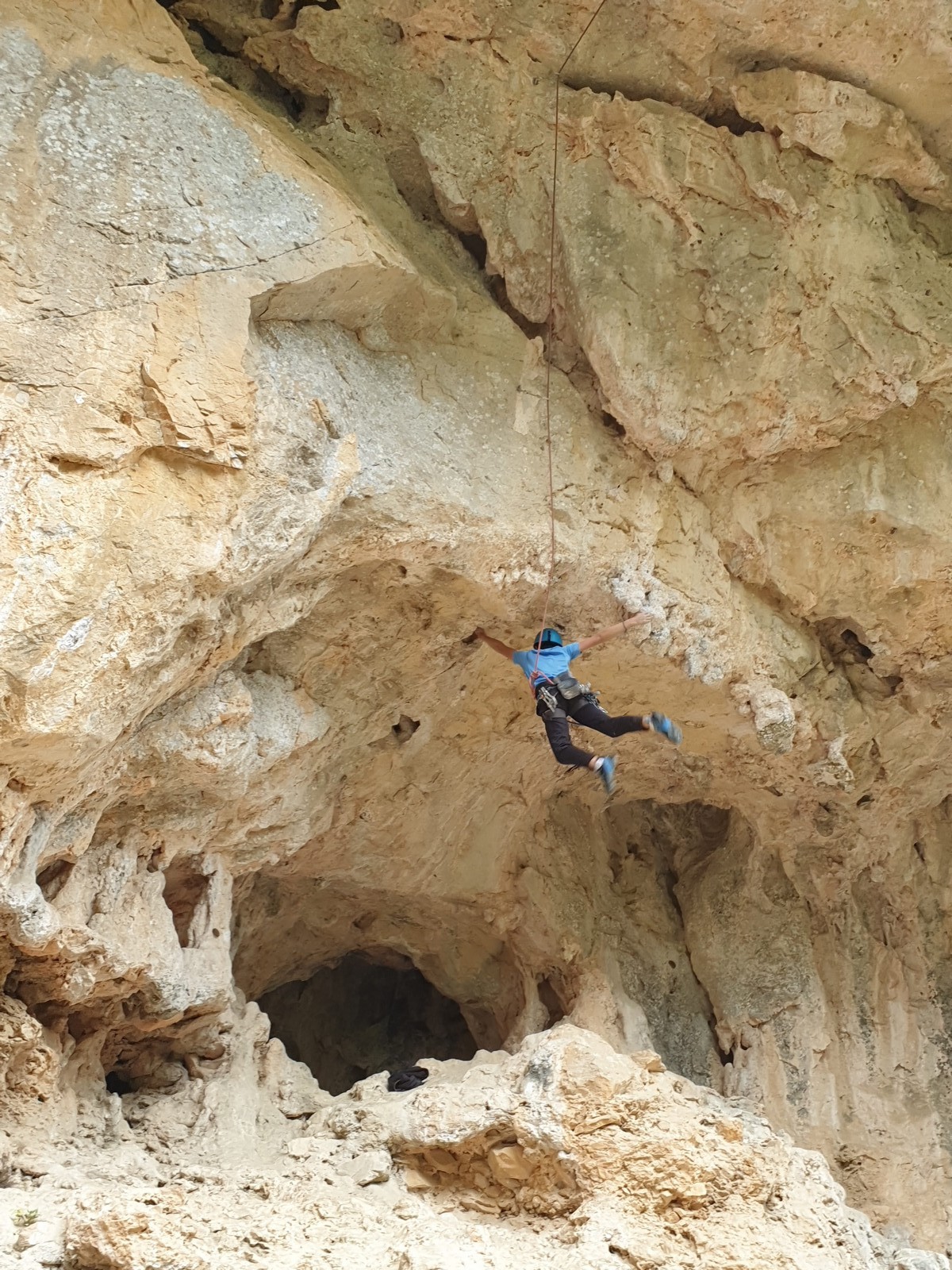 Les matinées se suivent et se ressemblent, je vous laisse donc déduire ce que nous avons ingéré, il faut que j’arrête de faire de la pub pour un produit qui favorise l’obésité et la déforestation sous peine de me faire censurer. À présent nous nous rendons au secteur « Alex » et « Triste tropique », le premier étant un beau mur vertical très sculpté, le deuxième nous offrant des voies plutôt courtes et pêchues. Après une mise en route toujours difficile, l’ensemble des participants trouvent chausson à leur pied. Baptiste avec un regain de motivation parcourt presque autant de mètres d’escalade en une matinée que lors des trois premiers jours. Lilas toujours discrète continue sur sa lancée et confirme sa belle prestation de la semaine avec, en prime, un comportement irréprochable (il ne faut juste pas la taquiner au réveil sous peine d’un regard noir à glacer le sang). Aujourd’hui le mercure s’est élevé et, notamment pour la dégustation de nos sandwichs, nous privilégions les zones ombragées.