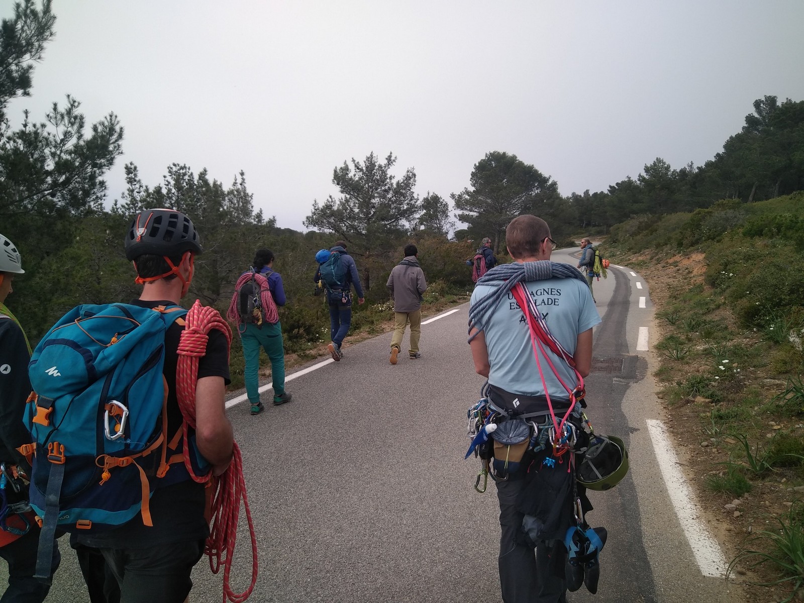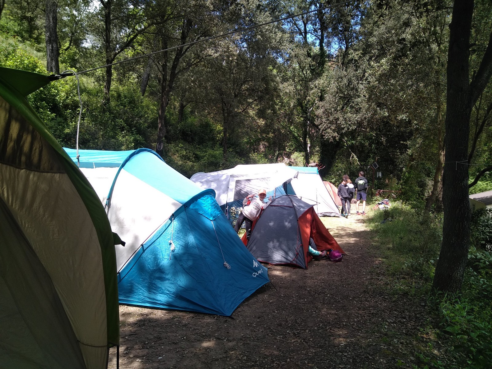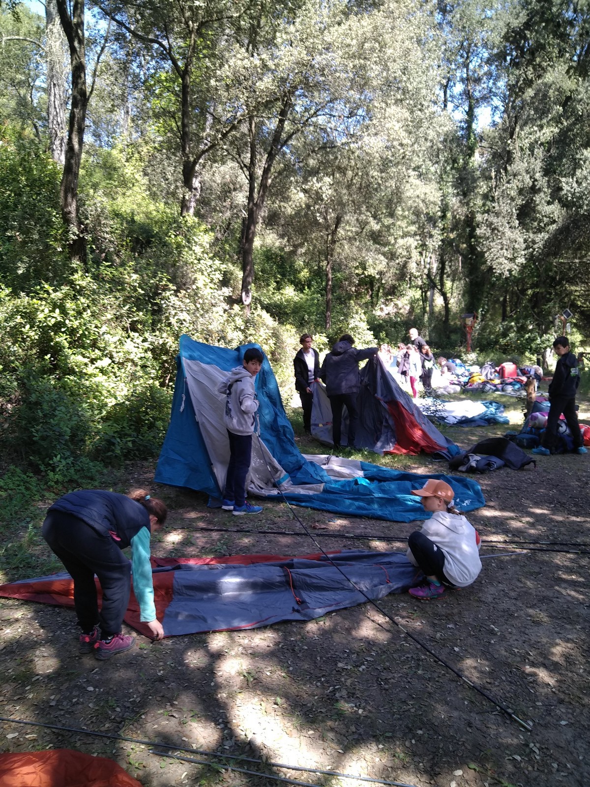 Nous prenons la route pour le camping « Le grand jardin » situé à Correns, à proximité du vallon Sourn, lieu de nos futures aventures verticales. Deux petites heures plus tard, et malgré les égarements de certains, nous sommes réunis au camping. Avant de prendre la direction de la falaise, une tâche indispensable nous fait face : installer le campement ! Ce sont 8 tentes à monter, une vingtaine de matelas à gonfler sans oublier le barnum qui nous permettra de manger sans être exposé aux quatre vents et de nous protéger d’une éventuelle pluie. On joue une nouvelle fois à Tetris pour faire rentrer toues les tentes dans l’espace qui nous est alloué puis chacun organise son coin. Les plus petites tentes sont montées rapidement, mais les plus grandes prennent un peu de temps. C’est dans l’entraide que notre campement s’organise et en moins de 2h, tout est monté et c’est l’heure du premier repas sous le barnum. Chacun avale son sandwich avant de préparer ses affaires pour la première sortie escalade.