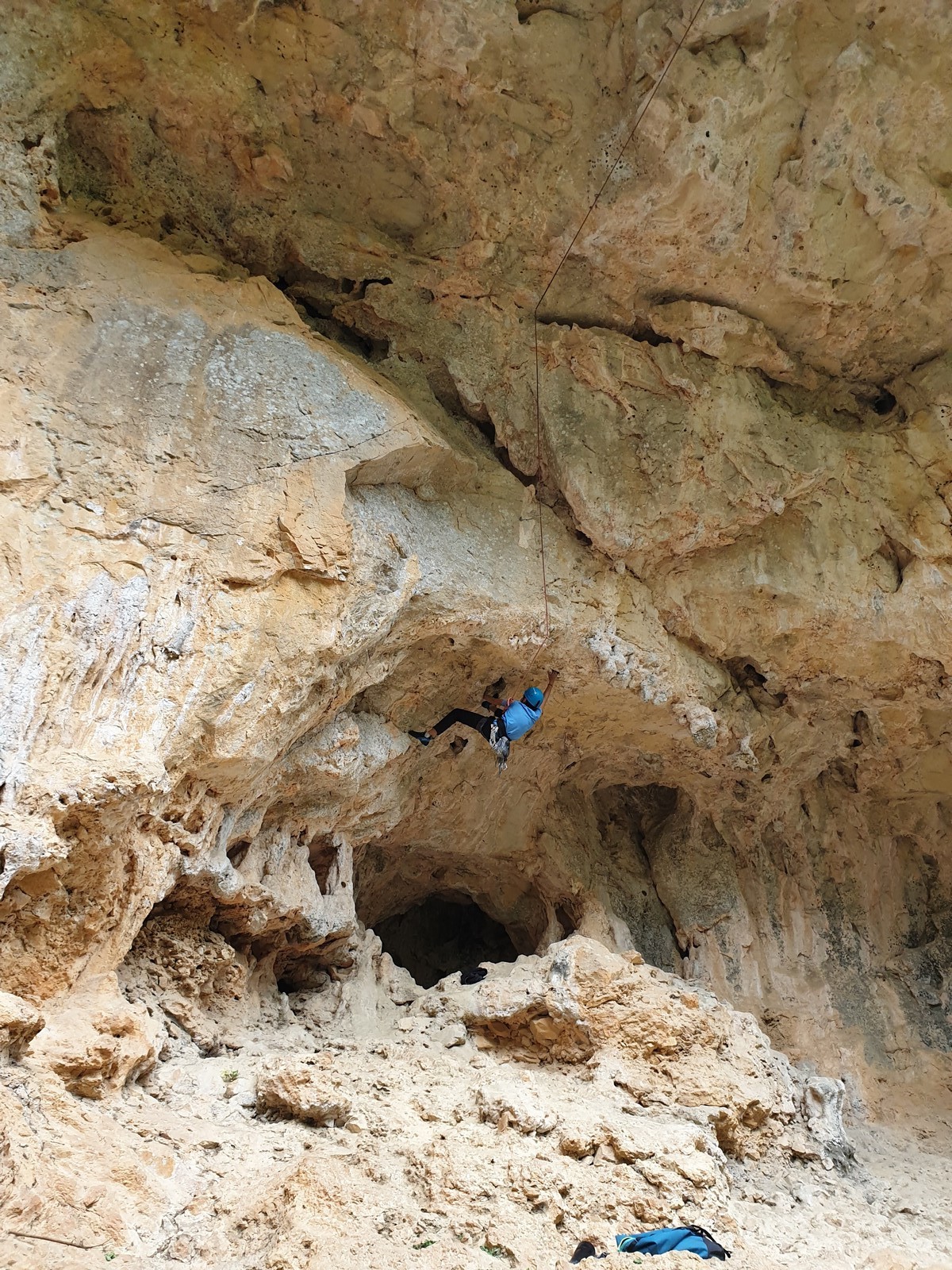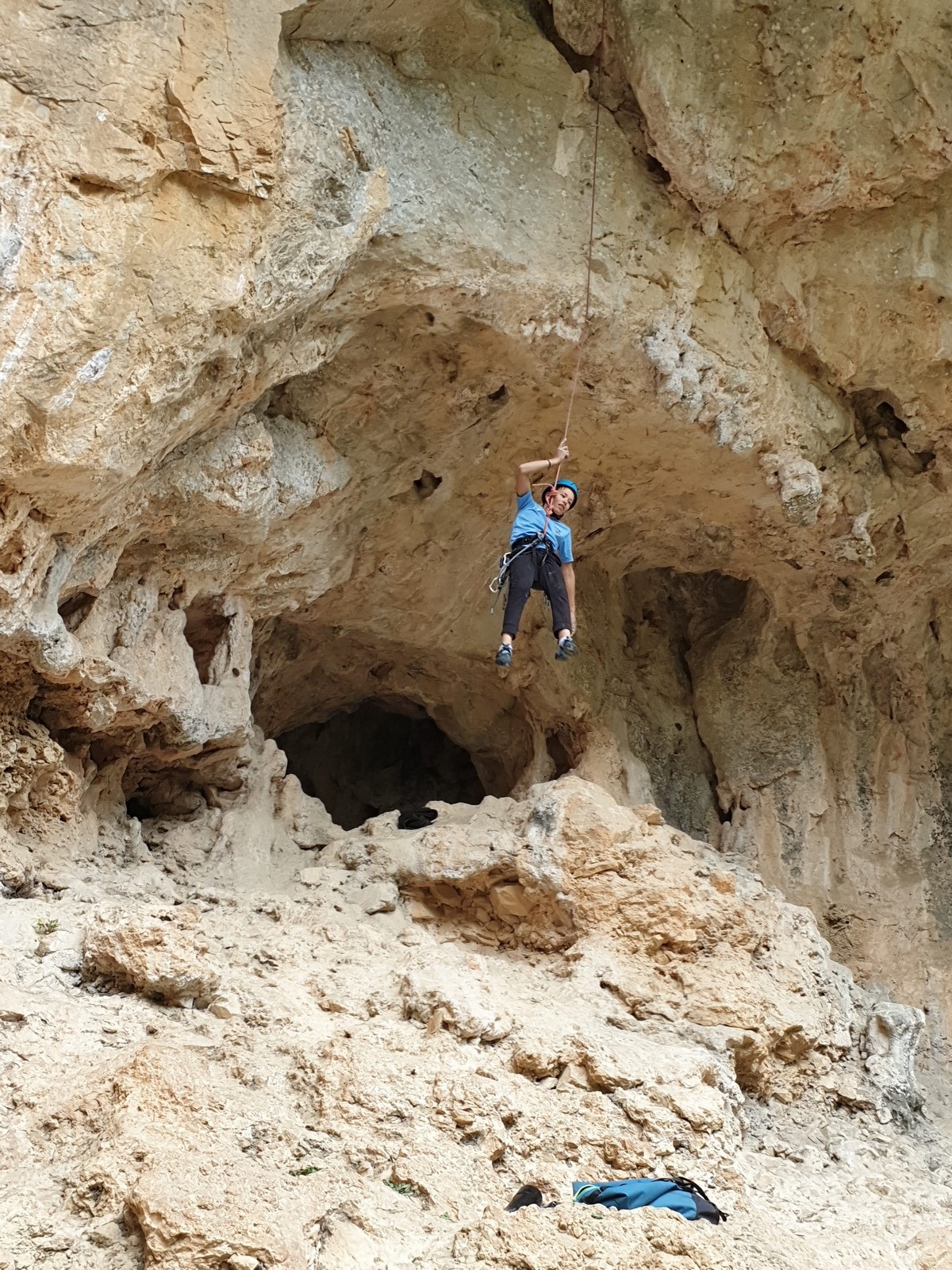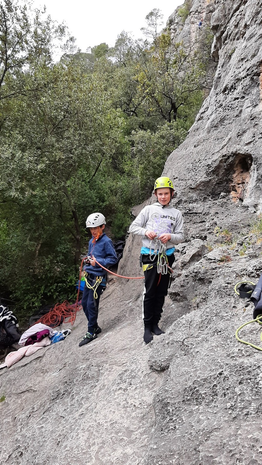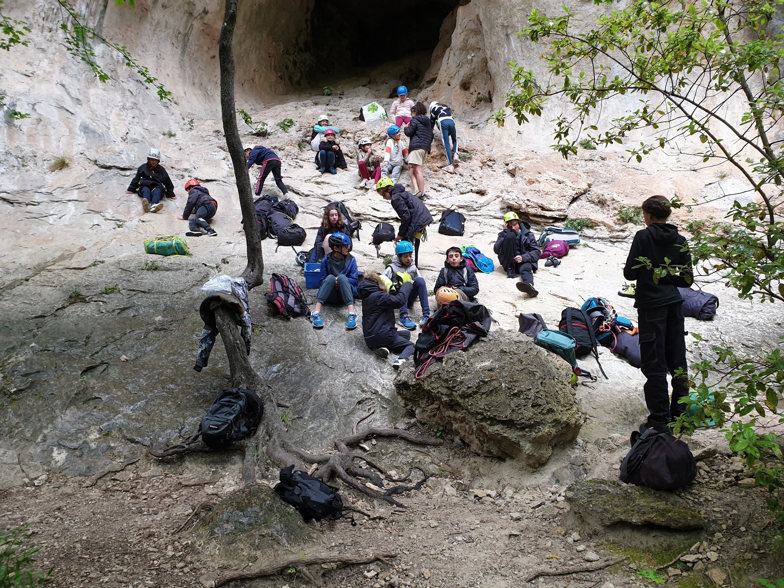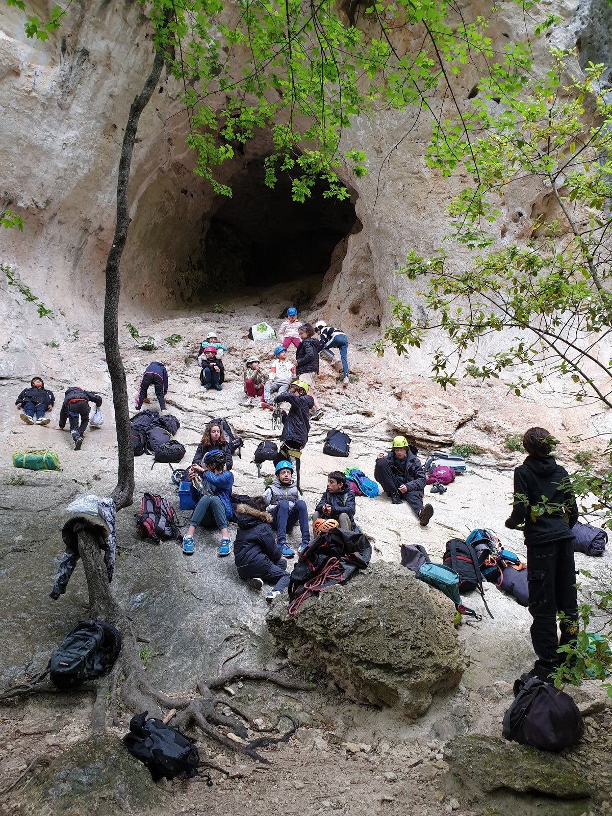 La pause déjeuner est sifflée, chacun à enfin le droit de croquer dans son sandwich. Dans l’après-midi c’est la cordée « Milo-Mateo » qui impressionne, à mon souvenir ils parcourent 7 longueurs chacun et cumulent 200 mètres d’escalade par tête. Bravo les garçons pour votre motivation, vous avez grimpé l’équivalent du Baou de Saint Jeannet ! La détermination d’Alaric fait également plaisir à voir, il ne recule devant rien et ne se laisse intimider par aucune difficulté. Un petit groupe se détache pour se rendre dans une grotte dans laquelle quelques lignes majeures sont équipées. Aujourd’hui c’est Léane qui fait parler les biceps en réalisant au 3ème essai » Les éléments ne font pas de cadeau », un 7b+ physique et dément. Mathis l’ayant enchaîné à vue, il voulait sur les conseils de Sylvain aller voir la superbe ligne en toit de Power, un 7b+ atypique, mais un panneau indiquant un nid de chouette dans la voie lui fait oublier le projet. Il ira se frotter au terrible 7c « Hermine trou trou » où plusieurs montées avec son coach seront nécessaires pour simplement défricher les méthodes. Lia, de son côté, enchaîne un joli 6b sur la droite du secteur. En fin de journée Esteban C, resté au secteur initial mettra quelques essais pour enchaîner le fameux 7a mais rien n’y fera, la fatigue ainsi que la pluie semblent avoir pris le dessus. Effectivement le rangement des dernières cordes s’effectue sous une petite averse et c’est encore Esteban C qui s’y colle pendant que le reste du groupe vient d’abriter dans la grotte de Power. Sylvain effectue un premier aller-retour avec le groupe des filles et François qui a pour mission de faire doucher tout le monde.
