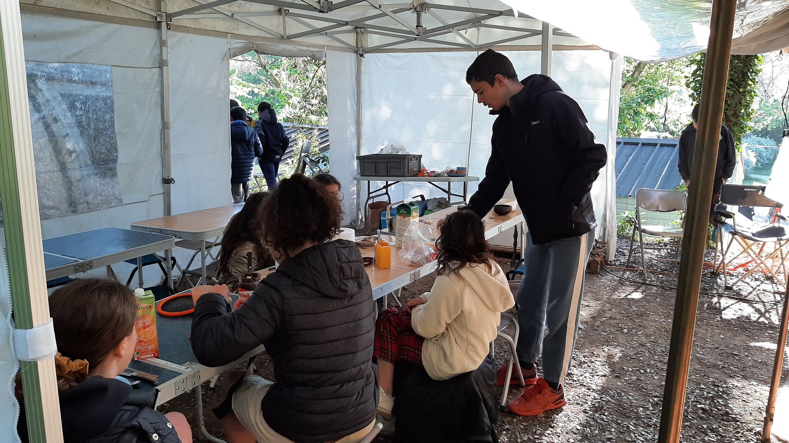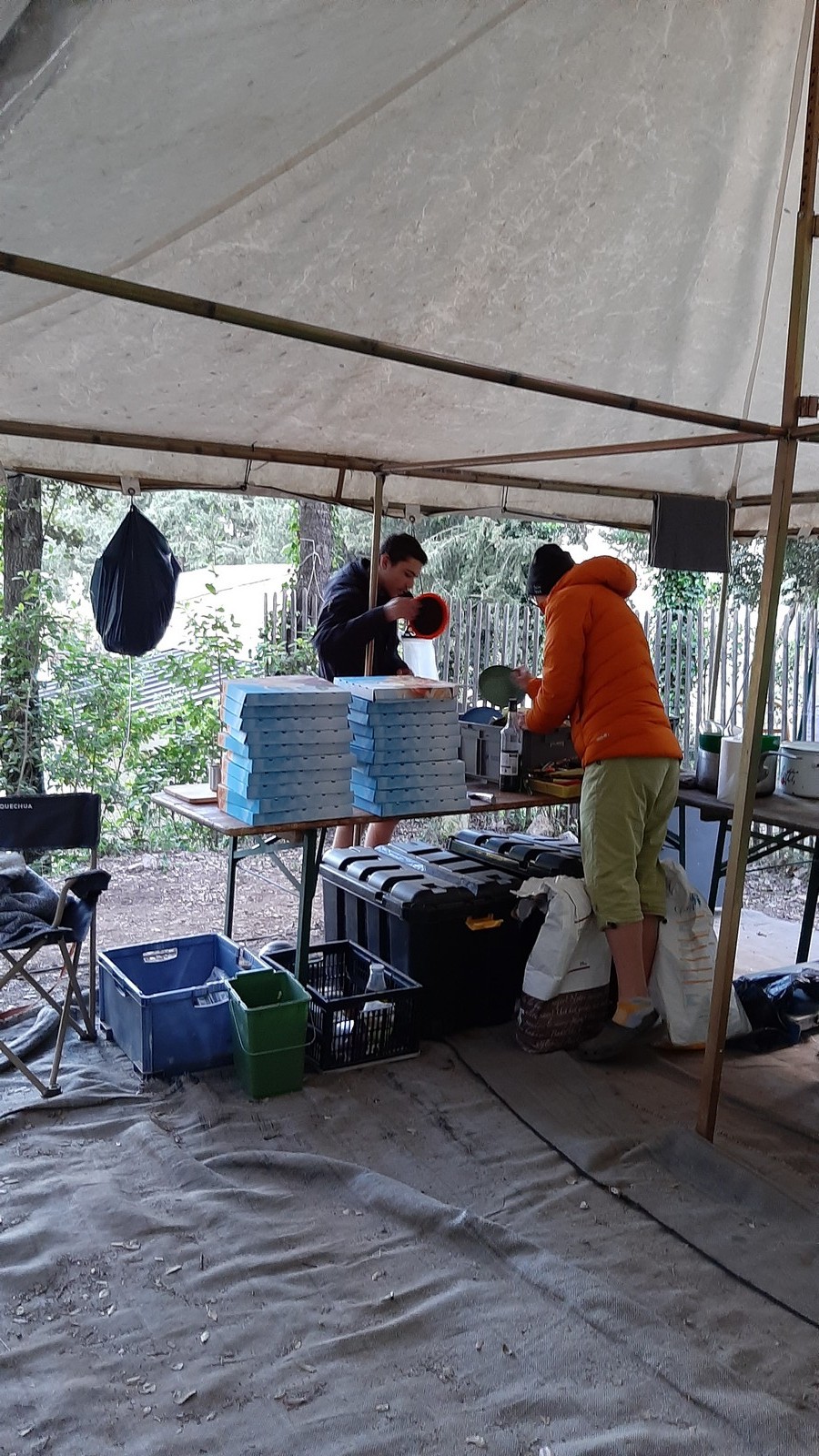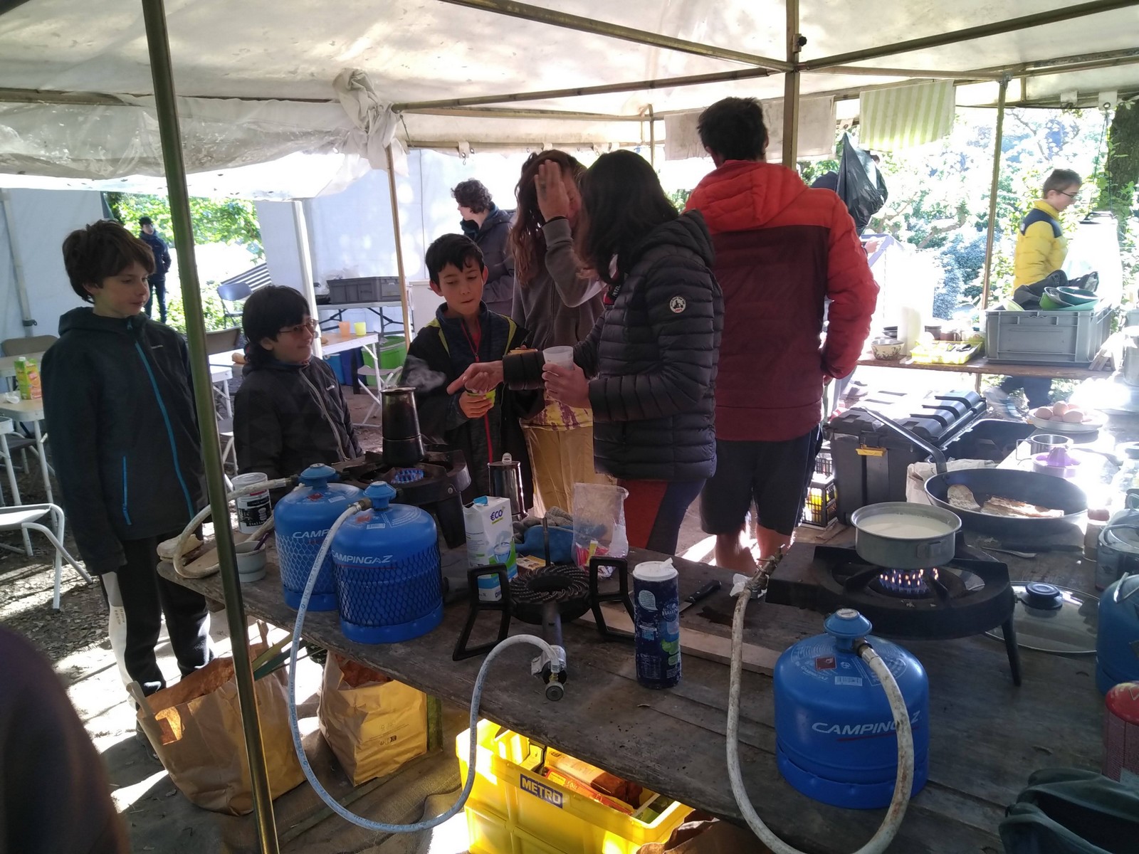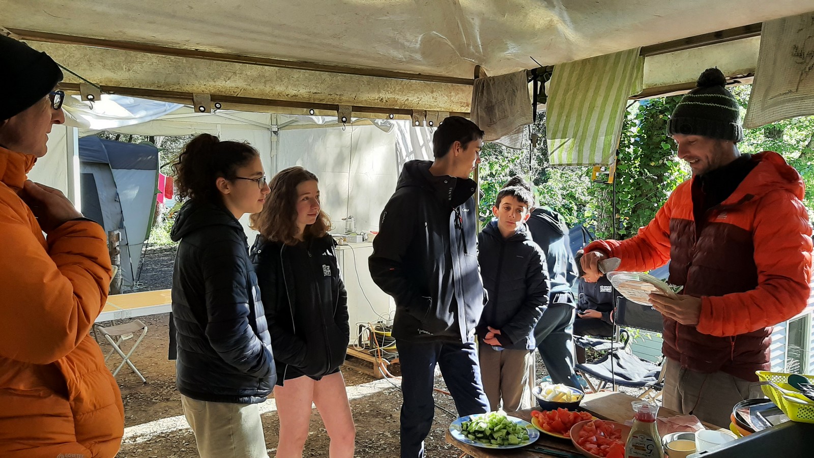 Le temps que chacun passe à la douche, certains ont la possibilité d’un petit foot ou d’une partie de badmindton mais l’heure du repas arrive rapidement. Au menu de ce soir c’est pâtes à la bolo, un grand classique adoré des enfants. Donna et Angela sont les chefs cuistots et elles nous font profiter de leurs expériences certaines en matière de cuisine collective, jeunes et moins jeunes se régalent et pas une once de nourriture ne sera gaspillée. L’obscurité s’est installée et nous signale que le temps est désormais au repos. Chacun va retrouver son duvet puis le camping s’apaise rapidement.