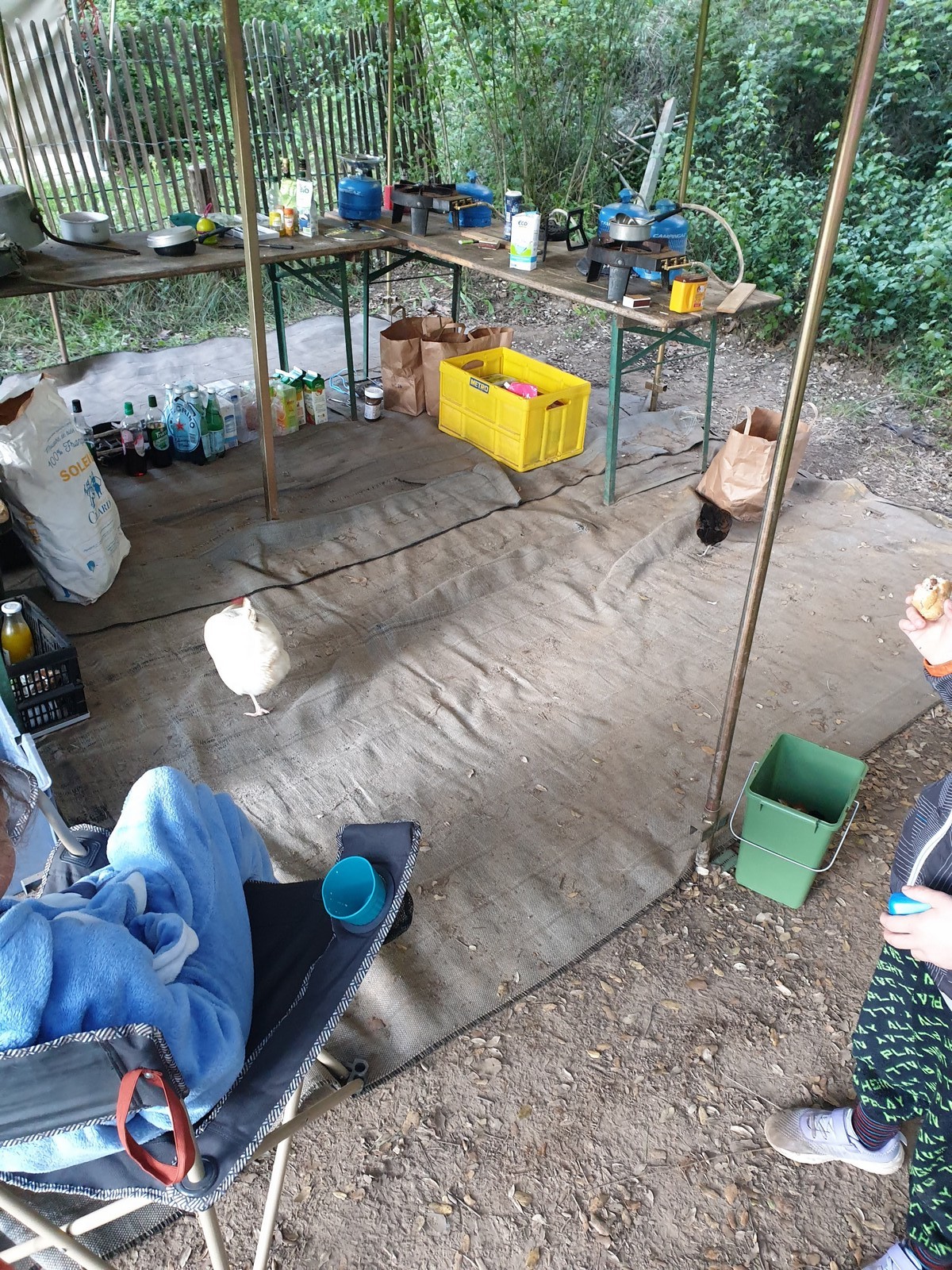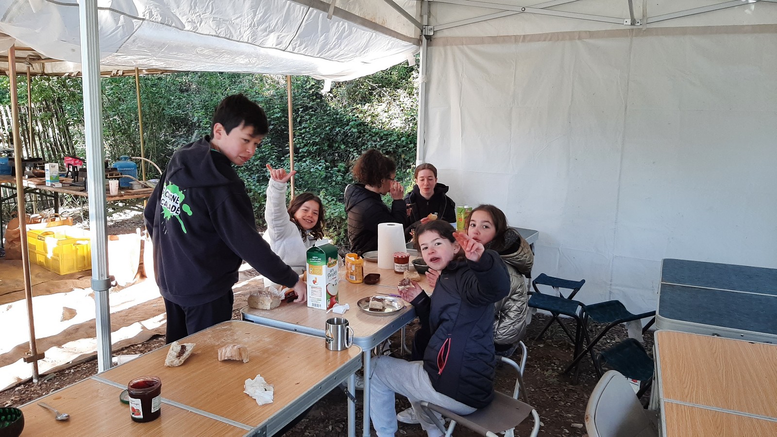 La journée s’achève ainsi et comme tous les soirs nous nous retrouvons au complet entre les tentes, le coin cuisine, les douches et le stade de foot. Le dîner du soir laisse un peu moins rêveur que les jours précédents, au menu graine de couscous accompagné de ces knackis sur son lit de ratatouille en boîte qui, au grand désespoir de Cyril, ne contient que très peu de fibres… Cependant nos cuisinières désormais renommées, à coup de petites astuces de chefs étoilés, agrémentent le tout et rendent le repas comestible et le moment convivial. Ce soir les enfants sont ravis, c’est enfin le moment du très attendu jeu du « Loup garou », un jeu de rôle grandeur nature dans lequel l’objectif est de…tuer tout le monde. Le clocher sonne les 22h, le moment d’aller faire un câlin à son oreiller.