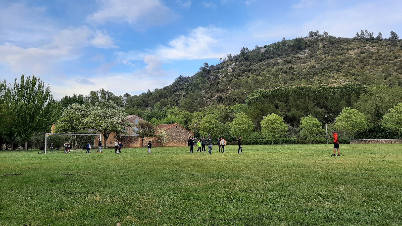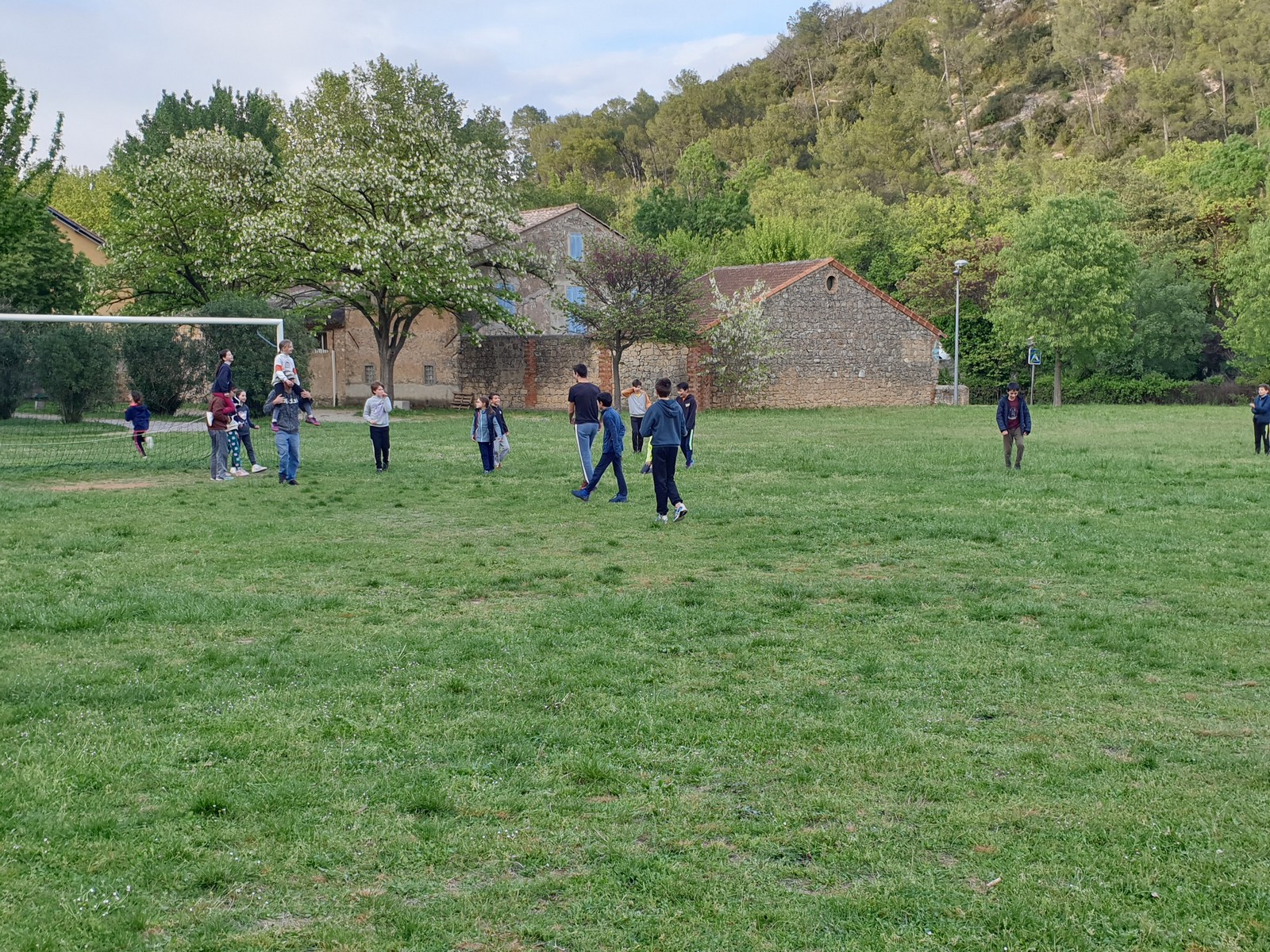 Quelques instants plus tard nous voilà tous réunis au camping. Le ciel s’étant éclaircit, Boris, qui dort pas loin avec ses parents, nous rejoint et un bon nombre d’entre nous allons revisiter les règles du football dans un match endiablé qui se terminera par l’injuste » But en or ». Le jour décline et nous nous retrouvons tous autour d’un poulet au curry d’exception. On dit merci qui ? Merci les cuisiniers !! Ce soir encore rien ne restera. Alors que l’on vantait les douches pour leur confort et leurs eaux chaudes supposées inépuisable, ce soir Dona et Sylvain font les frais des trop longues cures thermales de certains. L’heure est au couchage et l’état de santé d’Anaïs nous inquiète mais Dona, en bonne ex-infirmière, gère comme une pro et notre petite malade passera une bonne nuit pour être en pleine forme dès le lendemain matin.