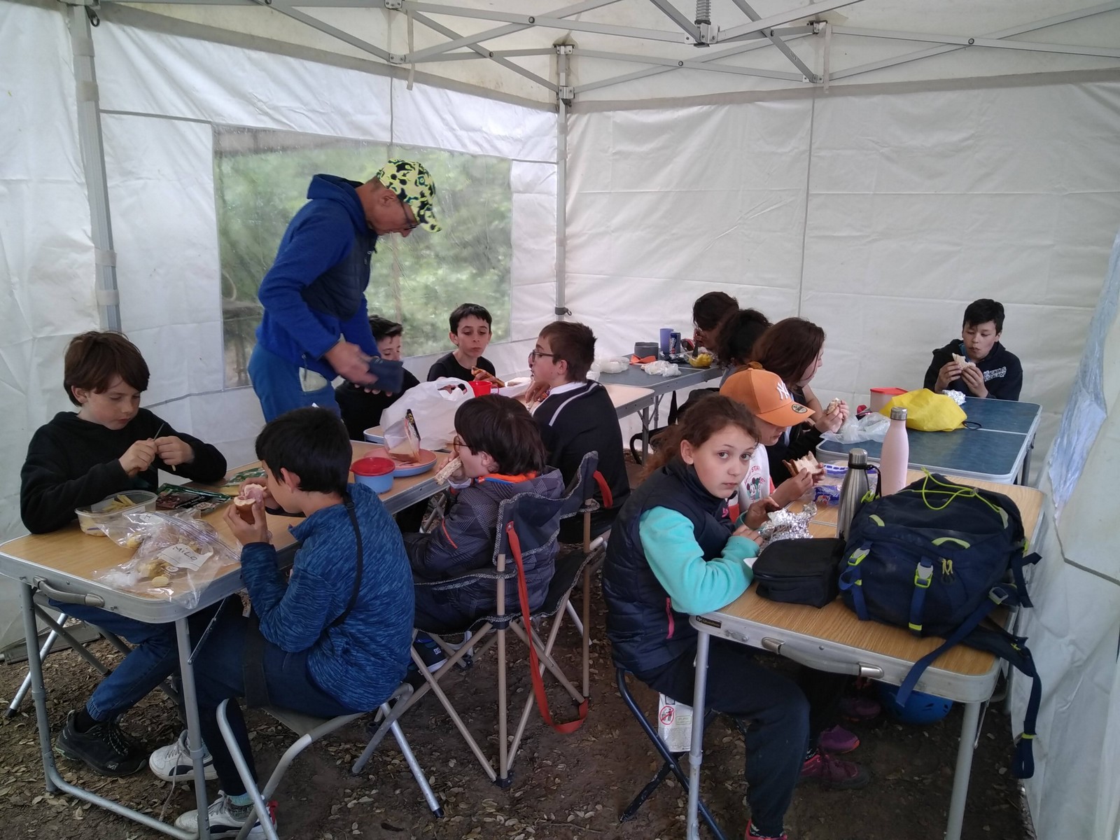 Le dernier matin, les nuages ont pris le dessus cependant, avant qu’ils ne s’épanchent, ils nous laissent le laps de temps nécessaire au rangement des tapis, tentes et duvets. La menace de la pluie faisant son effet, seul le barnum sera plié mouillé avant d’être sanglé sur le toit du Berlingo d’Angela ! Tous les sacs et caisses sont dans les voitures. Nous rassemblons une dernière fois tout le monde pour dire aurevoir à ceux qui repartent avec leurs parents et féliciter pour leur comportement quasi exemplaire. Puis chacun prend sa place dans un véhicule. On fera un stop sur une aire d’autoroute pour manger le dernier sandwichs et les restes de pizzas avant d’arriver pour 14h15 à Cagnes-sur-Mer où tous les parents ont pu se libérer pour récupérer les enfants. Merci pour ça, ça nous a laissé le temps de ranger le matériel et d’aller rendre le minibus sans finir trop tard !
