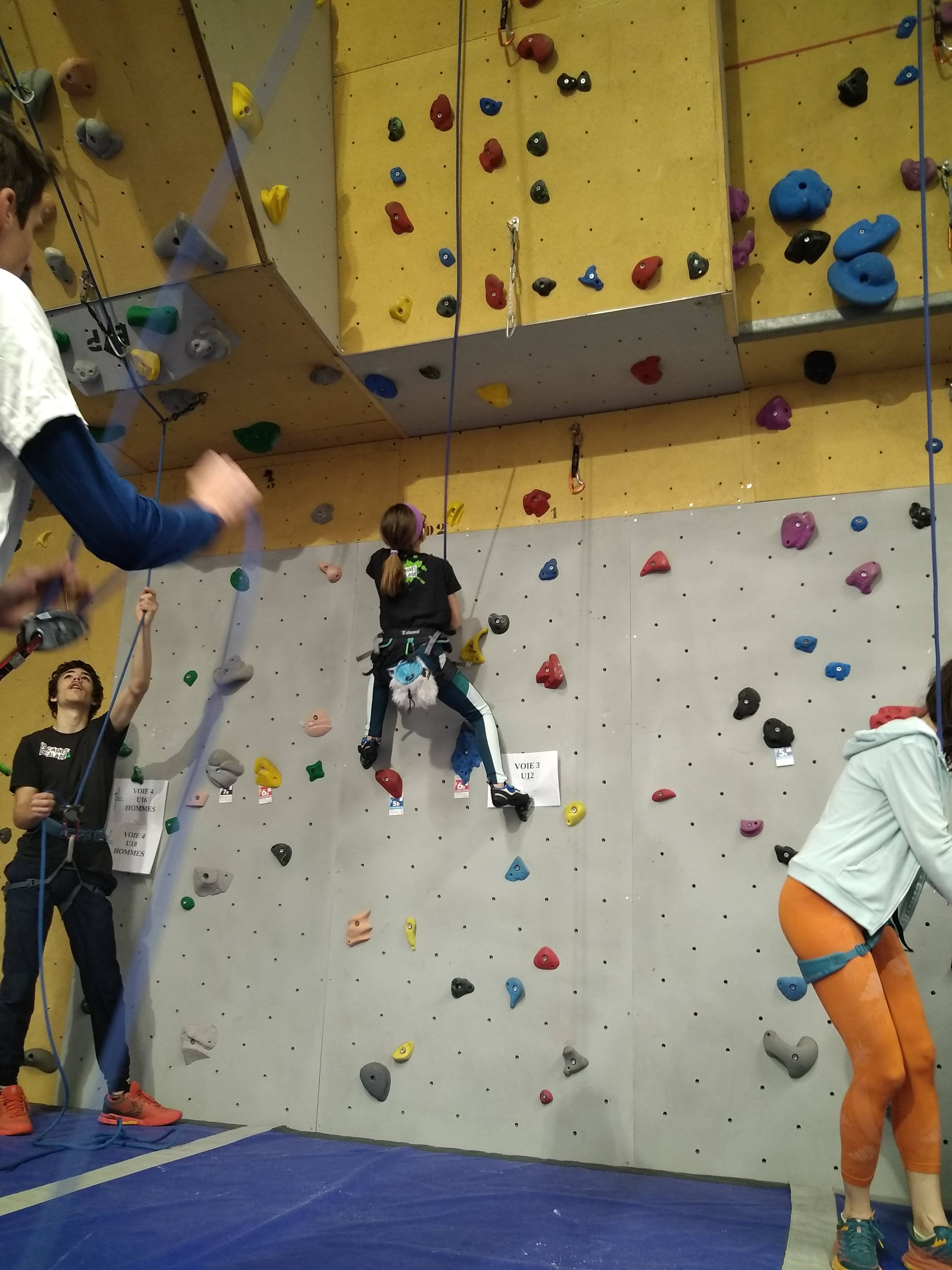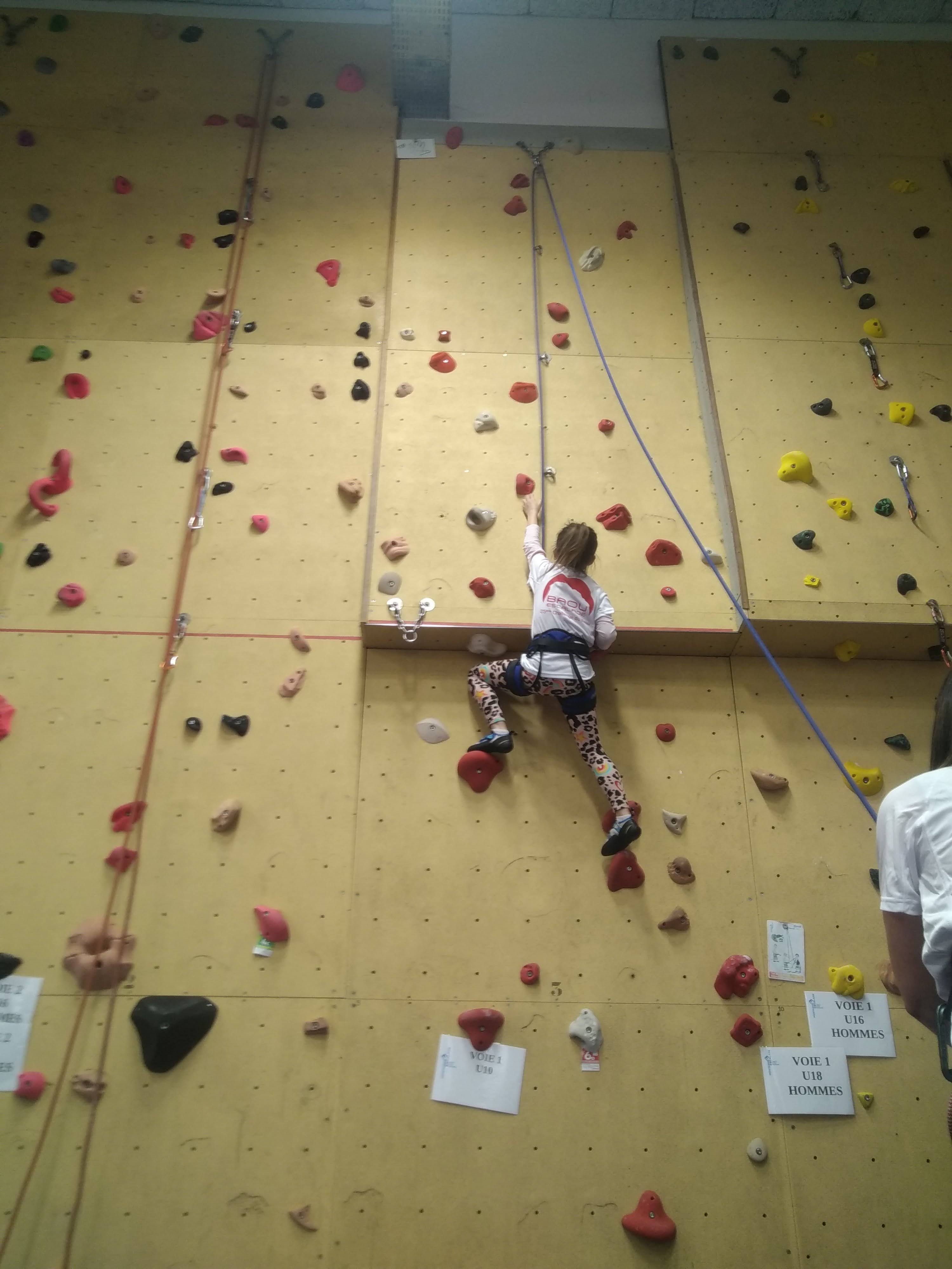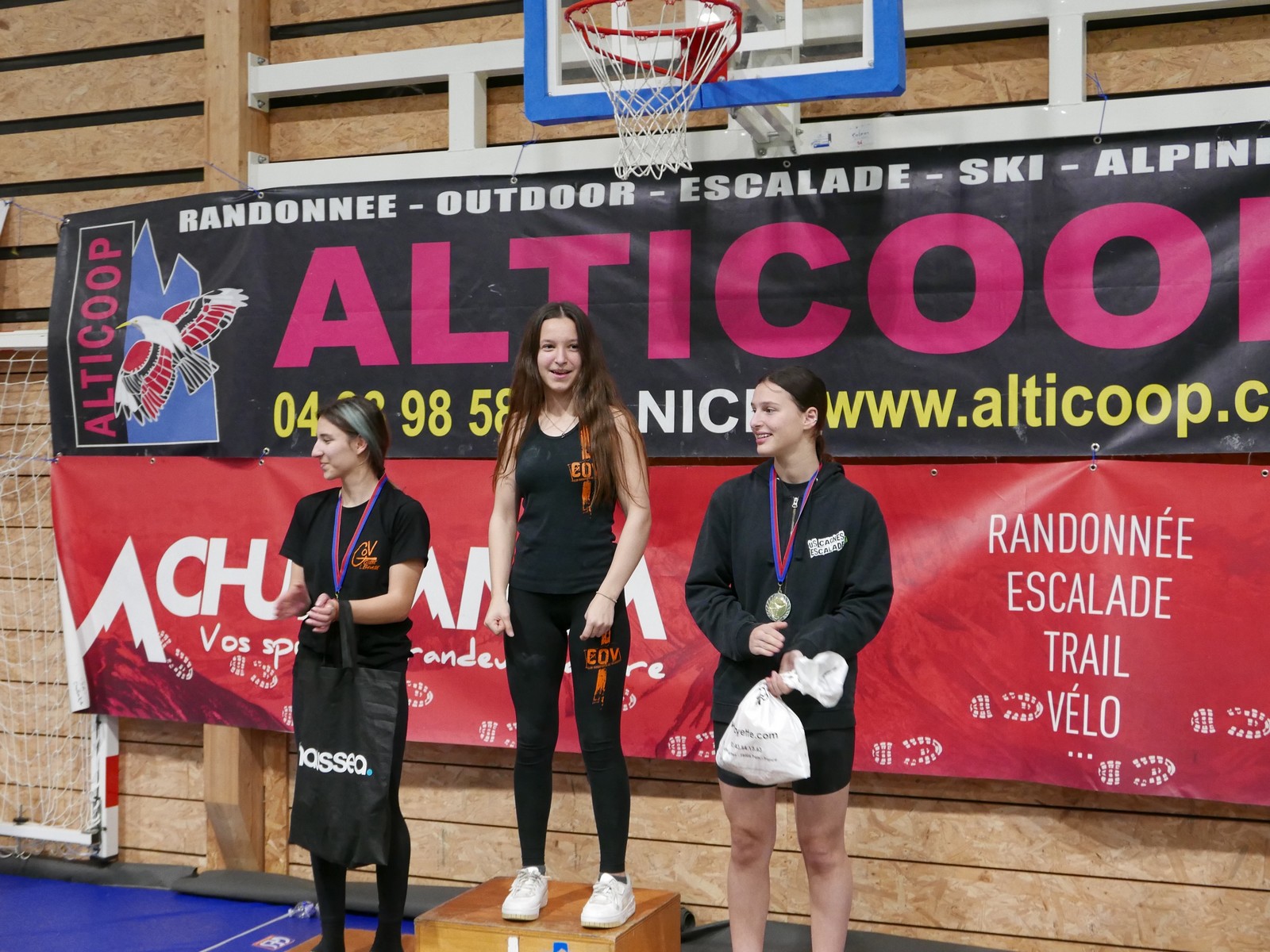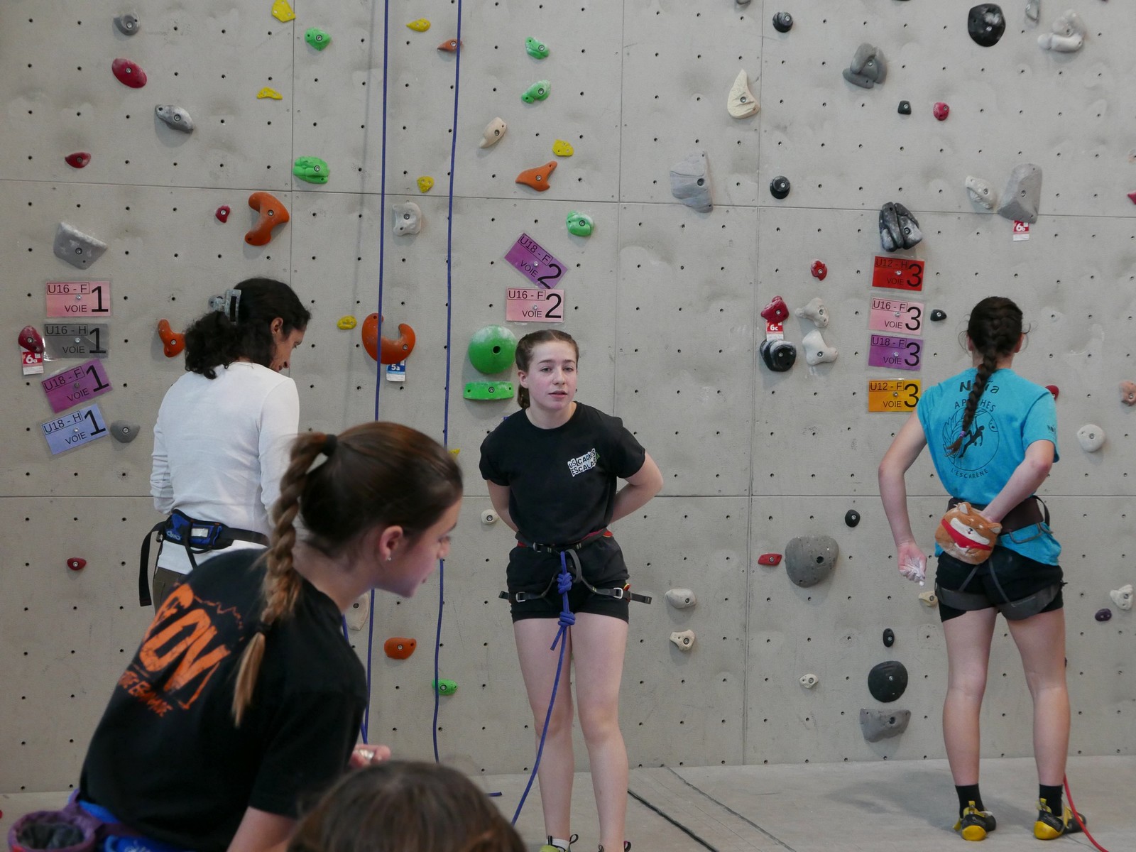 En U18F, catégorie un peu délaissée par les jeunes et vaguement invisibilisée par l’absence même de pancartes au départ de leurs voies, Elisa du COV remporte sans surprise la médaille d’or, devant une Endy qui s’est bien battue dans le dévers et dans le toit et qui progresse de jours en jours avec son appréhension de la chute. Reste à mettre un peu de rythme et de confiance et elle ira taquiner Elisa !