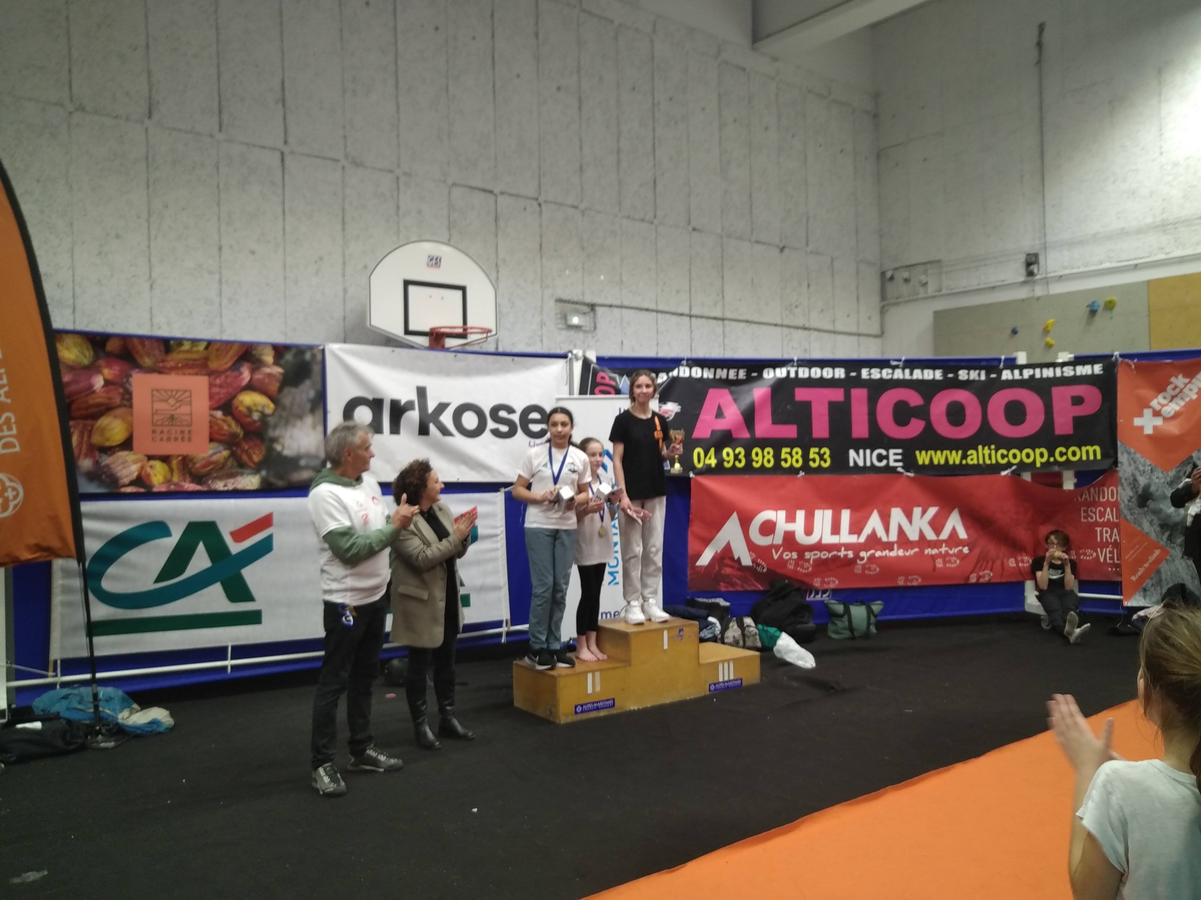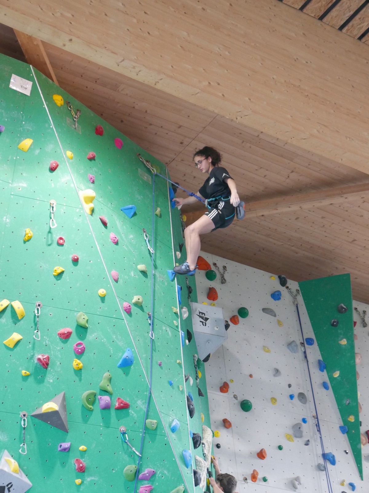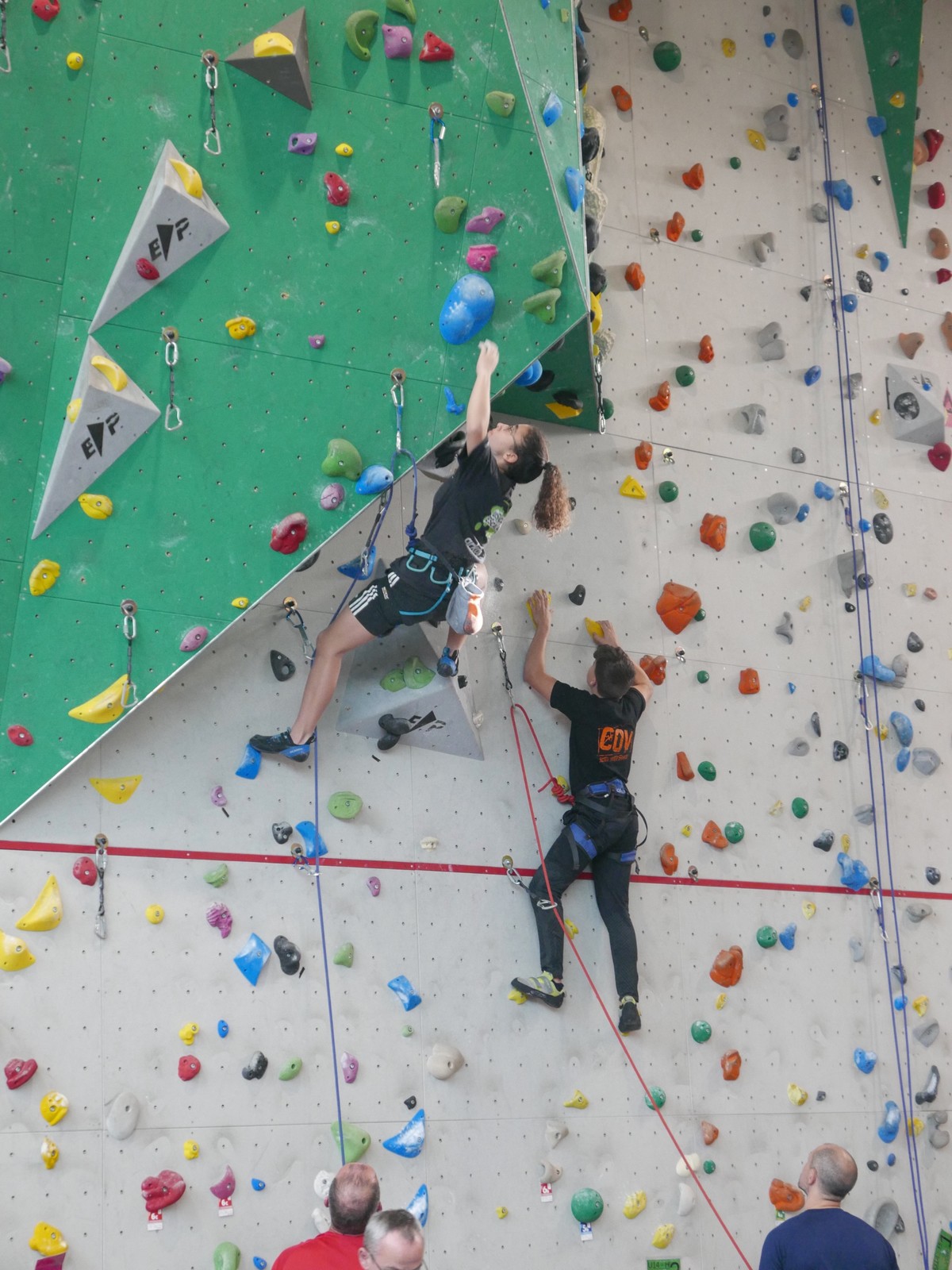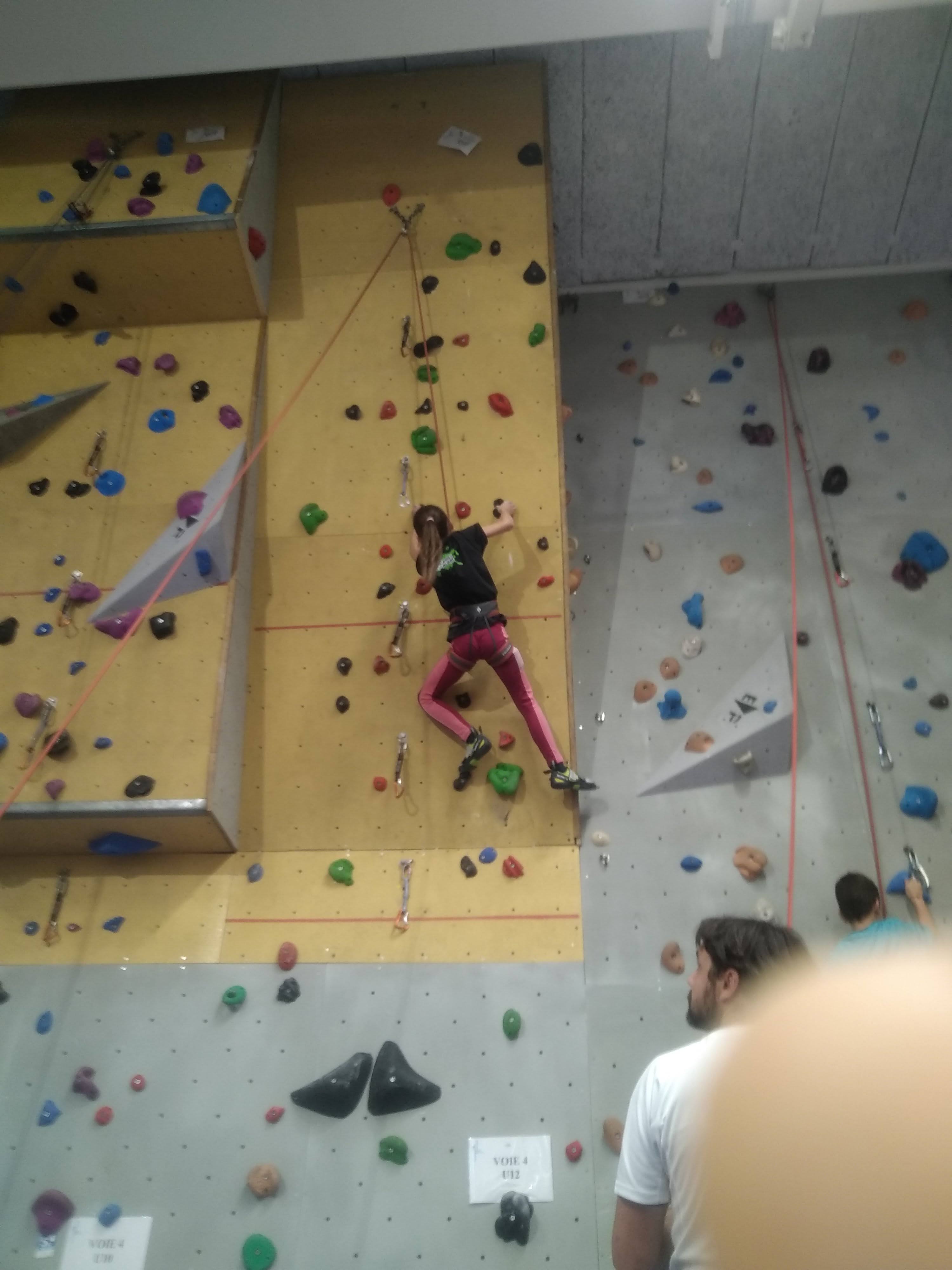 En U18F, catégorie un peu délaissée par les jeunes et vaguement invisibilisée par l’absence même de pancartes au départ de leurs voies, Elisa du COV remporte sans surprise la médaille d’or, devant une Endy qui s’est bien battue dans le dévers et dans le toit et qui progresse de jours en jours avec son appréhension de la chute. Reste à mettre un peu de rythme et de confiance et elle ira taquiner Elisa !