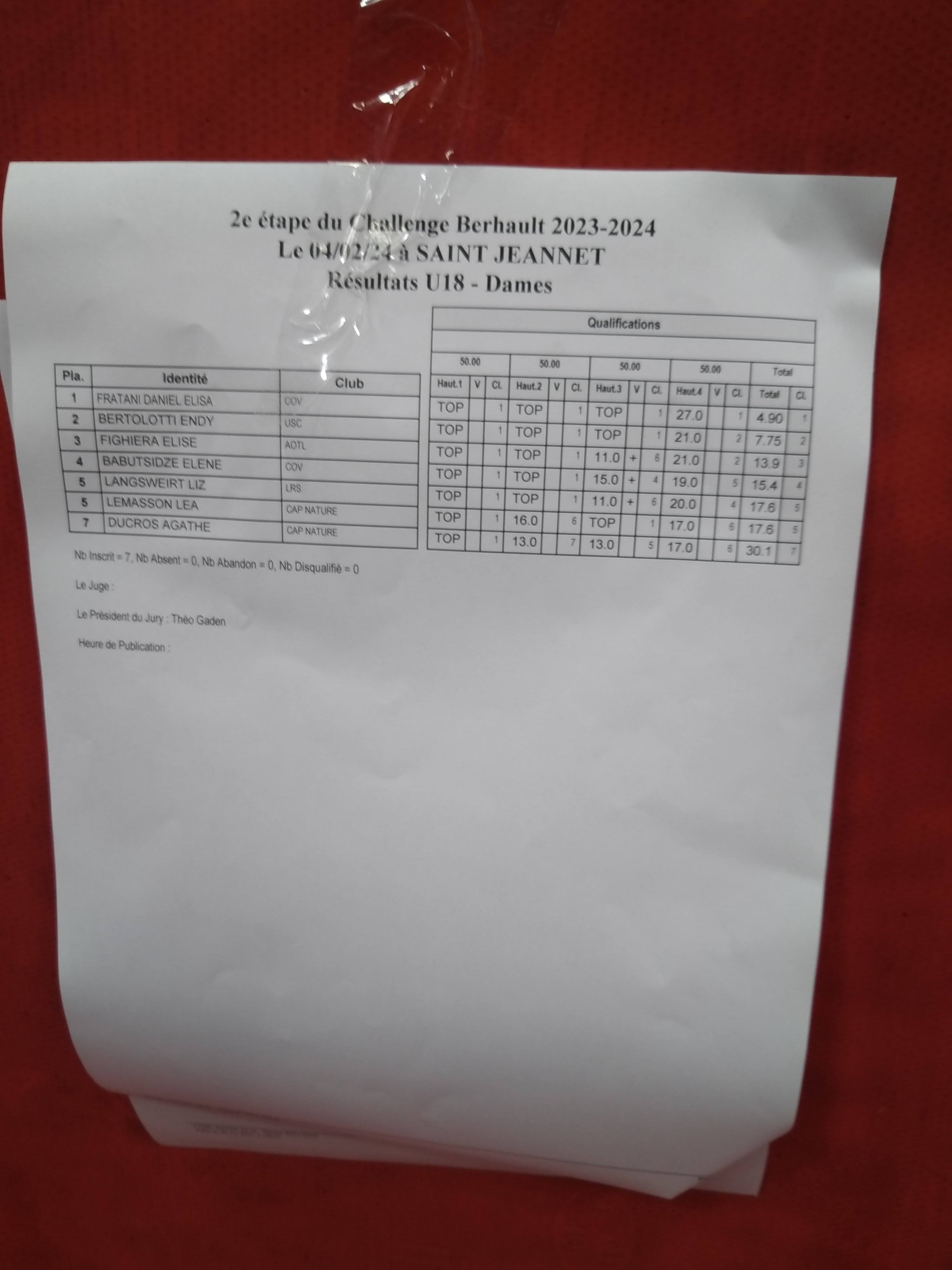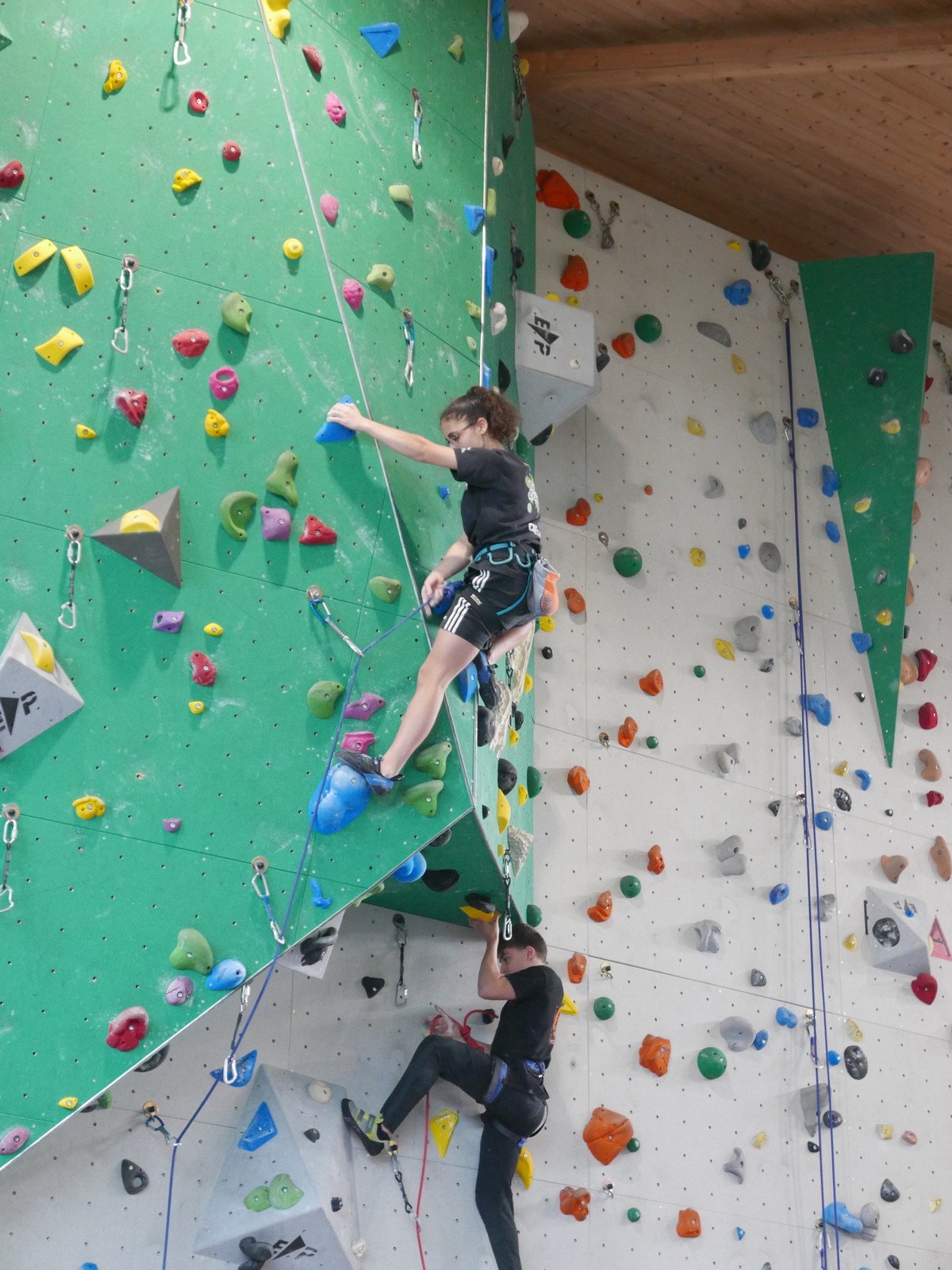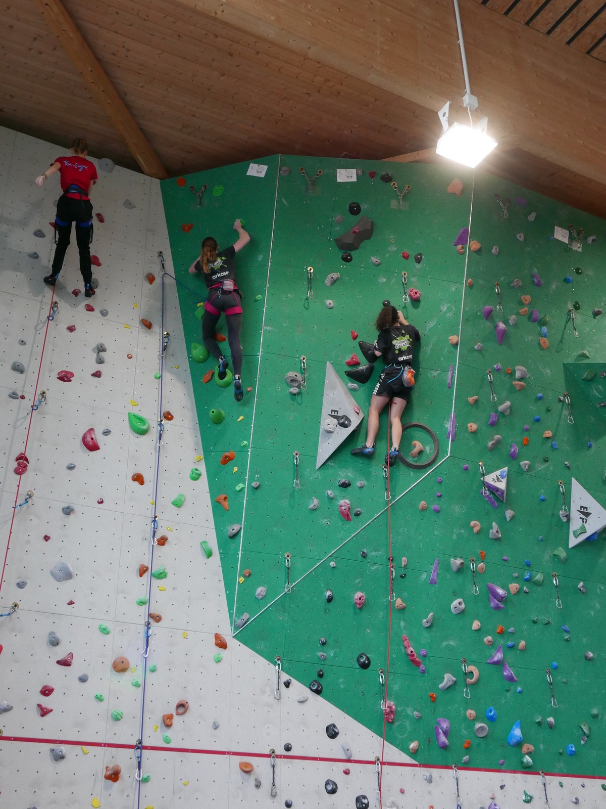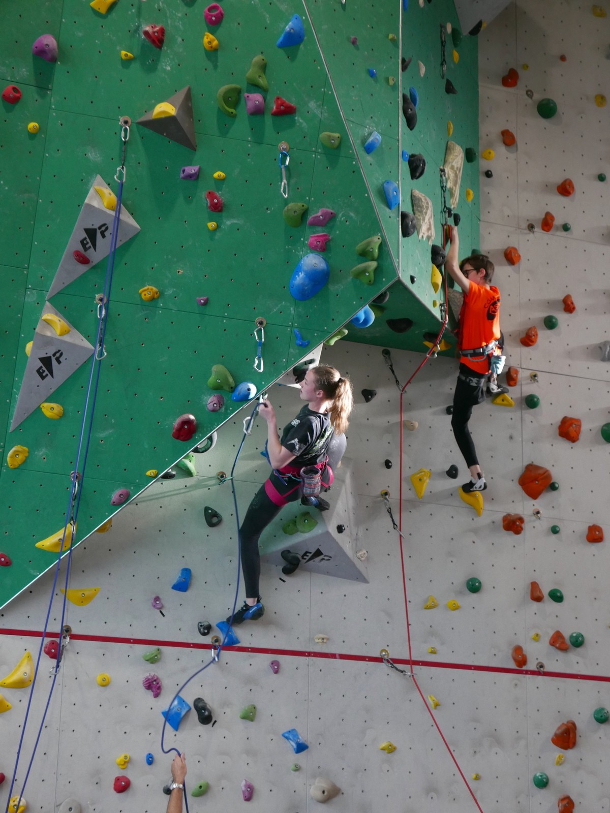 En U18F, catégorie un peu délaissée par les jeunes et vaguement invisibilisée par l’absence même de pancartes au départ de leurs voies, Elisa du COV remporte sans surprise la médaille d’or, devant une Endy qui s’est bien battue dans le dévers et dans le toit et qui progresse de jours en jours avec son appréhension de la chute. Reste à mettre un peu de rythme et de confiance et elle ira taquiner Elisa !
