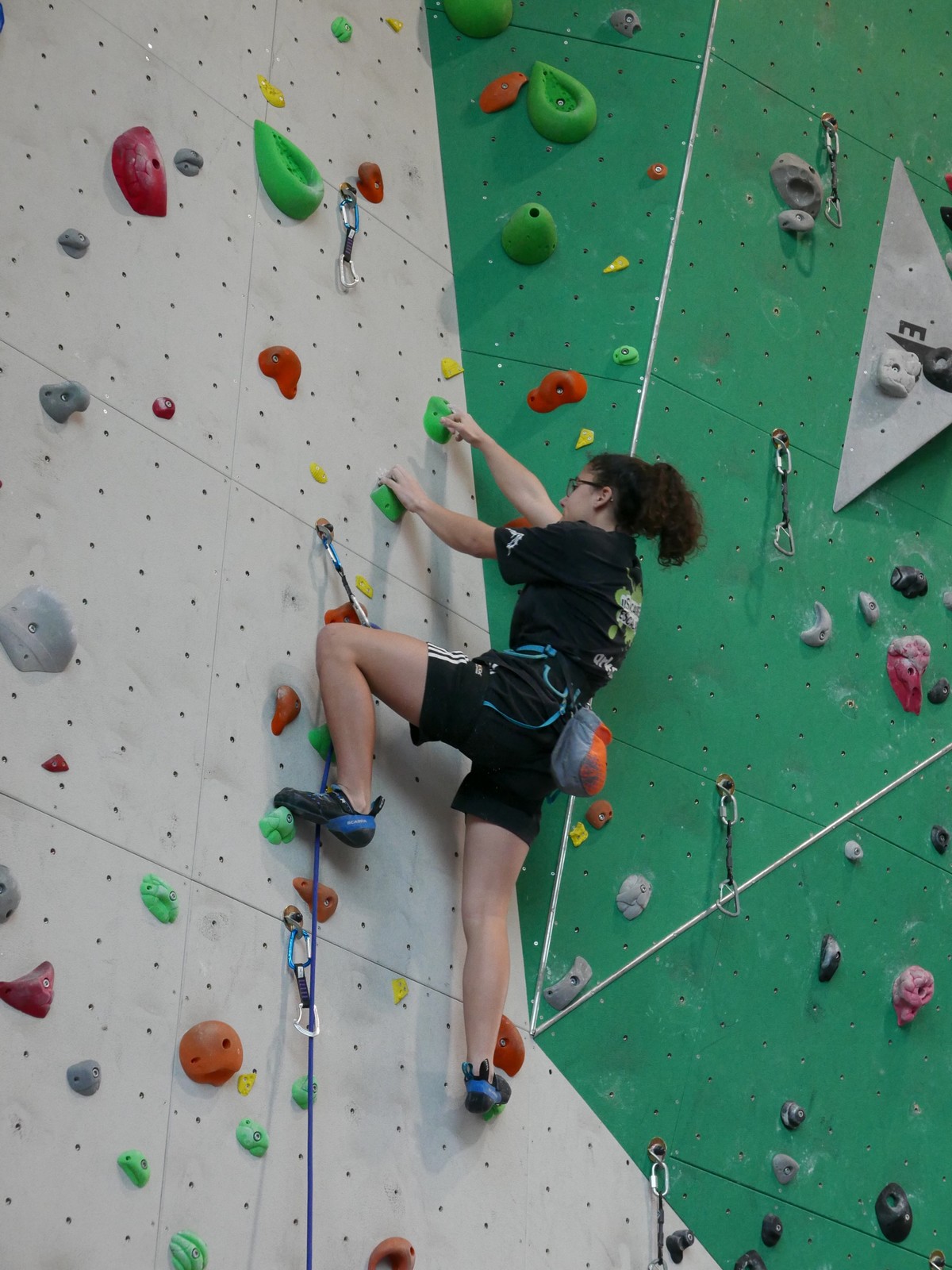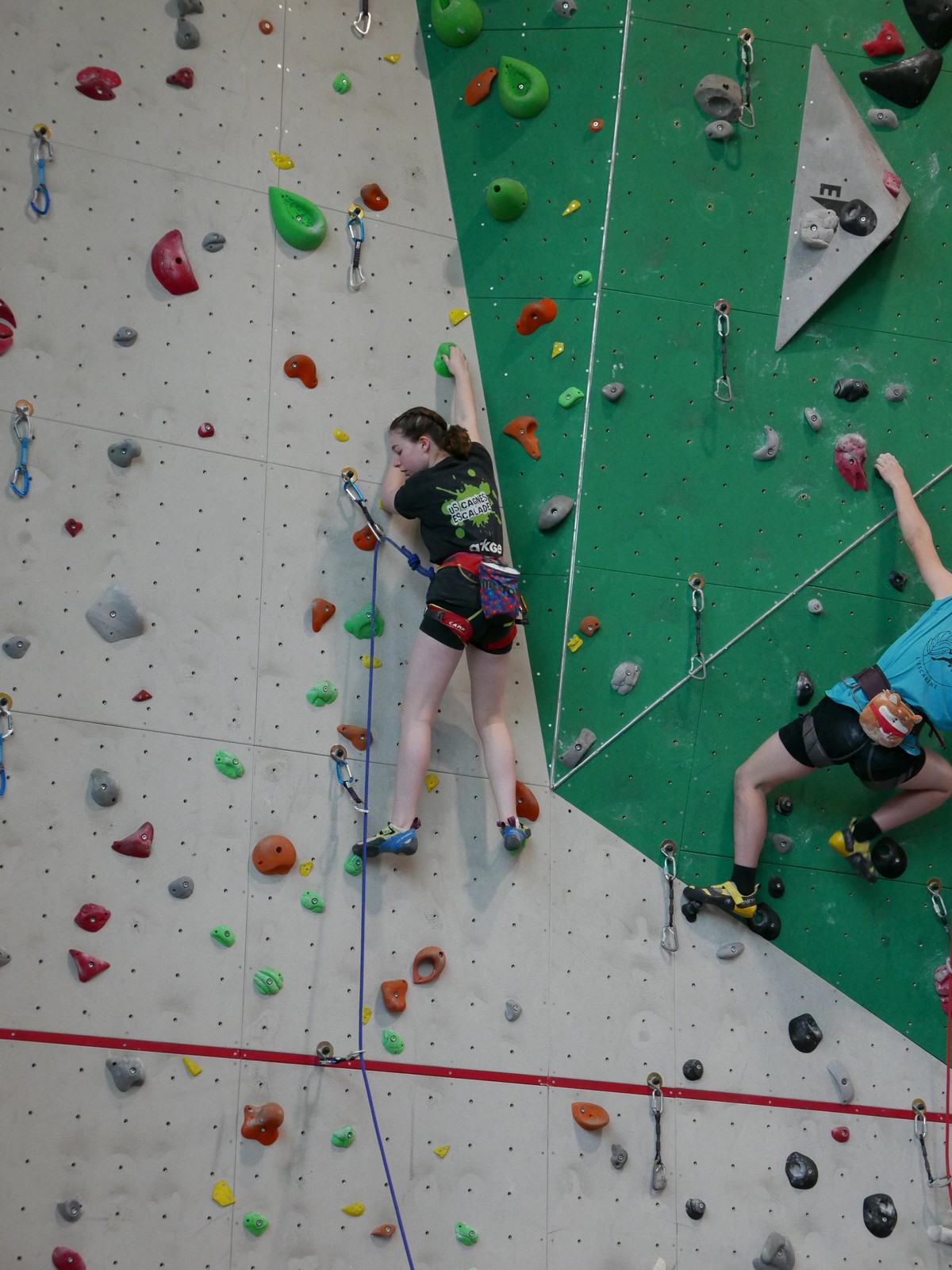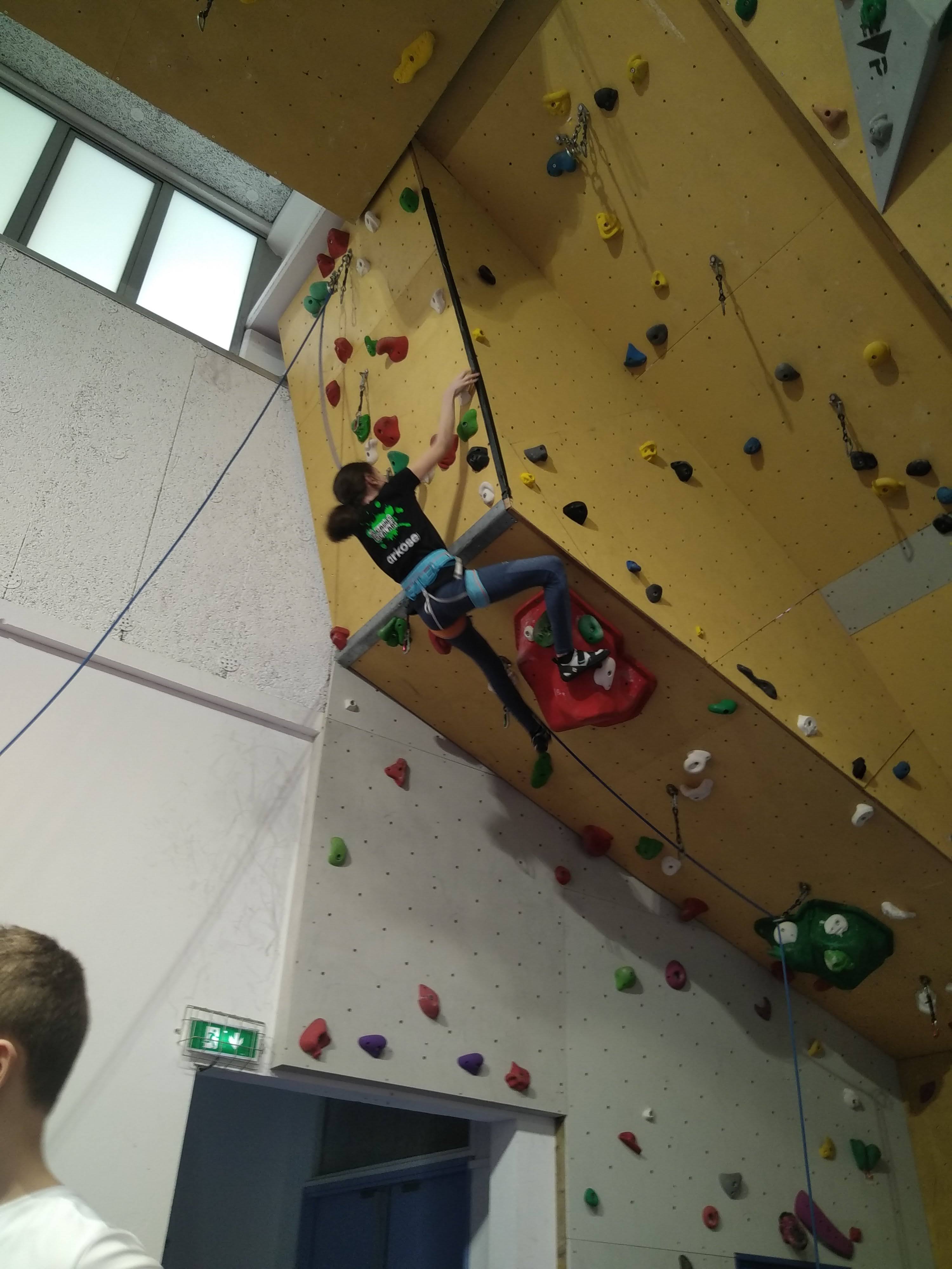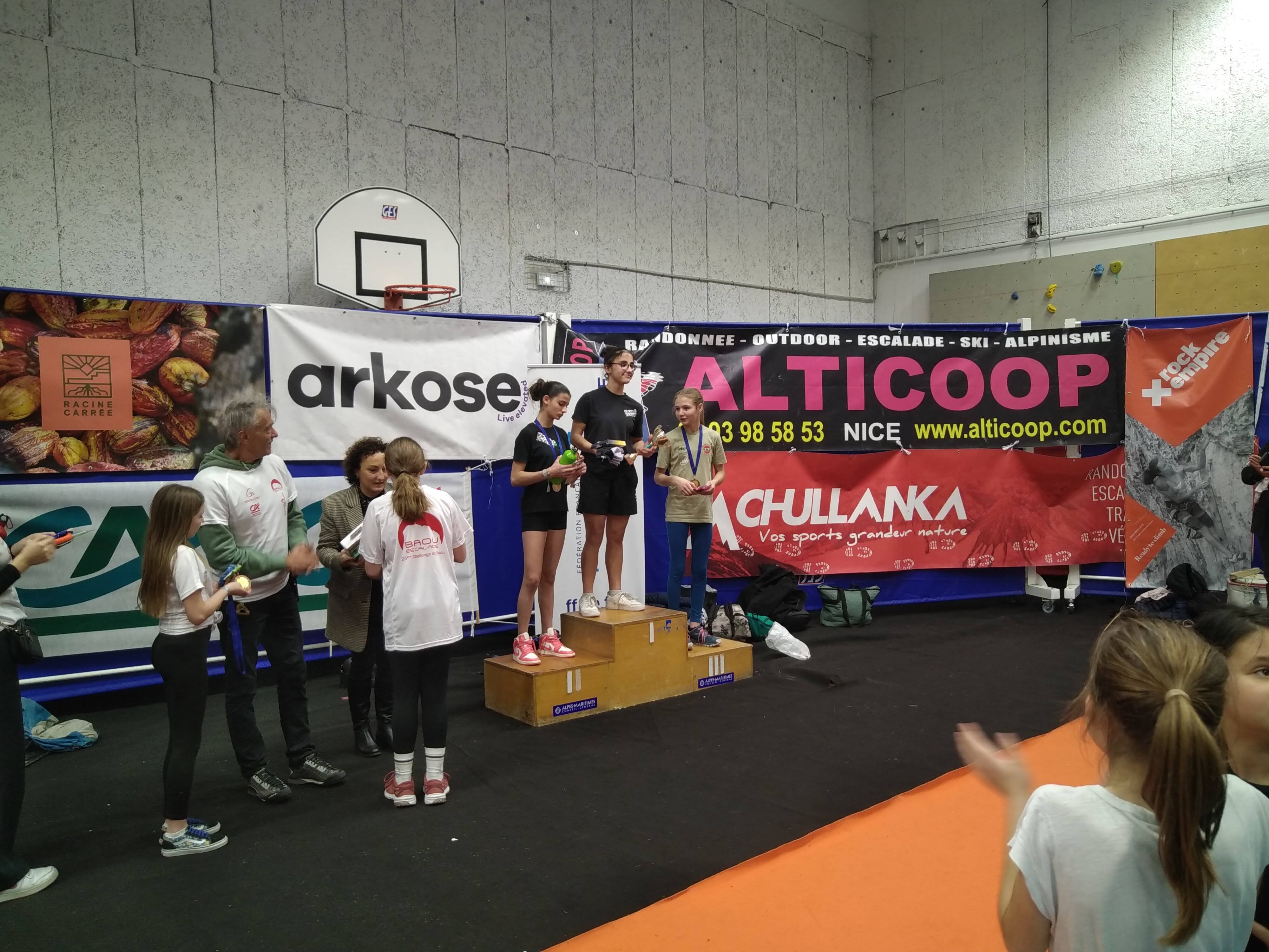 En U18F, catégorie un peu délaissée par les jeunes et vaguement invisibilisée par l’absence même de pancartes au départ de leurs voies, Elisa du COV remporte sans surprise la médaille d’or, devant une Endy qui s’est bien battue dans le dévers et dans le toit et qui progresse de jours en jours avec son appréhension de la chute. Reste à mettre un peu de rythme et de confiance et elle ira taquiner Elisa !