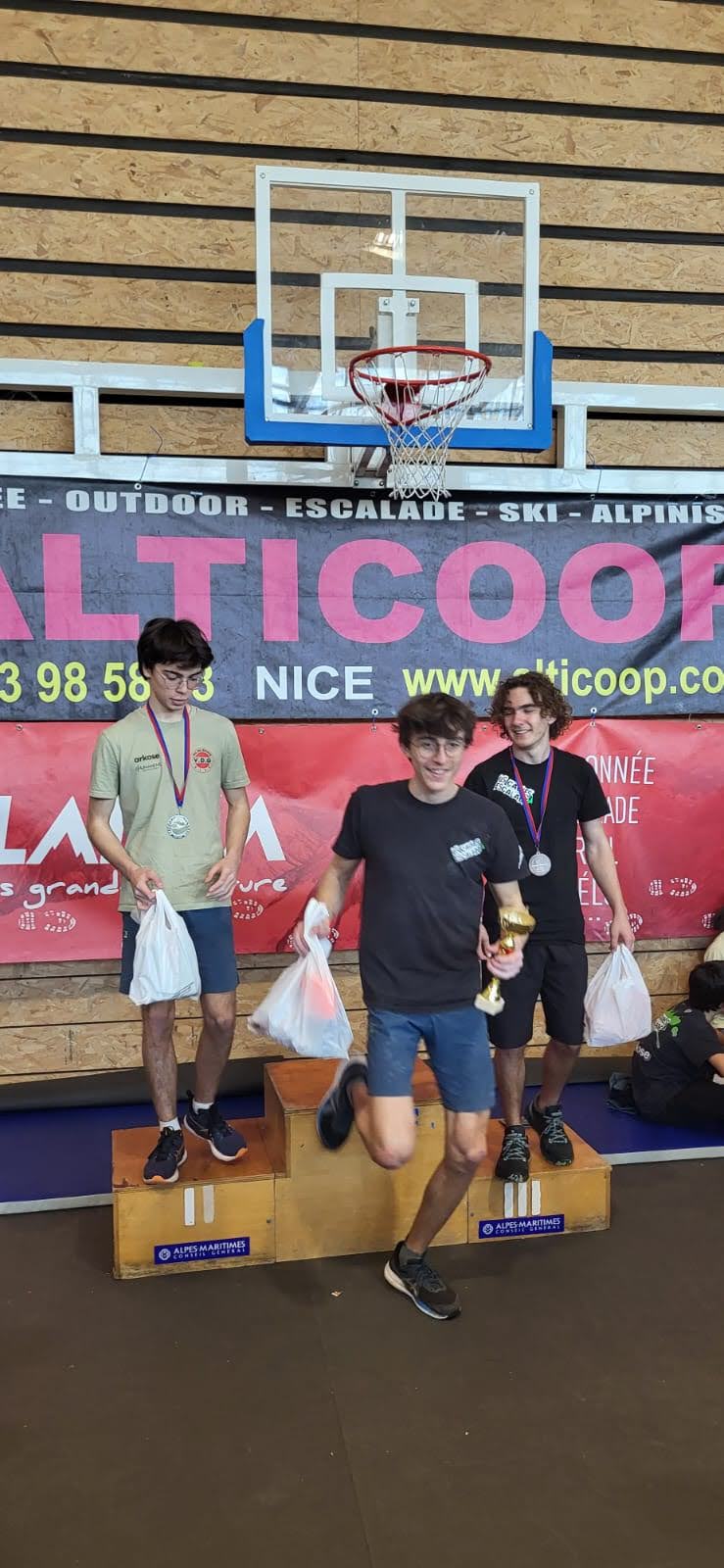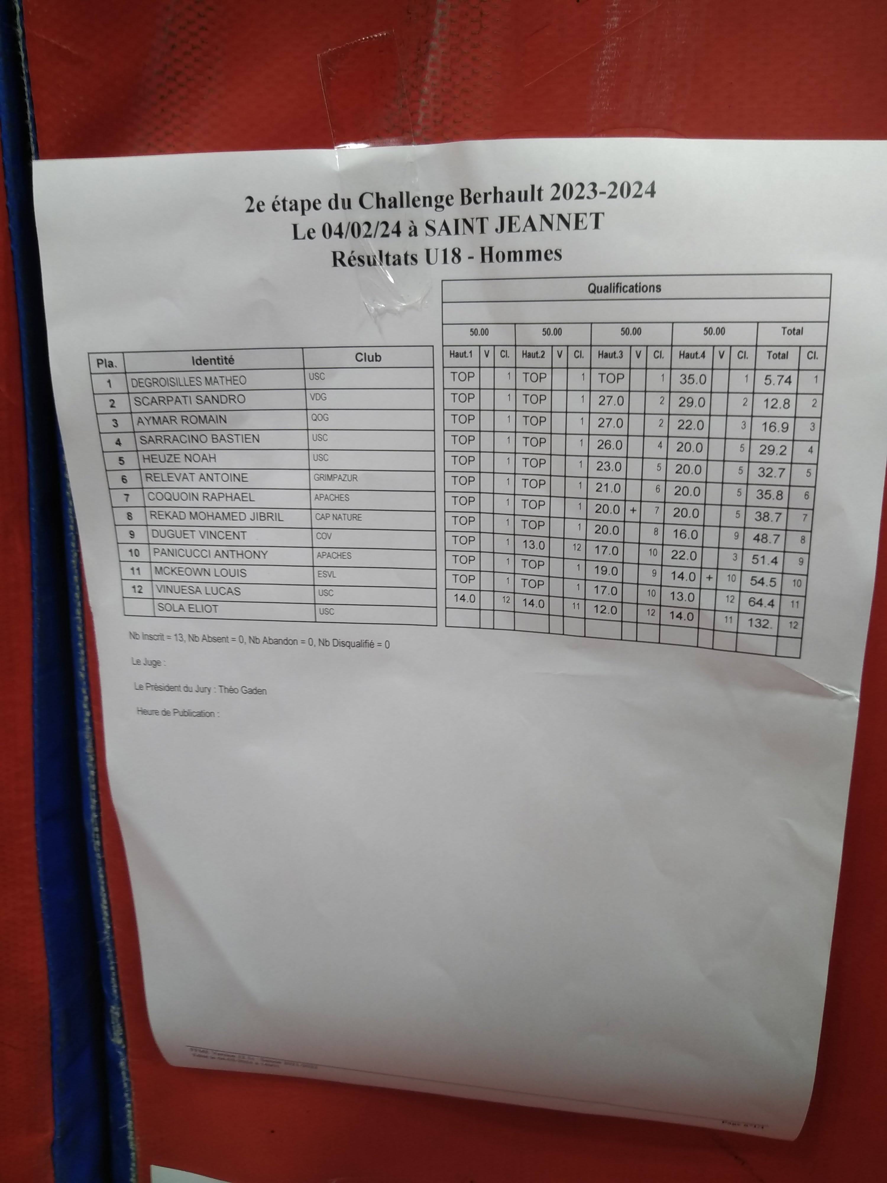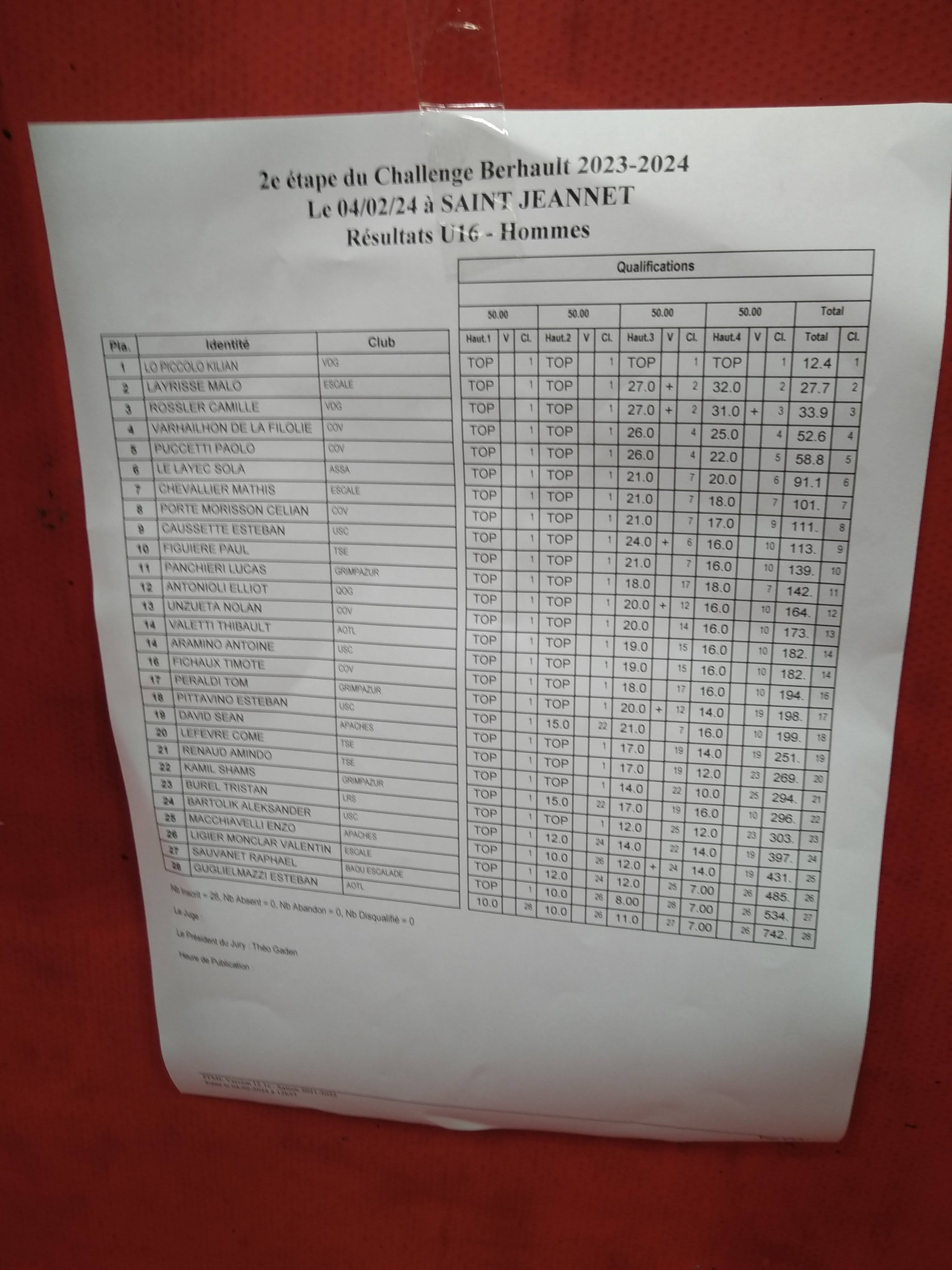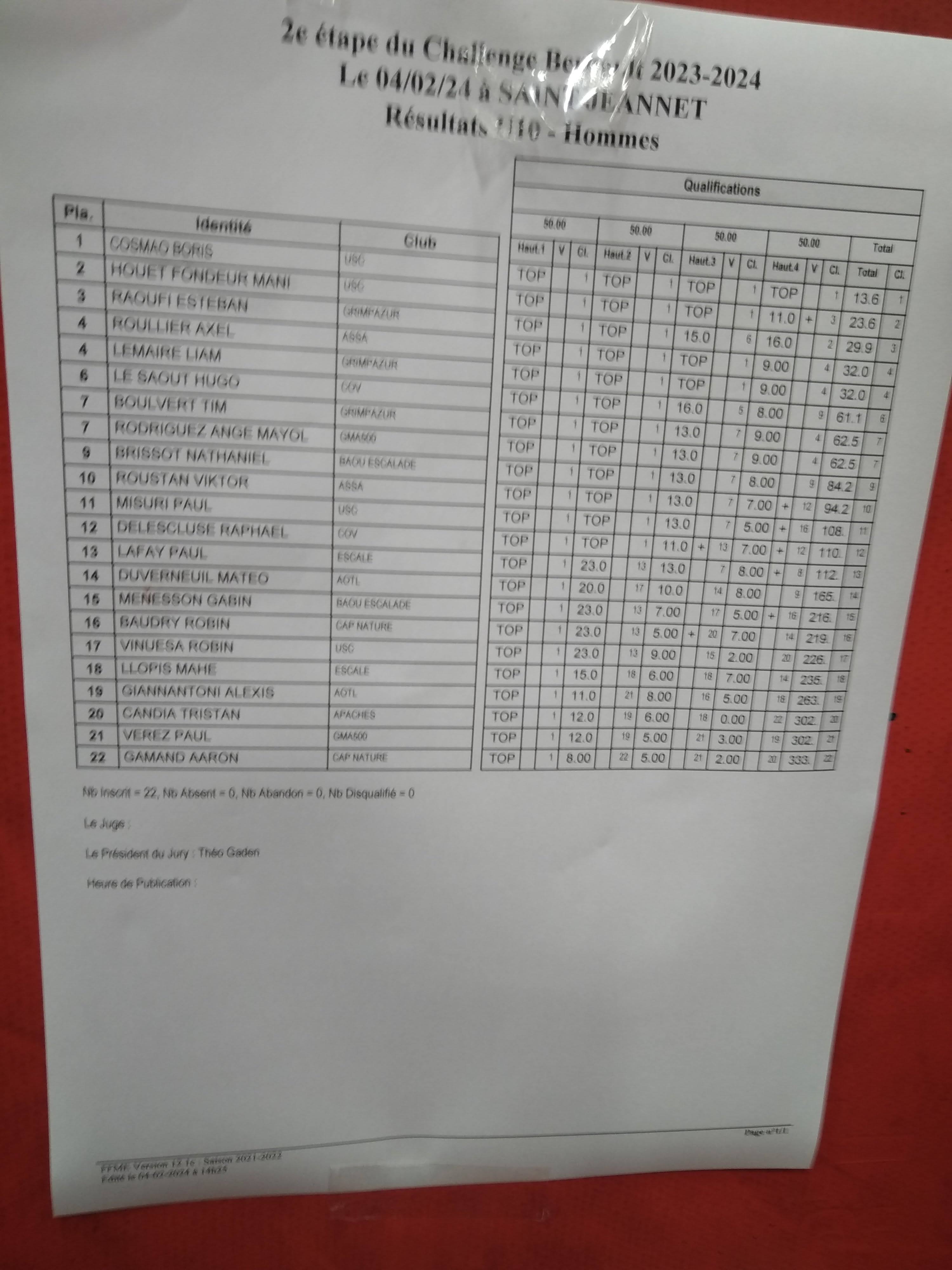 Et pour finir ce très long palmarès, chez les U18H, 4 grimpeurs du club étaient présents. Lucas, que je n’ai malheureusement pas eu l’occasion de suivre, peine dans chacune de ses voies et termine à la 12ème place. Noah et Bastien sont au coude à coude mais Bastien, qui s’est un peu entraîné à Bréa ces dernières semaines, négocie un peu mieux le plafond dans la voie 3 et se place 4ème, juste devant Noah 5ème. Au sommet du tableau, le duel entre Sandro de VdG et Mathéo de chez nous se termine avec une nette victoire en faveur de Mathéo qui sort le voie 3 et tombe à la toute fin de la voie 4. Bravo Mathéo, quel grimpeur complet tu fais !