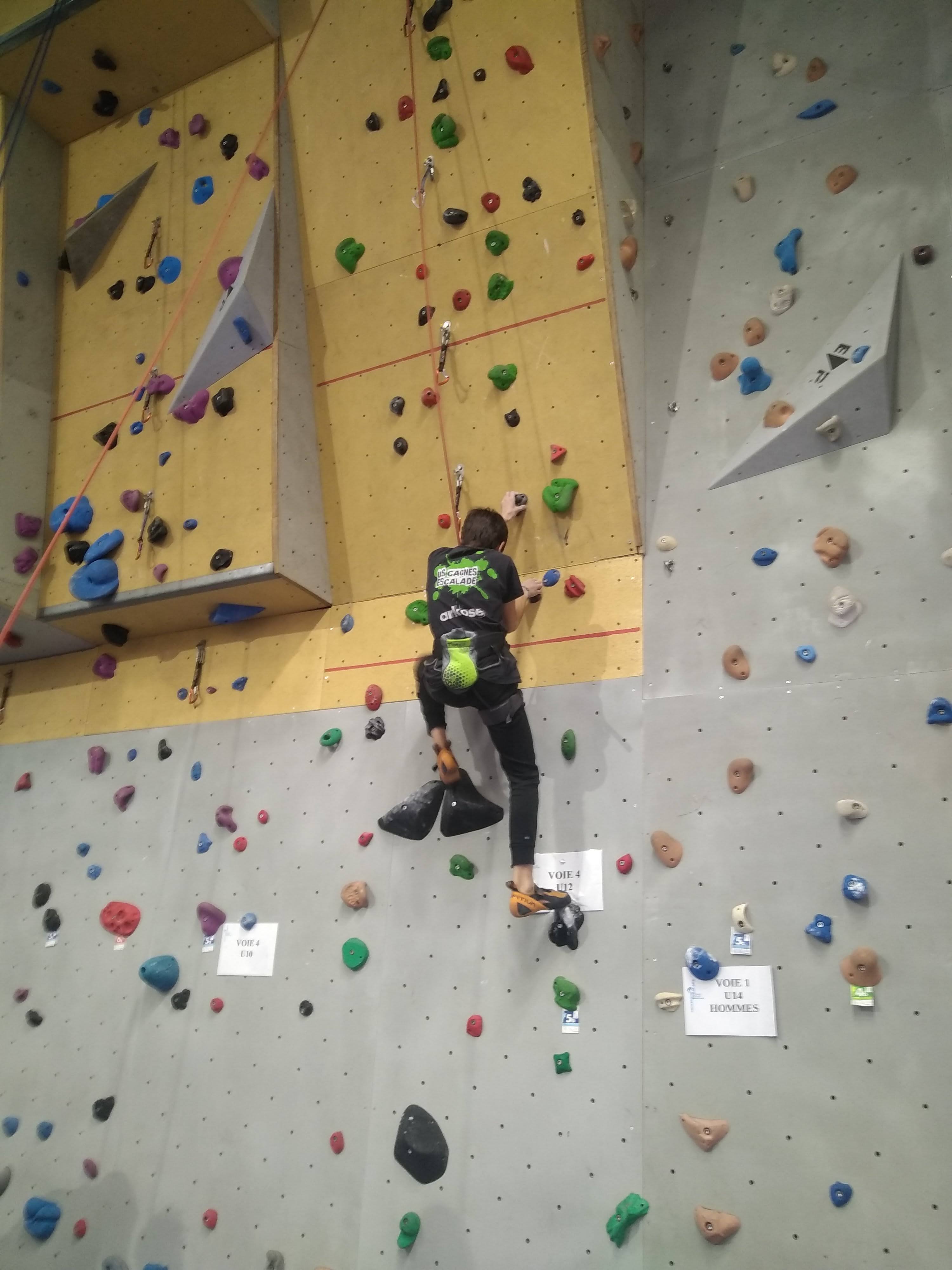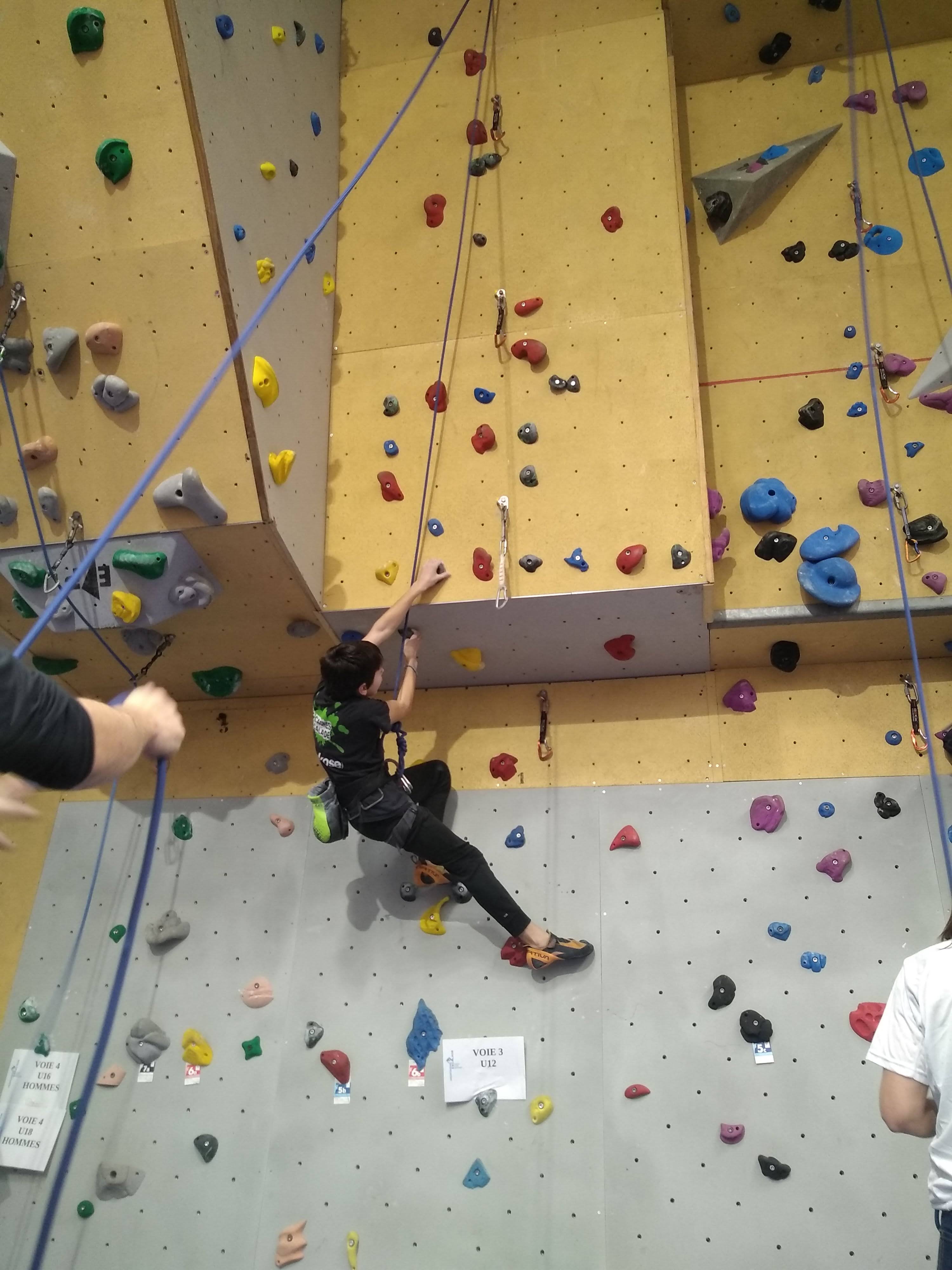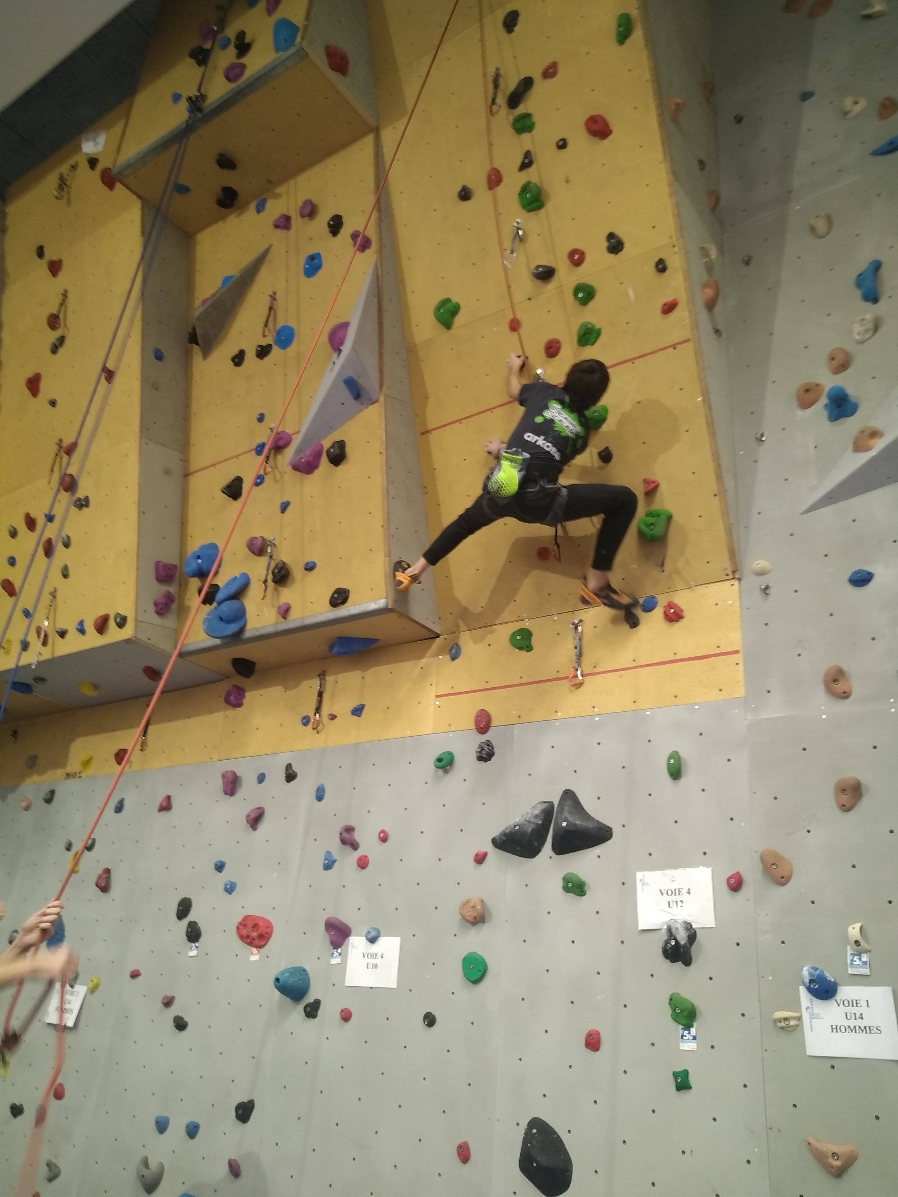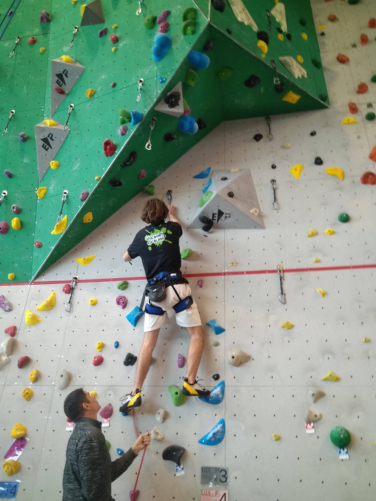 Chez l’USC, Lino grimpe bien sa voie 1 jusqu’au moment du sommet où il s’agit d’engager le dernier mouvement, ce qu’il ne parvient pas à faire. Dans toutes les autres voies, il chute dès le début des voies et termine à la 21ème place. Il faut que tu parviennes à libérer ta grimpe et à engager les mouvements, Lino.
