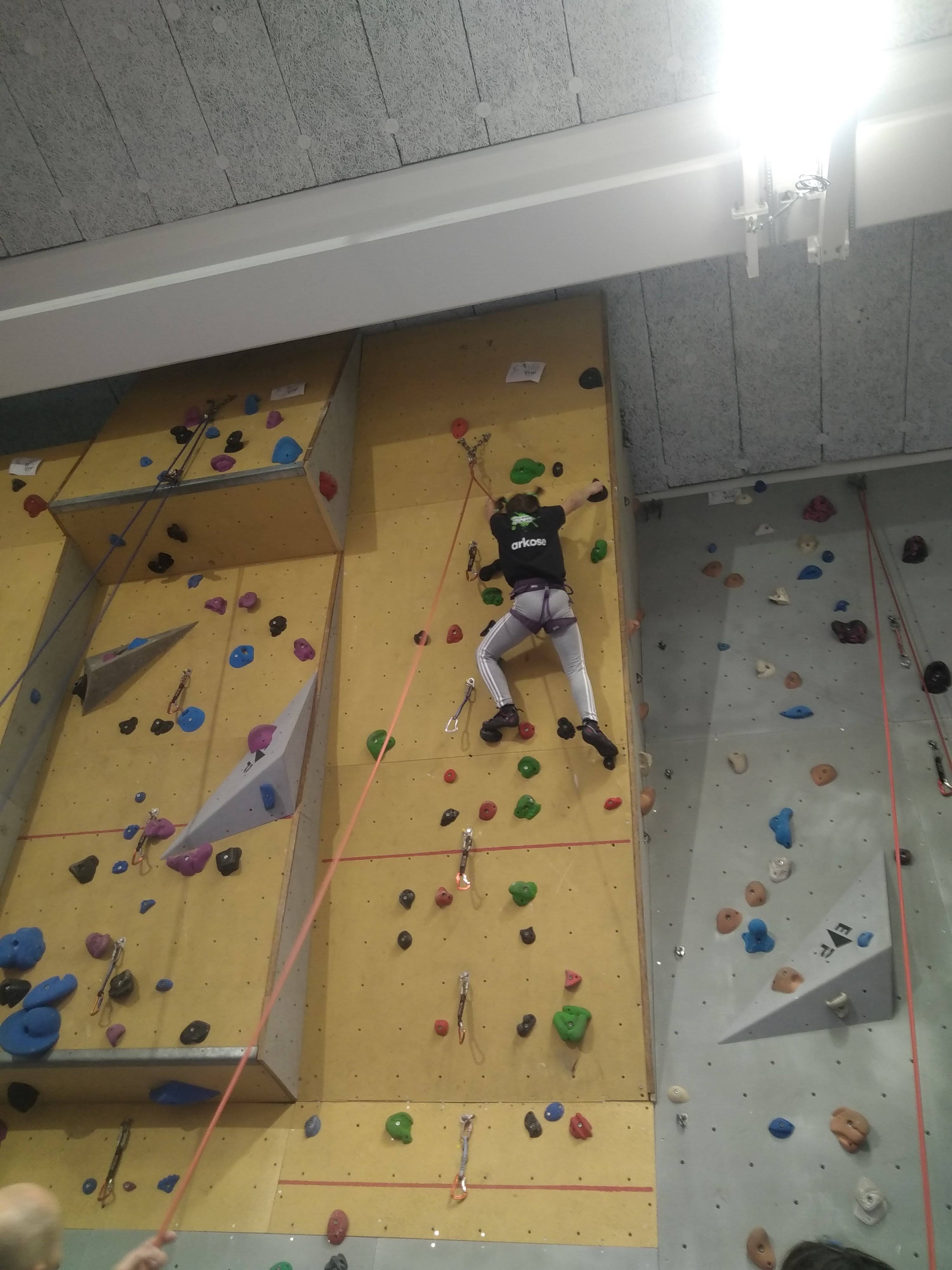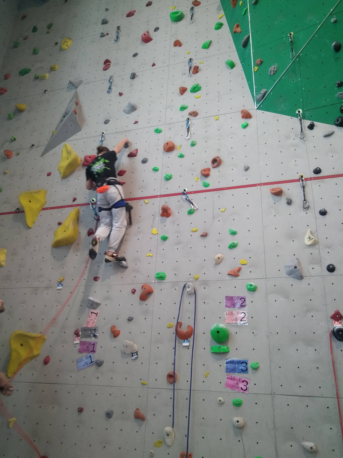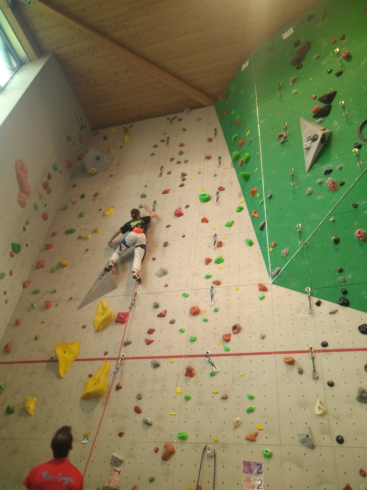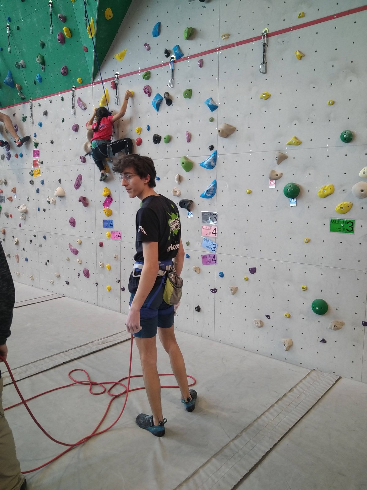 Chez l’USC, Lino grimpe bien sa voie 1 jusqu’au moment du sommet où il s’agit d’engager le dernier mouvement, ce qu’il ne parvient pas à faire. Dans toutes les autres voies, il chute dès le début des voies et termine à la 21ème place. Il faut que tu parviennes à libérer ta grimpe et à engager les mouvements, Lino.