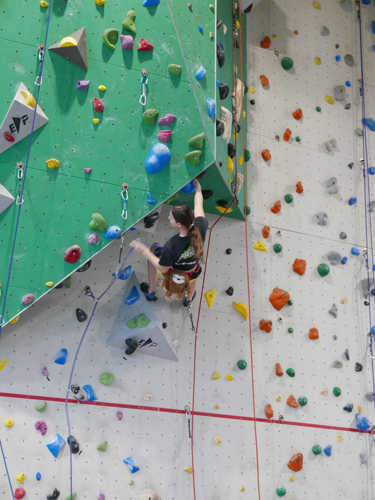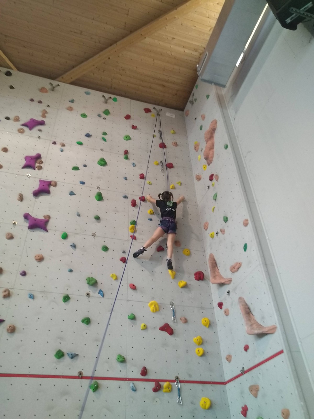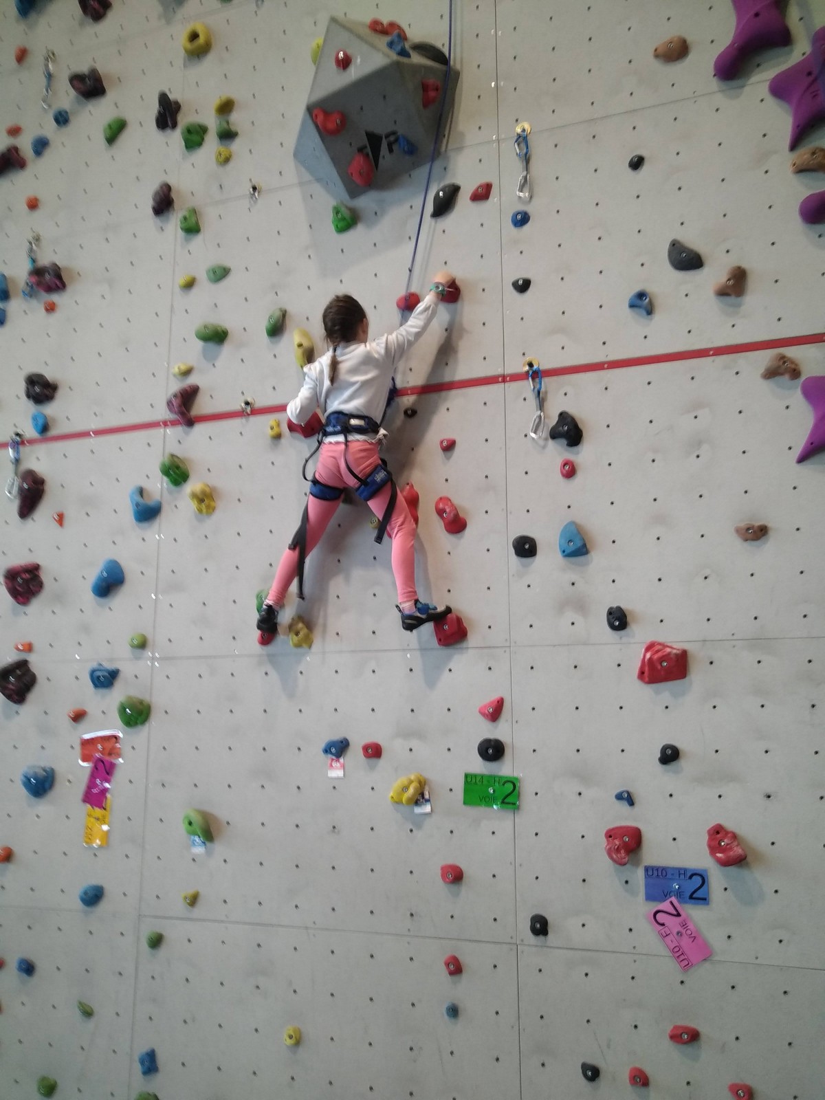 Ce sont les catégories U10F et U12F qui commencent avec en lice Anna, Thelma, Kaya, Louise et Naïs. Et c’est Anna qui ouvre le bal chez nous avec un départ à 9h14 ! Et comme c’est la première, je suis tout à disposition pour la guider. A cet âge, certains ont encore des appréhensions liées à la hauteur et c’est le cas d’Anna. Mais elle s’élance courageusement dans sa première voie qu’elle négocie très bien et en atteint le sommet dans le temps imparti. La voie 2 est déjà bien plus compliquée mais avec mes indications, Anna parvient à monter assez haut avant de se faire stopper par le chrono. A partir de la voie 3, on entre vraiment dans le vif du sujet et Anna atteint là ses limites du moment et termine à la 18ème place. Je suis très fier de toi Anna.