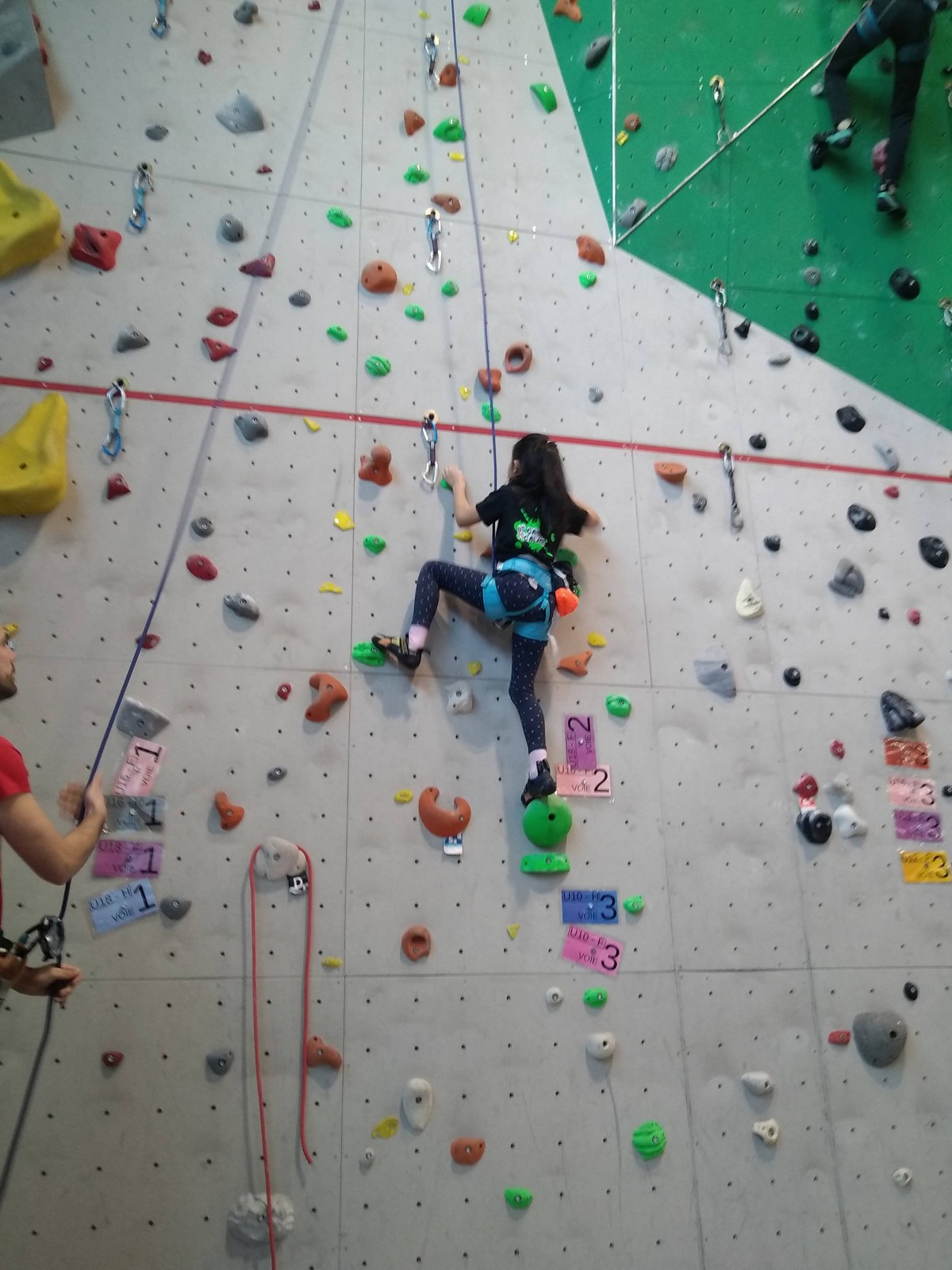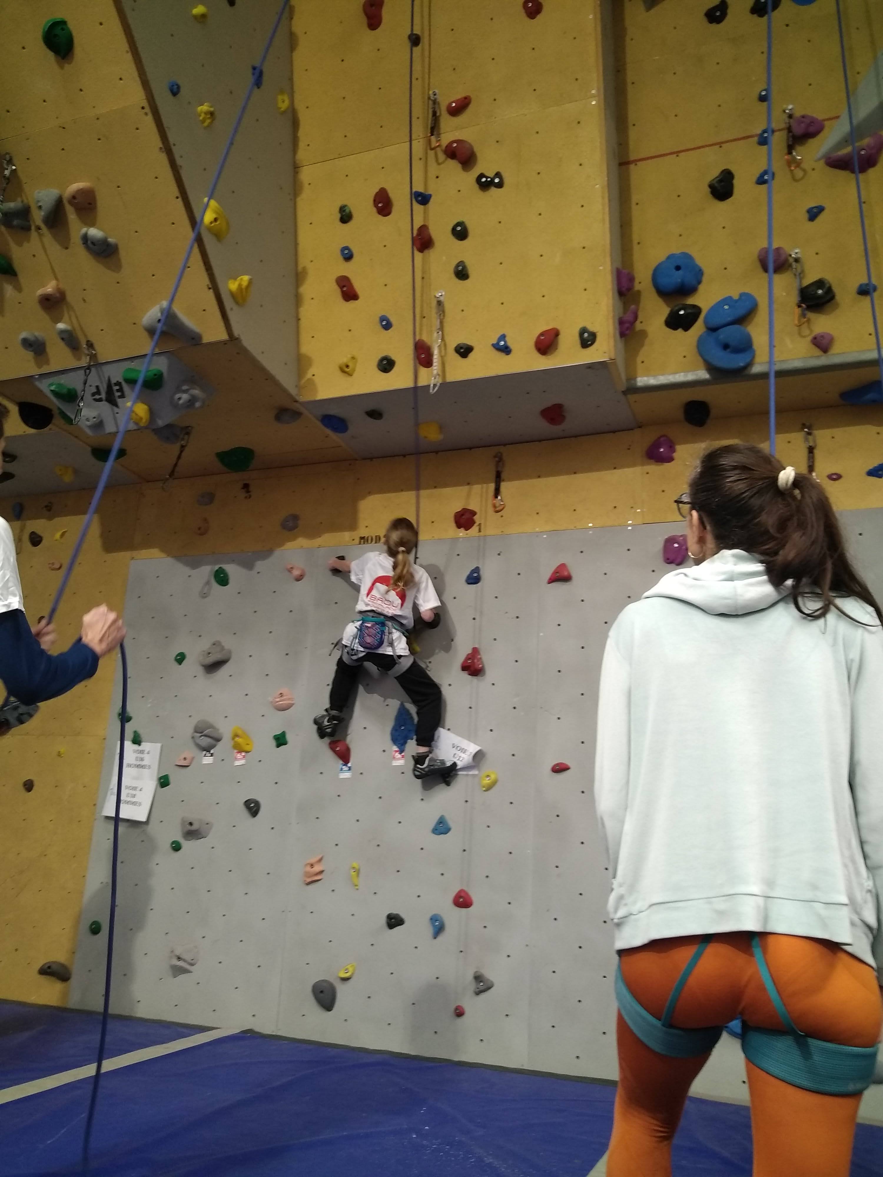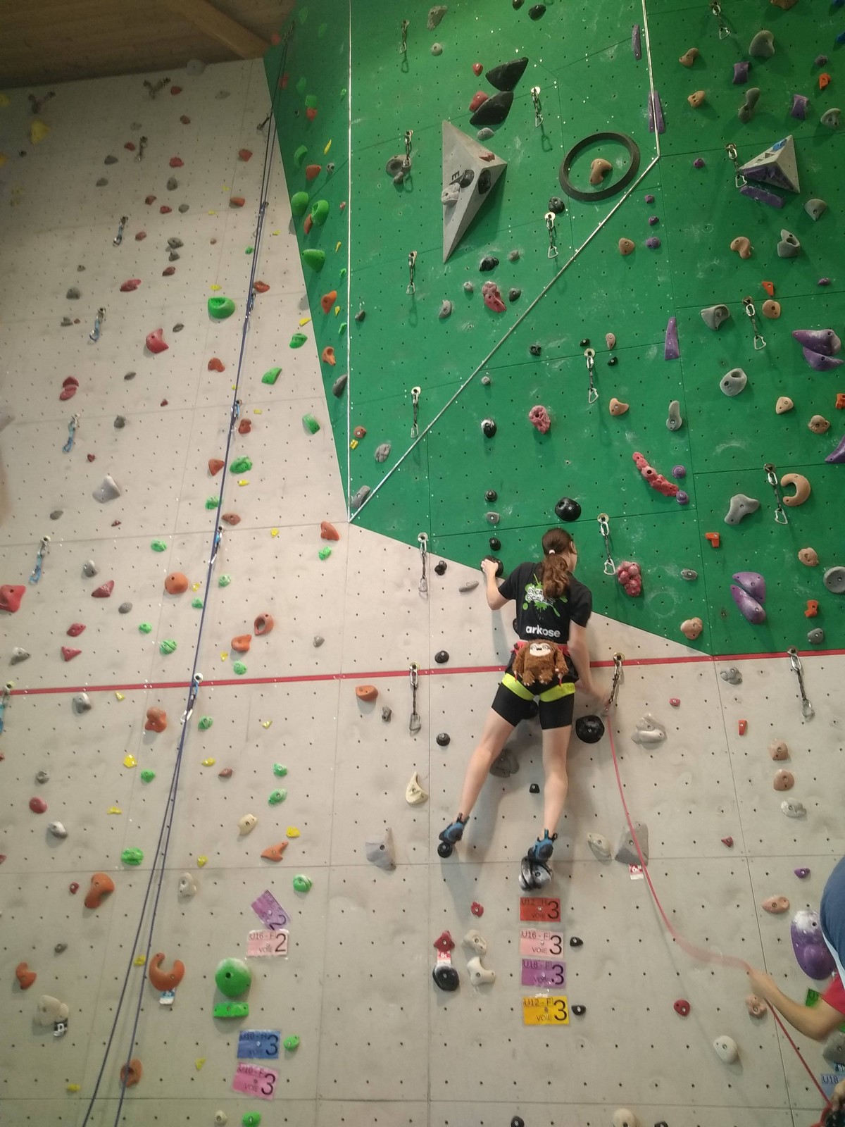 Ce sont les catégories U10F et U12F qui commencent avec en lice Anna, Thelma, Kaya, Louise et Naïs. Et c’est Anna qui ouvre le bal chez nous avec un départ à 9h14 ! Et comme c’est la première, je suis tout à disposition pour la guider. A cet âge, certains ont encore des appréhensions liées à la hauteur et c’est le cas d’Anna. Mais elle s’élance courageusement dans sa première voie qu’elle négocie très bien et en atteint le sommet dans le temps imparti. La voie 2 est déjà bien plus compliquée mais avec mes indications, Anna parvient à monter assez haut avant de se faire stopper par le chrono. A partir de la voie 3, on entre vraiment dans le vif du sujet et Anna atteint là ses limites du moment et termine à la 18ème place. Je suis très fier de toi Anna.