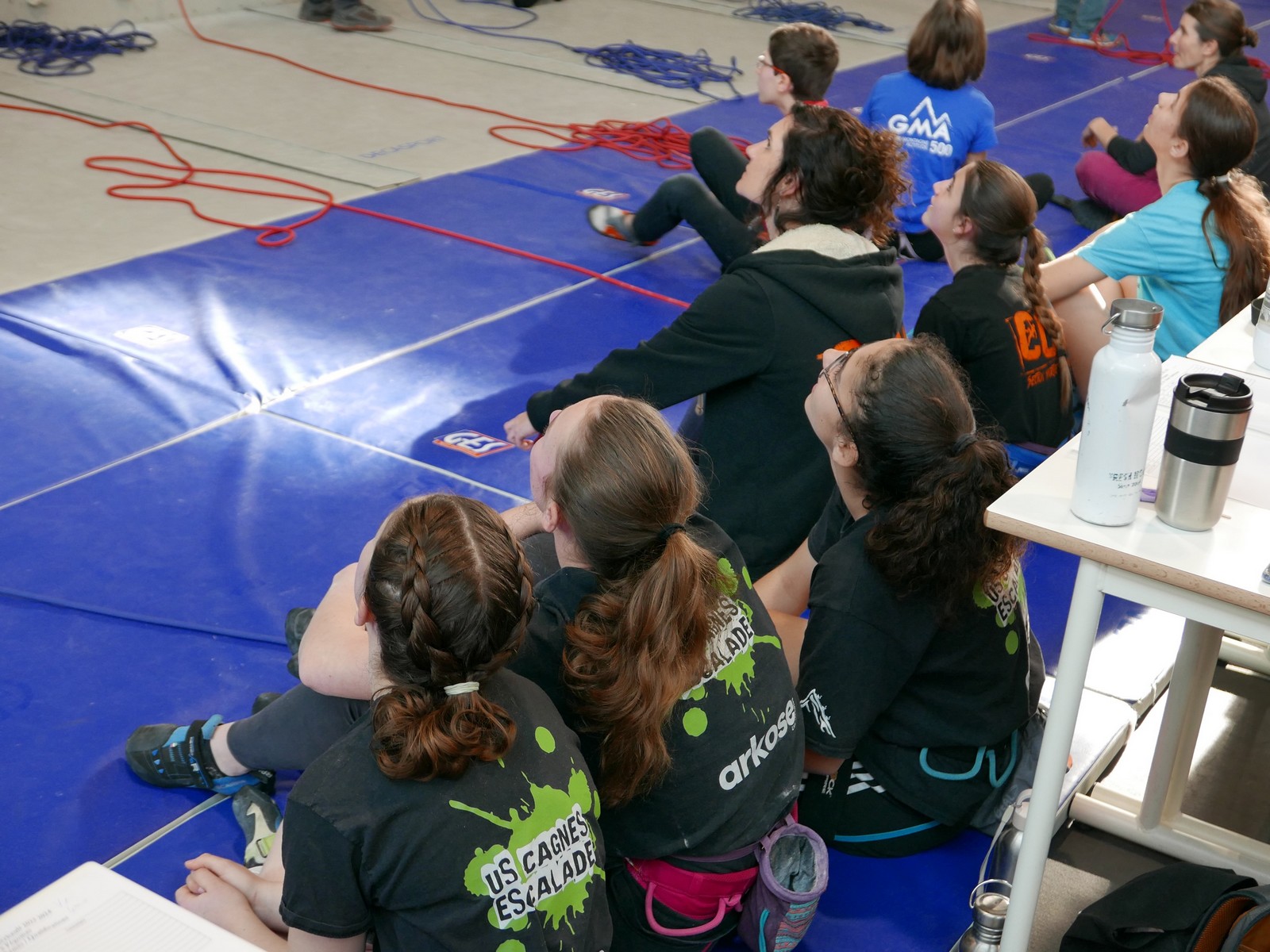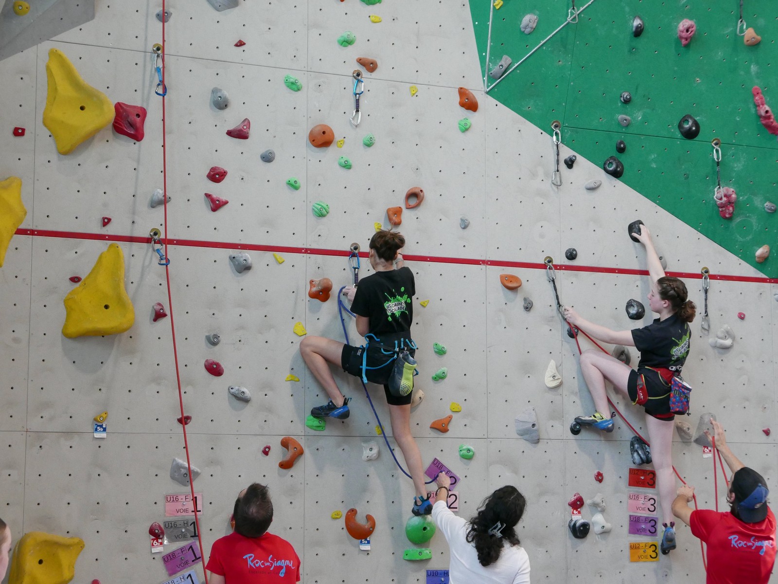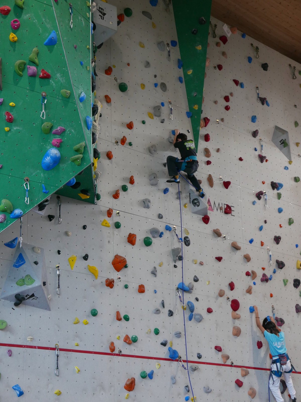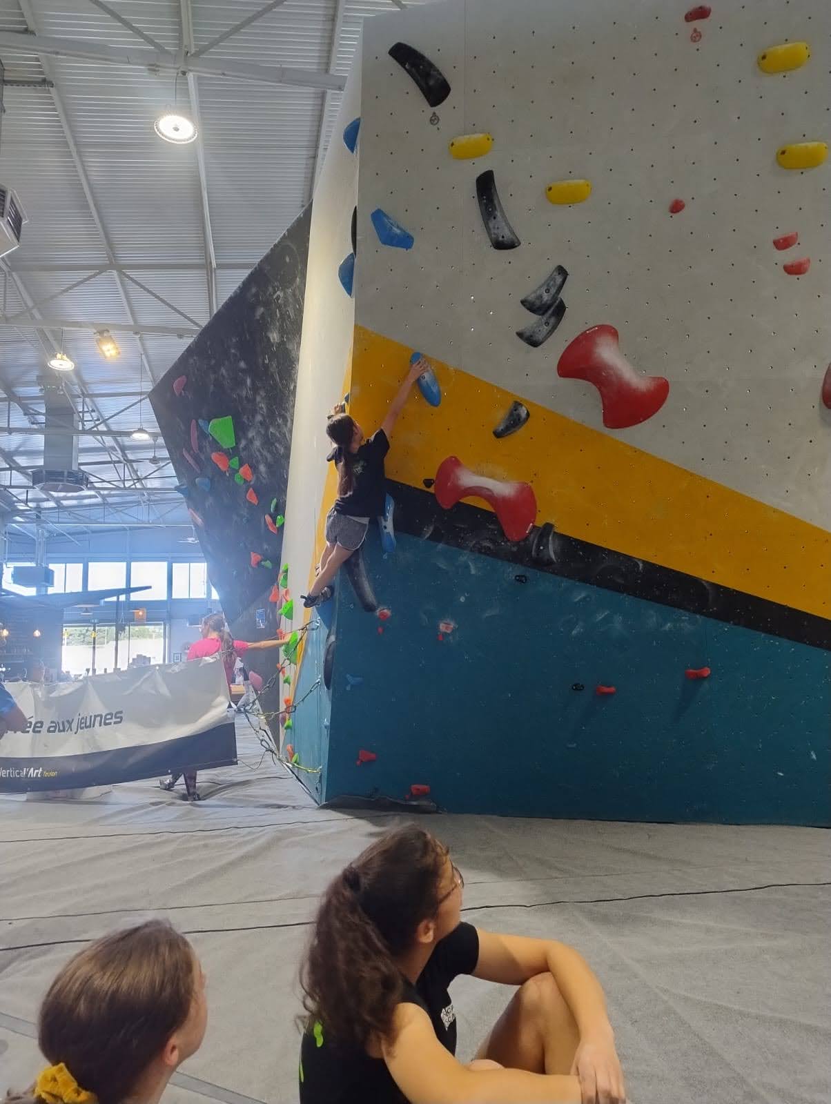 Côté performance donc, Rose et Maya ne parviennent pas à sortir le crux compliqué de la voie 3 et tombent au sommet de la voie 4. Elles terminent 6ème pour Maya, 5ème pour Rose. Comme dit plus tôt, Mélia prend la médaille de bronze pour un essai de trop dans la voie 3 (elle était la première à défricher les méthodes, petit désavantage qu’elle n’a pas réussi à compenser malgré le téléguidage de Mathis en bas). Romane nous offre une performance incroyable tout en force et volonté tandis que Lya profite une fois de plus de sa taille et improvise ses propres méthodes en prenant de gros risques qui paient bien. Elles auront droit à une voie de finale et c’est Lya qui passe devant avec un avantage assez net. Bravo Lya. Mention spéciale à Romane et une combativité impressionnante !