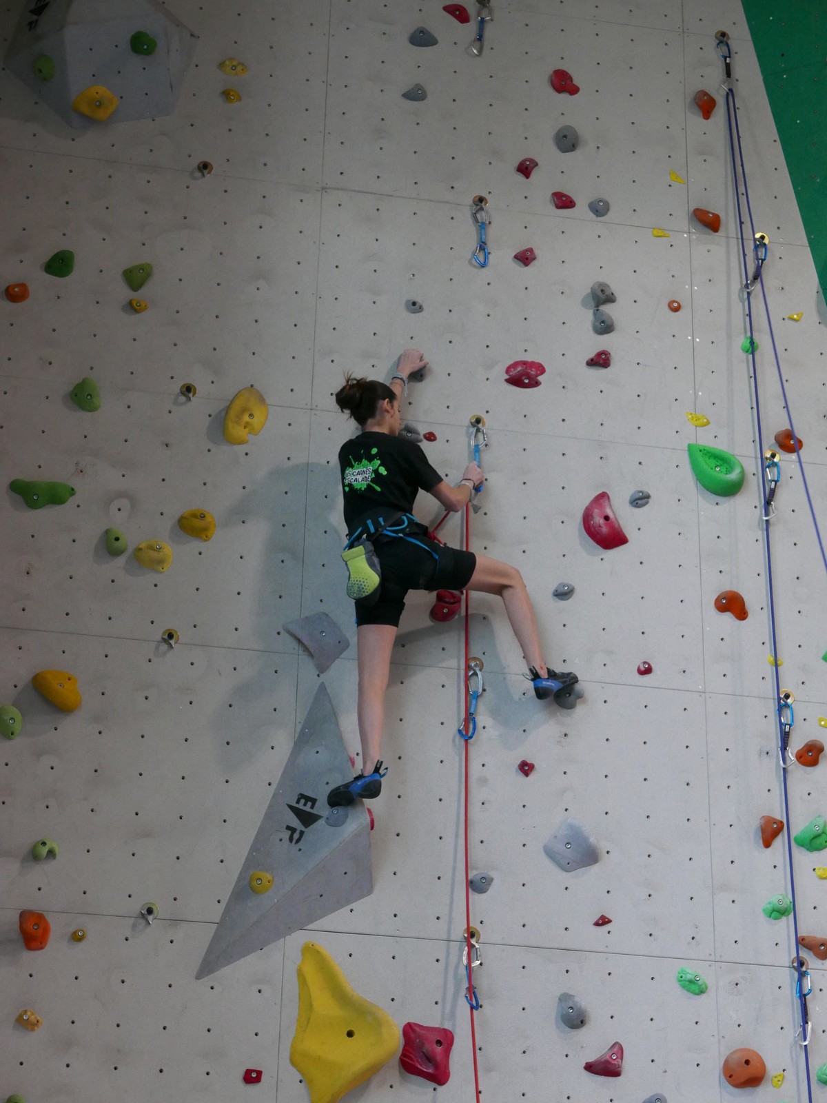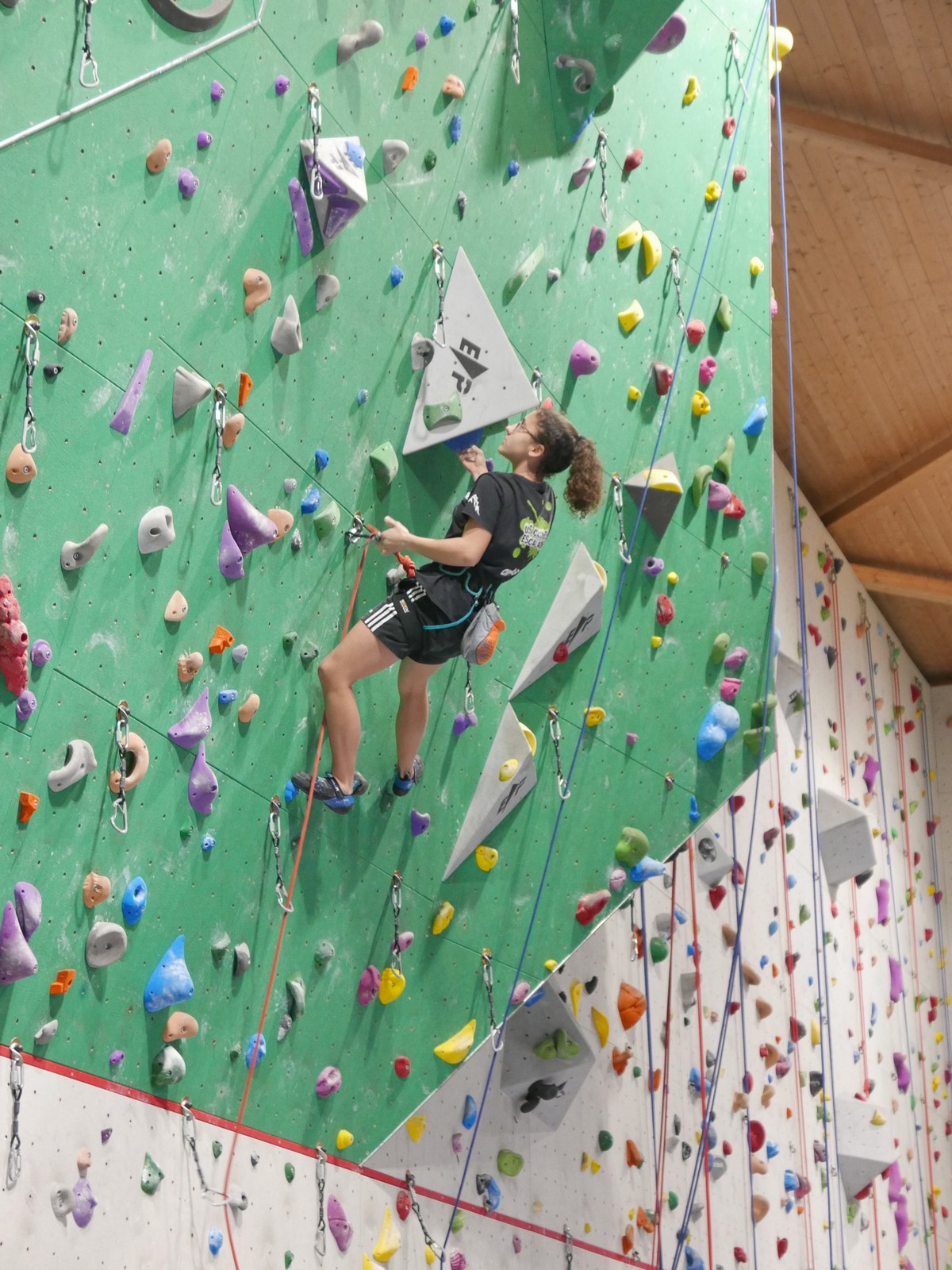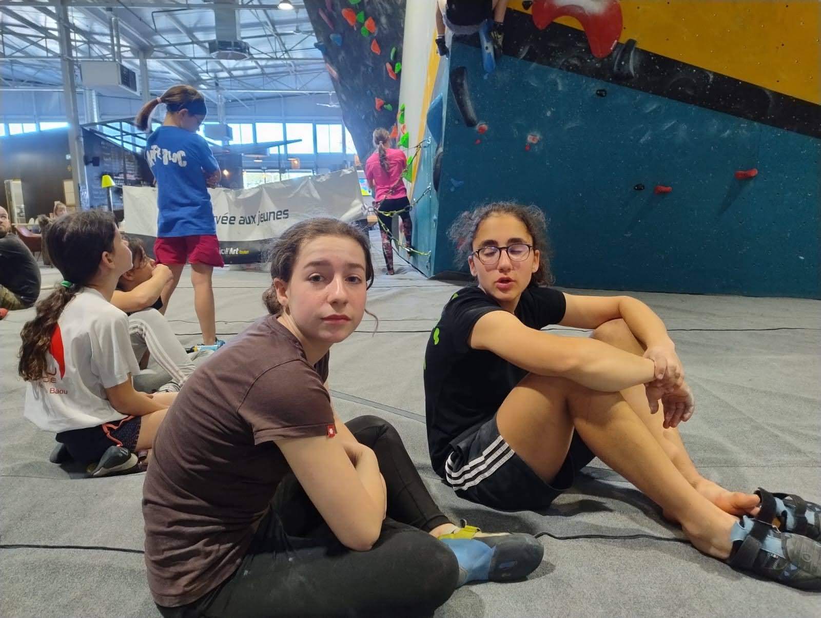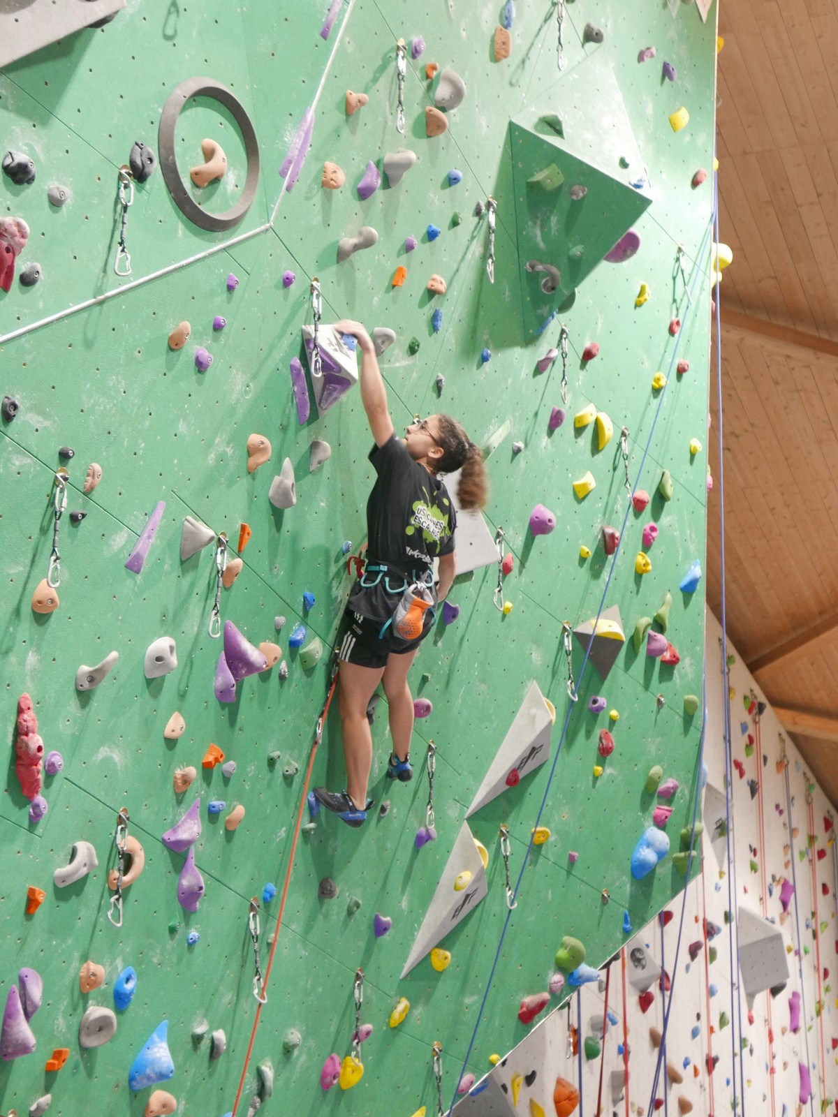 Côté performance donc, Rose et Maya ne parviennent pas à sortir le crux compliqué de la voie 3 et tombent au sommet de la voie 4. Elles terminent 6ème pour Maya, 5ème pour Rose. Comme dit plus tôt, Mélia prend la médaille de bronze pour un essai de trop dans la voie 3 (elle était la première à défricher les méthodes, petit désavantage qu’elle n’a pas réussi à compenser malgré le téléguidage de Mathis en bas). Romane nous offre une performance incroyable tout en force et volonté tandis que Lya profite une fois de plus de sa taille et improvise ses propres méthodes en prenant de gros risques qui paient bien. Elles auront droit à une voie de finale et c’est Lya qui passe devant avec un avantage assez net. Bravo Lya. Mention spéciale à Romane et une combativité impressionnante !