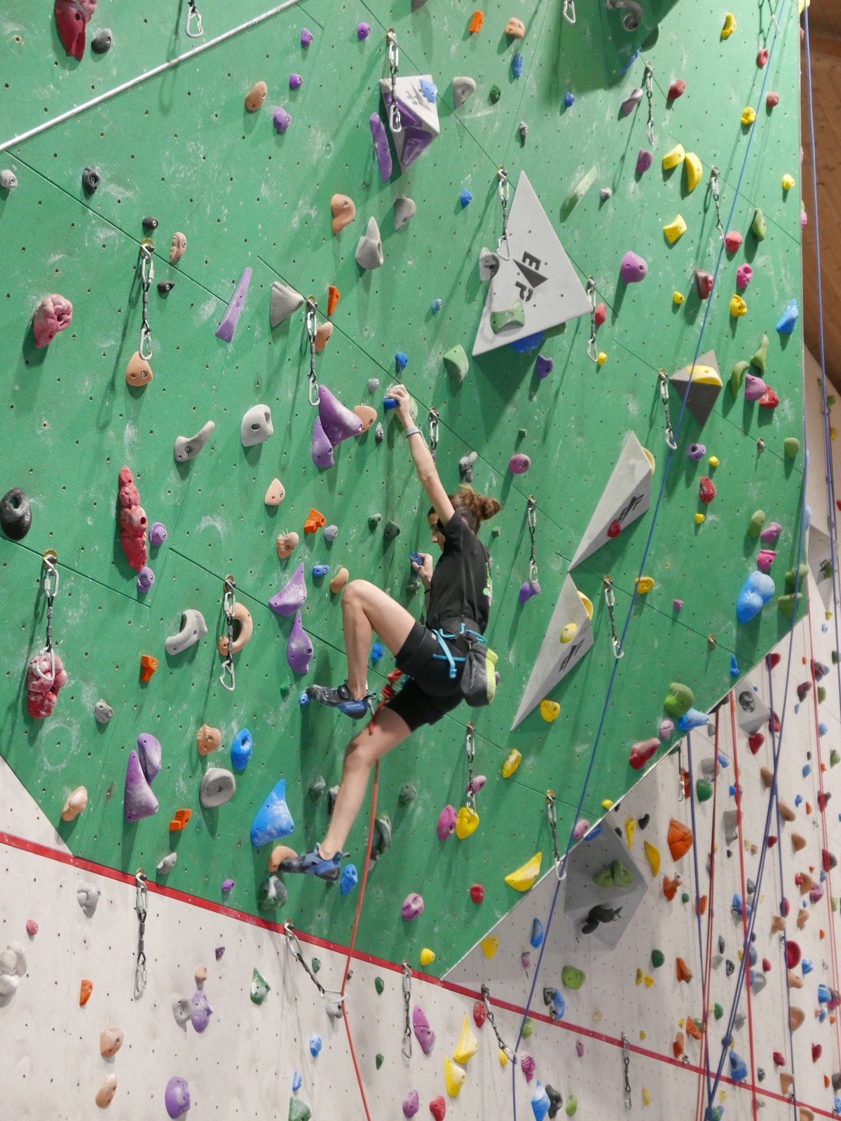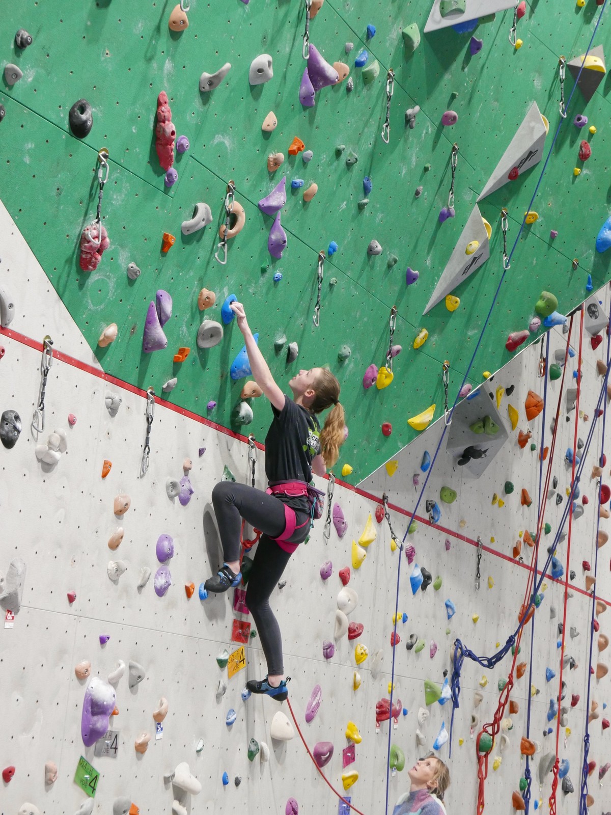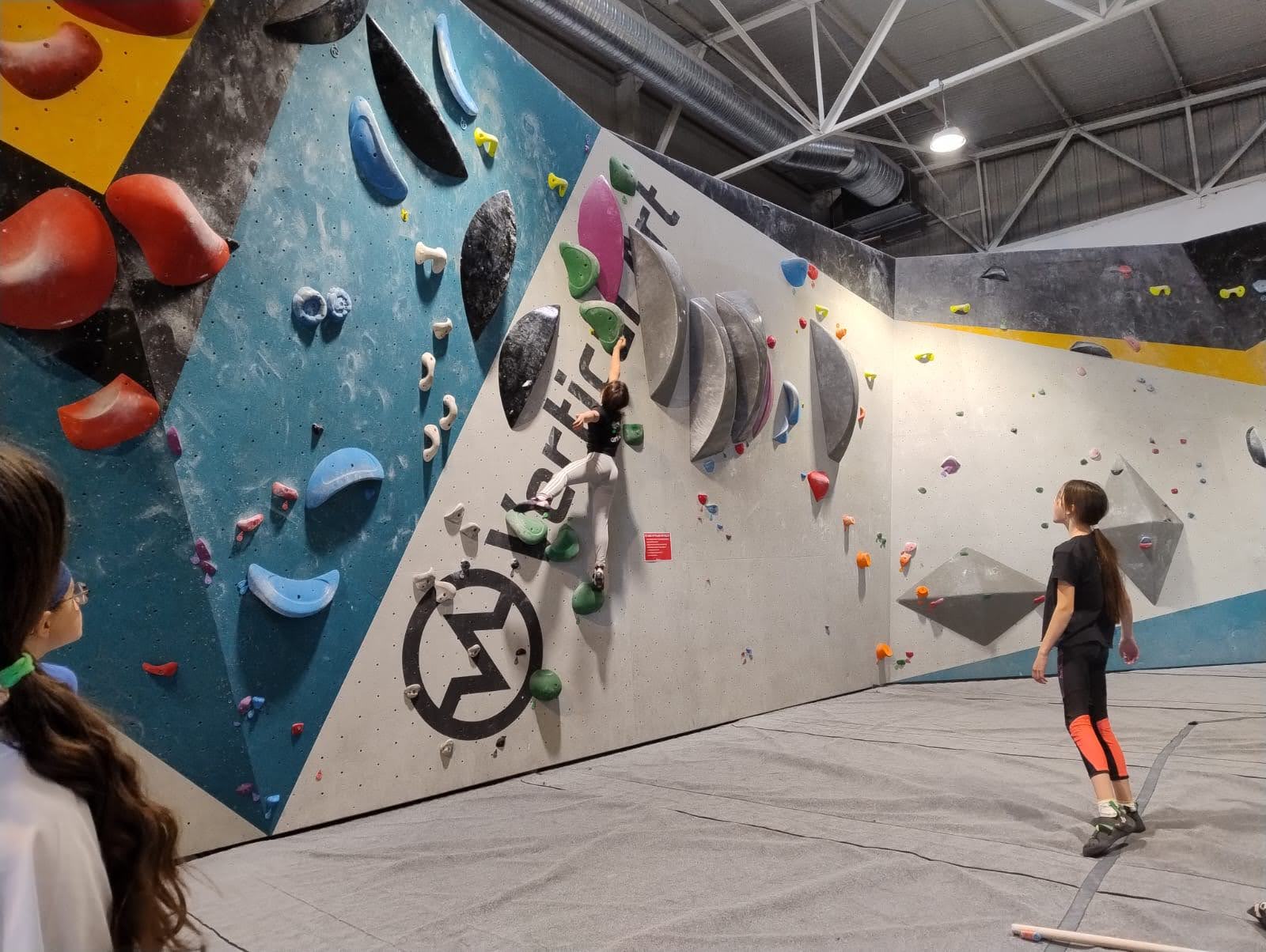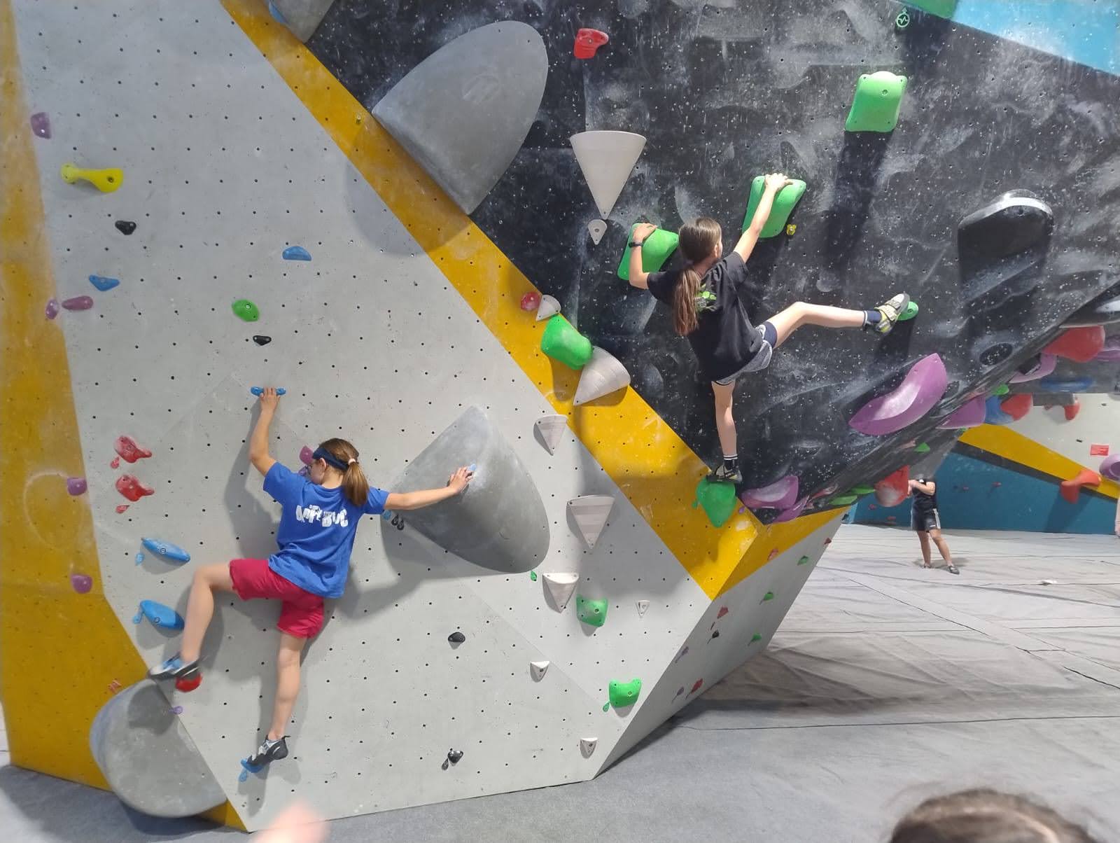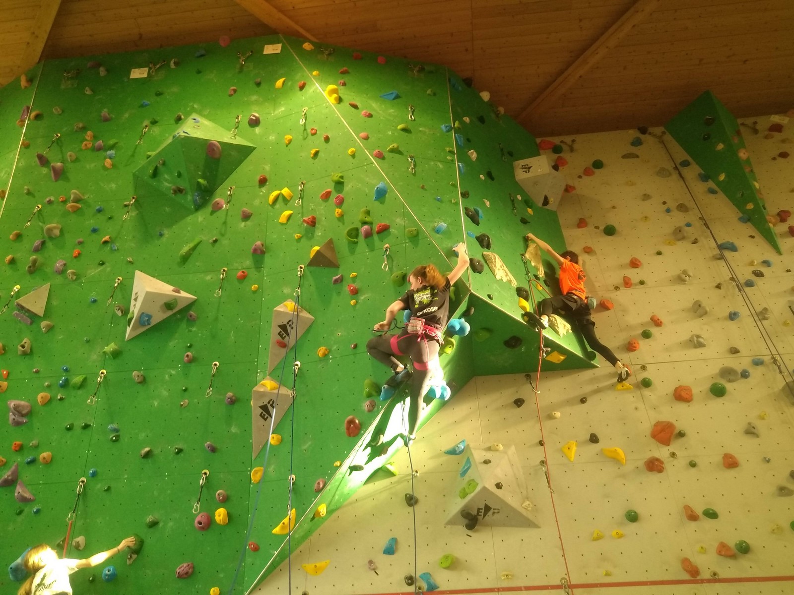 Côté performance donc, Rose et Maya ne parviennent pas à sortir le crux compliqué de la voie 3 et tombent au sommet de la voie 4. Elles terminent 6ème pour Maya, 5ème pour Rose. Comme dit plus tôt, Mélia prend la médaille de bronze pour un essai de trop dans la voie 3 (elle était la première à défricher les méthodes, petit désavantage qu’elle n’a pas réussi à compenser malgré le téléguidage de Mathis en bas). Romane nous offre une performance incroyable tout en force et volonté tandis que Lya profite une fois de plus de sa taille et improvise ses propres méthodes en prenant de gros risques qui paient bien. Elles auront droit à une voie de finale et c’est Lya qui passe devant avec un avantage assez net. Bravo Lya. Mention spéciale à Romane et une combativité impressionnante !