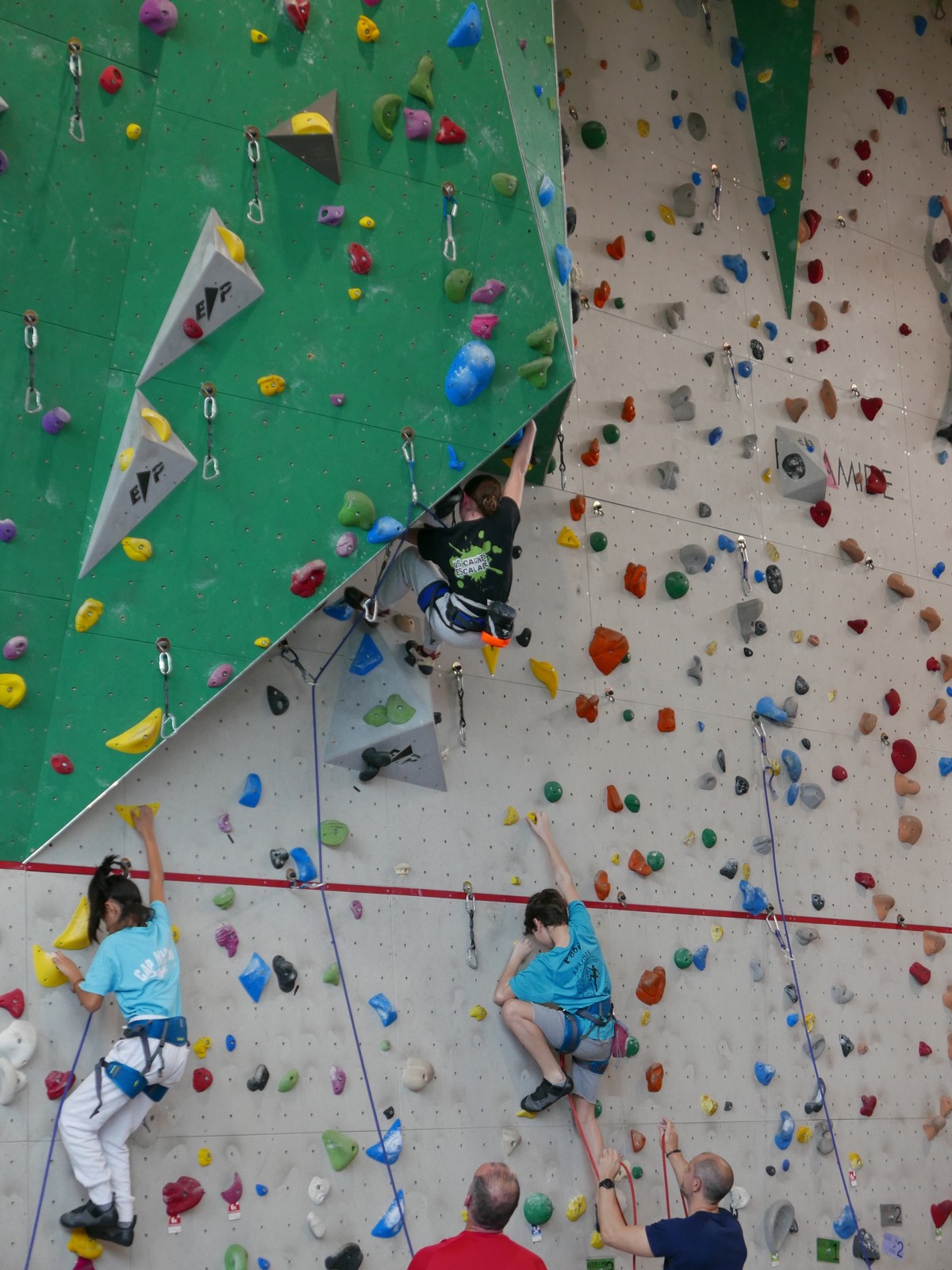 Esteban P. tombe malheureusement dans sa voie 2, et malgré des prestations très honorables dans les voies 3 et 4, termine à la 18ème place. Dommage. Antoine parvient à sortir ses voies 1 et 2 mais les gros dévers auront raison de sa volonté et il termine 14ème. Esteban C nous offre une belle prestation dans la voie 3 en avançant très loin dans le toit, mais cet effort lui coûte si cher en énergie qu’il s’effondre dans le gros dévers de la voie 4, prenant la 9ème place.